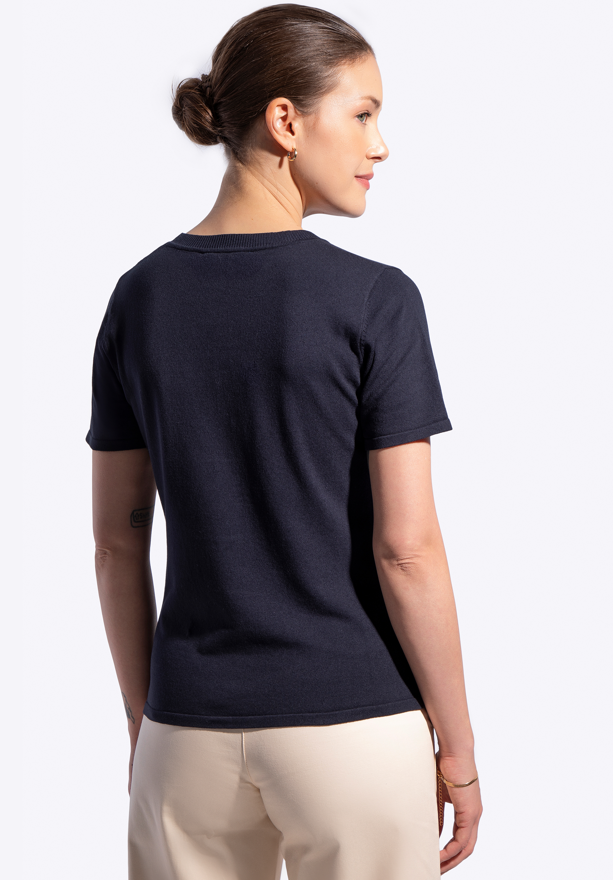 Tento sveter je dokonalou zmesou ľahkosti a decentnej elegancie. Jemná zmes viskózy a nylonu jemne obopína vašu pokožku a zaisťuje celodenné pohodlie. Krátke rukávy s rafinovaným povrchom dodávajú nádych elegancie, zatiaľ čo rebrovaný výstrih krásne orámuje krk. Jemne priliehavý strih poskytuje voľnosť a voľnosť pohybu a vyšívané logo v dolnom rohu dotvára vzhľad štýlovým a decentným akcentom.