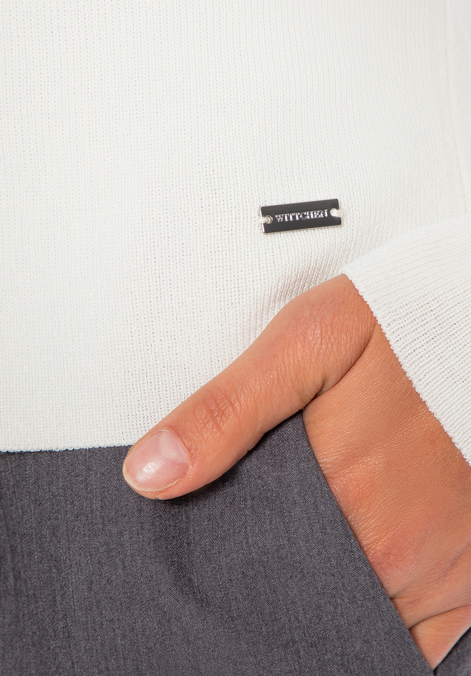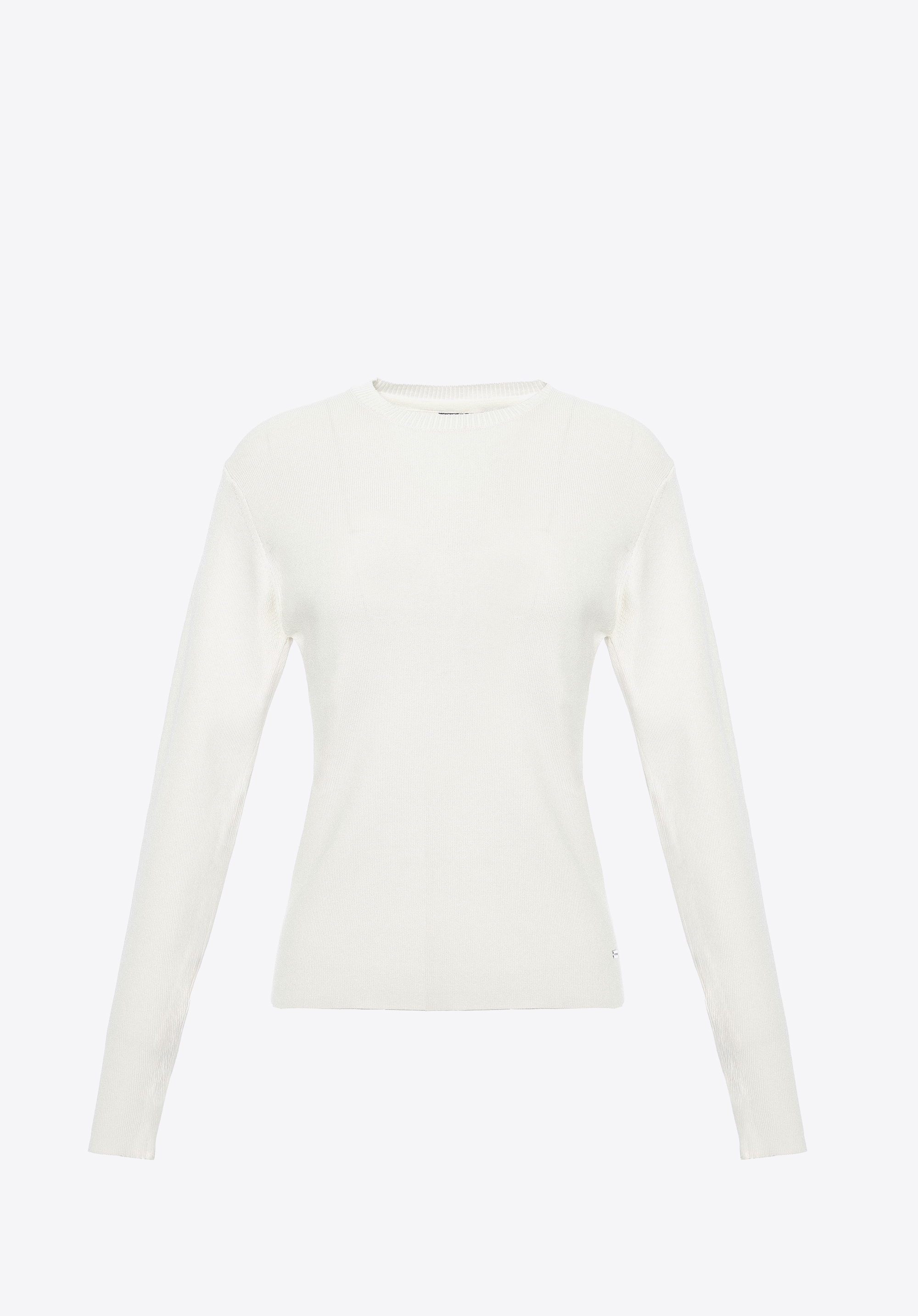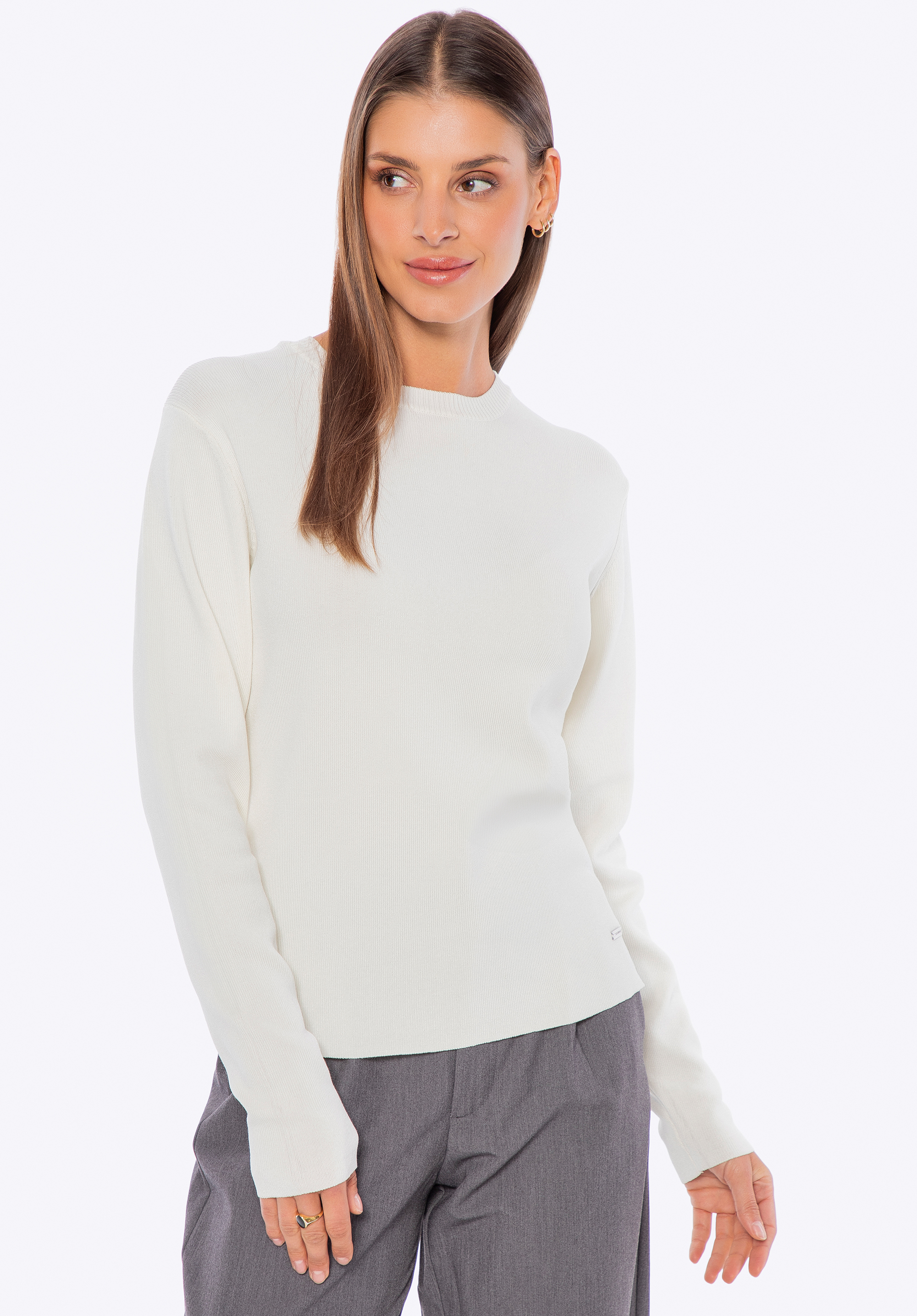 Tento sveter je perfektnou voľbou, ak hľadáte pohodlie v kombinácii s klasickou eleganciou. Je vyrobený z mäkkej a ľahkej viskózy zmiešanej s nylonom a ponúka celodenné pohodlie bez ohľadu na príležitosť. Dlhé, priliehavé rukávy sú navrhnuté tak, aby úhľadne sedeli na zápästiach, čo zaisťuje lichotivý strih a elegantný vzhľad. Rebrovaný výstrih dodáva svetru jemnú štruktúru a sofistikovanosť. Kovový detail na leme je moderným doplnkom, ktorý zdôrazňuje starostlivosť venovanú remeselnému spracovaniu každého prvku a dodáva mu moderný nádych.