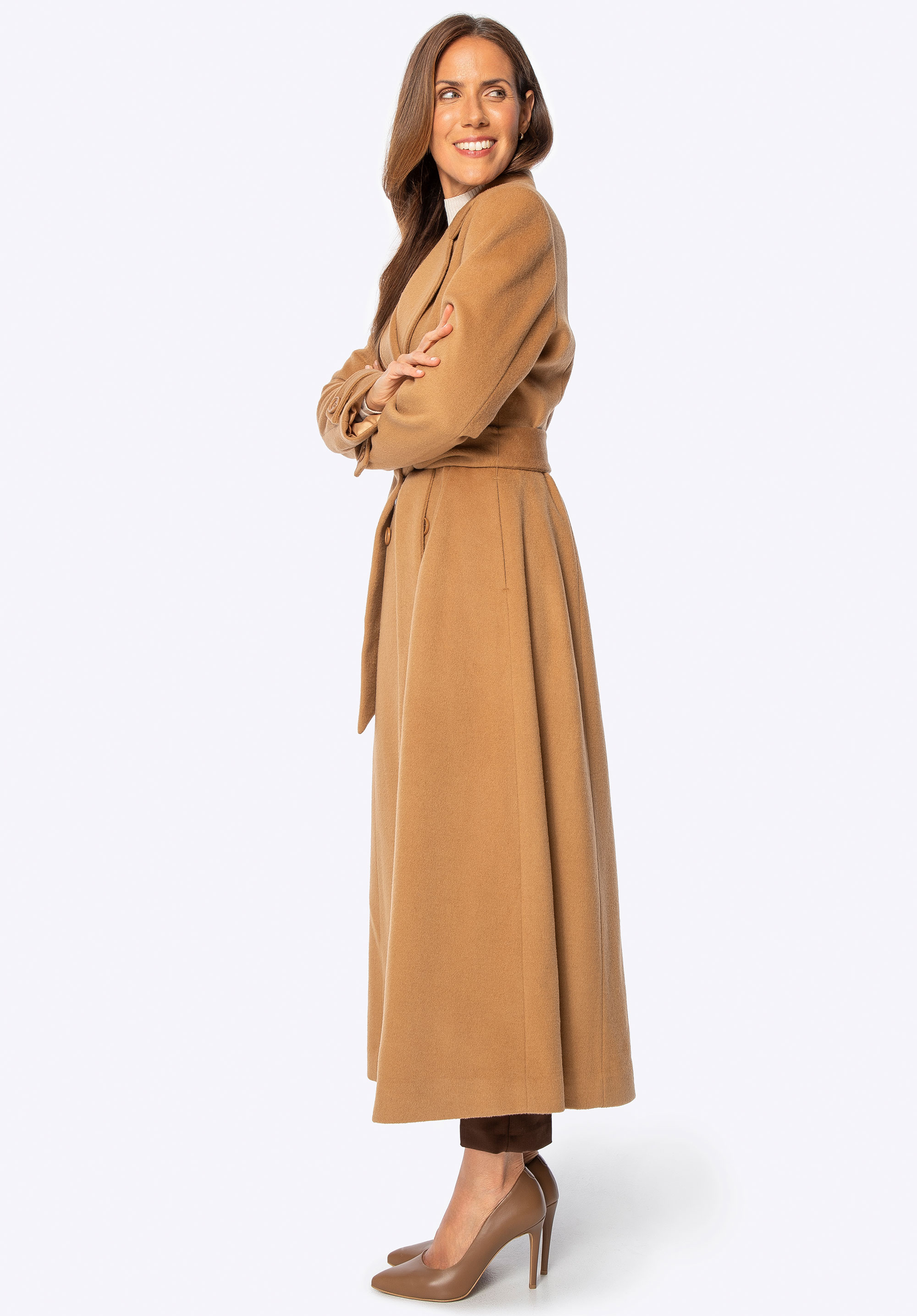 - Dlhý, priliehavý strih: Štíhla silueta s definovaným pásom lichotí postave, zatiaľ čo elegantná dĺžka dodáva eleganciu a chráni pred chladom.