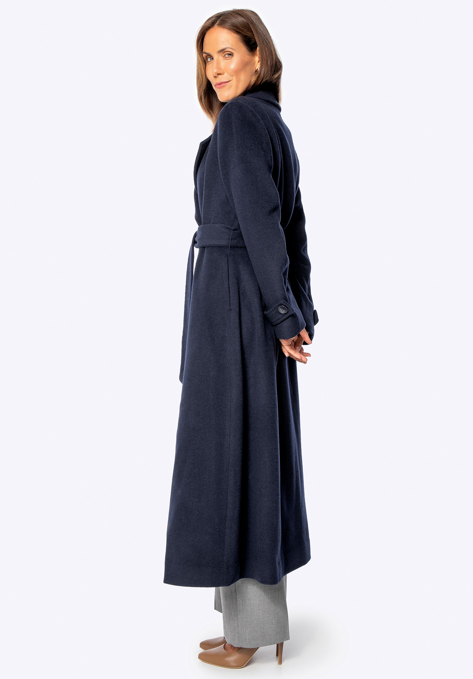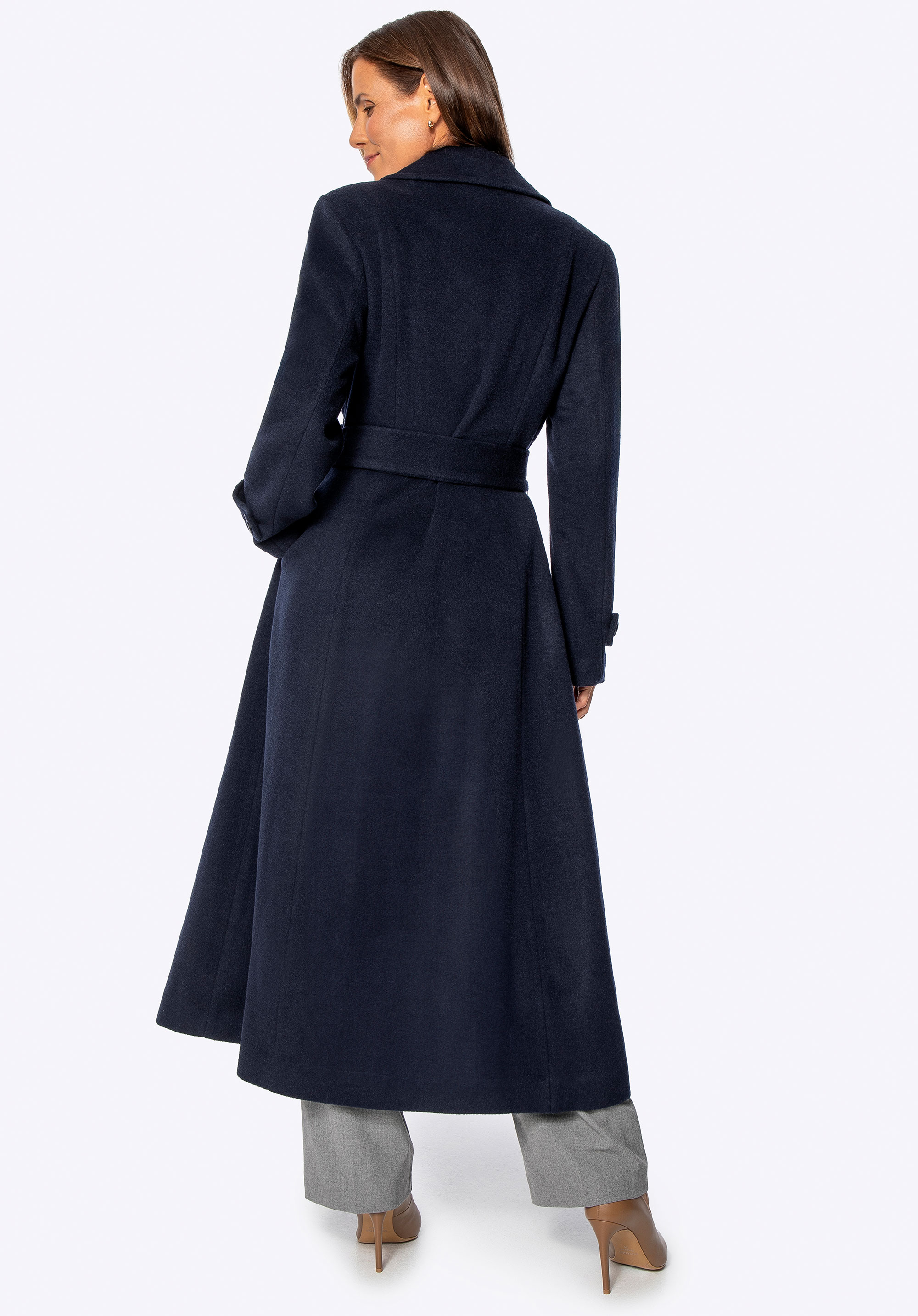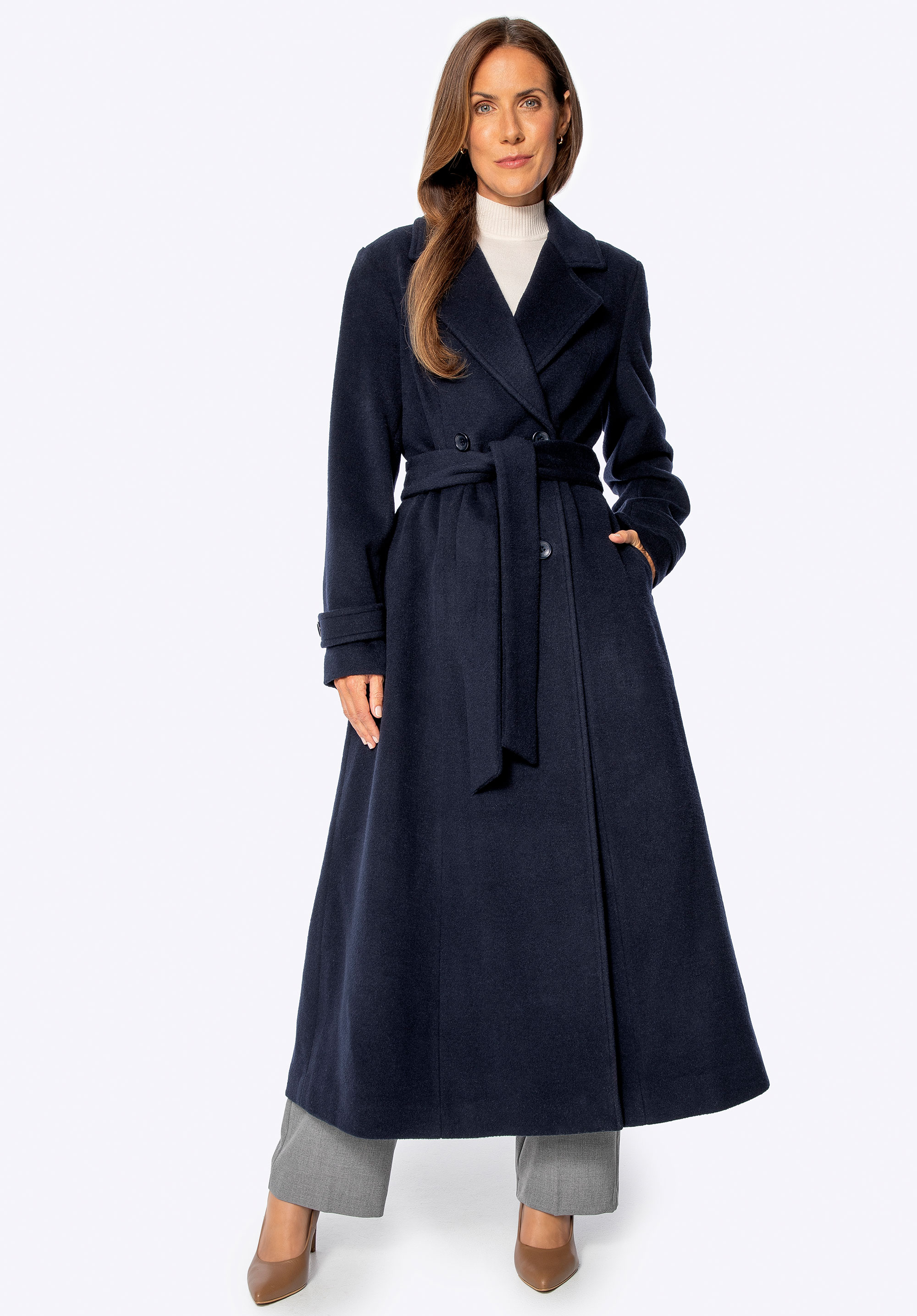 - Dlhý, priliehavý strih: Štíhla silueta s definovaným pásom lichotí postave, zatiaľ čo elegantná dĺžka dodáva eleganciu a chráni pred chladom.