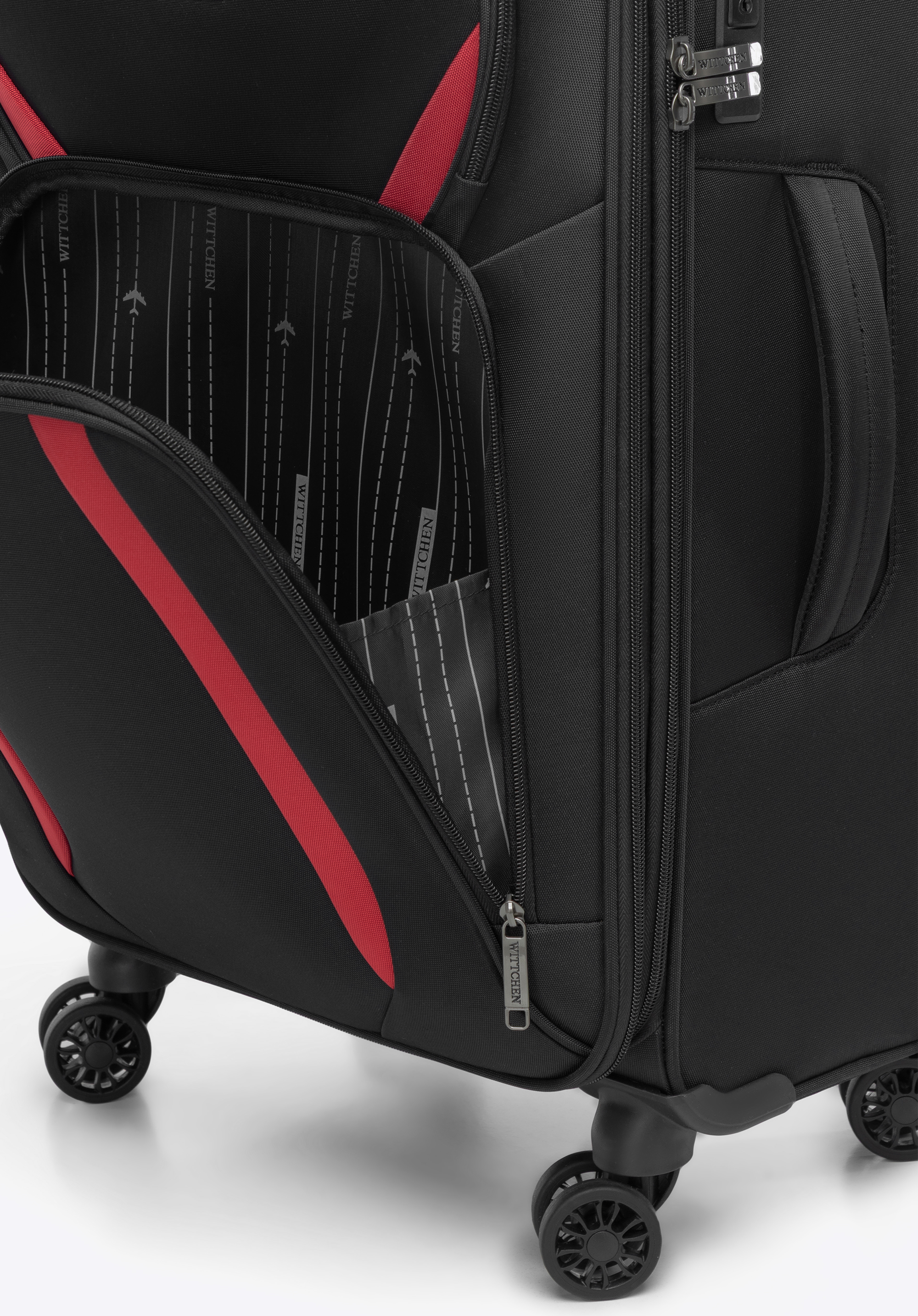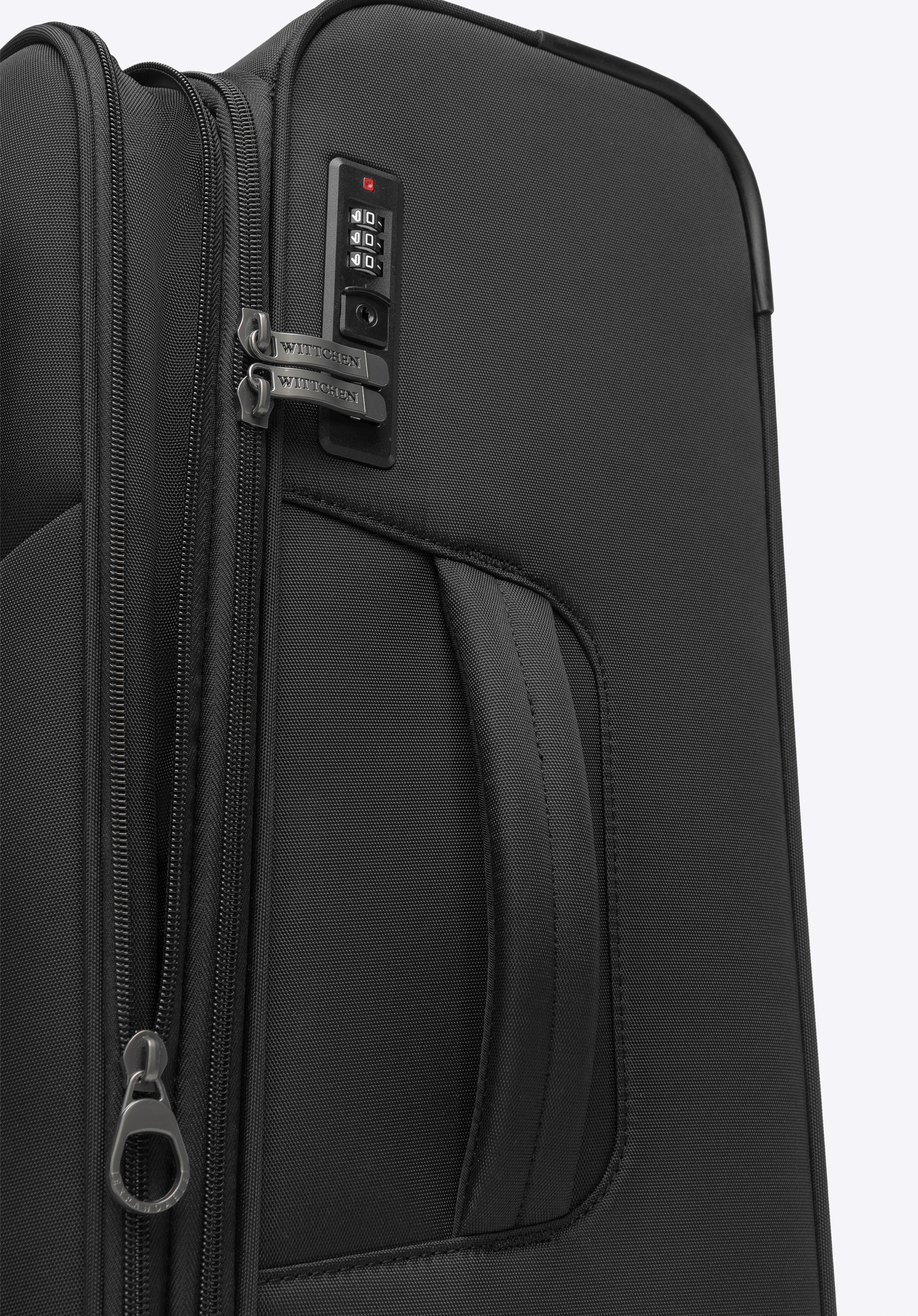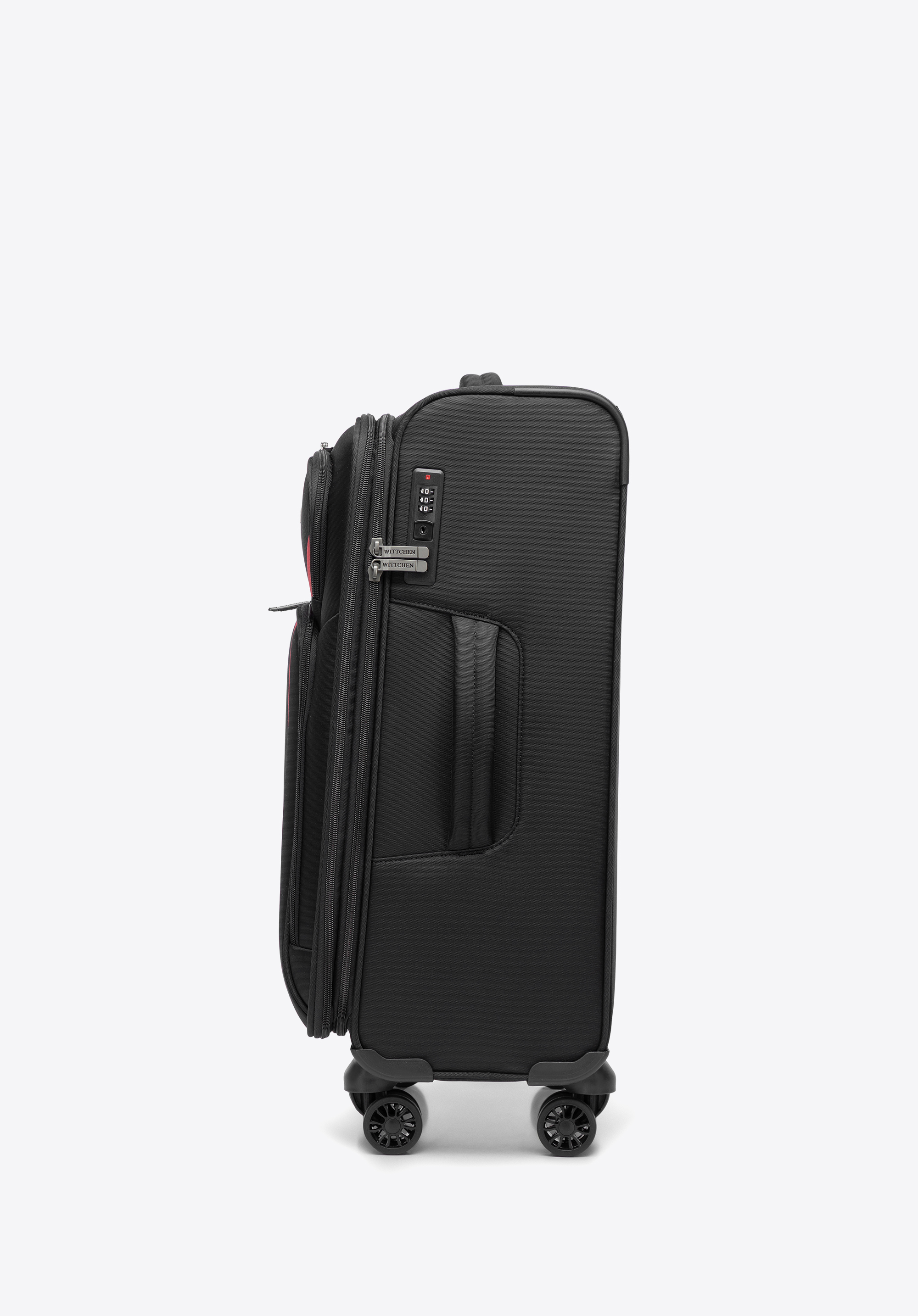 - Stabilita: Dva bočné výstupky umožňujú kufru bezpečne stáť na boku a chránia ho pred nečistotami a poškriabaním.