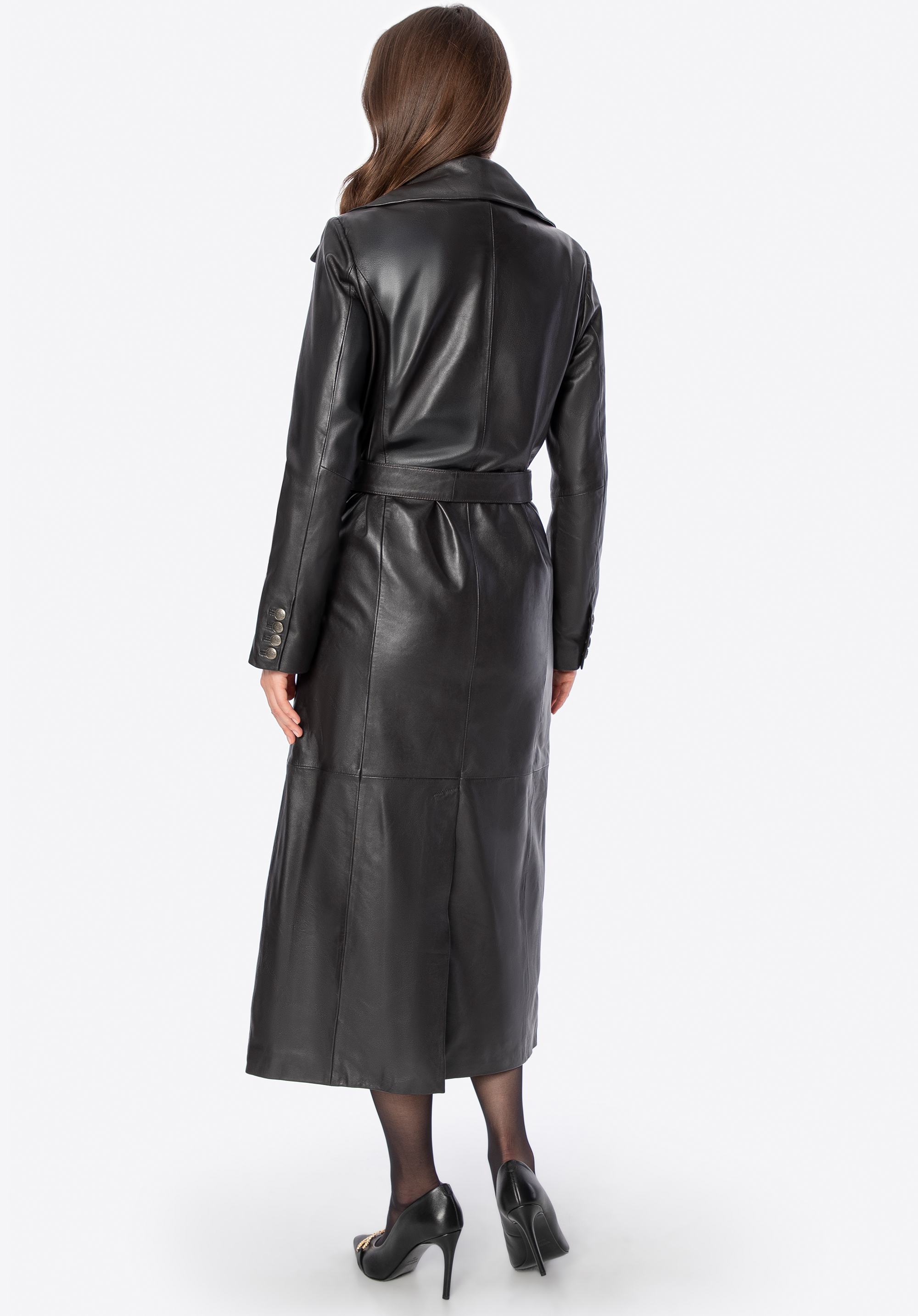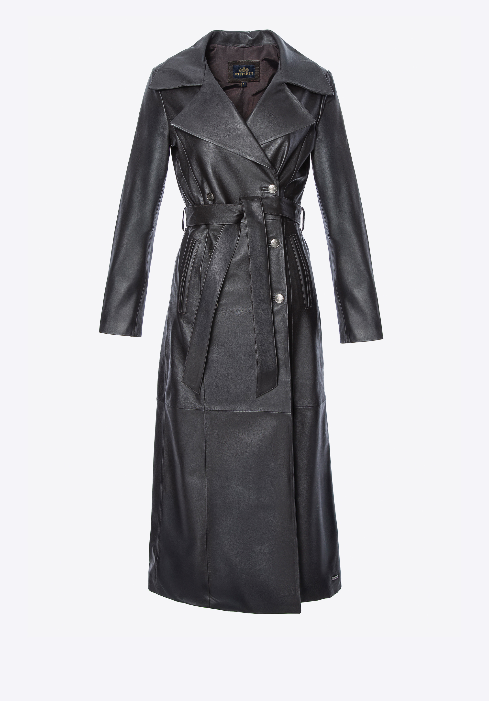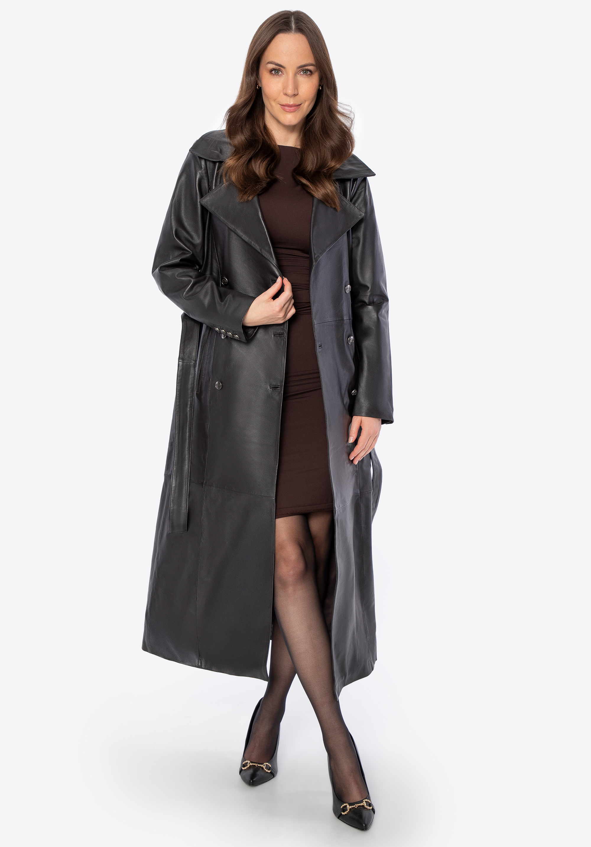 Tento kabát kombinuje nadčasový štýl s luxusom – inšpirovaný klasickou siluetou trenčkotu a vyrobený z mäkkej ovčej kože, zaujme svojou eleganciou a prepracovanými detailmi. Dvojradové zapínanie na gombíky a opasok v bedrovom páse zaisťujú perfektné strihanie a zdôrazňujú sofistikovaný charakter kabáta. Dve predné vrecká ponúkajú praktickosť a priestor na nevyhnutnosti, zatiaľ čo gombíky s reliéfnym logom dodávajú kabátu prestížny nádych.