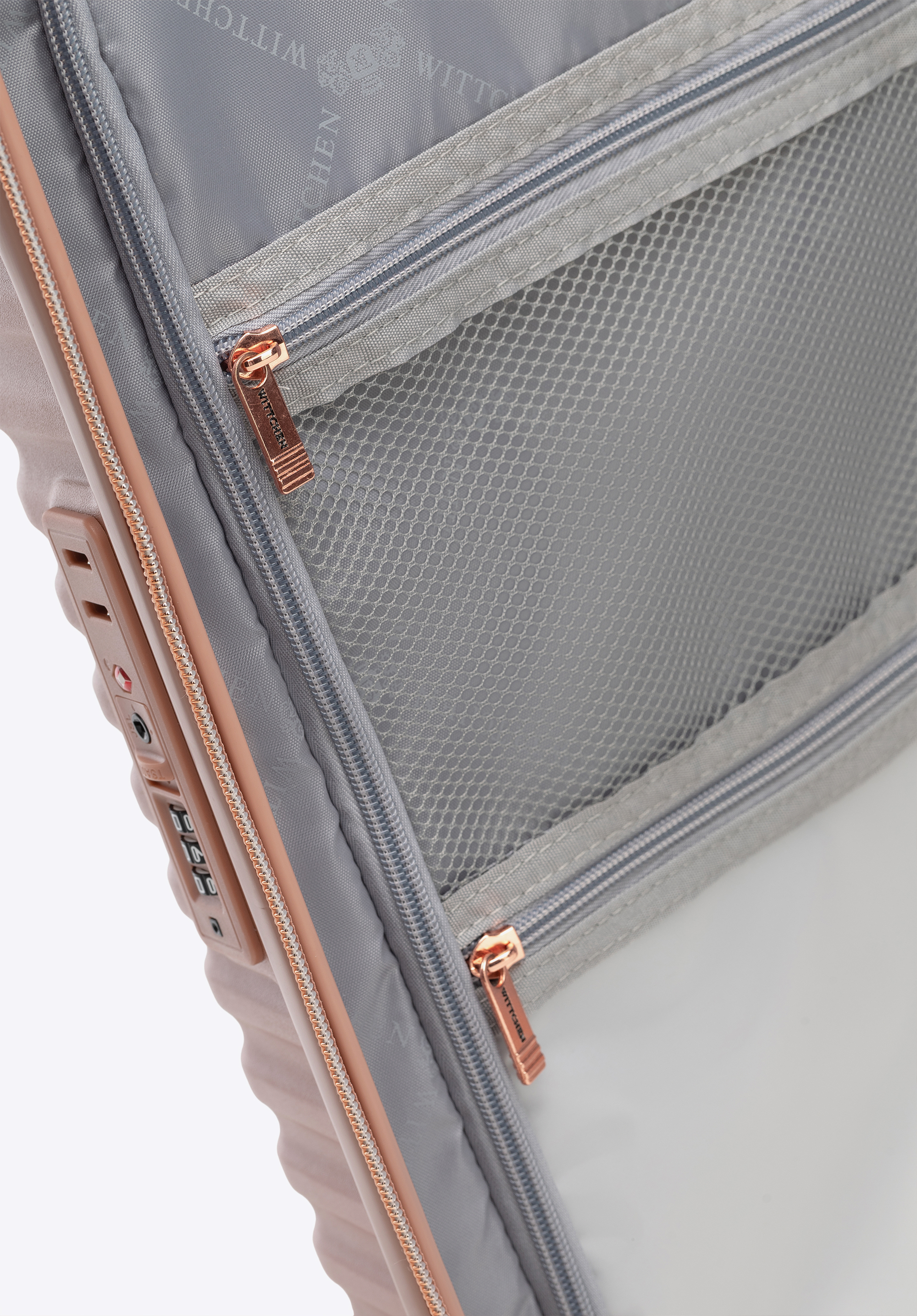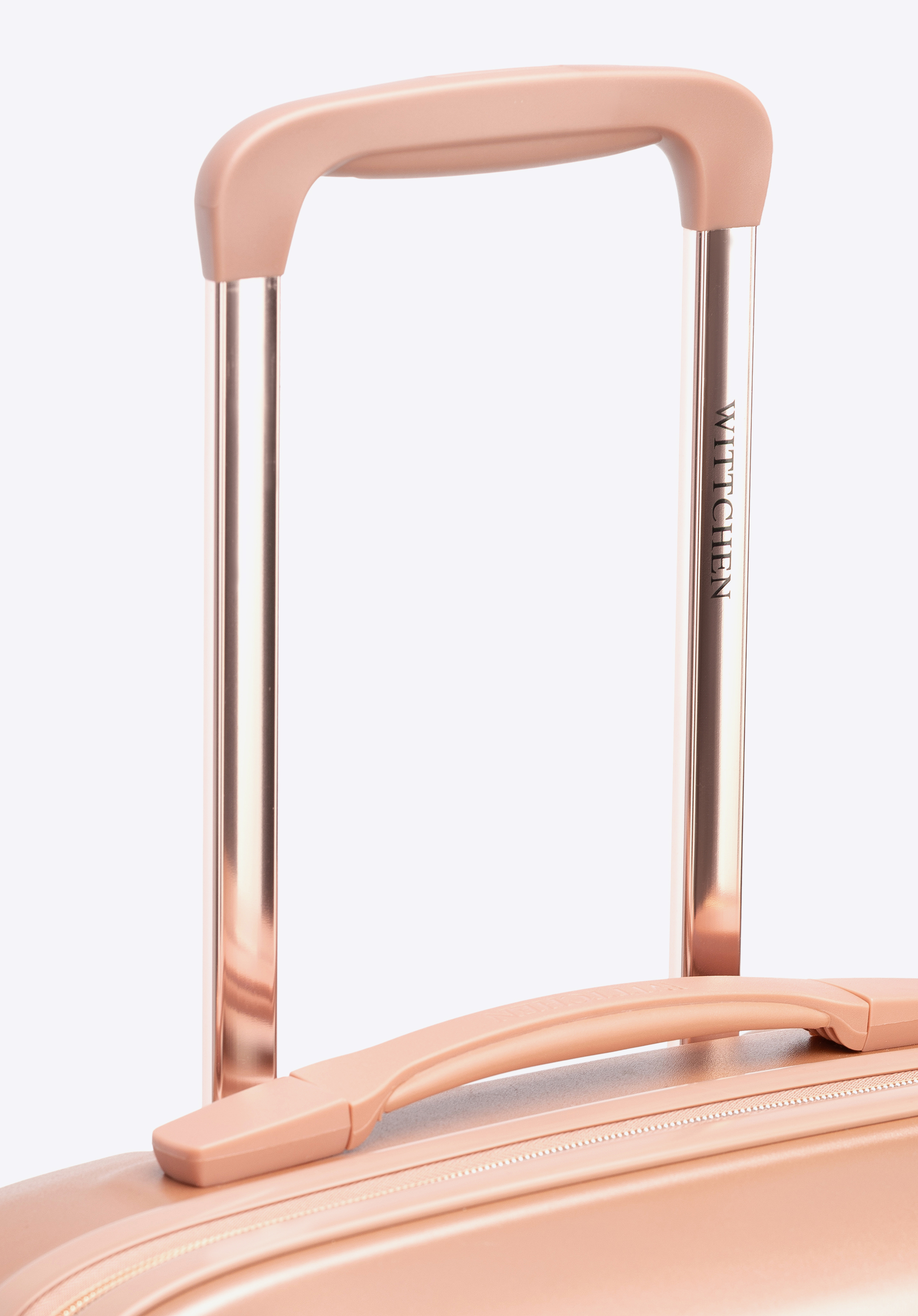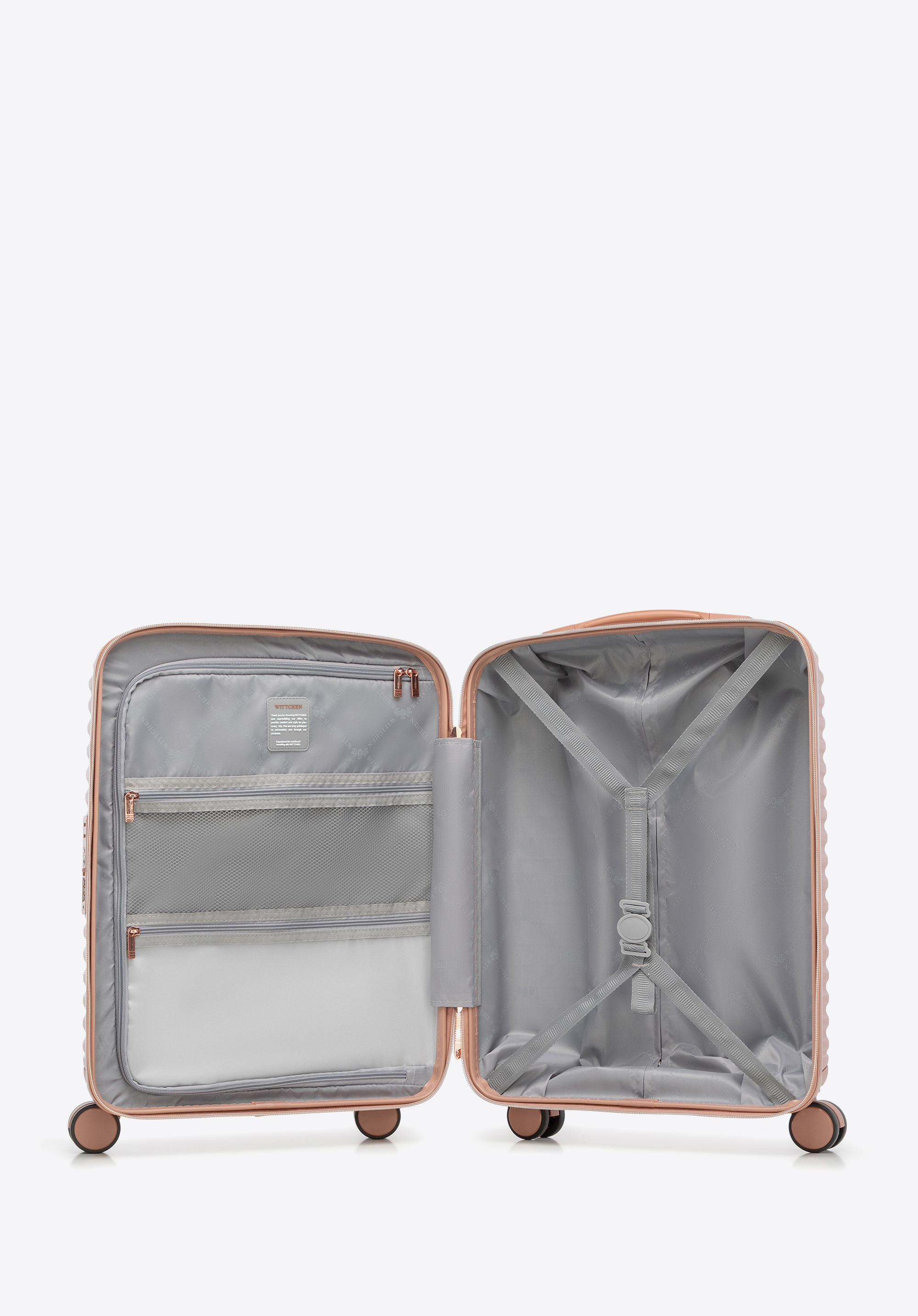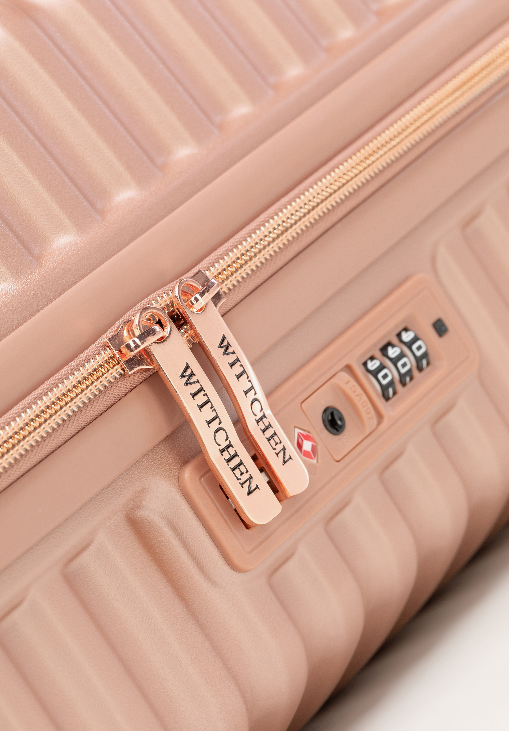Kabinový kufor z polykarbonátu s horizontálnym rebrovaním. Farba: ružové zlato