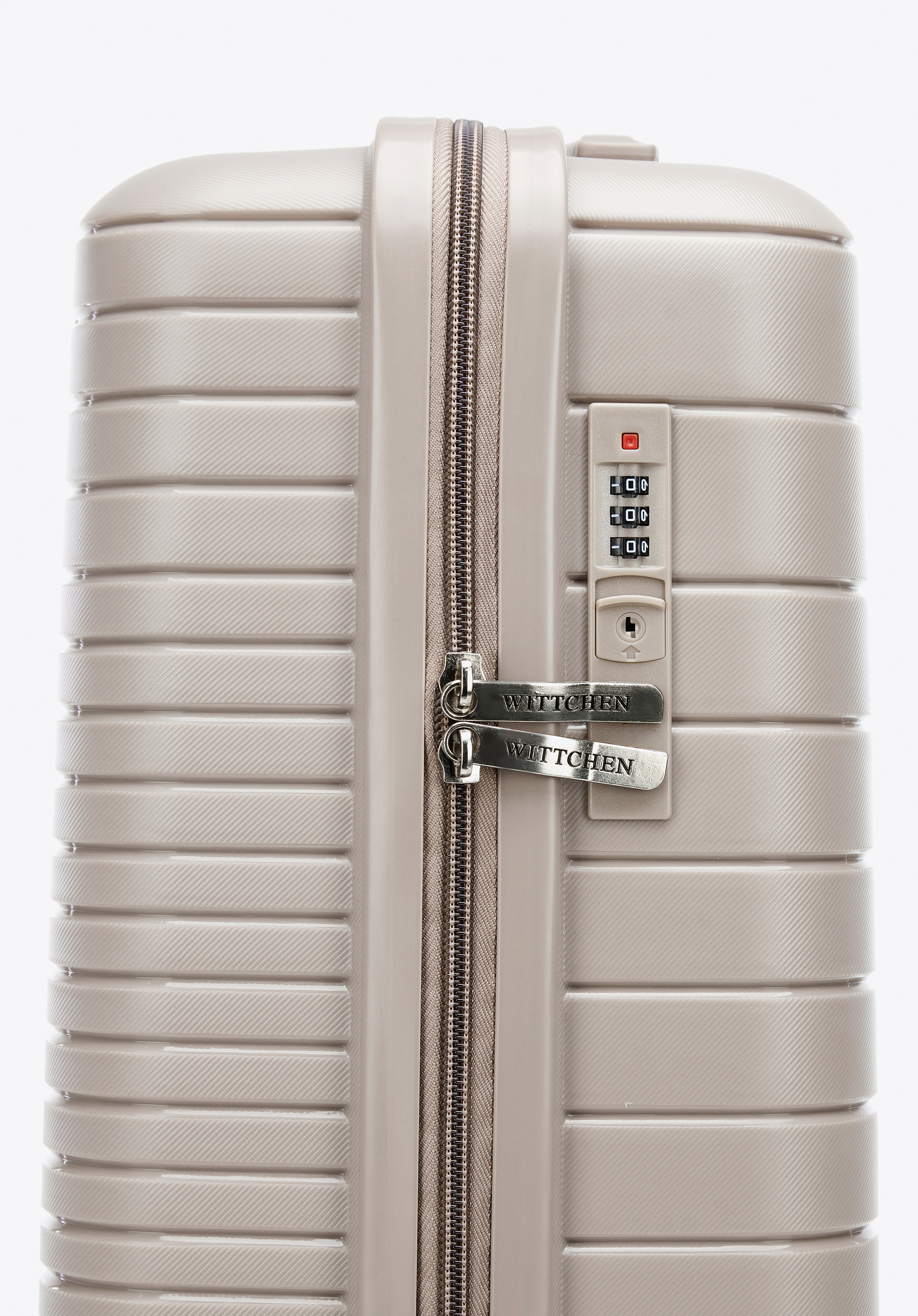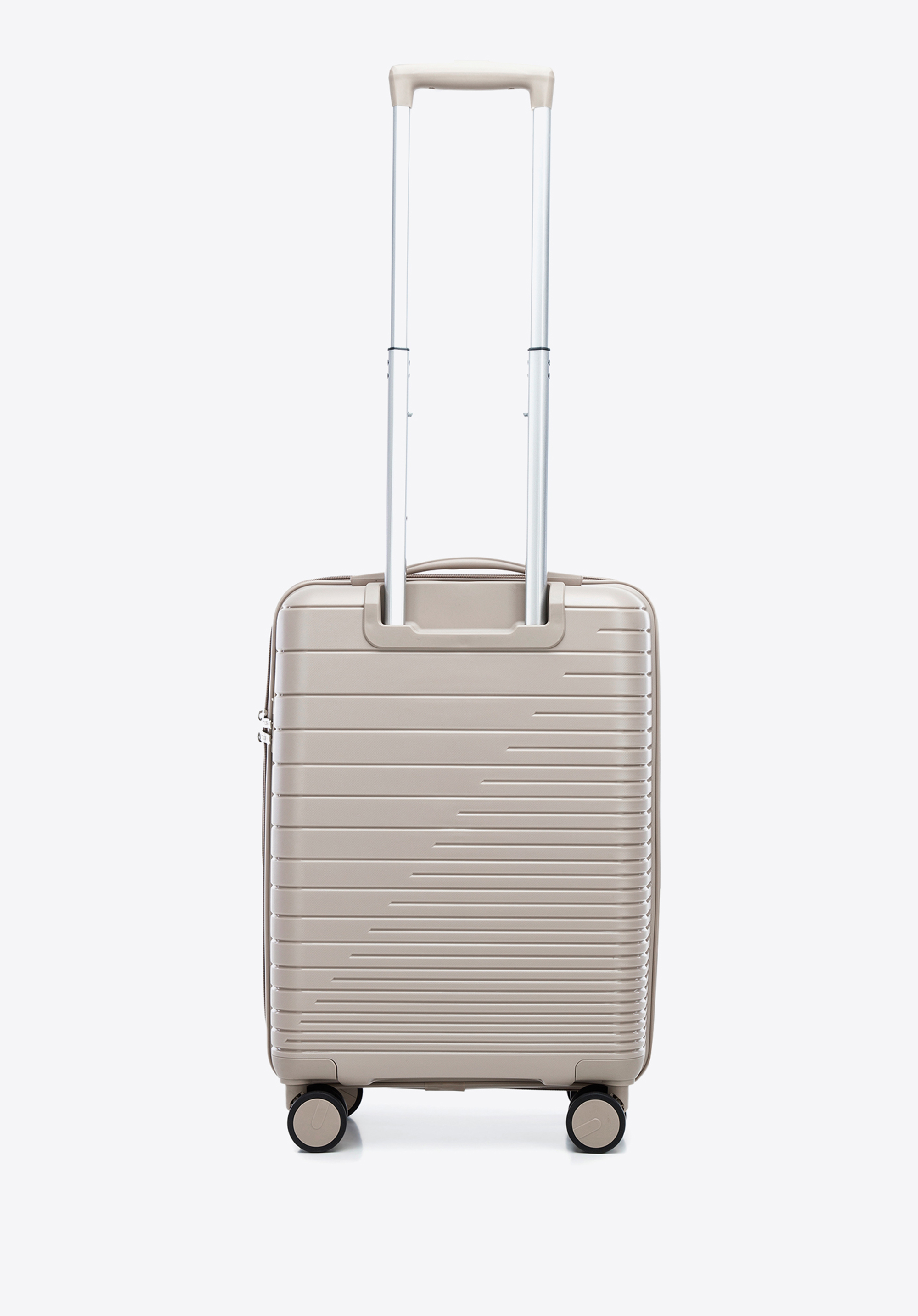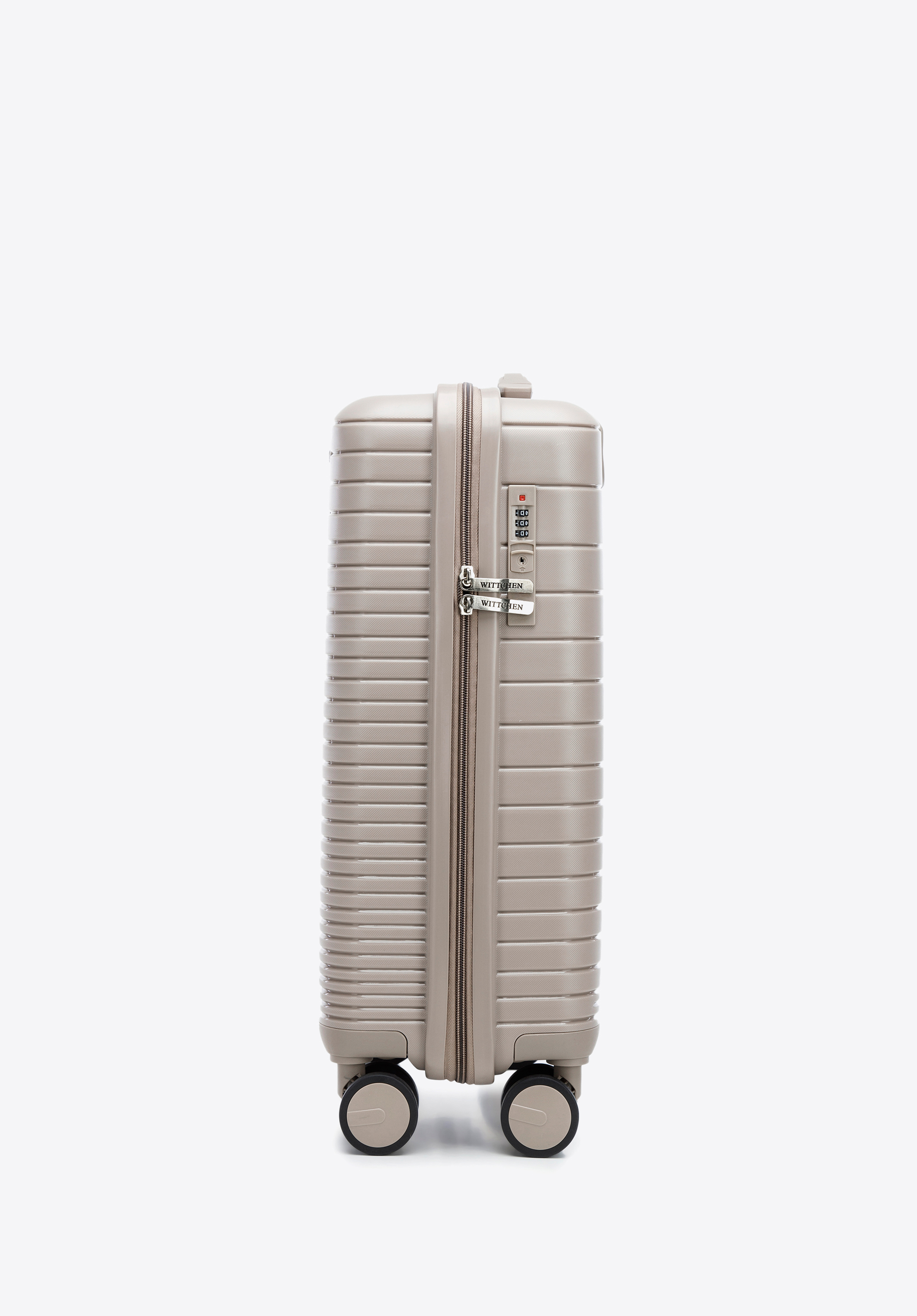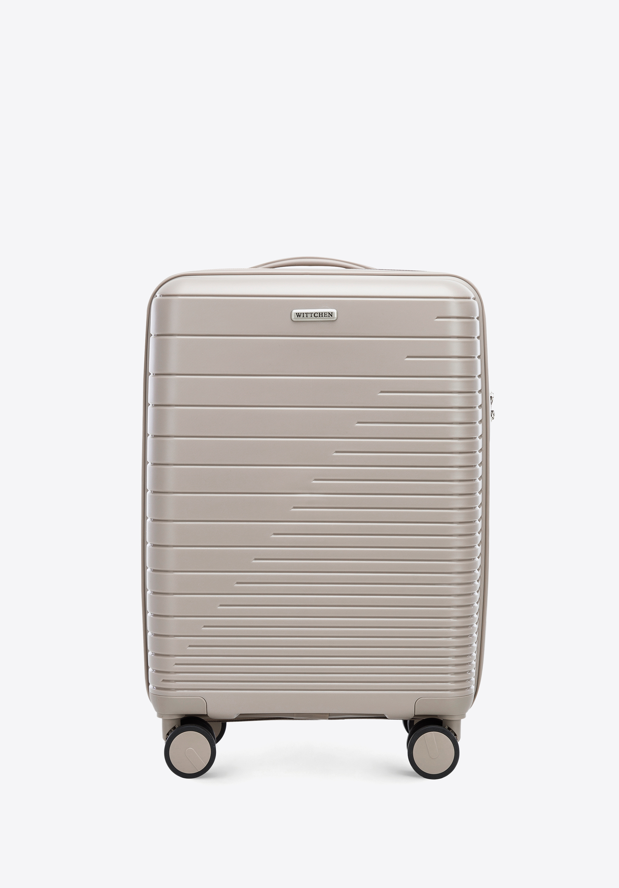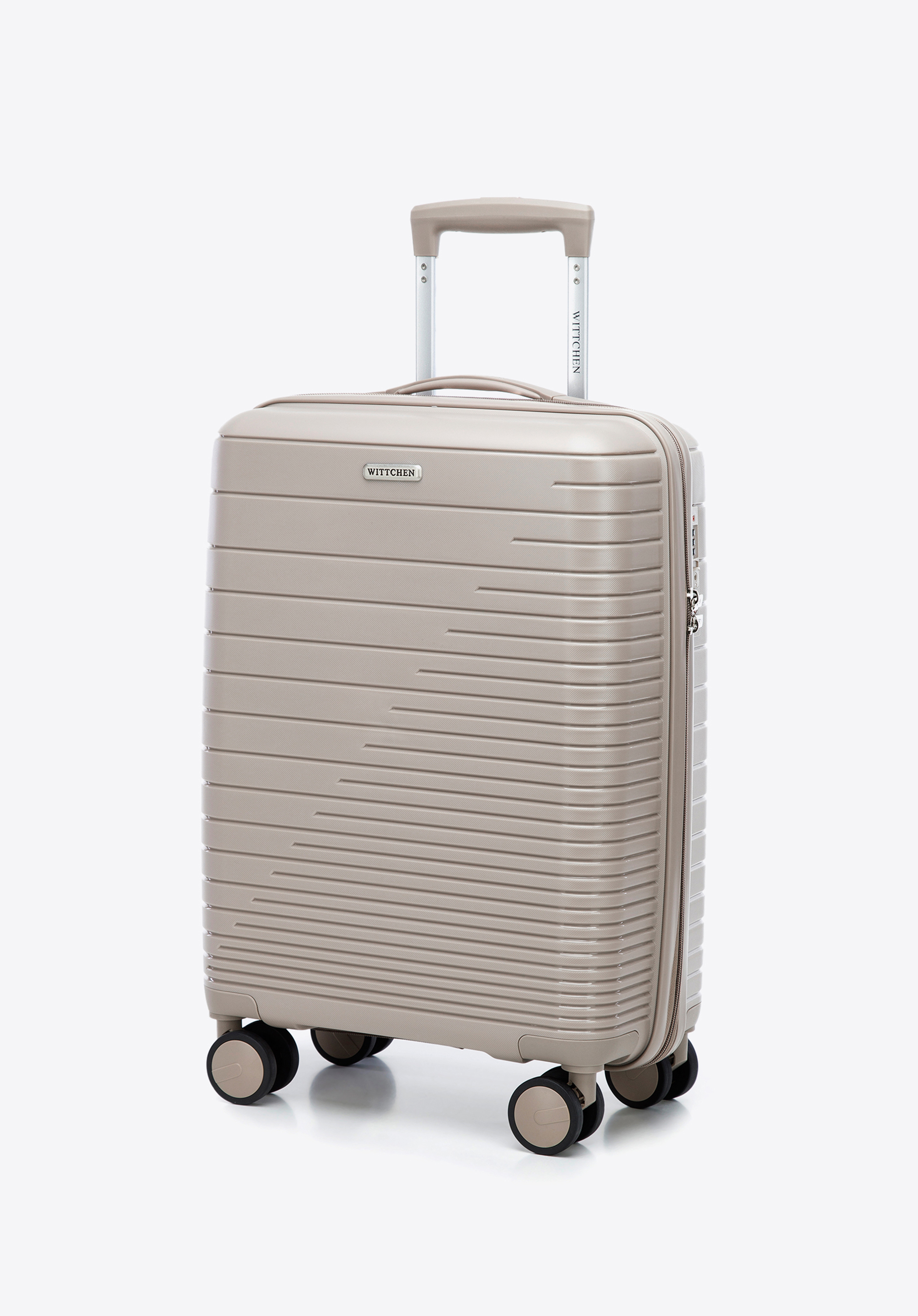 Kabínový kufor z polypropylénu s lesklými pruhmi je praktickým a štýlovým doplnkom pre každého.