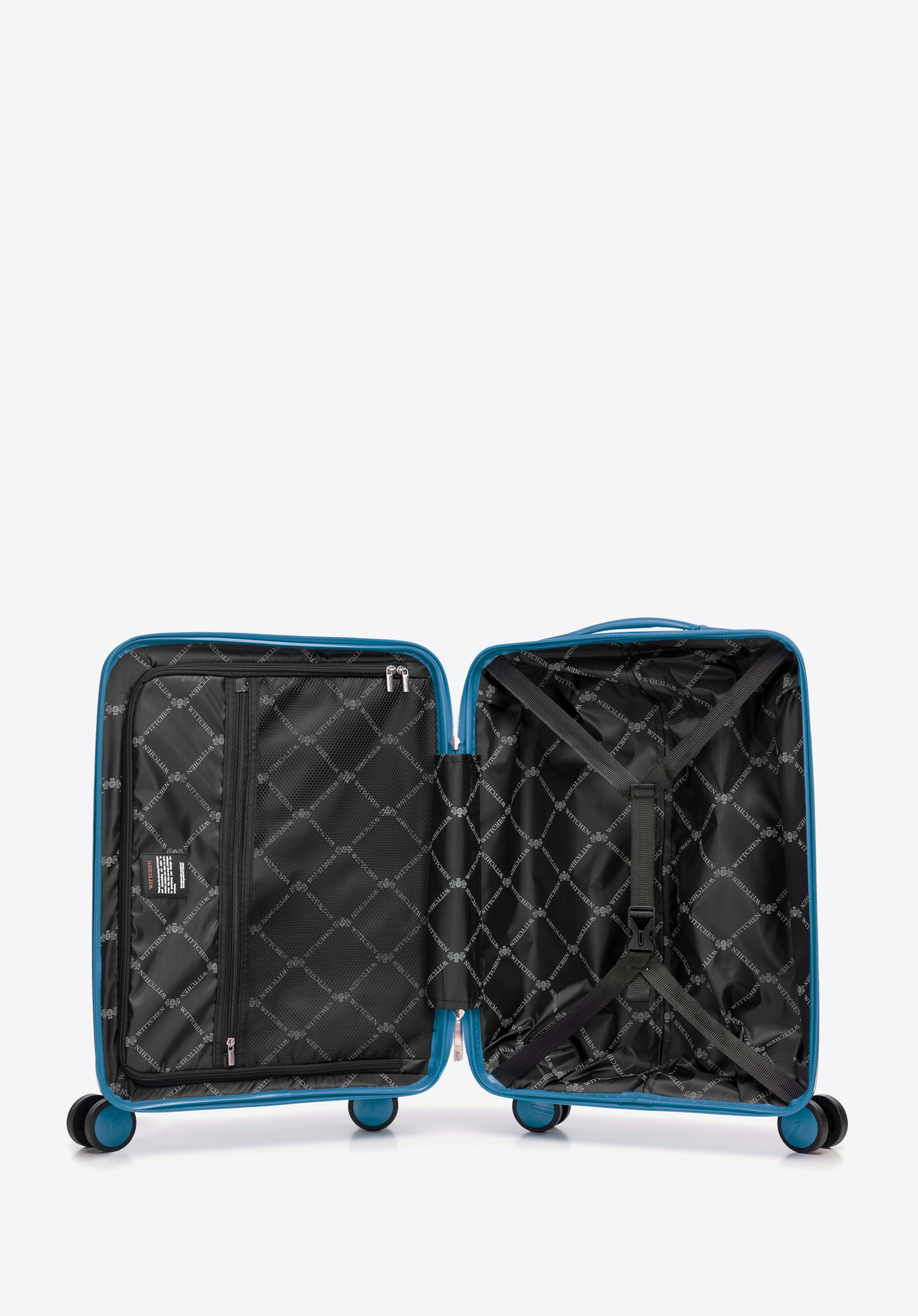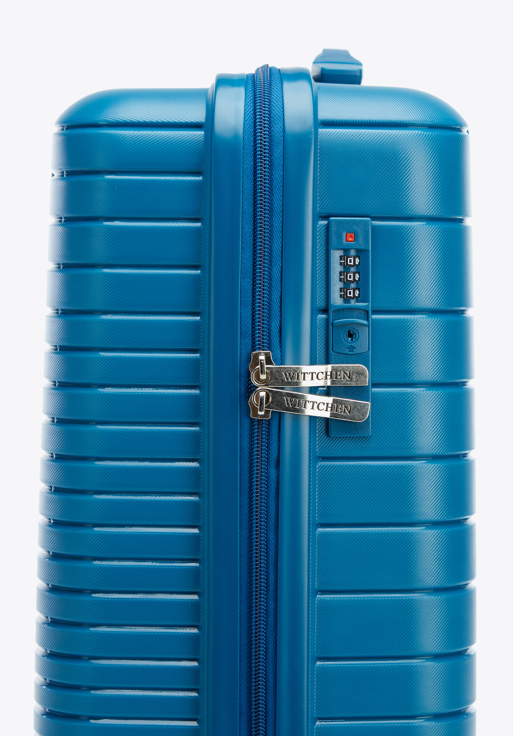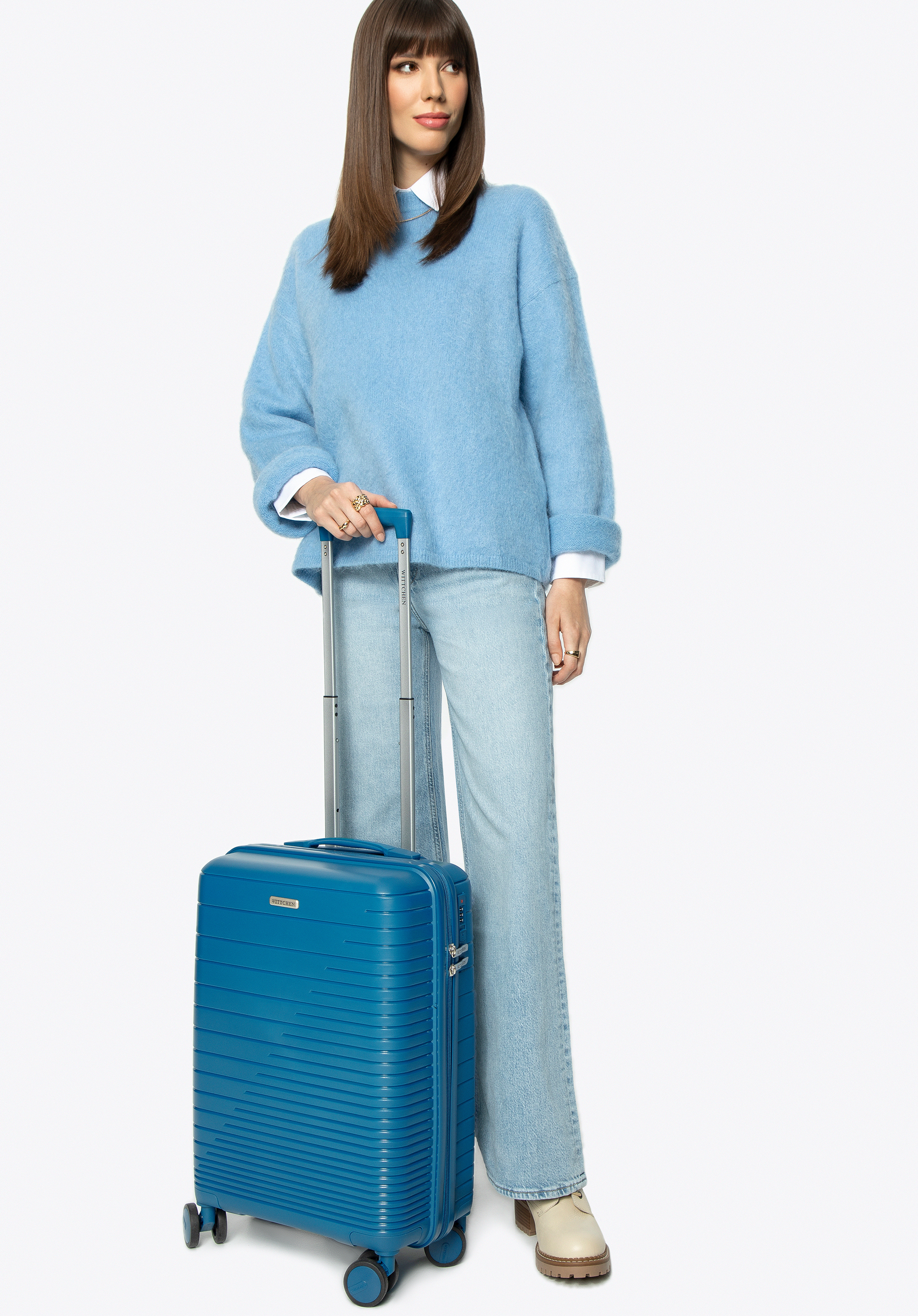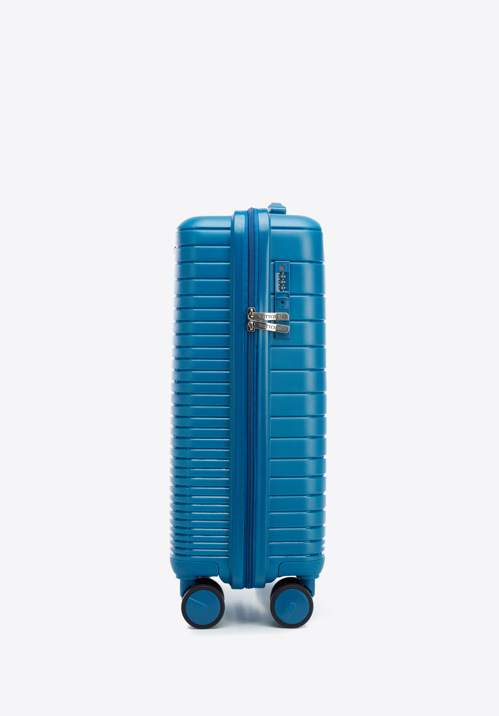 Kabínový kufor z polypropylénu s lesklými pruhmi modrý