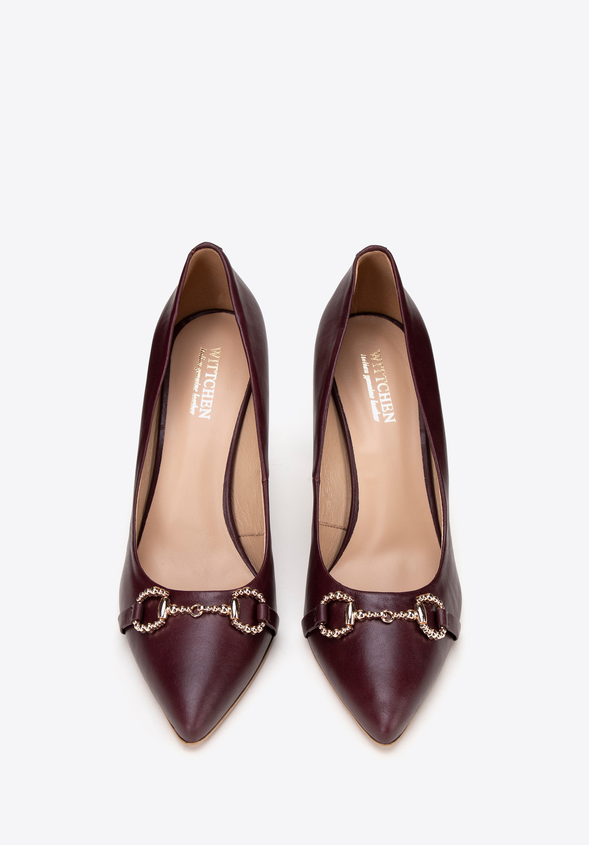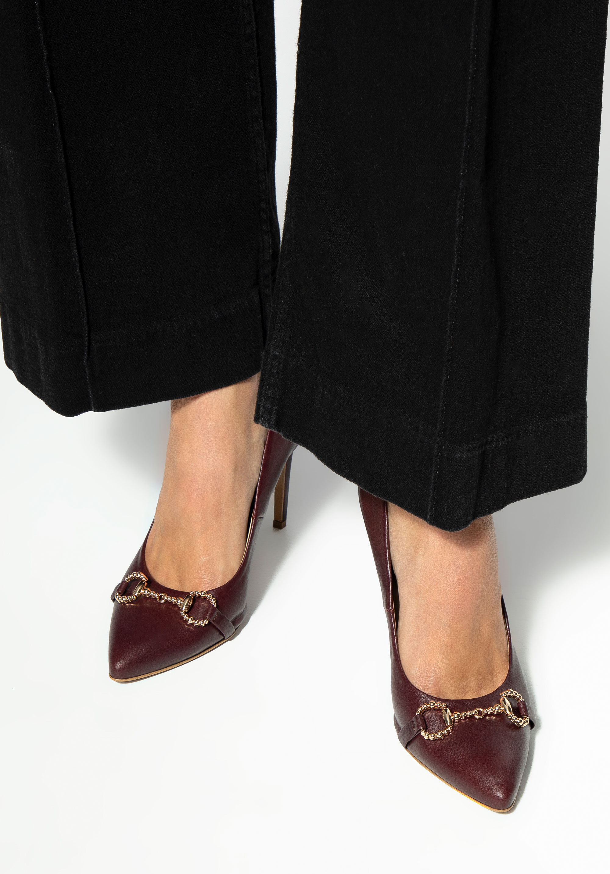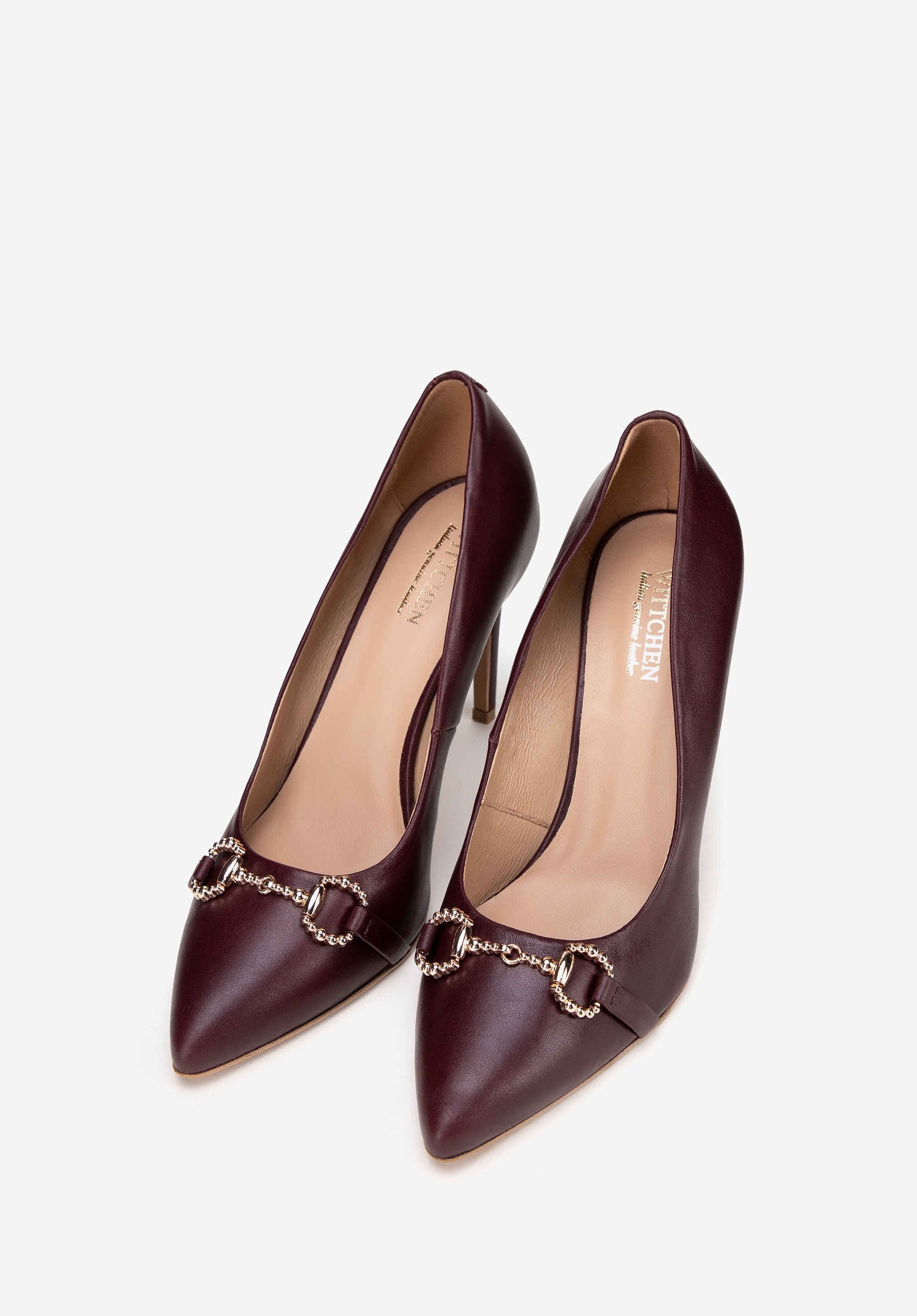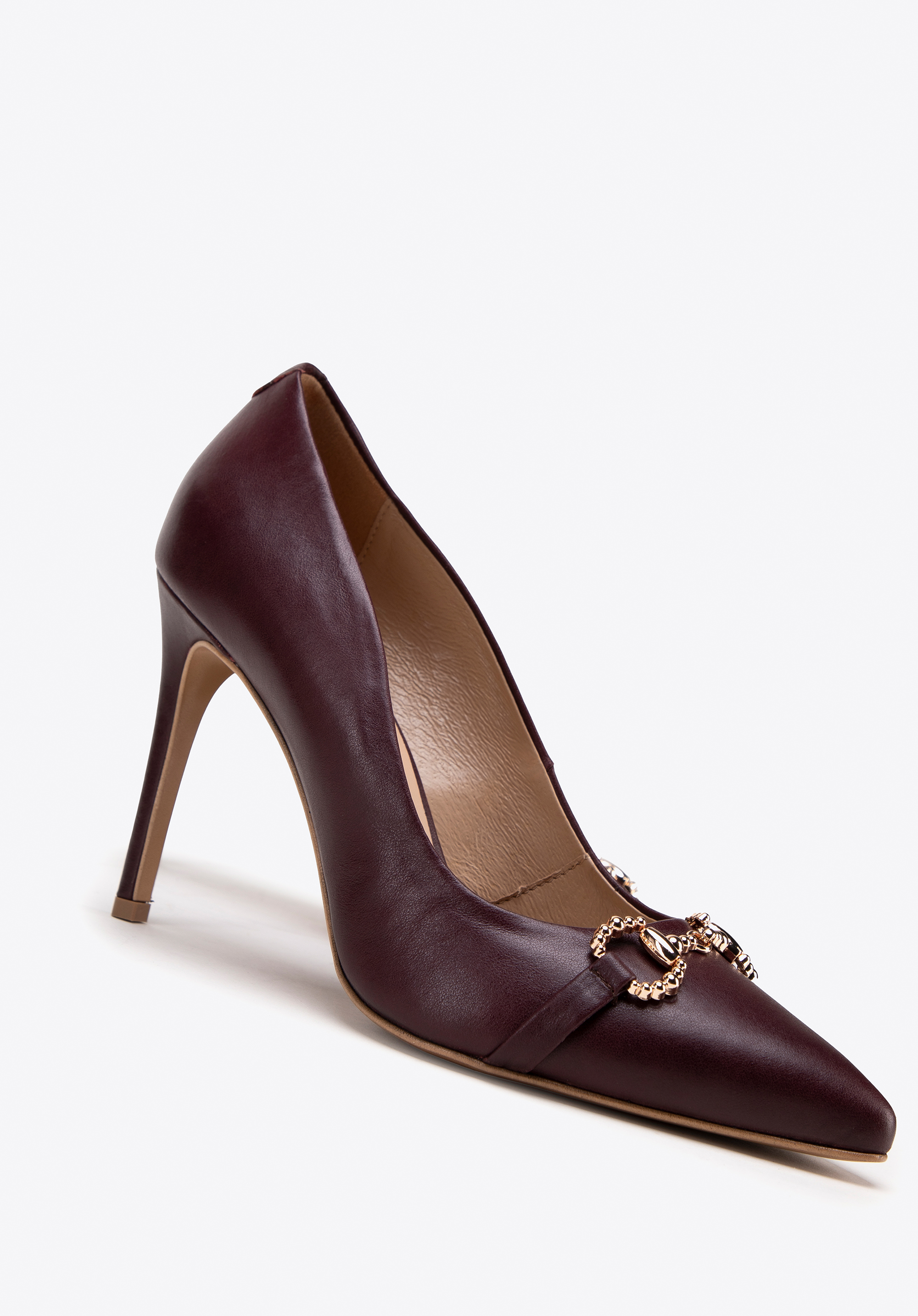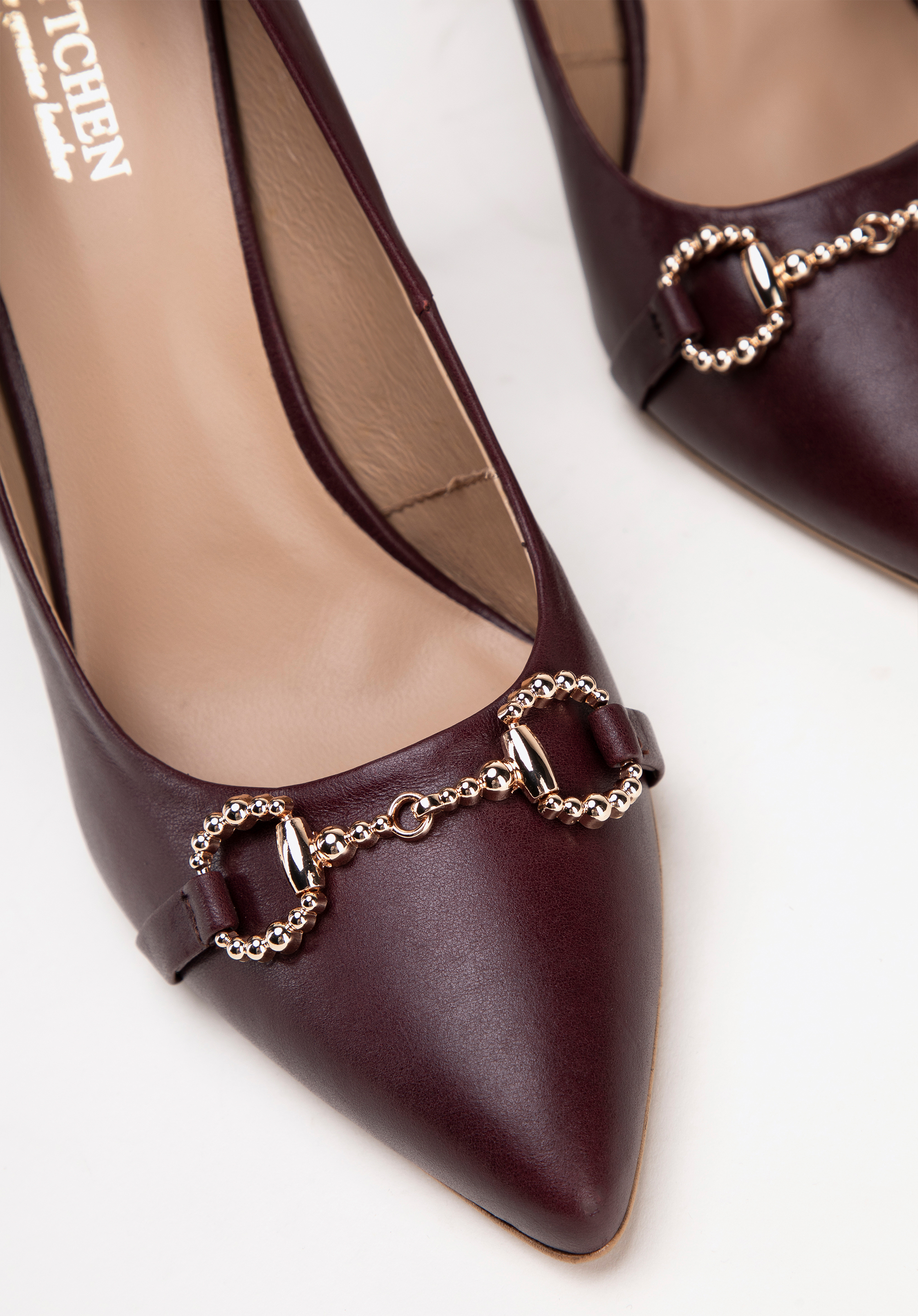 Klasické kožené ihličkové lodičky s ozdobnou retiazkou-bordové
