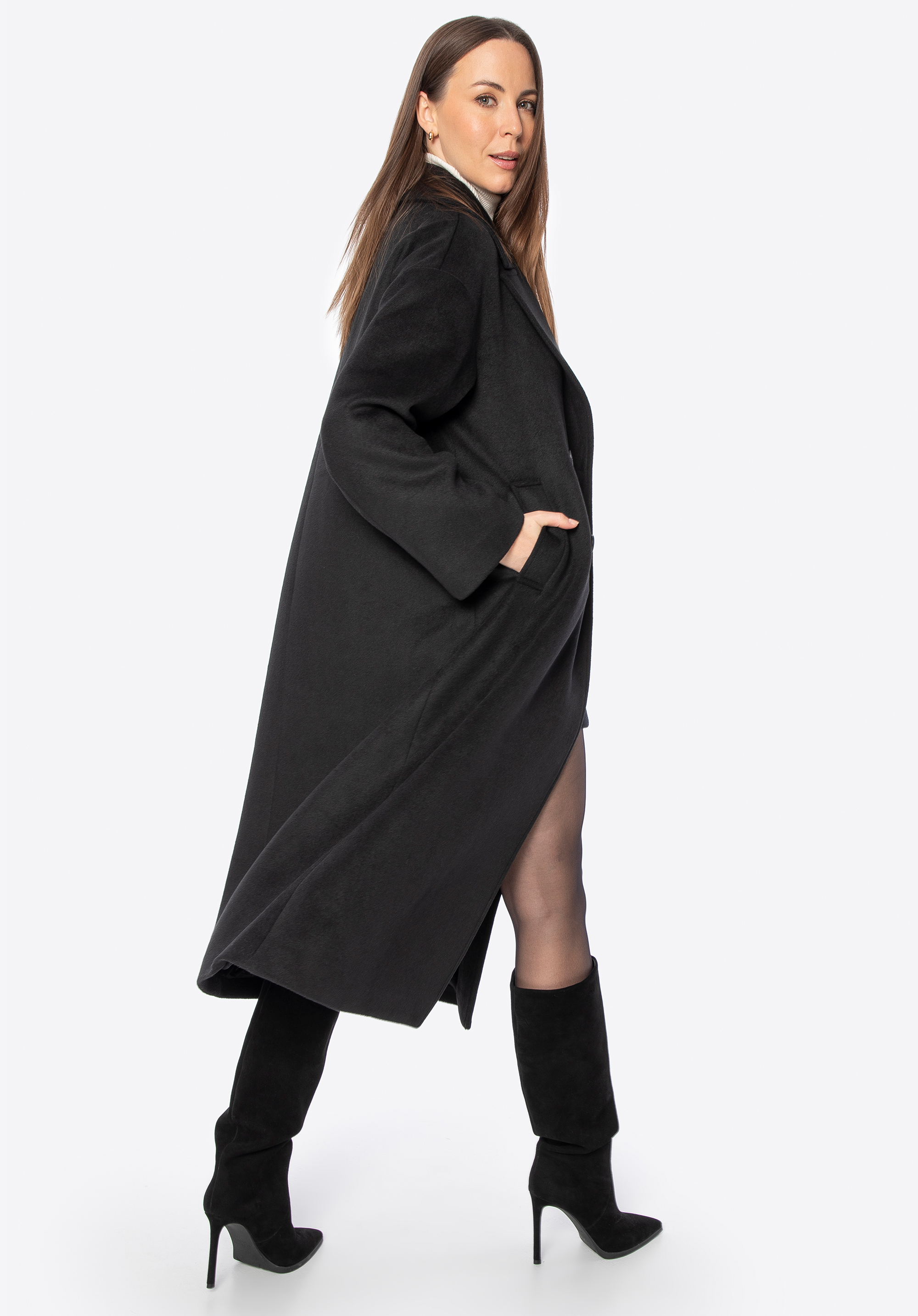 - Dvojradové zapínanie na gombíky: Nadčasový a elegantný detail, ktorý dodáva kabátu štruktúru a charakter.