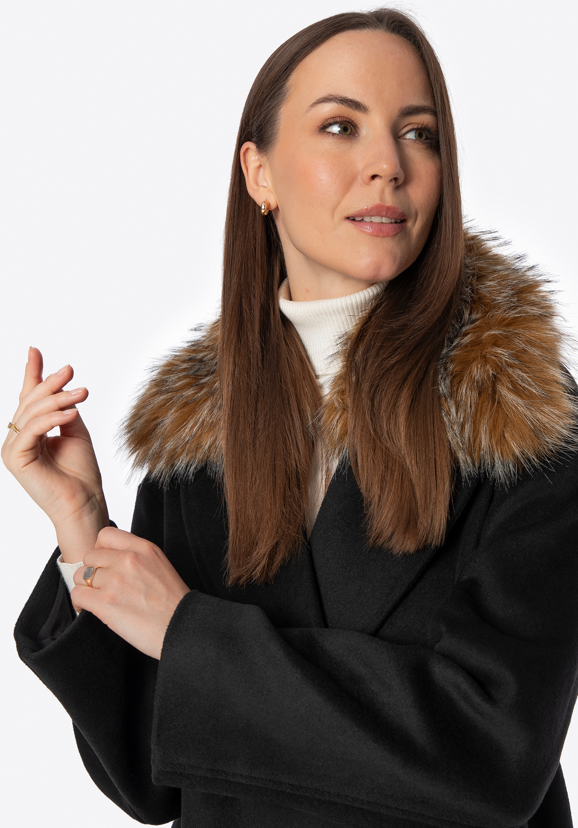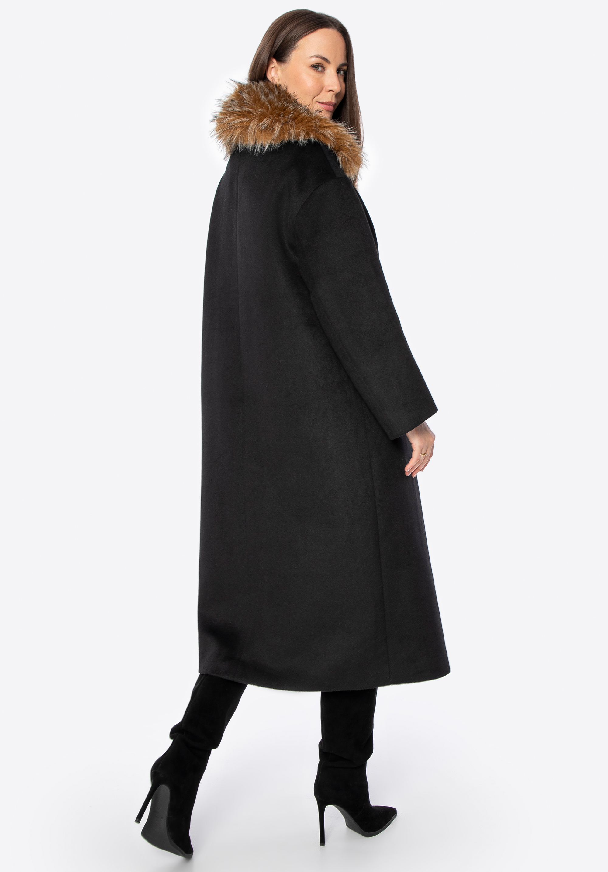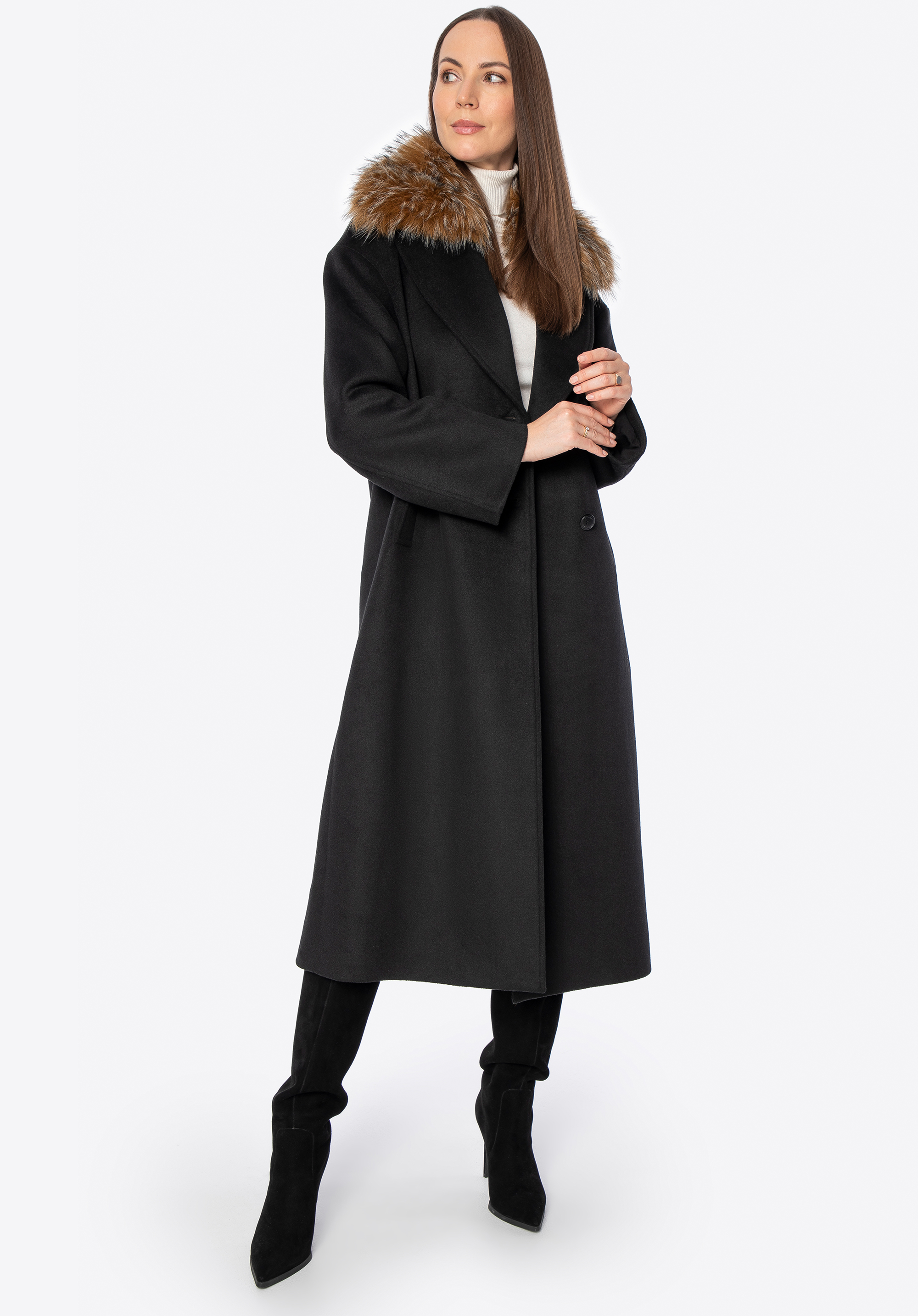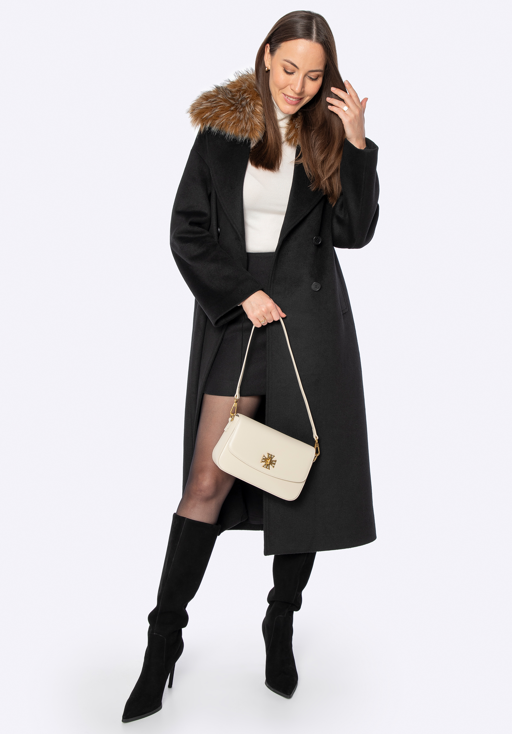 Zimná elegancia – dámsky dvojradový kabát s odnímateľnou umelou kožušinou