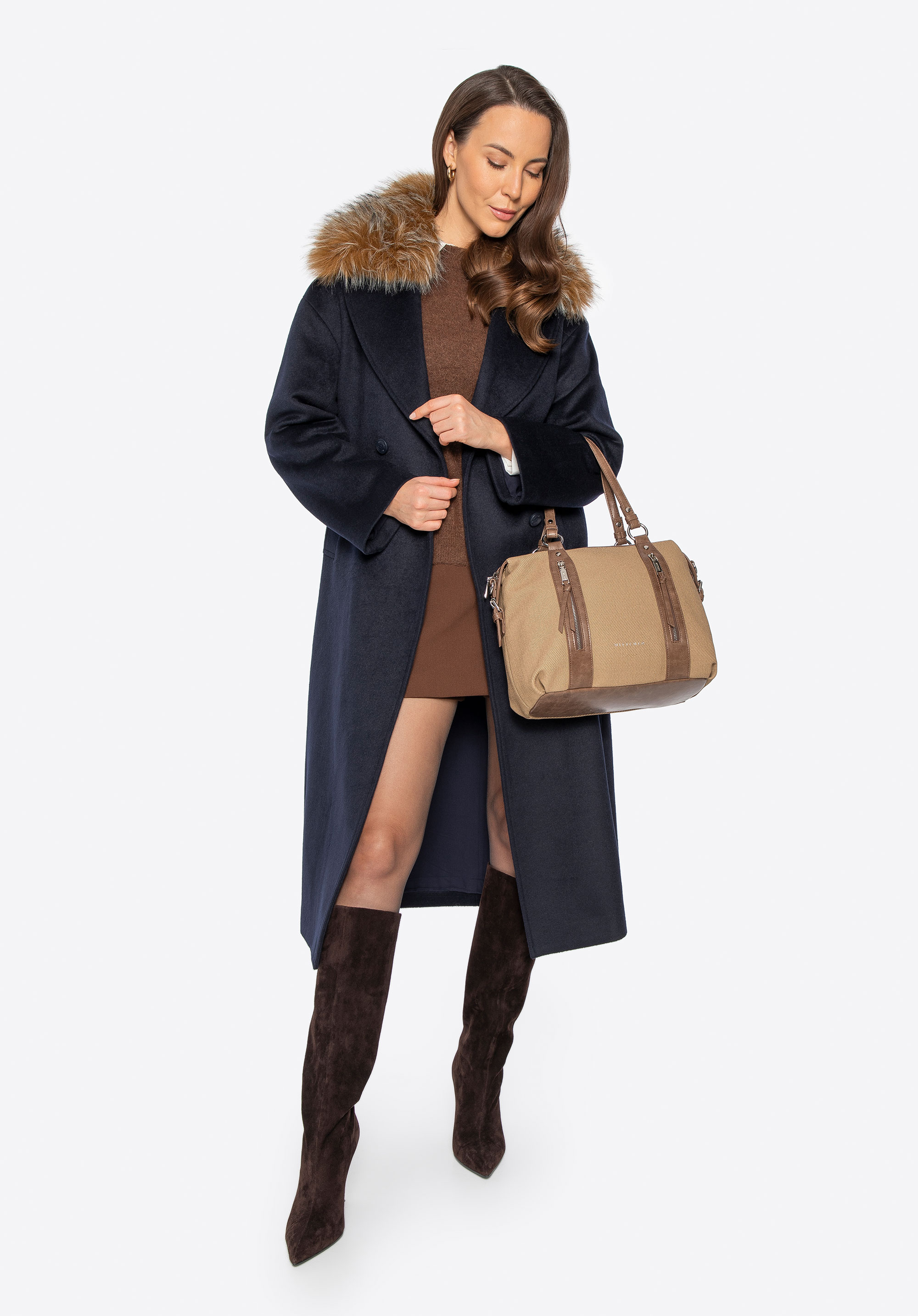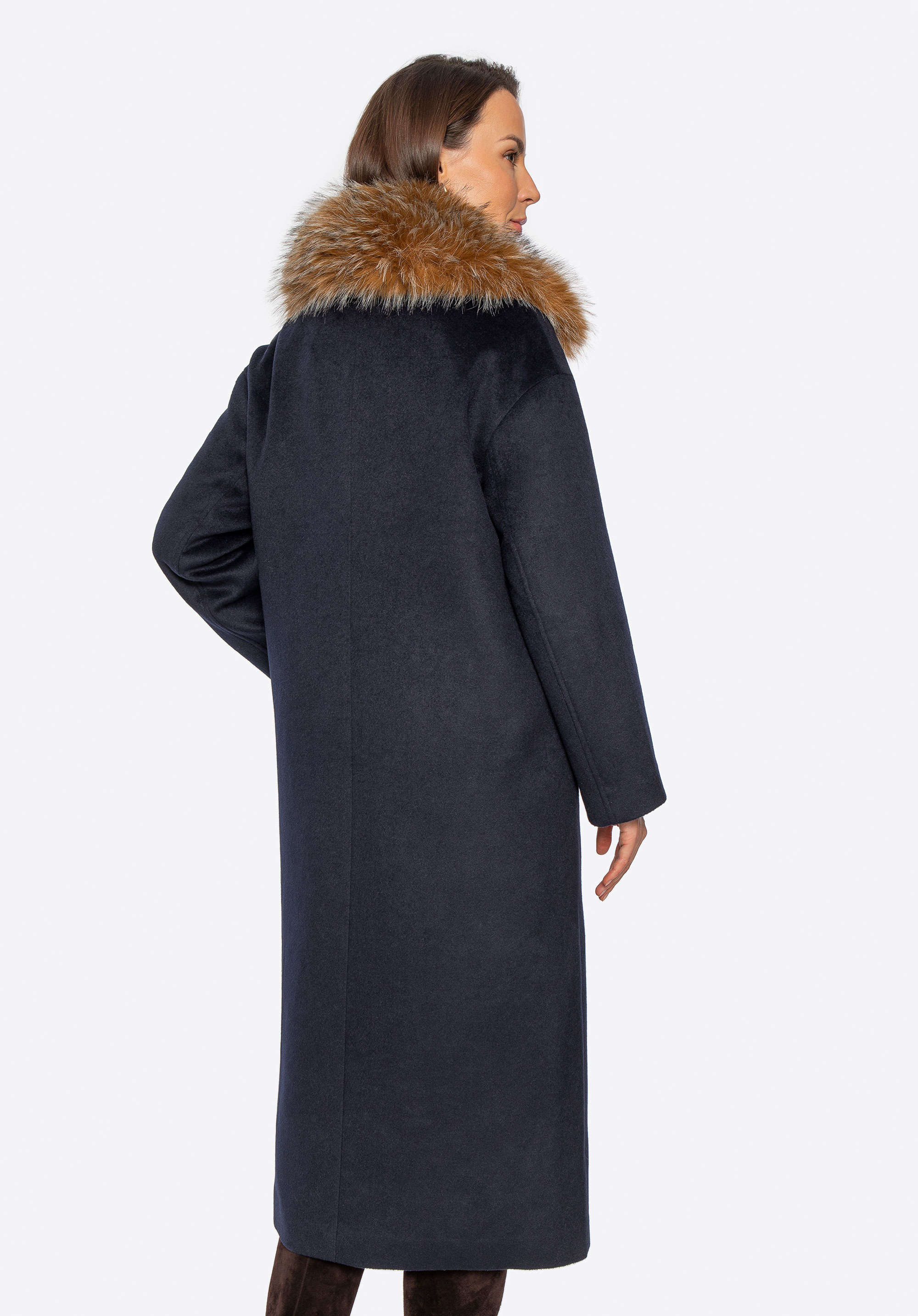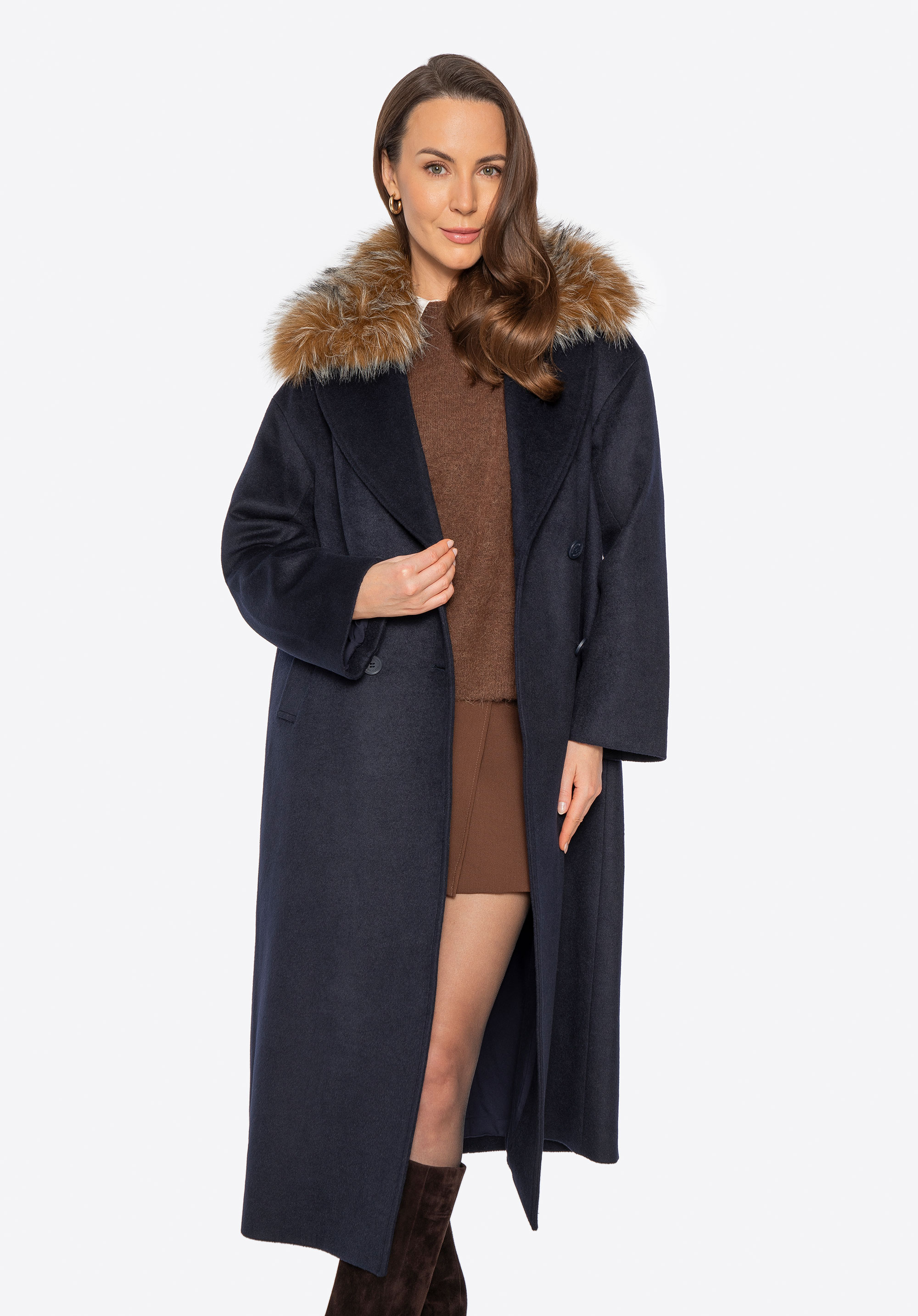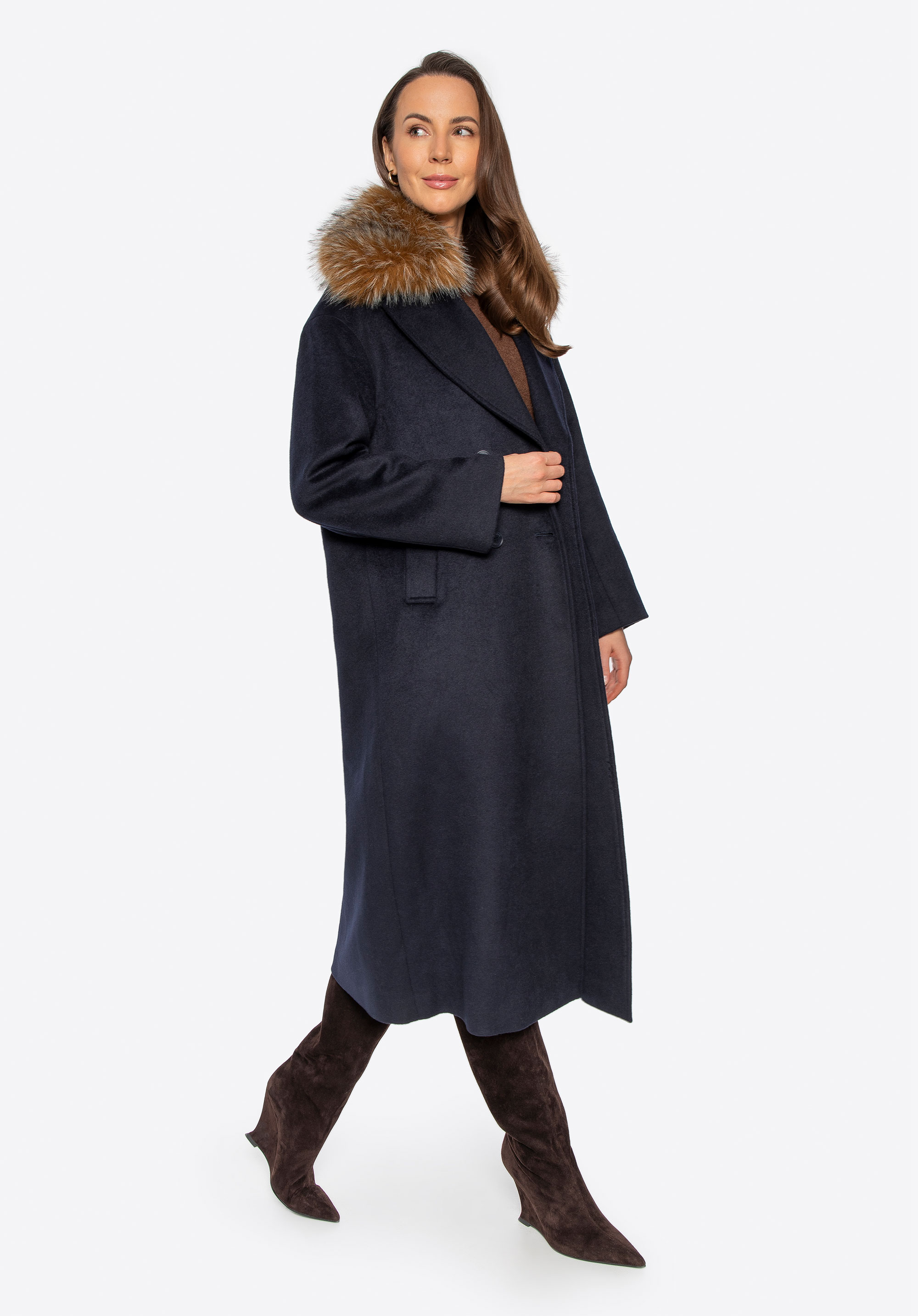 Tento elegantný dámsky kabát s dvojradovým zapínaním je nadčasovou voľbou na chladnejšie dni. Je vyrobený zo zmesi vlny a polyesteru a ponúka vynikajúci tepelný komfort a dlhotrvajúcu odolnosť. Klasický vrúbkovaný golier sa dá kombinovať s mäkkým lemom z umelej kožušiny alebo bez neho, čo vám umožní ľahko prejsť od minimalistickej elegancie k elegantnému zimnému vzhľadu. Vnútorná časť je zakončená hladkou viskózovou podšívkou pre väčšie pohodlie pri nosení. Zapínanie na gombíky zdôrazňuje štruktúrovanú, klasickú siluetu kabáta.