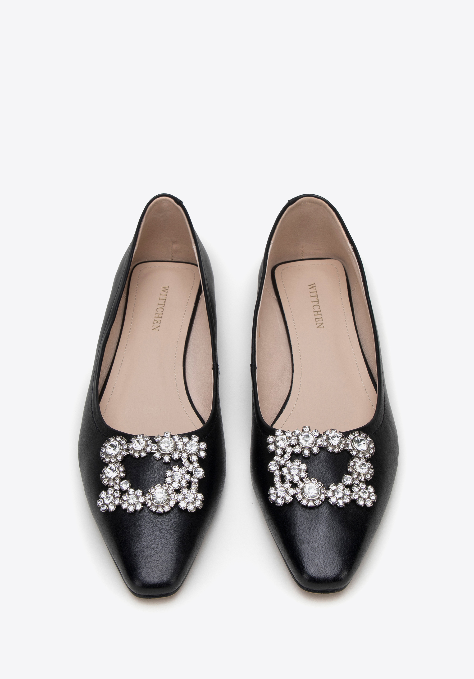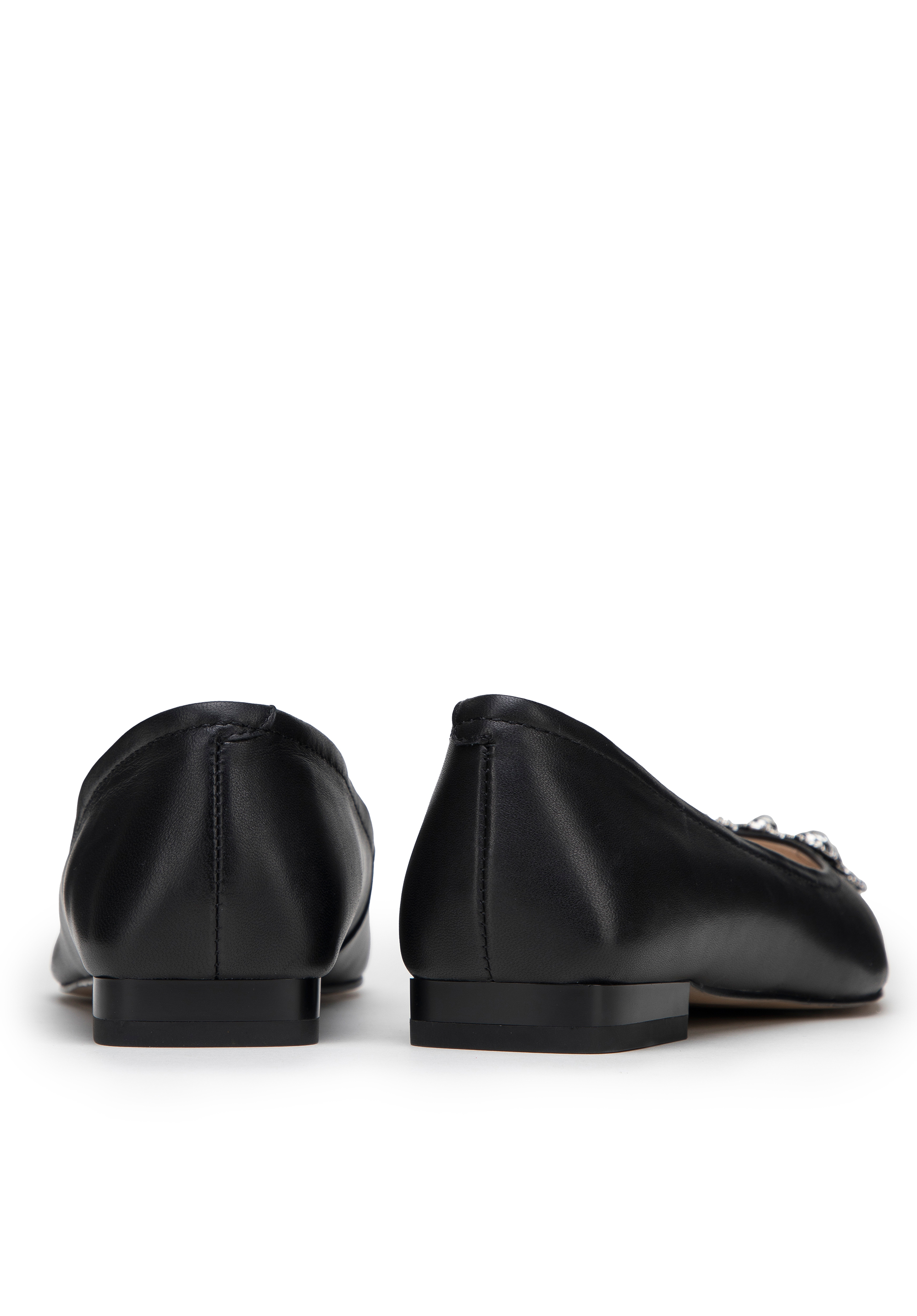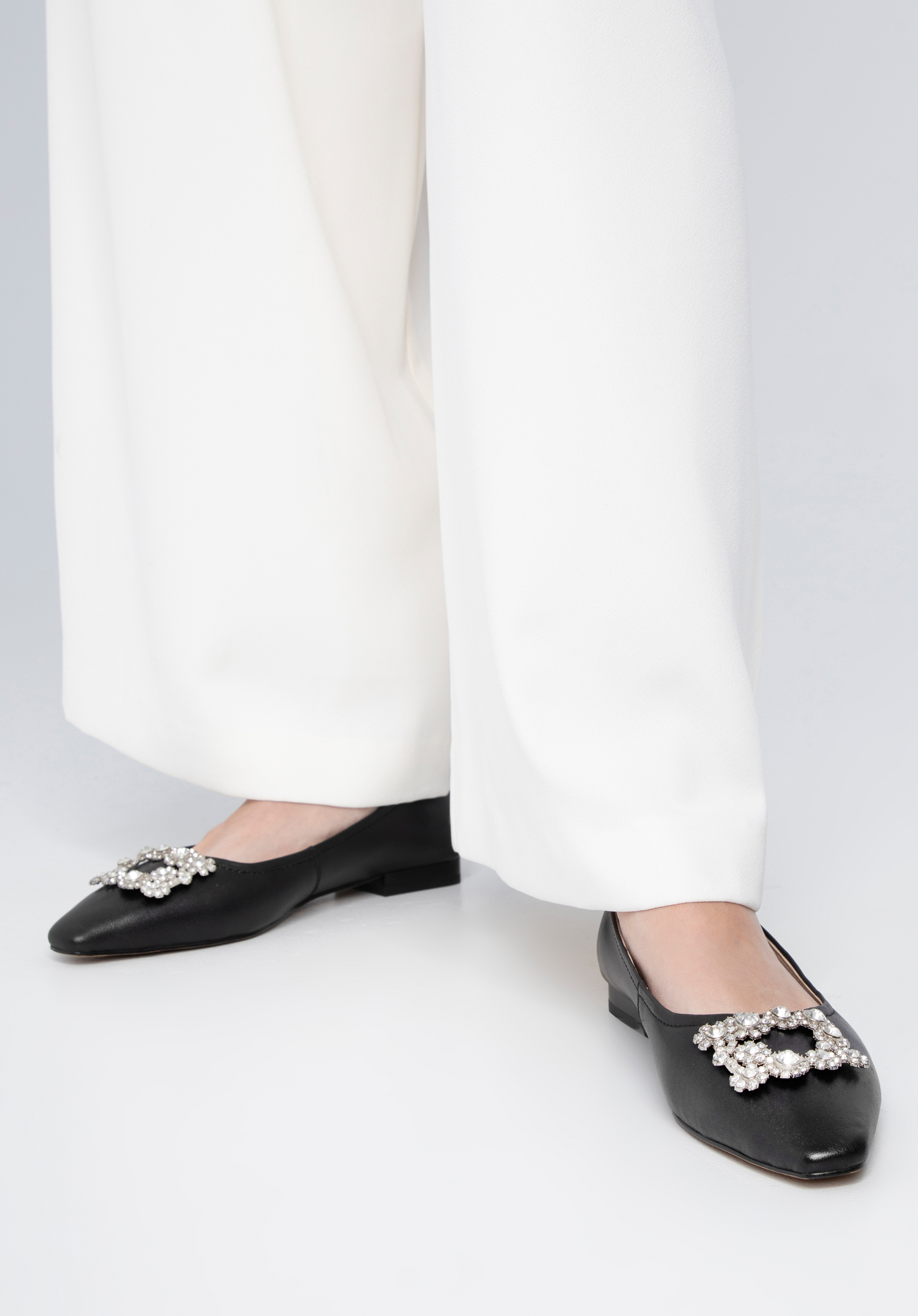 Kožené baleríny s lesklou prackou sú nadčasovým doplnkom, ktorý môžete nosiť do práce aj po práci.