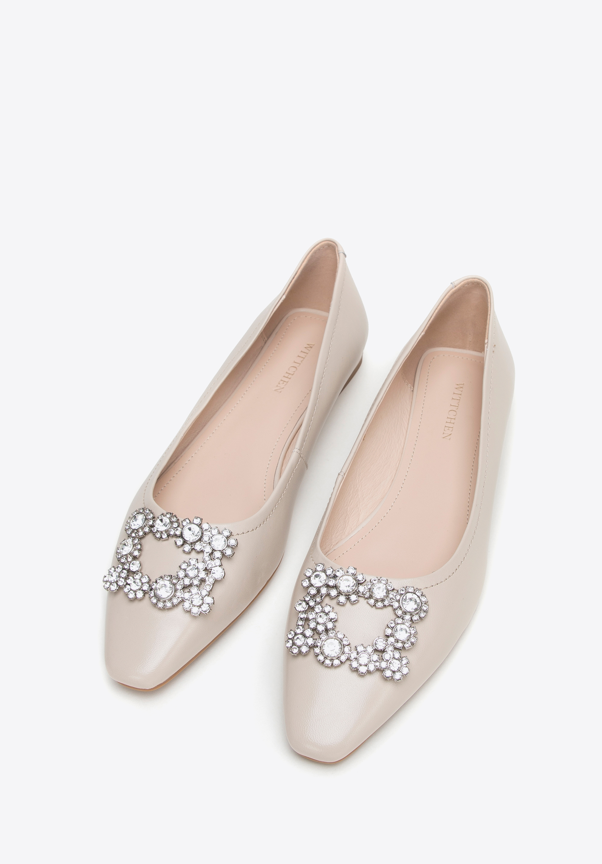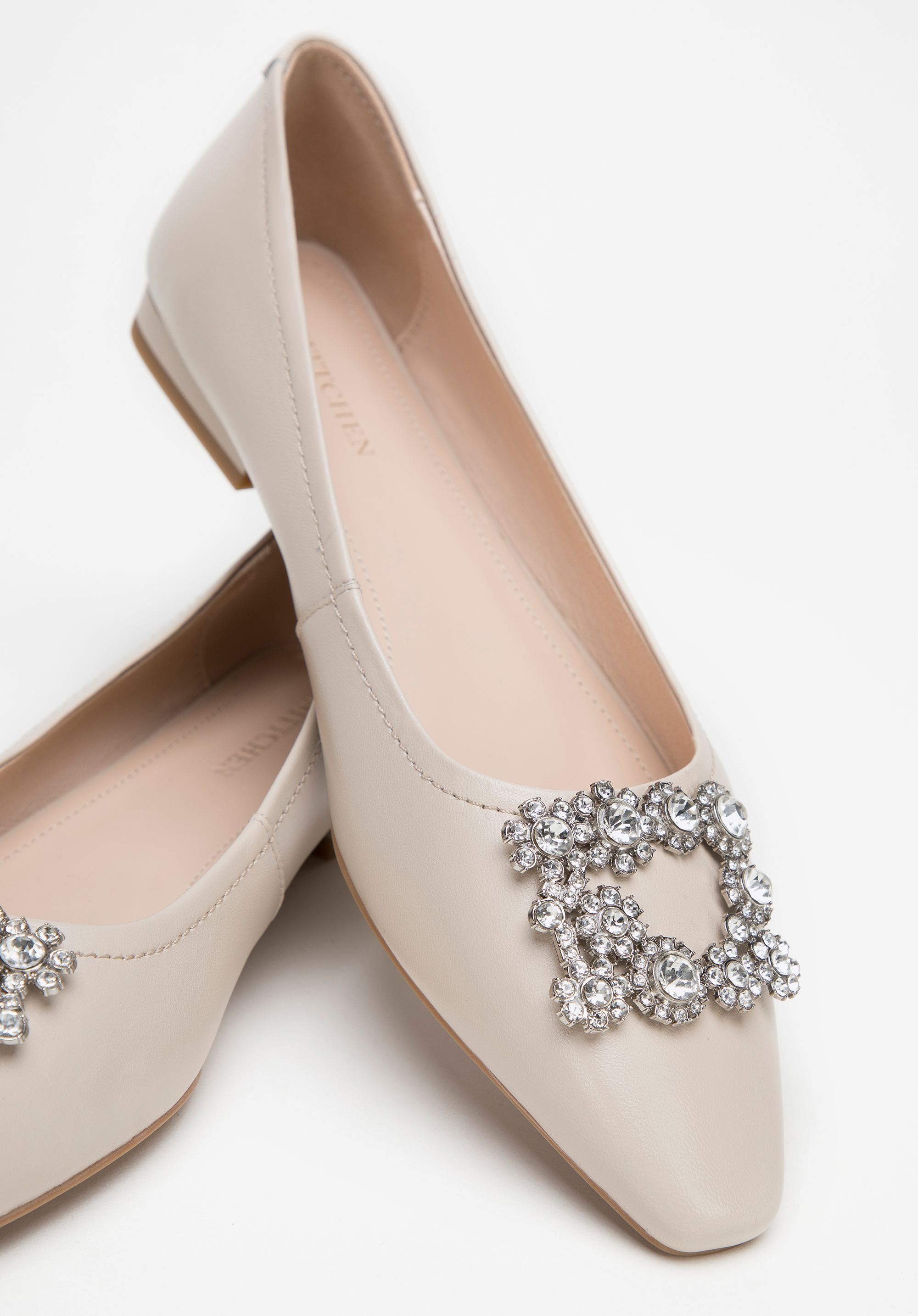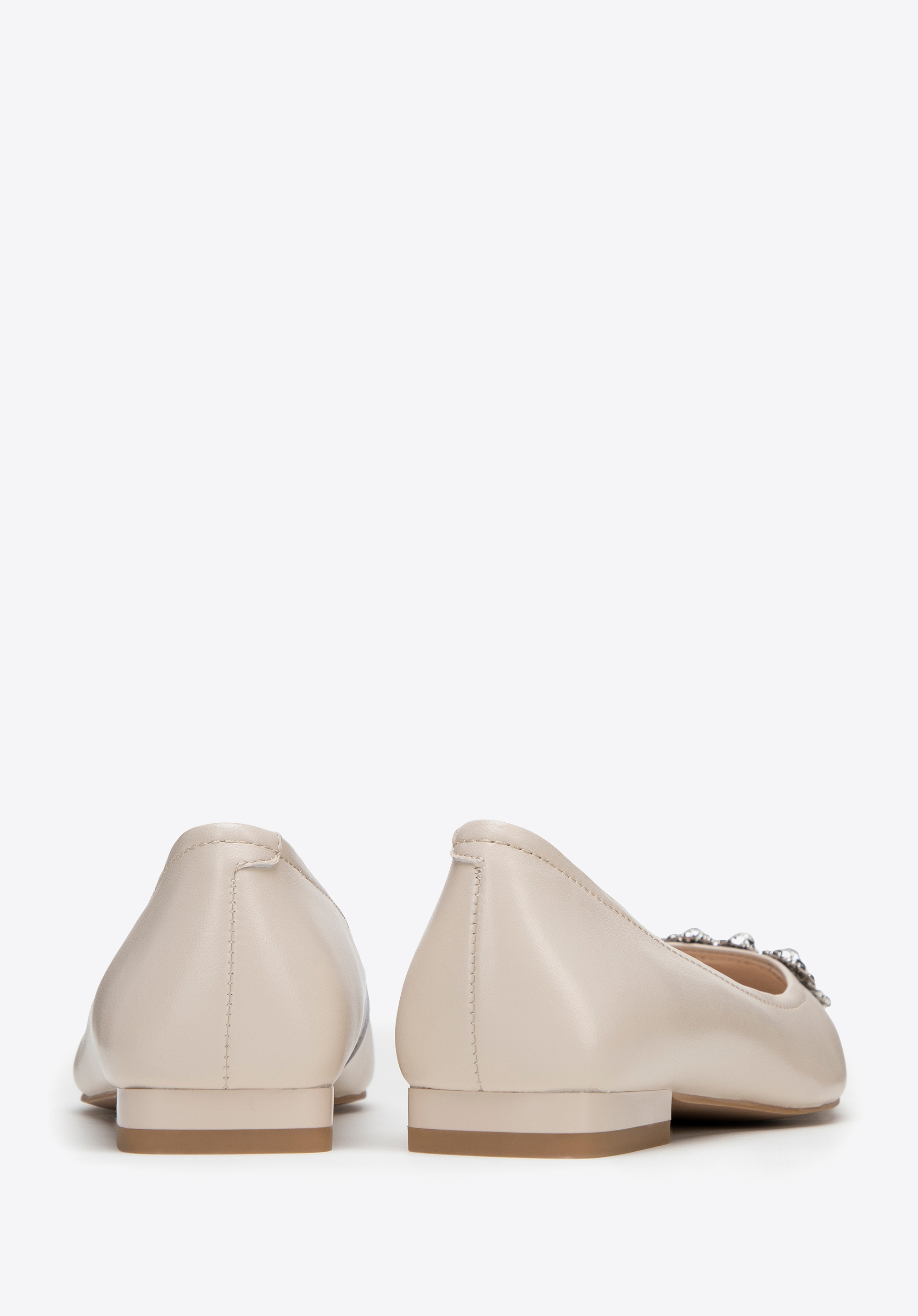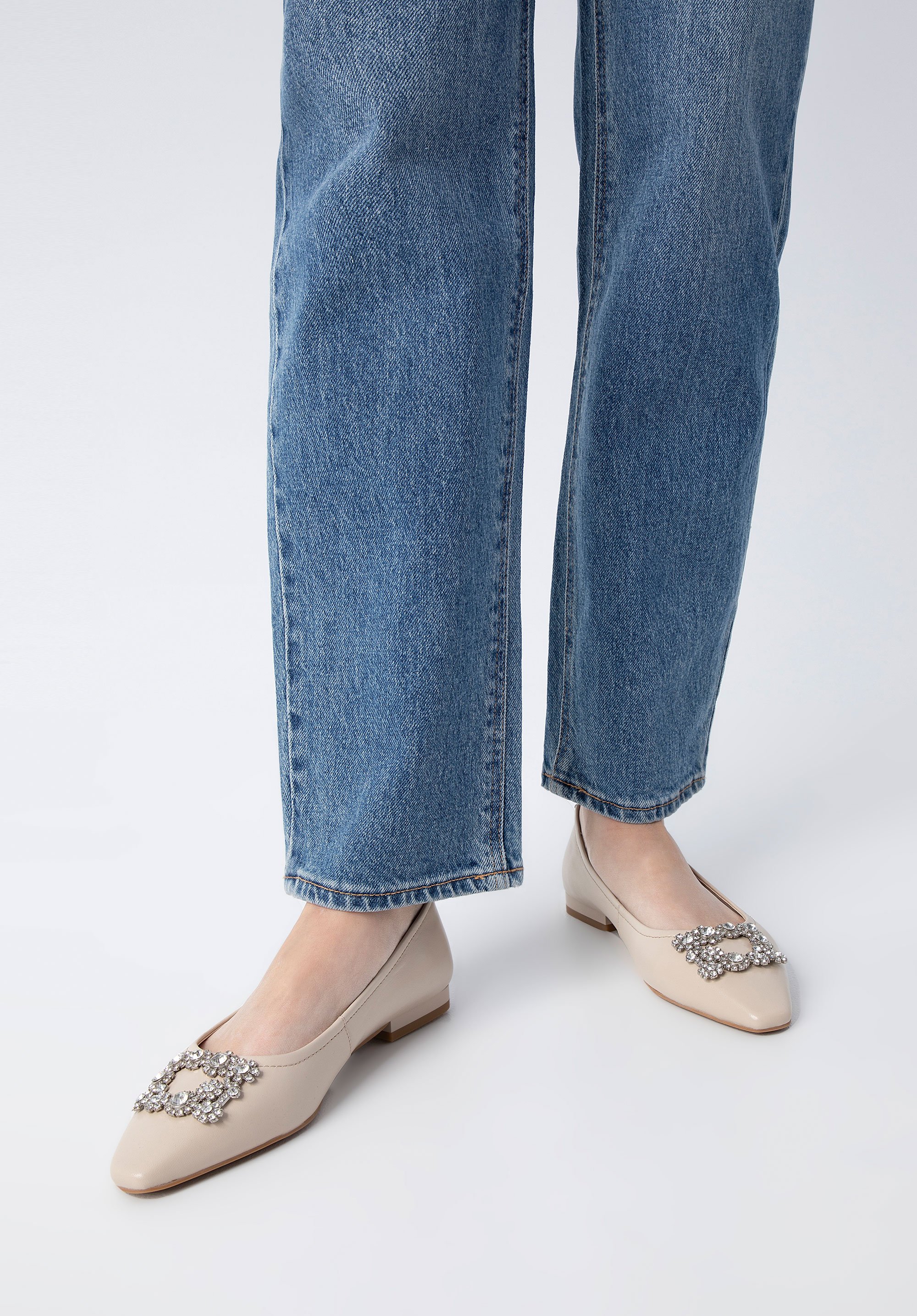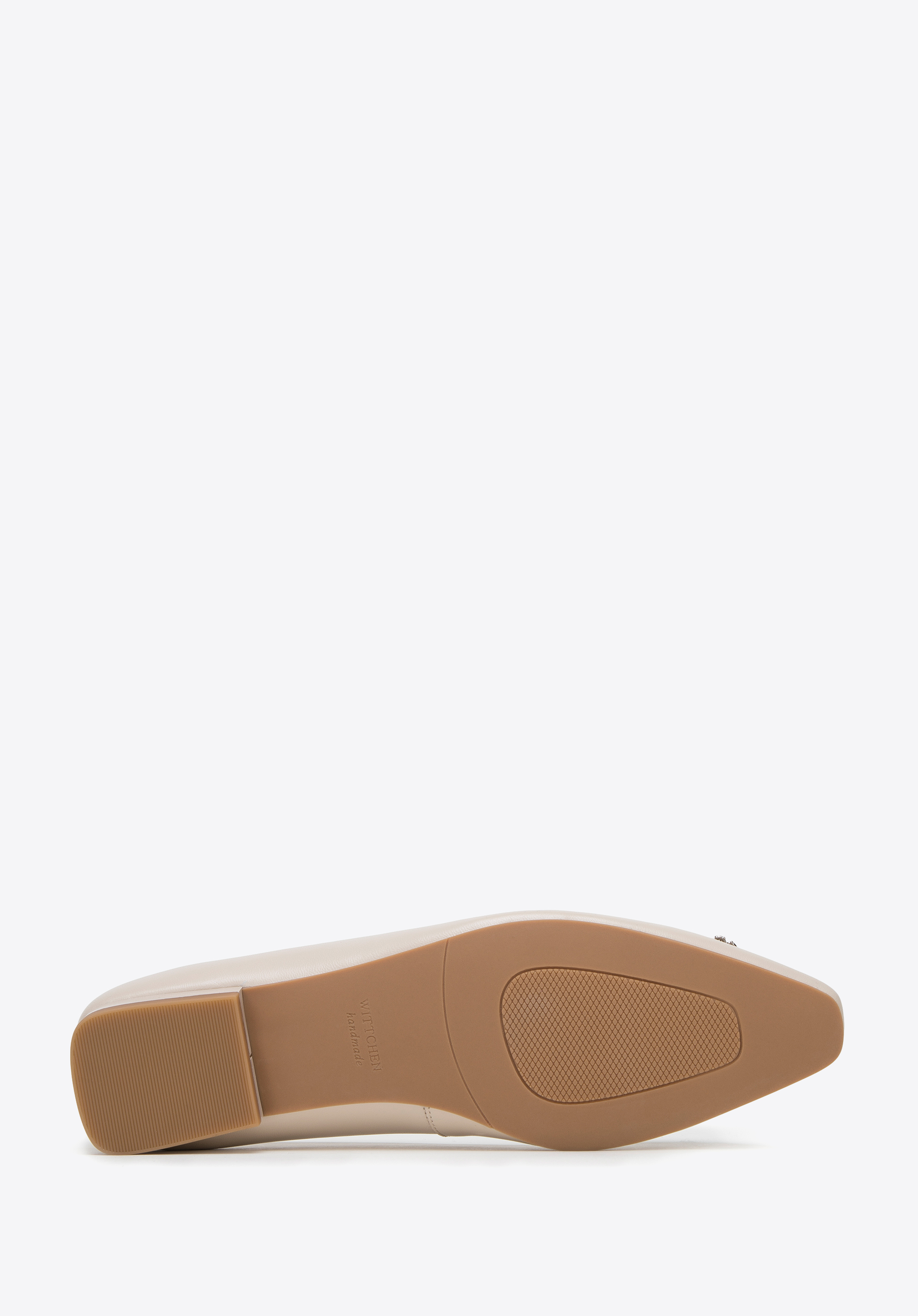 Kožené baleríny s lesklou prackou sú nadčasovým doplnkom, ktorý môžete nosiť do práce aj po práci.