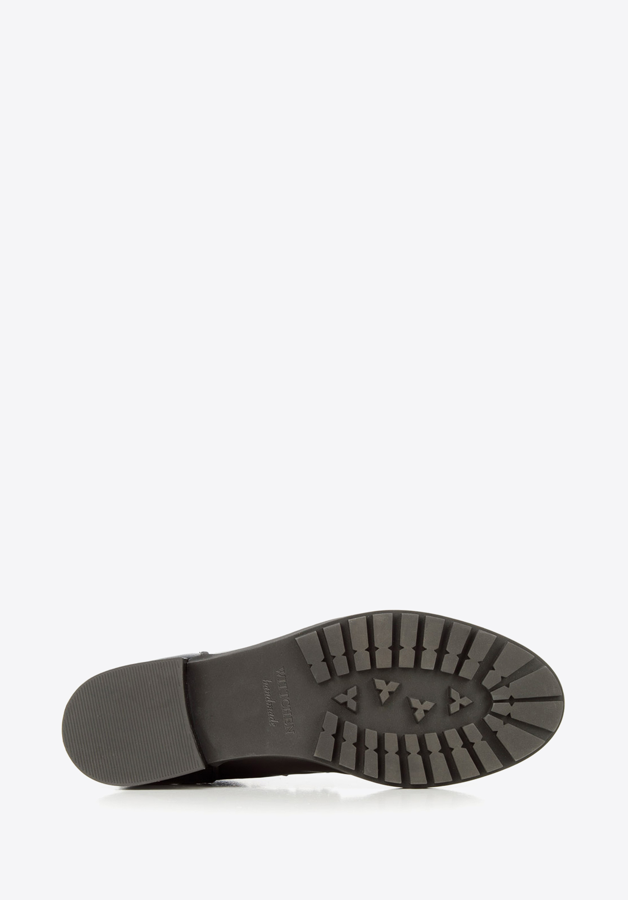 Štýlové, a zároveň praktické topánky na jeseň. Boli ušité v Poľsku z najkvalitnejšej hladkej prírodnej kože. Sú plné módnych akcentov: vpredu majú jemnú retiazku a po stranách elastické vložky, ktoré nielenže vyzerajú efektne, ale vďaka ktorým sa aj ľahko obúvajú. Predná časť topánky je obšitá lemovacím švom prevzatým z mokasín;. Elegantná protišmyková podrážka sa osvedčí aj na klzkom alebo vlhkom povrchu. Na druhej strane malý lakovaný podpätok má najlepšiu výšku pre chodidlo - 3 cm. Kožené členkové čižmy s bočnými gumičkami a retiazkou dobre vyniknú v mnohých štylizáciách: od elegantného outfitu do práce až po džínsy a sveter na víkendový výlet.