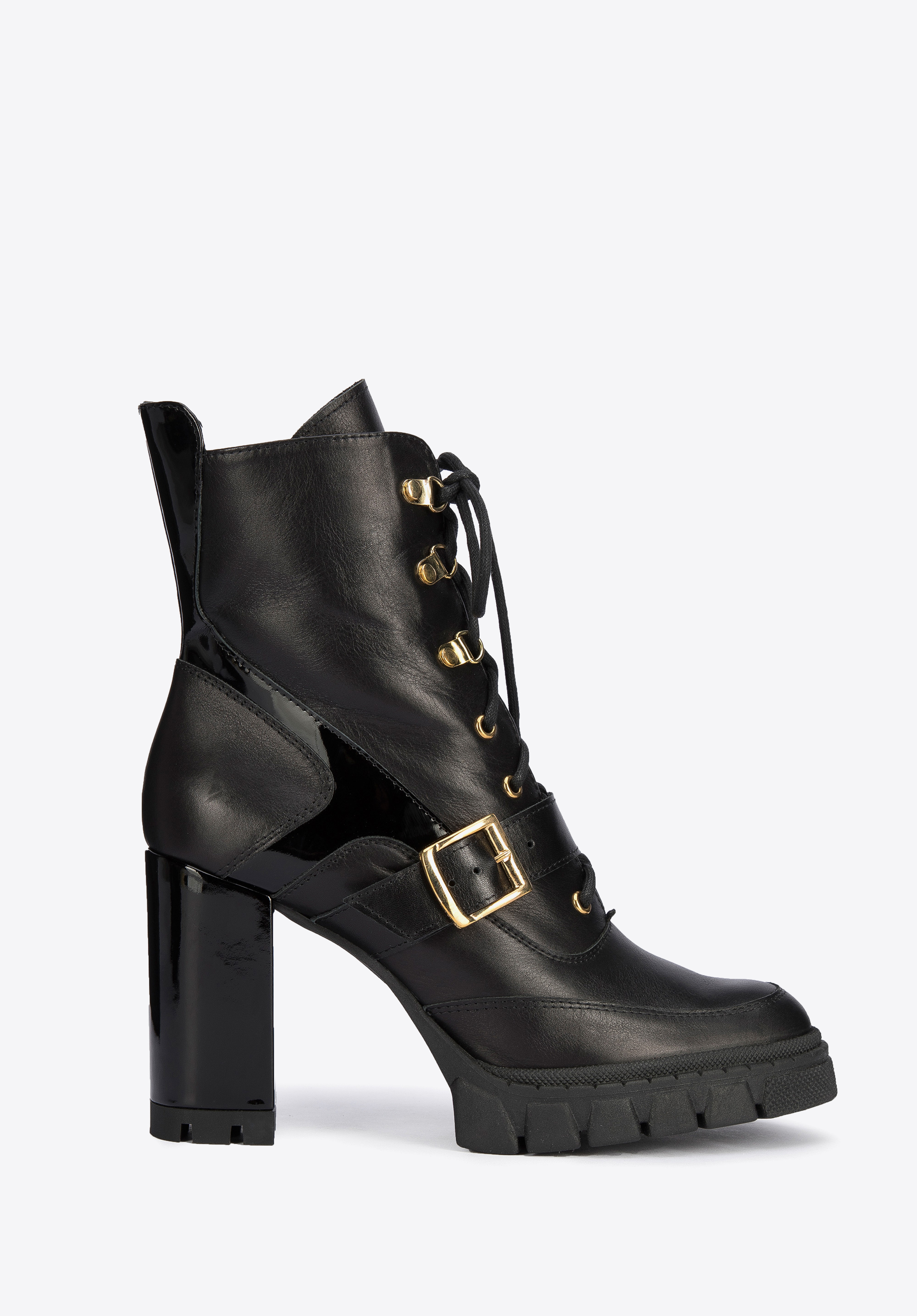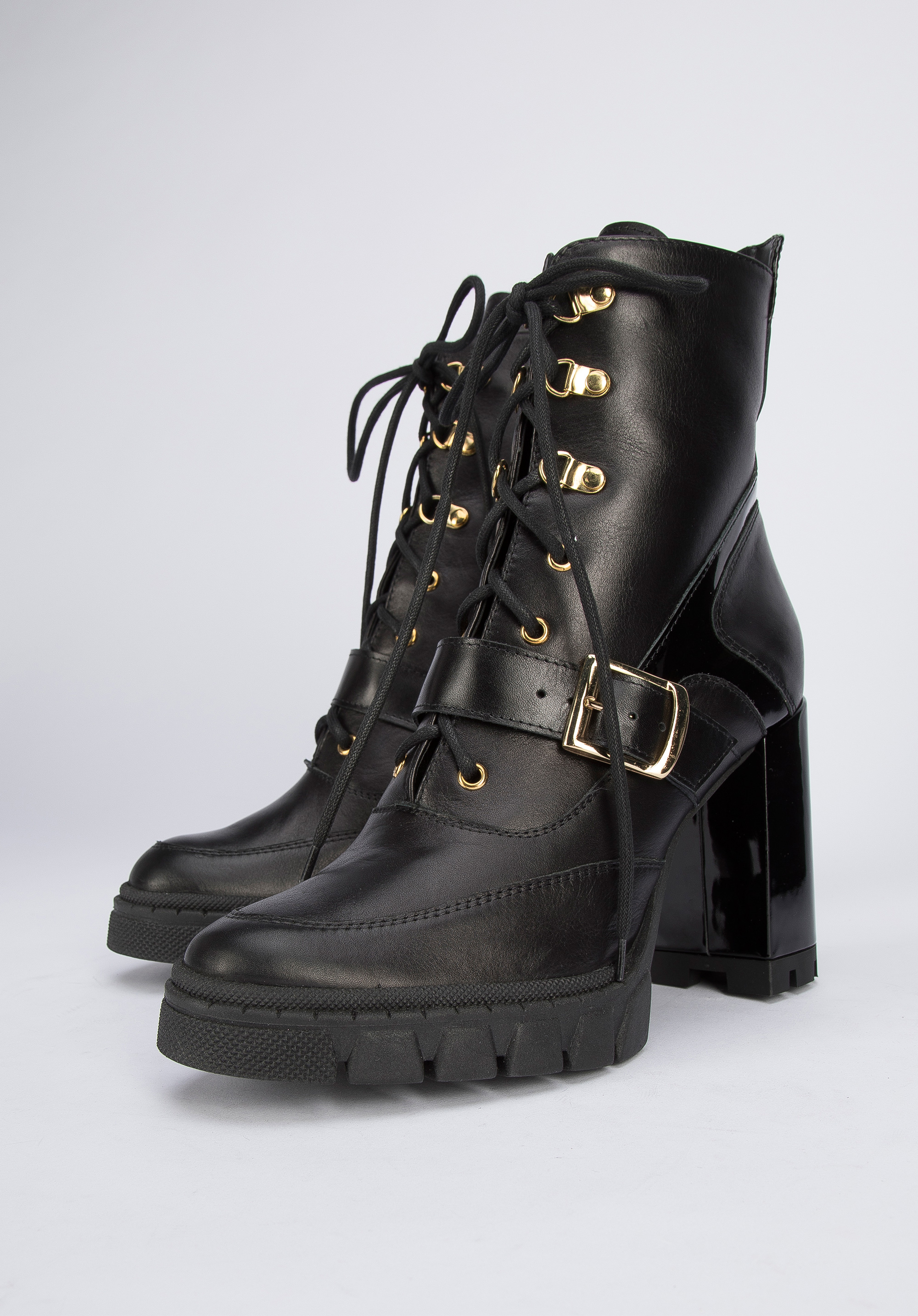 Stĺpikový podpätok zdobený lakovanou kožou zabezpečí pohodlnú chôdzu a dodá vám pár centimetrov výšky.