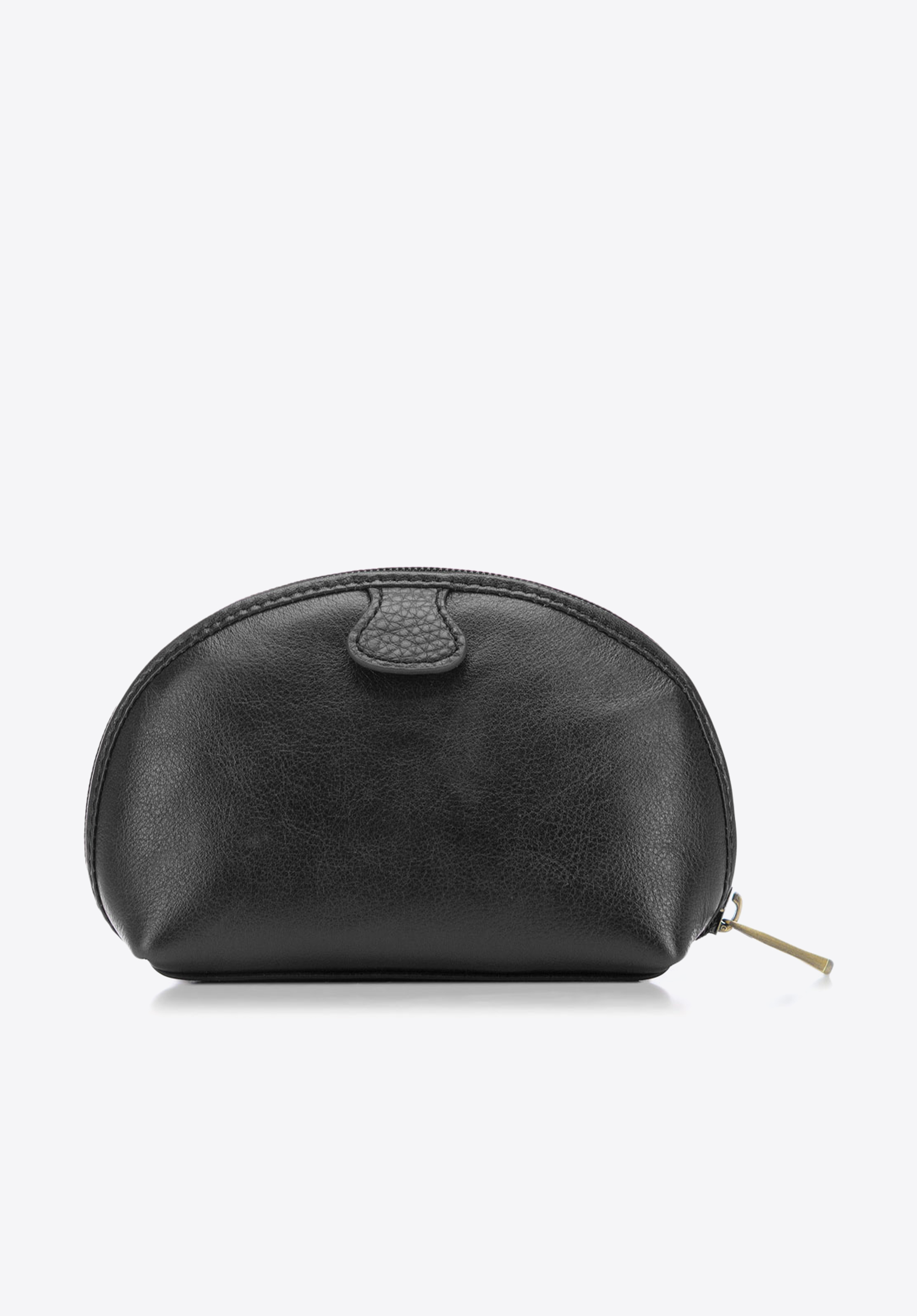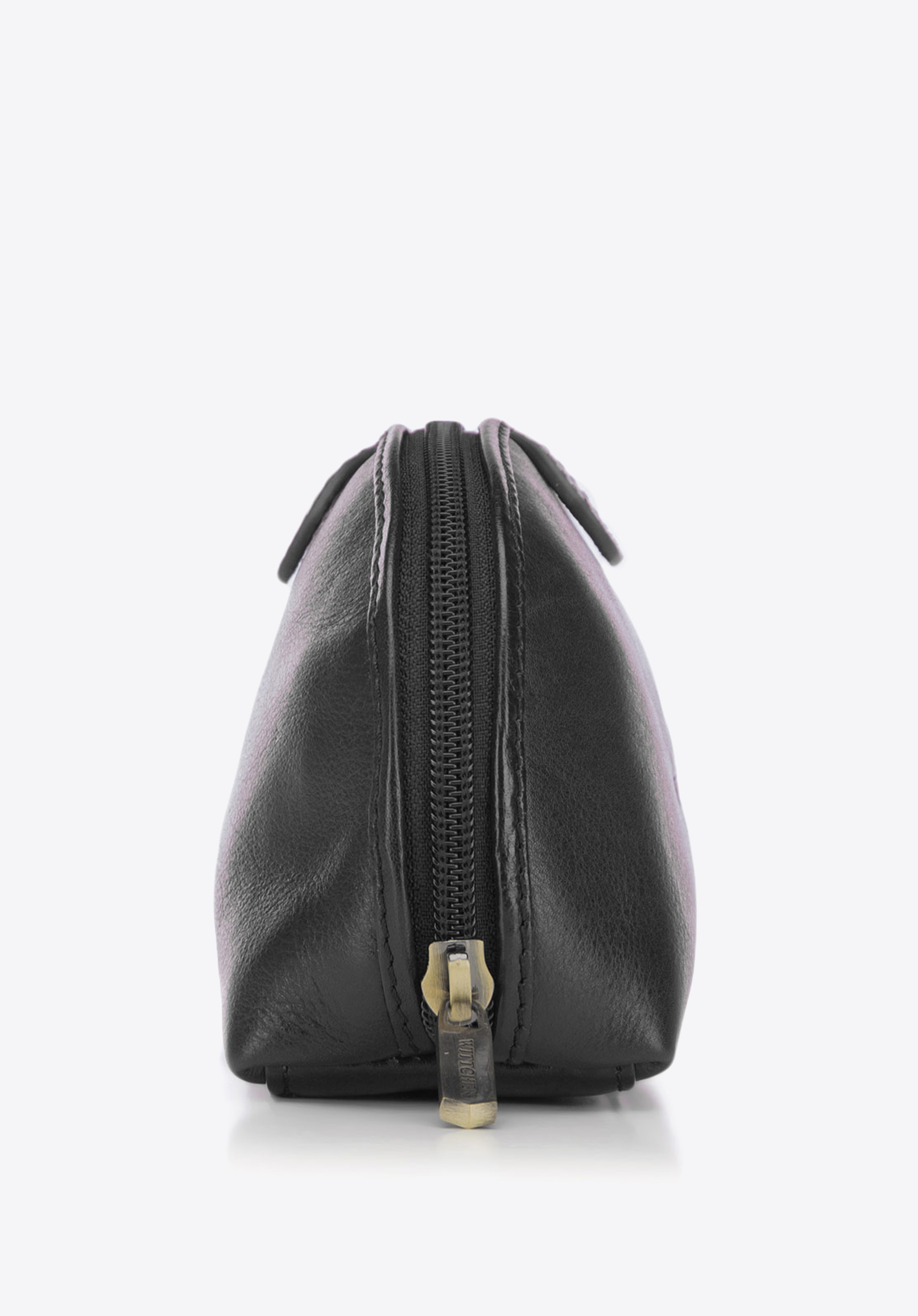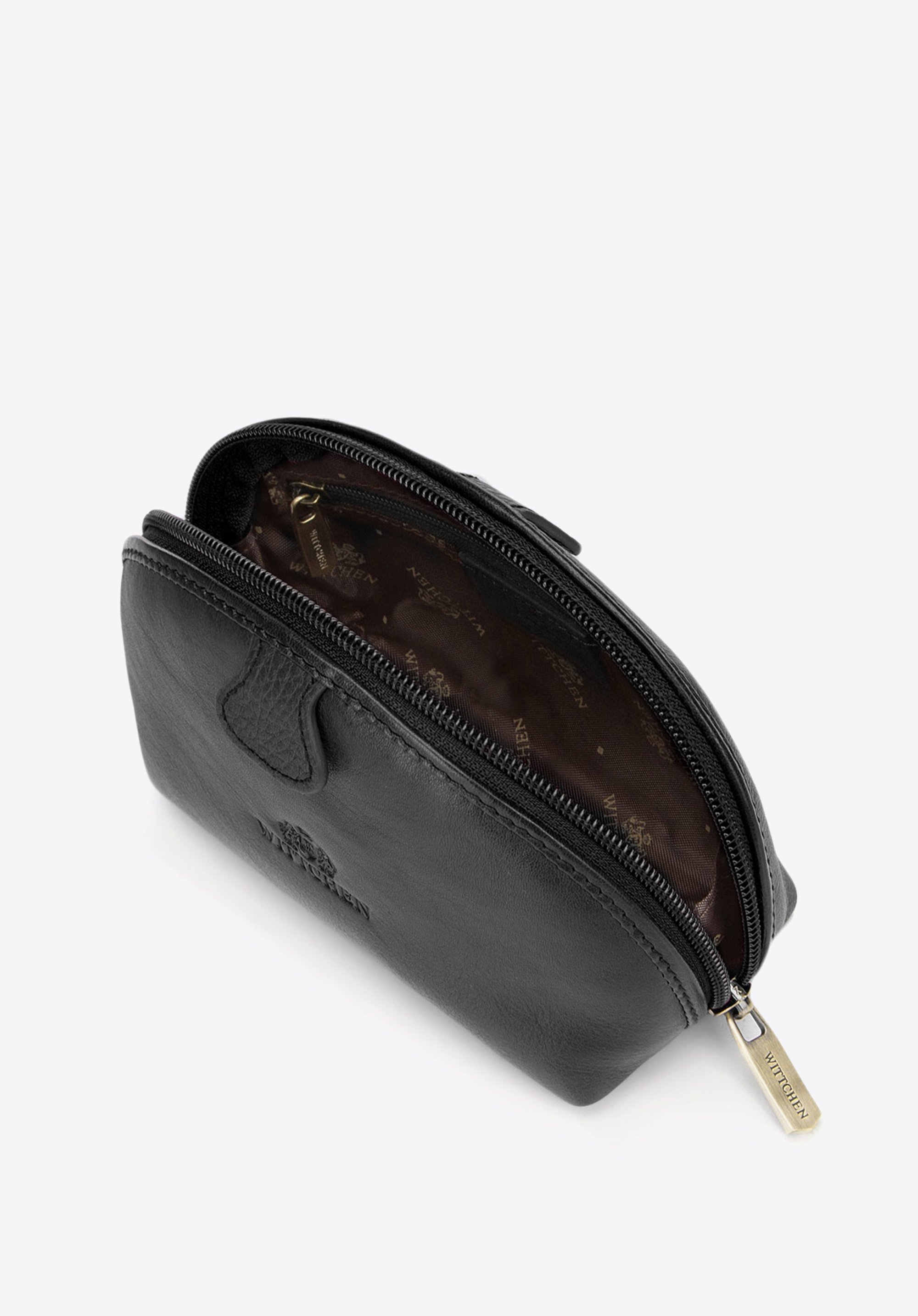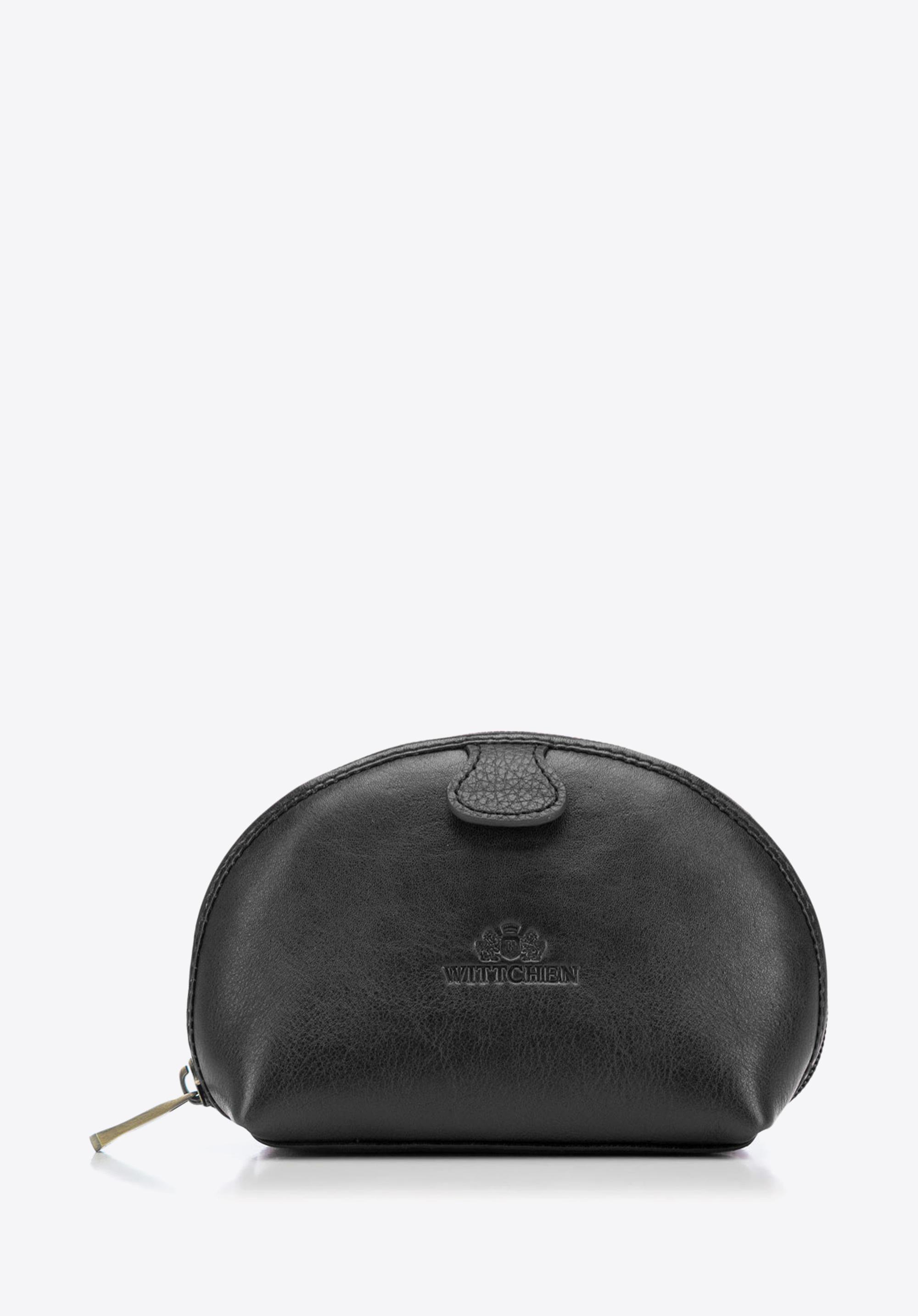 Malá kozmetická taška, do ktorej sa zmestí vaša najpotrebnejšia kozmetika a doplnky. Štýlový okrúhly model z prírodnej kože so zrnitou povrchovou úpravou je ozdobený ďalším plátkom materiálu a vyrazeným logom WITTCHEN.