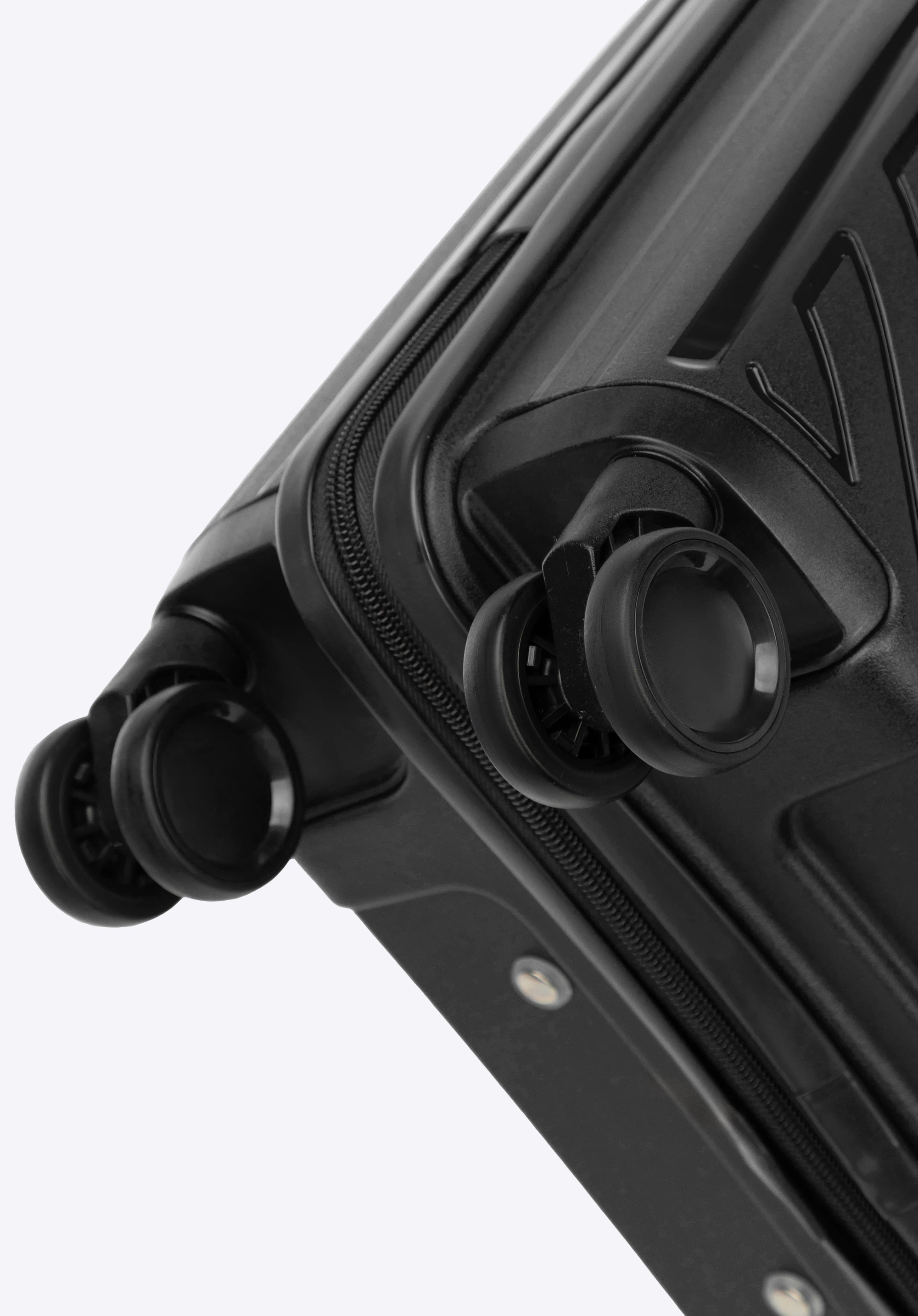 - Dizajn: Diagonálna razba a okrúhle logo dodávajú jemnú eleganciu. Plastové prvky vrátane koliesok a rukoväte dokonale ladia s farbou kufra a umocňujú tak ucelený dizajn.