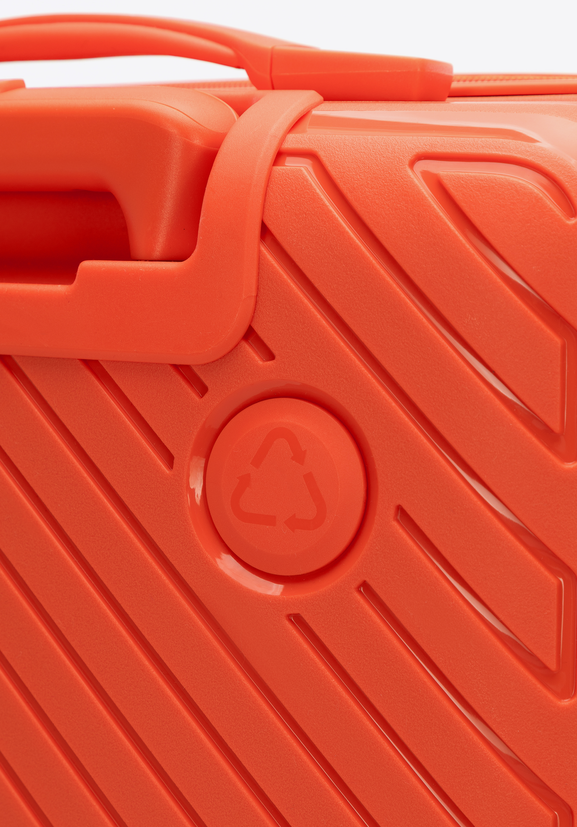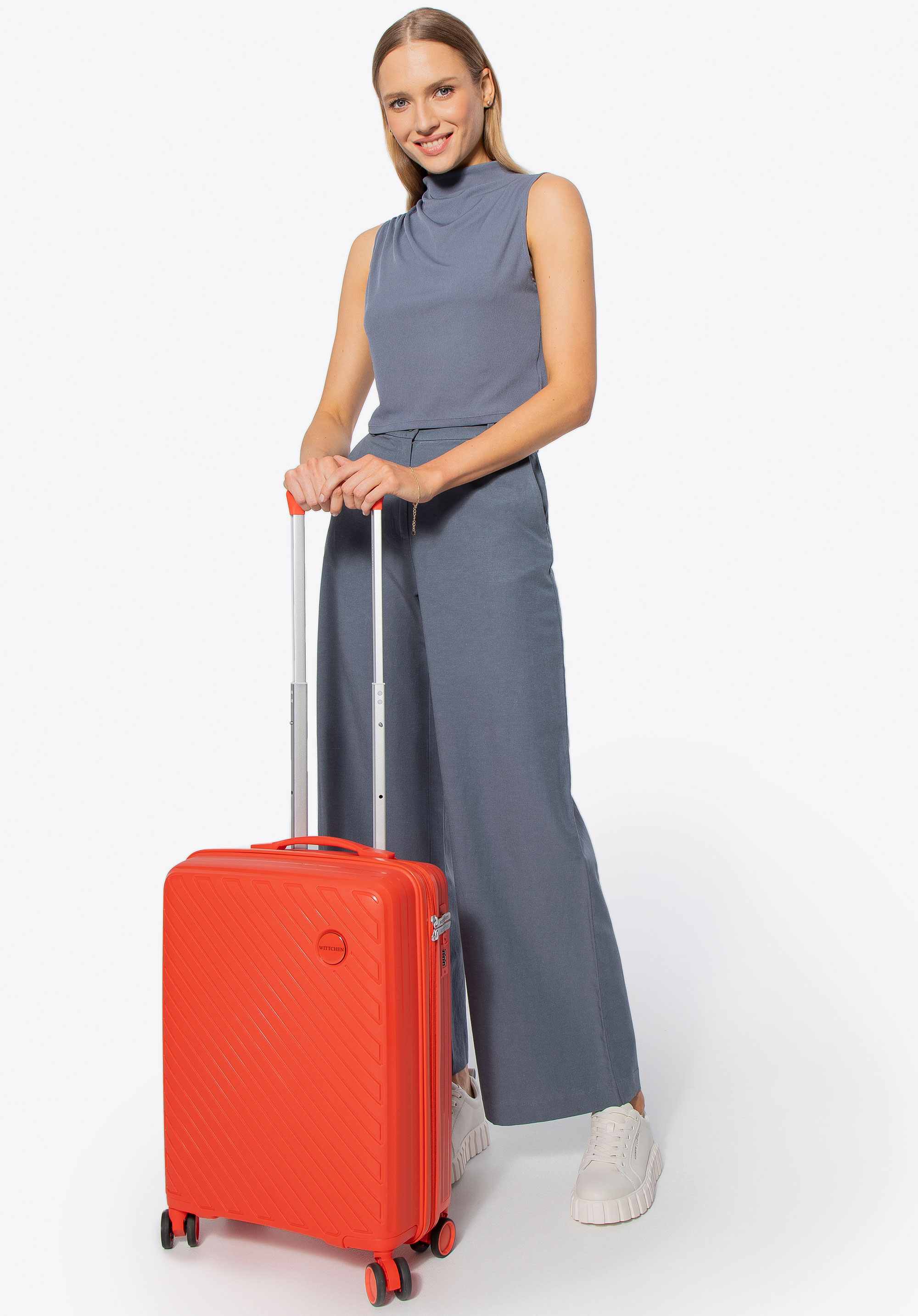 - Dizajn: Diagonálna razba a okrúhle logo dodávajú jemnú eleganciu. Plastové prvky vrátane koliesok a rukoväte dokonale ladia s farbou kufra a umocňujú tak ucelený dizajn.
