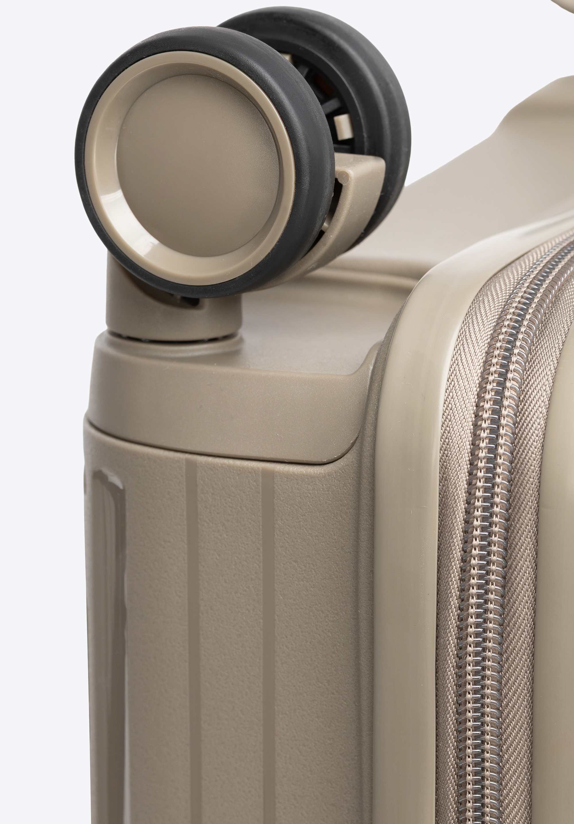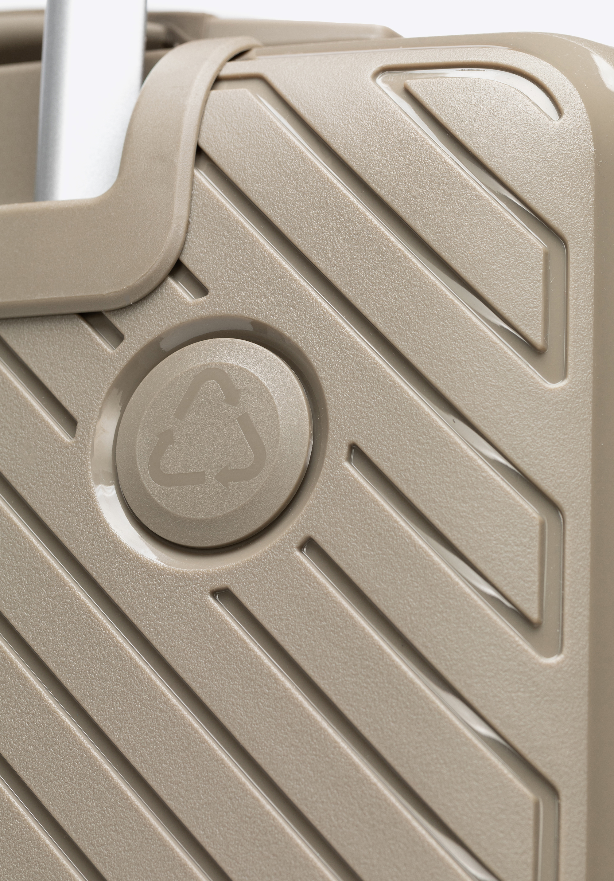 - Dizajn: Diagonálna razba a okrúhle logo dodávajú jemnú eleganciu. Plastové prvky vrátane koliesok a rukoväte dokonale ladia s farbou kufra a umocňujú tak ucelený dizajn.