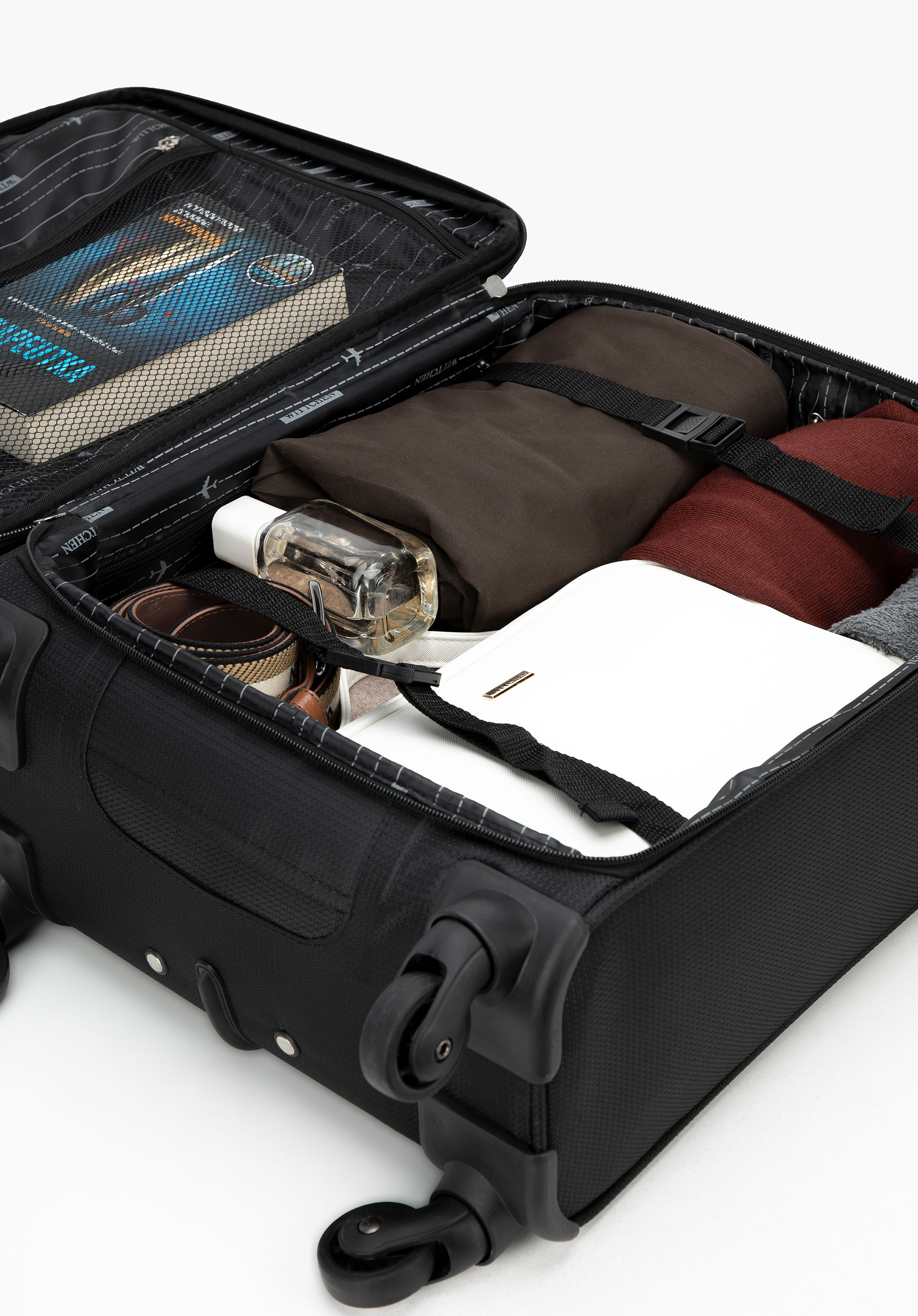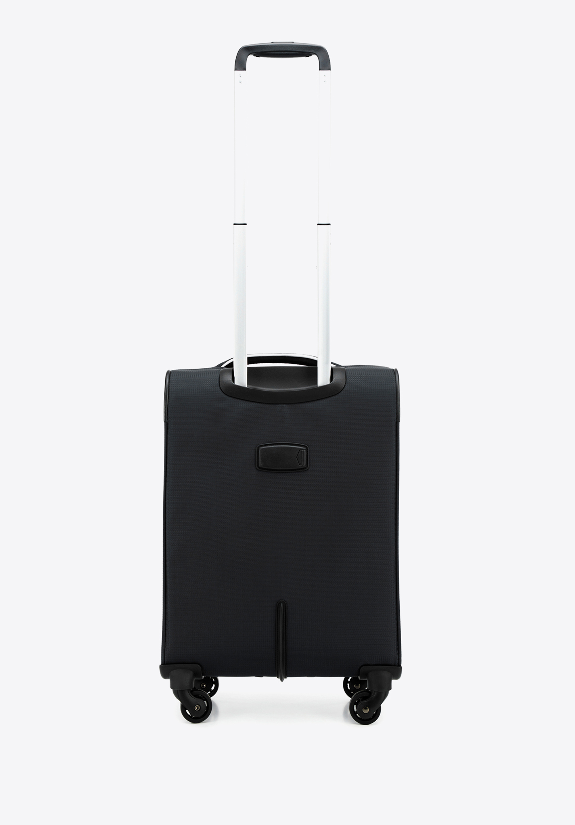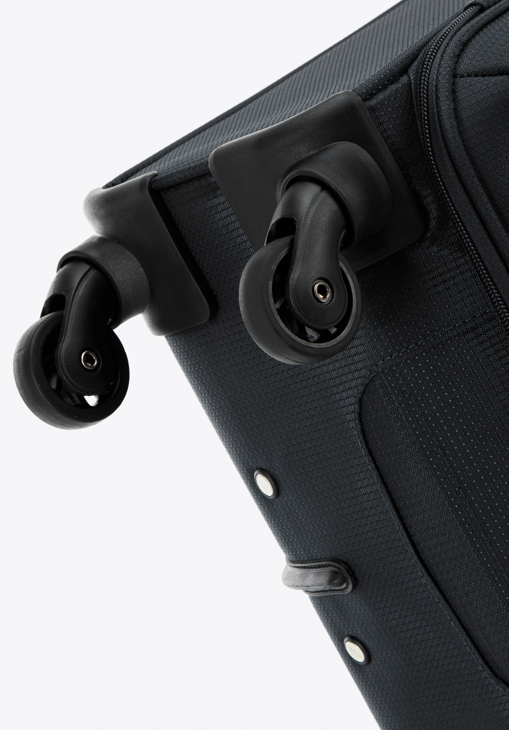 štyrom jednoduchým kolieskam sa bude pohodlne riadiť. Malý mäkký kufor s lesklým zipsom vpredu je skvelou voľbou na víkendový výlet alebo služobnú cestu.