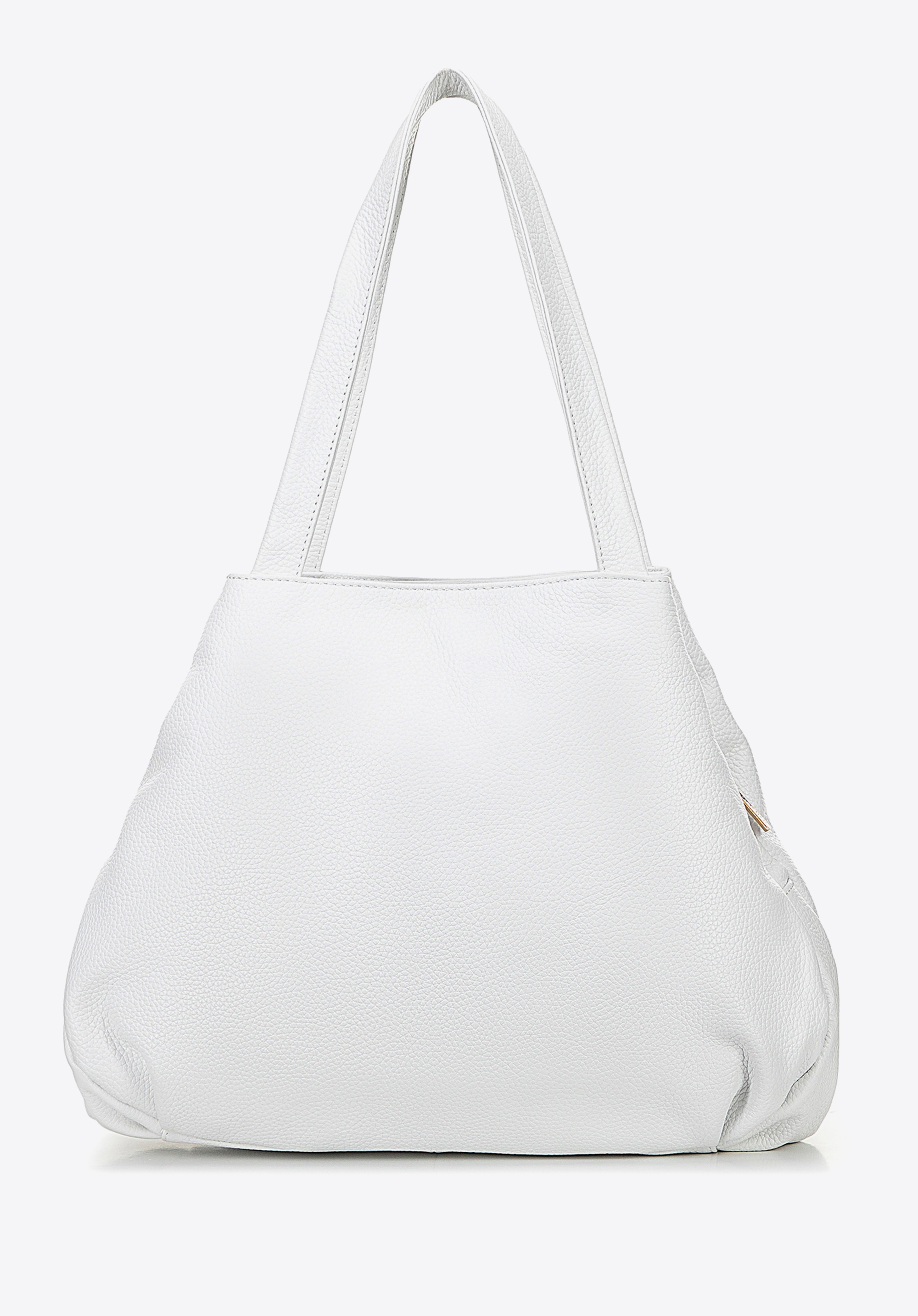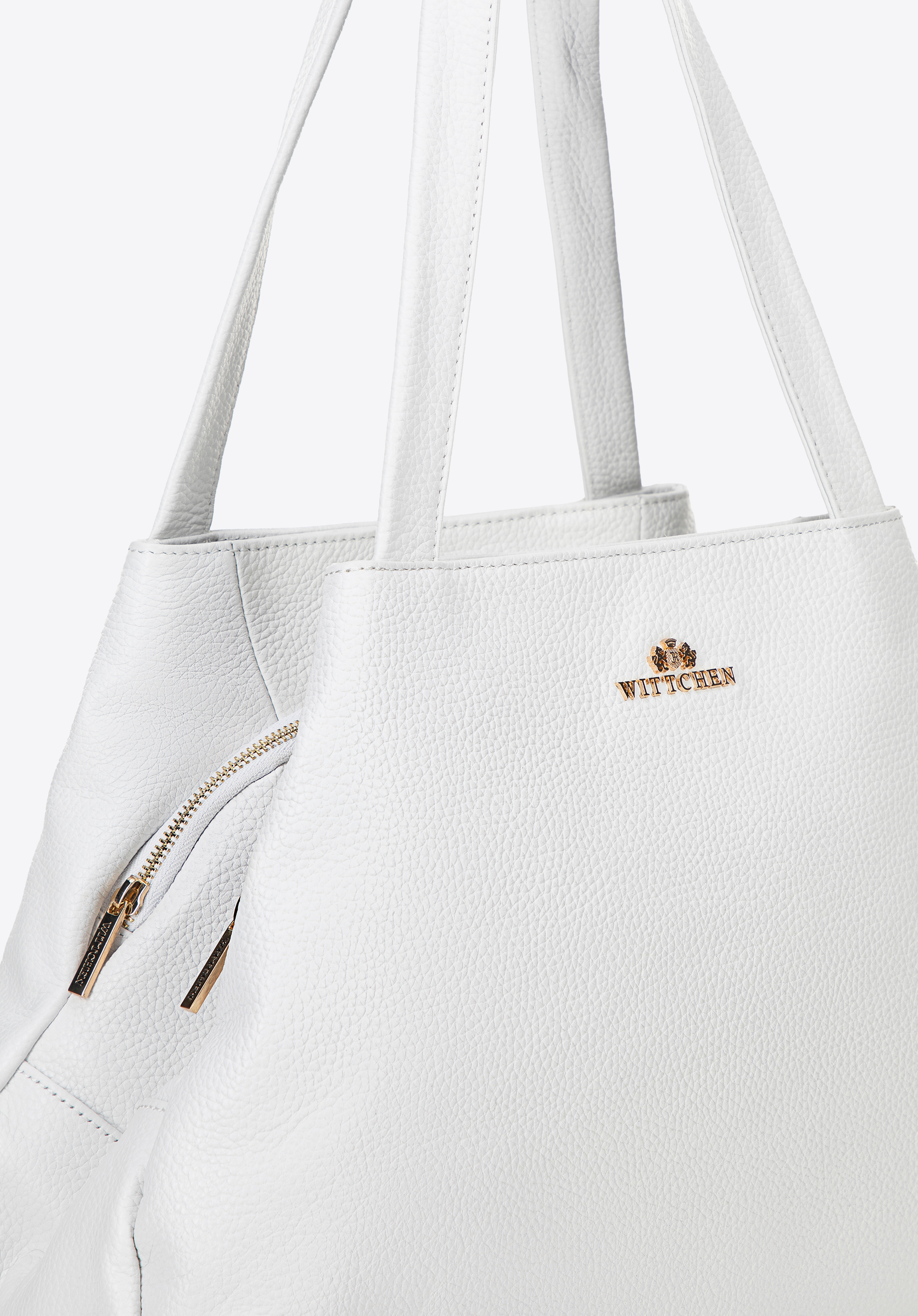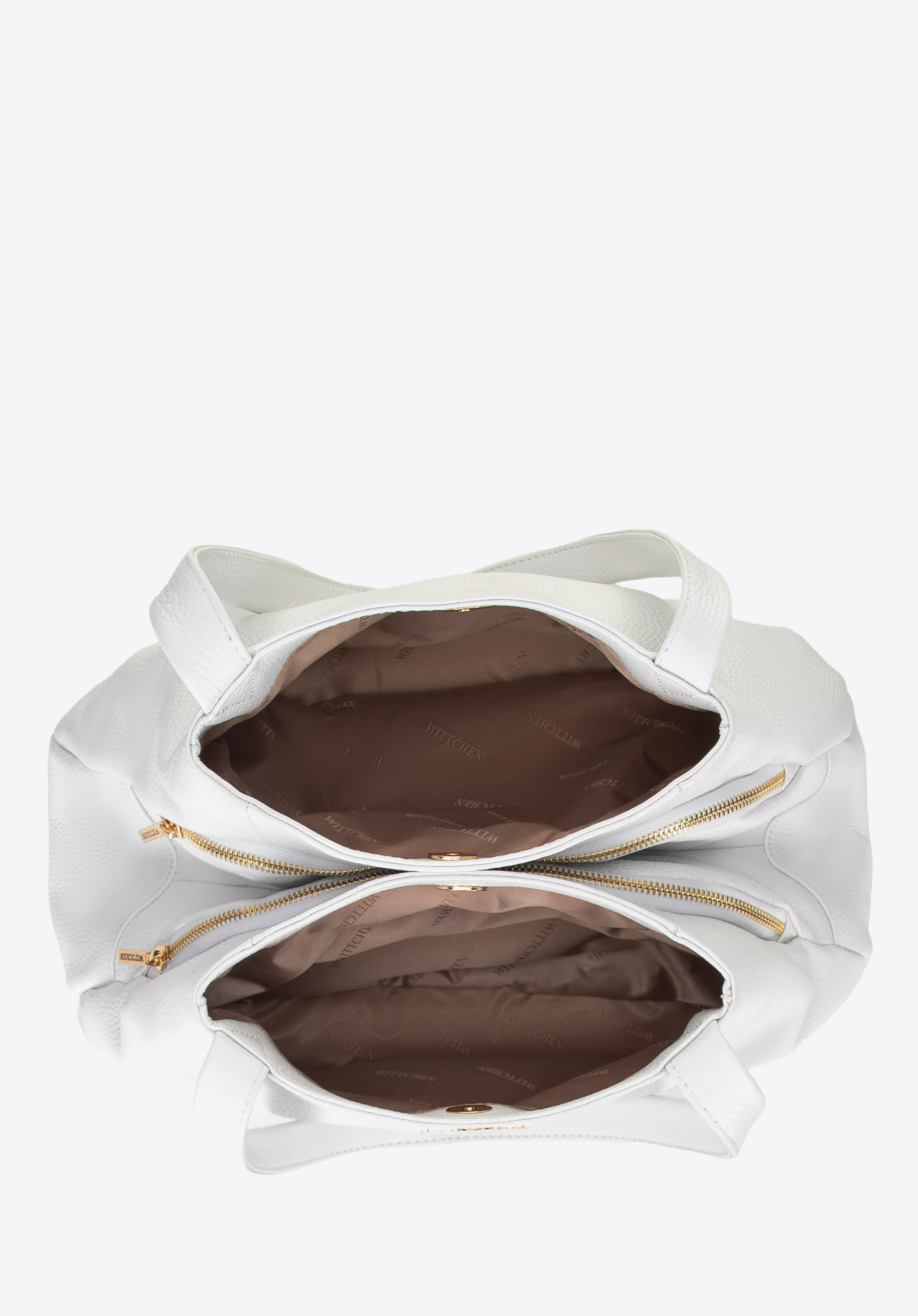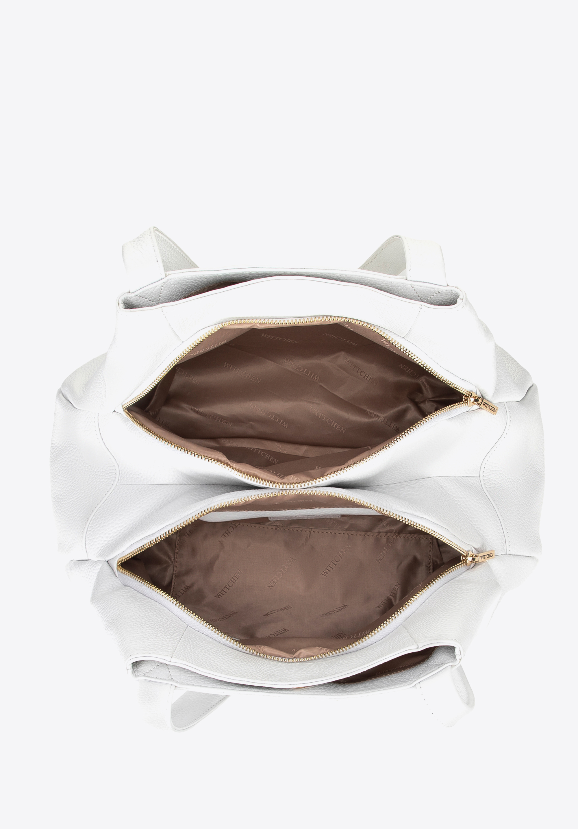 Naša nákupná taška spája eleganciu s každodennou praktickosťou. Vyrobené z prírodnej kamienkovej kože sa môže pochváliť rafinovanou textúrou a odolnosťou. Magnetická spona a zapínanie na zips udrží vaše veci v bezpečí. Nákupná taška je vybavená dvomi uchami pre pohodlné nosenie v ruke alebo cez rameno. Vo vnútri nájdete dve hlavné priehradky . Jedna z nich má vrecko na zips a menšie priehradky , ktoré vám pomôžu zostať zorganizované.