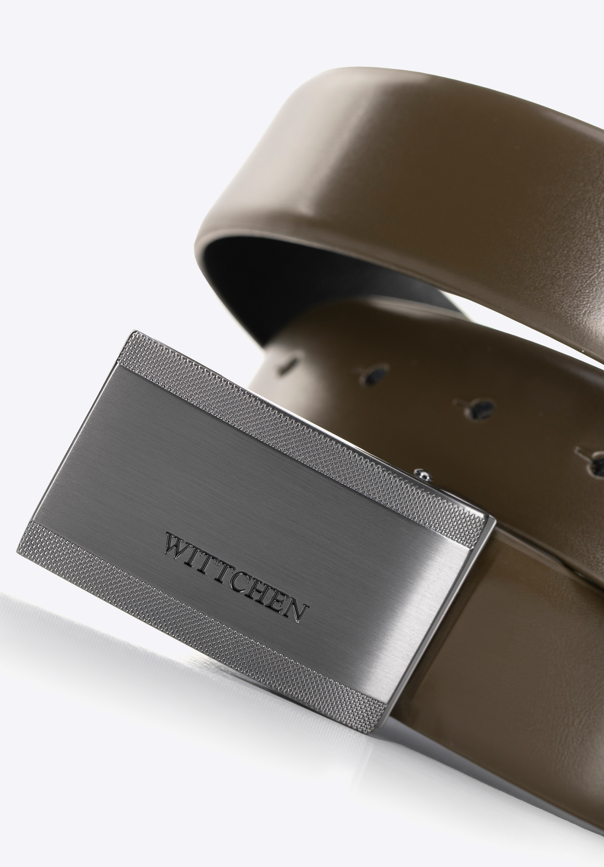 Moderná elegancia – pánsky kožený opasok s platničkovou prackou a logom značky