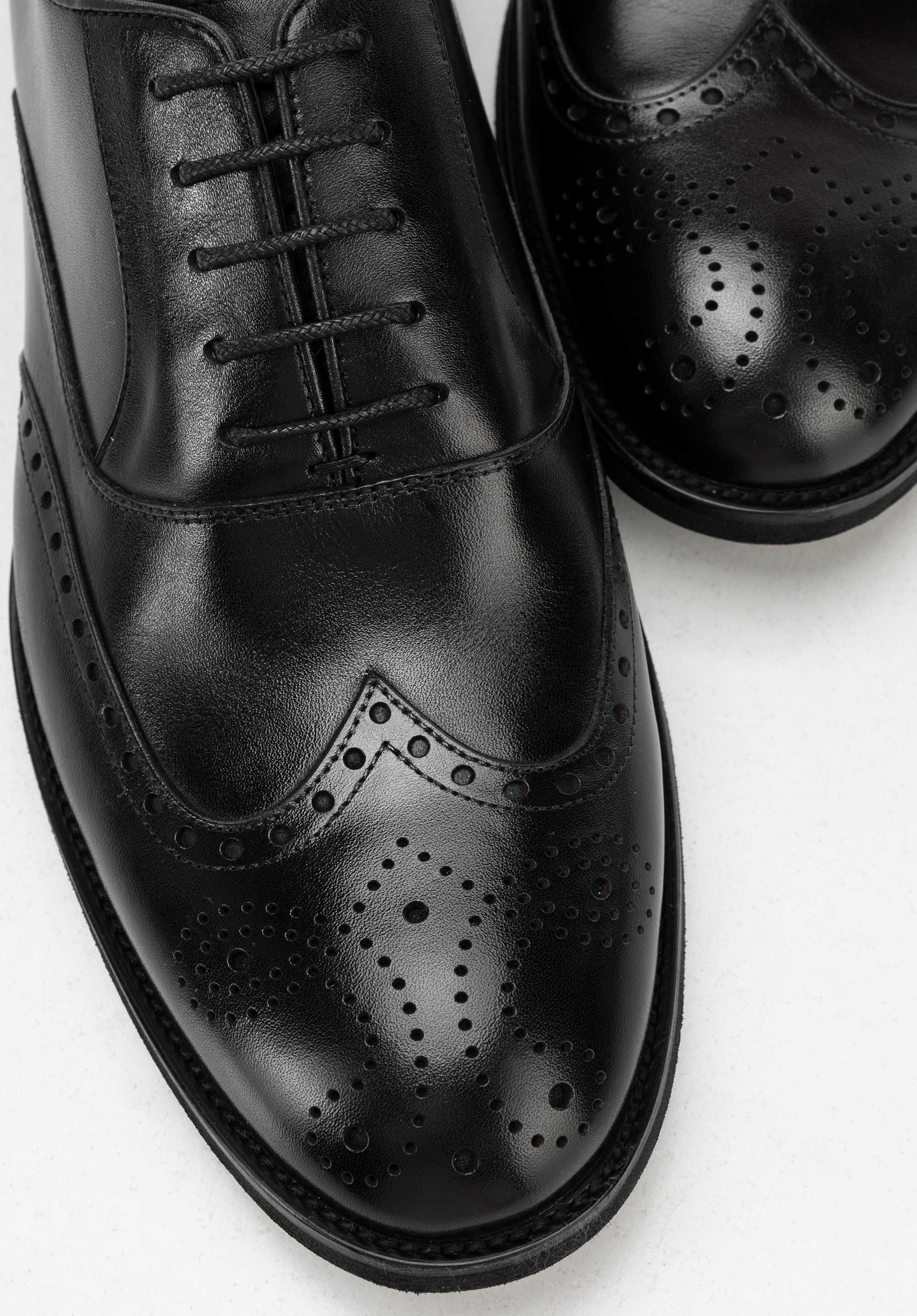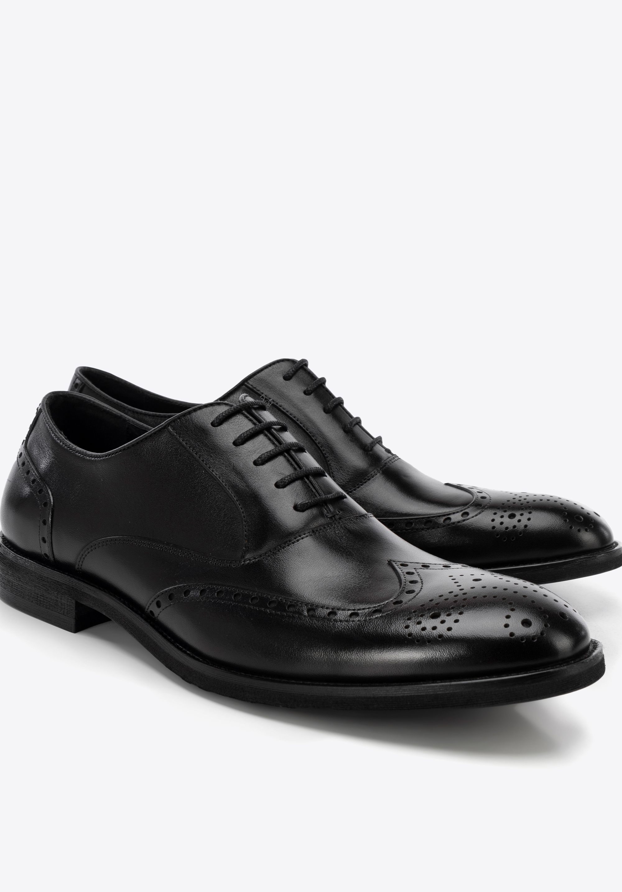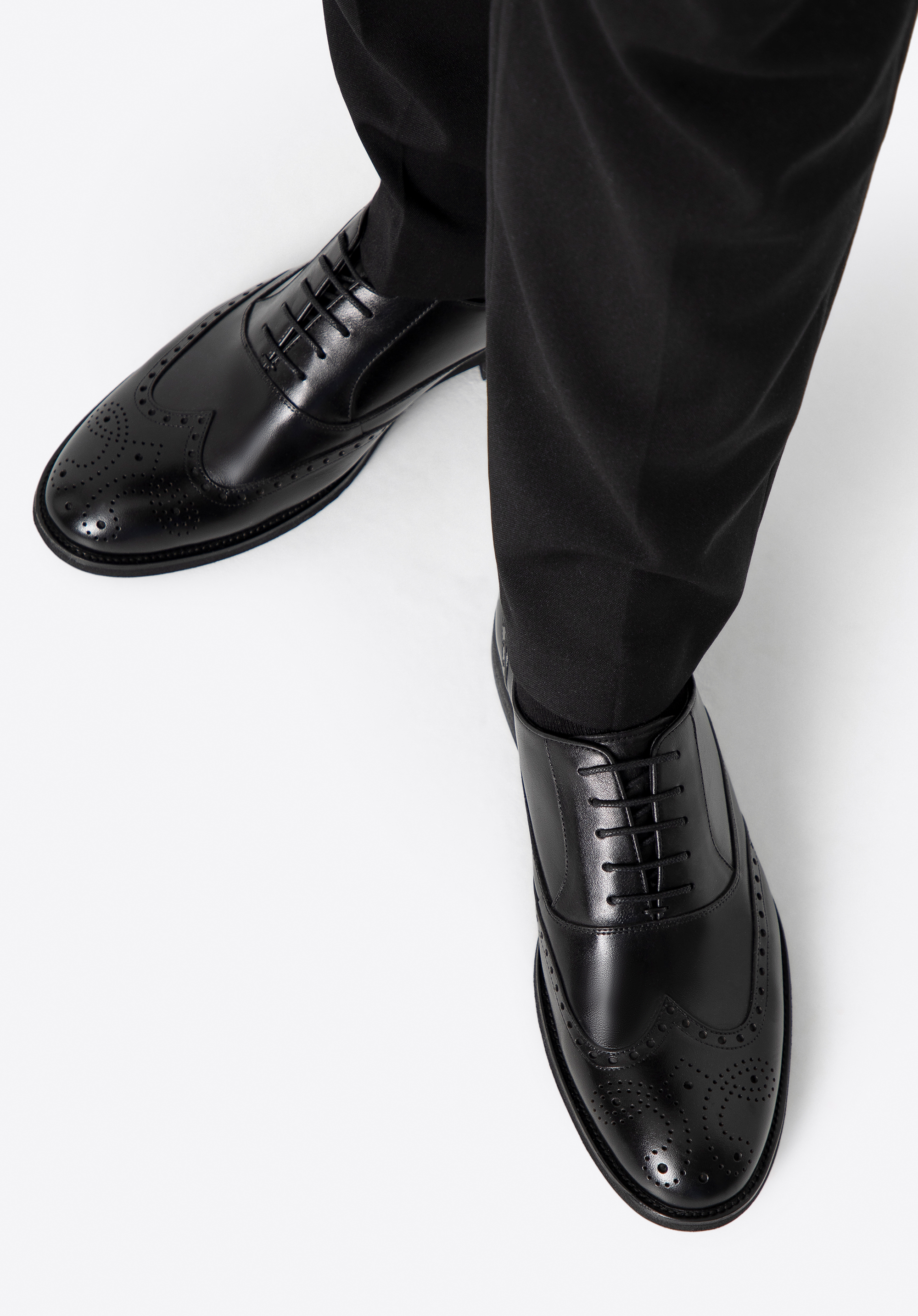 Objavte nadčasový štýl a precíznosť remeselného spracovania v luxusných pánskych topánkach. Tieto pánske topánky vyrobené z najkvalitnejšej hovädzej kože zaujmú svojim sofistikovaným vzhľadom, odolnosťou a zmyslom pre detail. Charakteristické uzavreté šnurovanie zaisťuje dokonalé uchytenie, zatiaľ čo bohatá perforácia po celom povrchu dodáva ľahký pocit a rafinovaný charakter. Krídlová špička v mandľovom tvare dodáva topánkam štíhly, elegantný tvar a zvýrazňuje ich exkluzívny vzhľad.