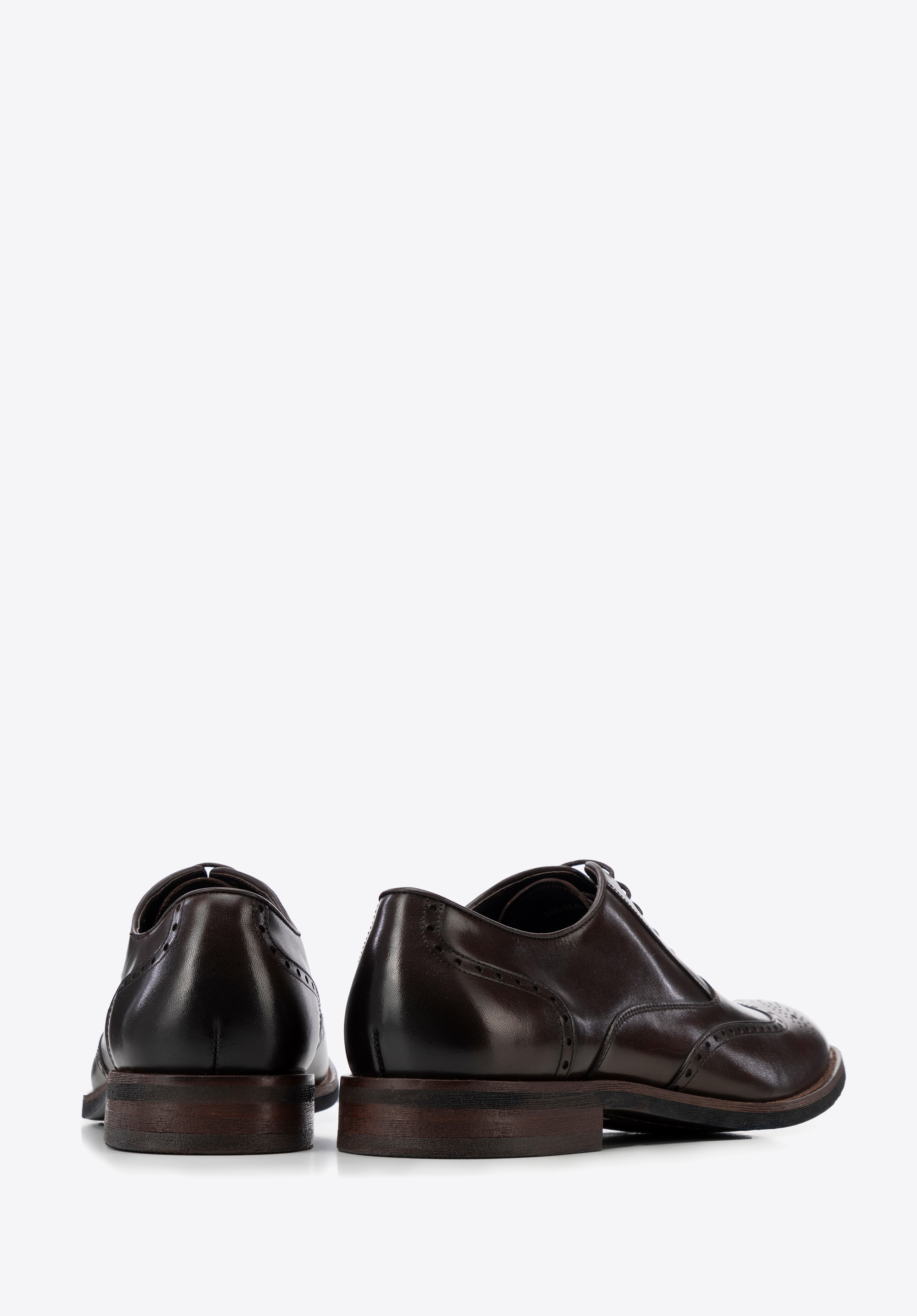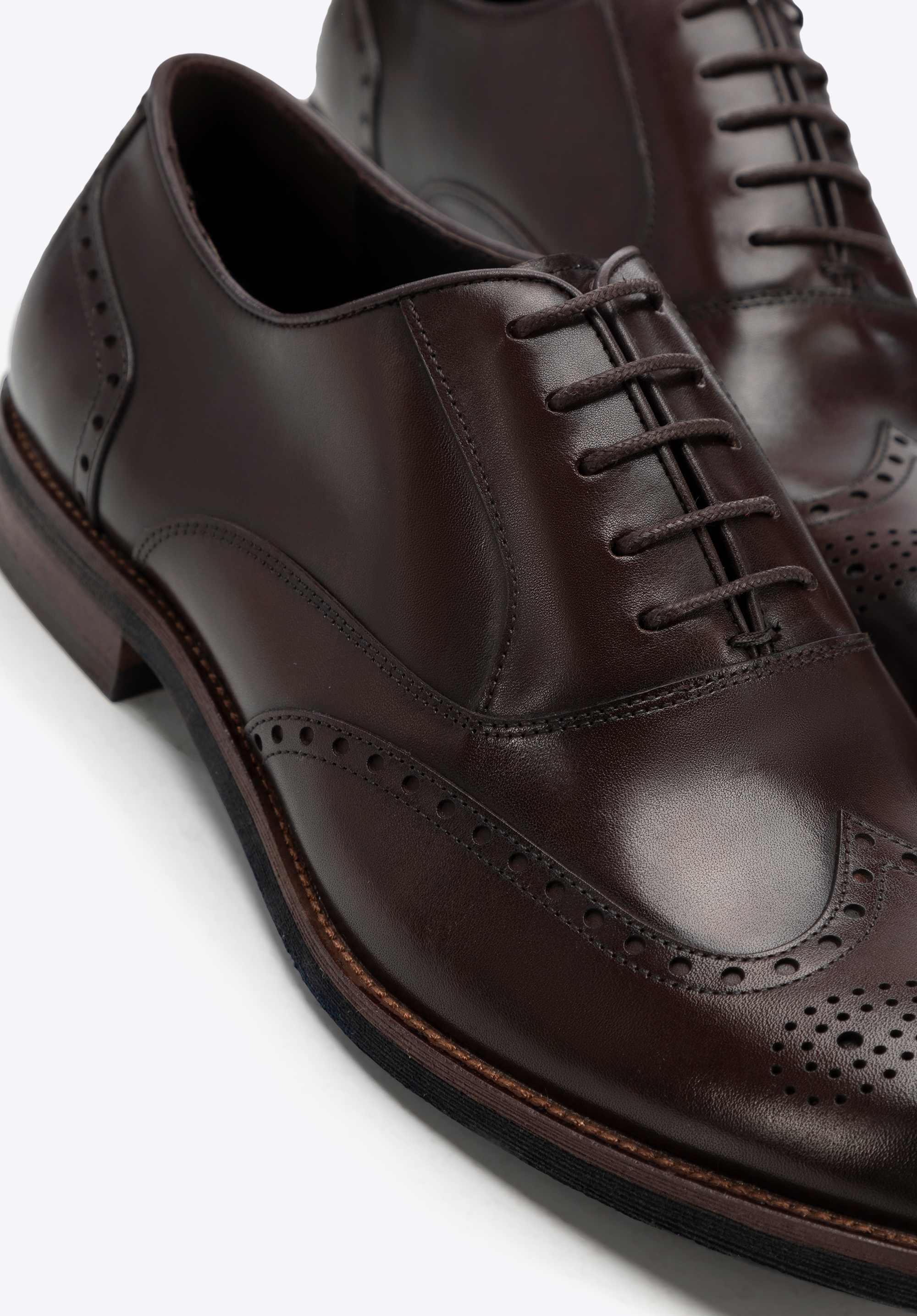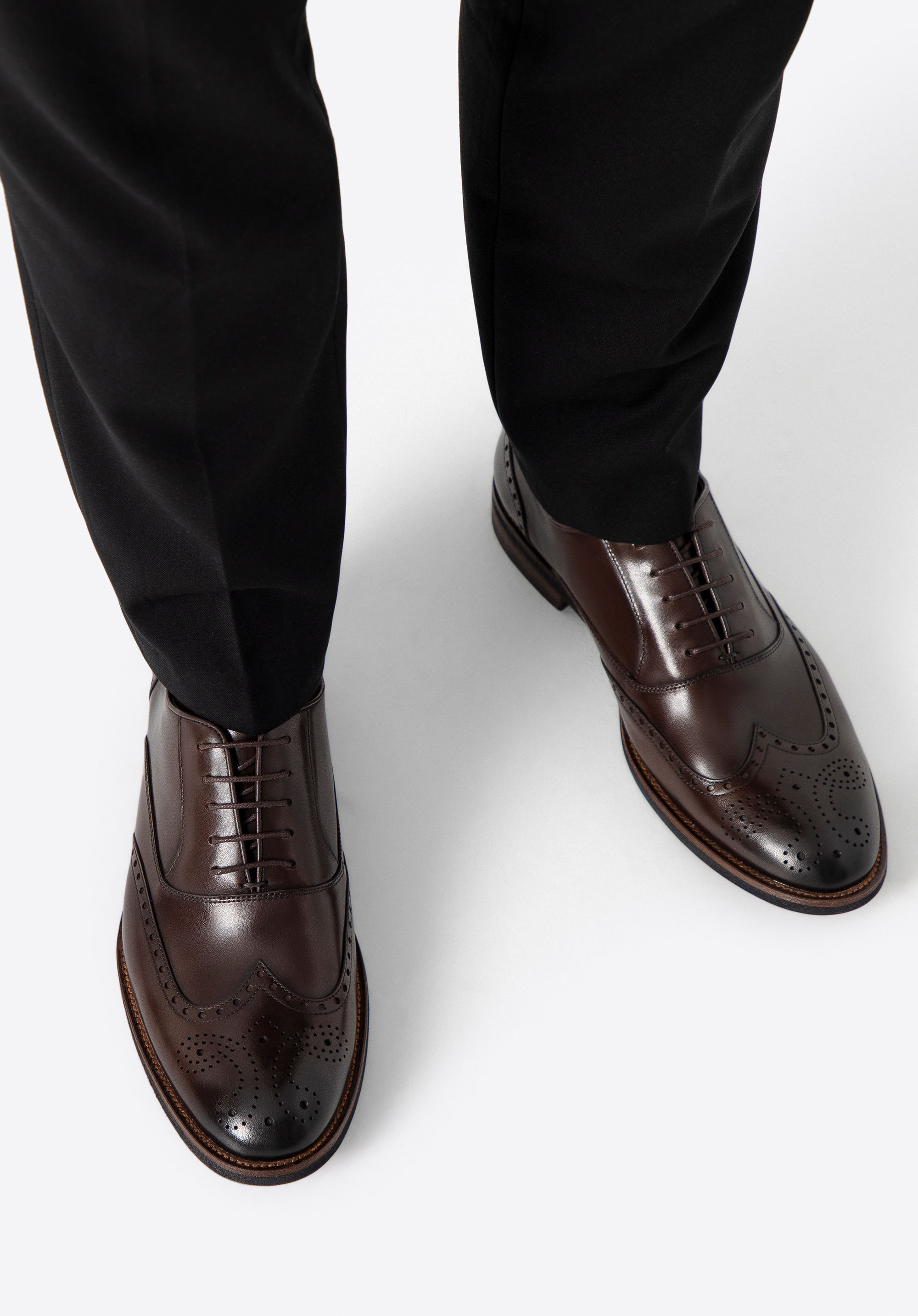Objavte nadčasový štýl a precíznosť remeselného spracovania v luxusných pánskych topánkach. Tieto pánske topánky vyrobené z najkvalitnejšej hovädzej kože zaujmú svojim sofistikovaným vzhľadom, odolnosťou a zmyslom pre detail. Charakteristické uzavreté šnurovanie zaisťuje dokonalé uchytenie, zatiaľ čo bohatá perforácia po celom povrchu dodáva ľahký pocit a rafinovaný charakter. Krídlová špička v mandľovom tvare dodáva topánkam štíhly, elegantný tvar a zvýrazňuje ich exkluzívny vzhľad.