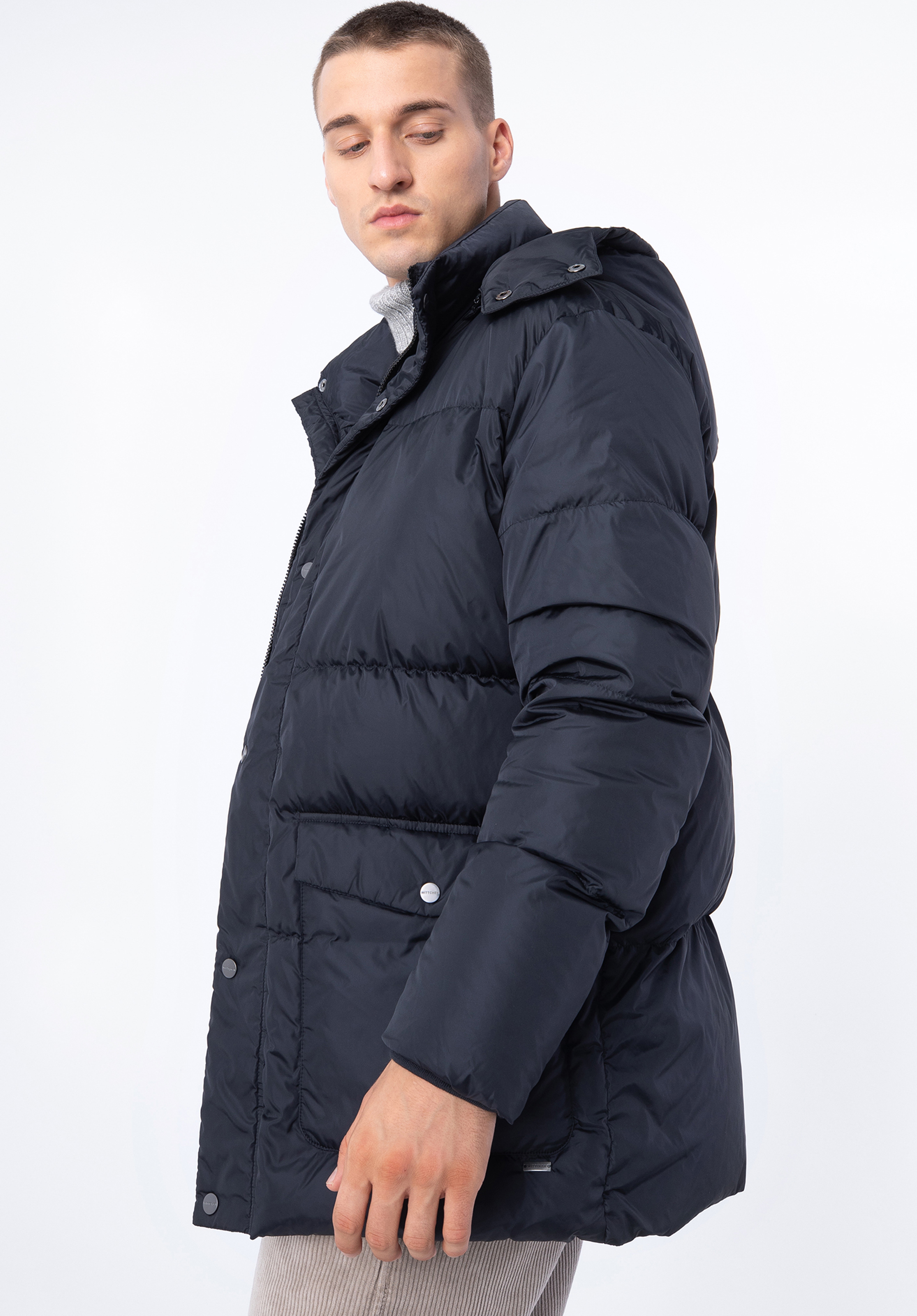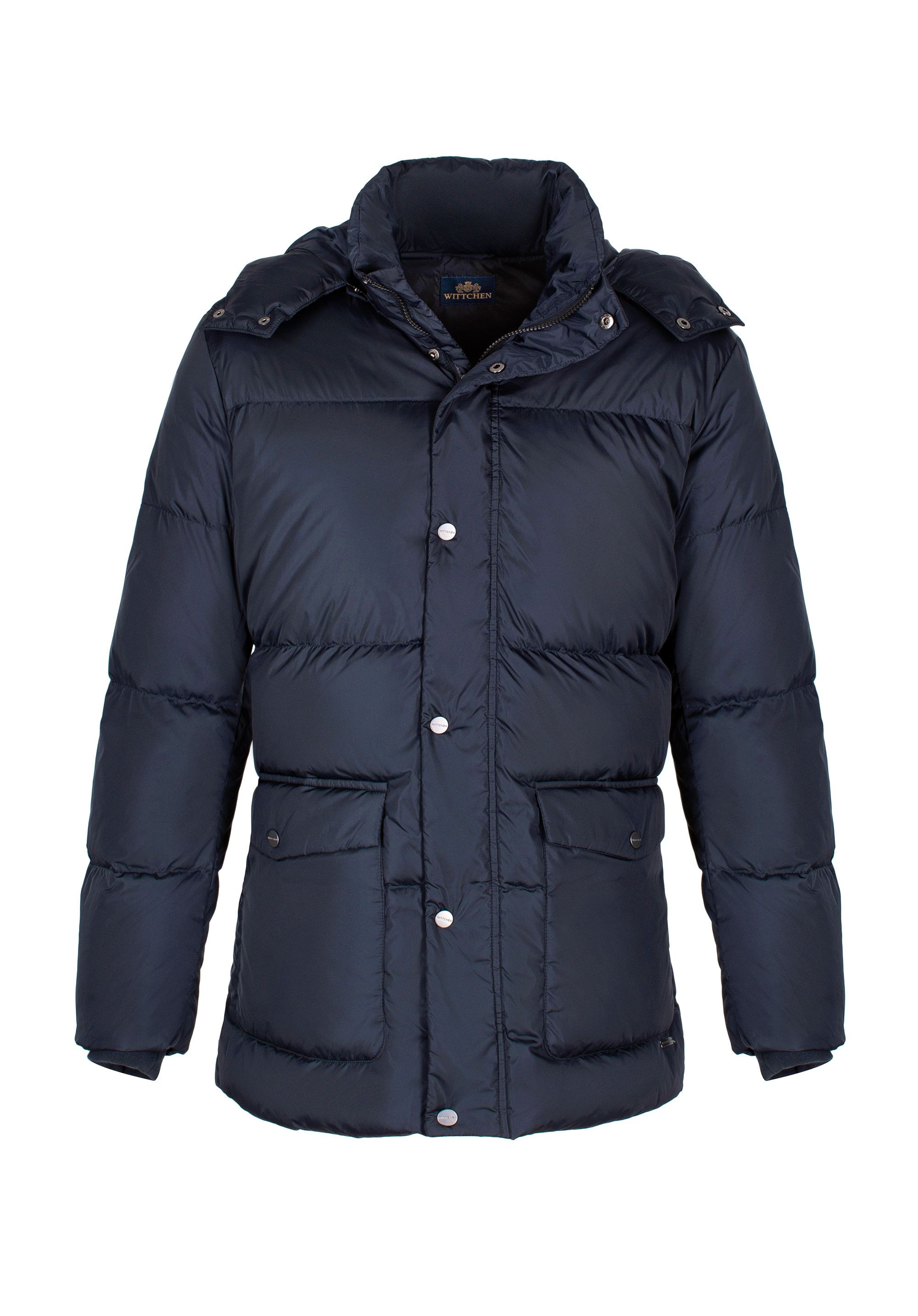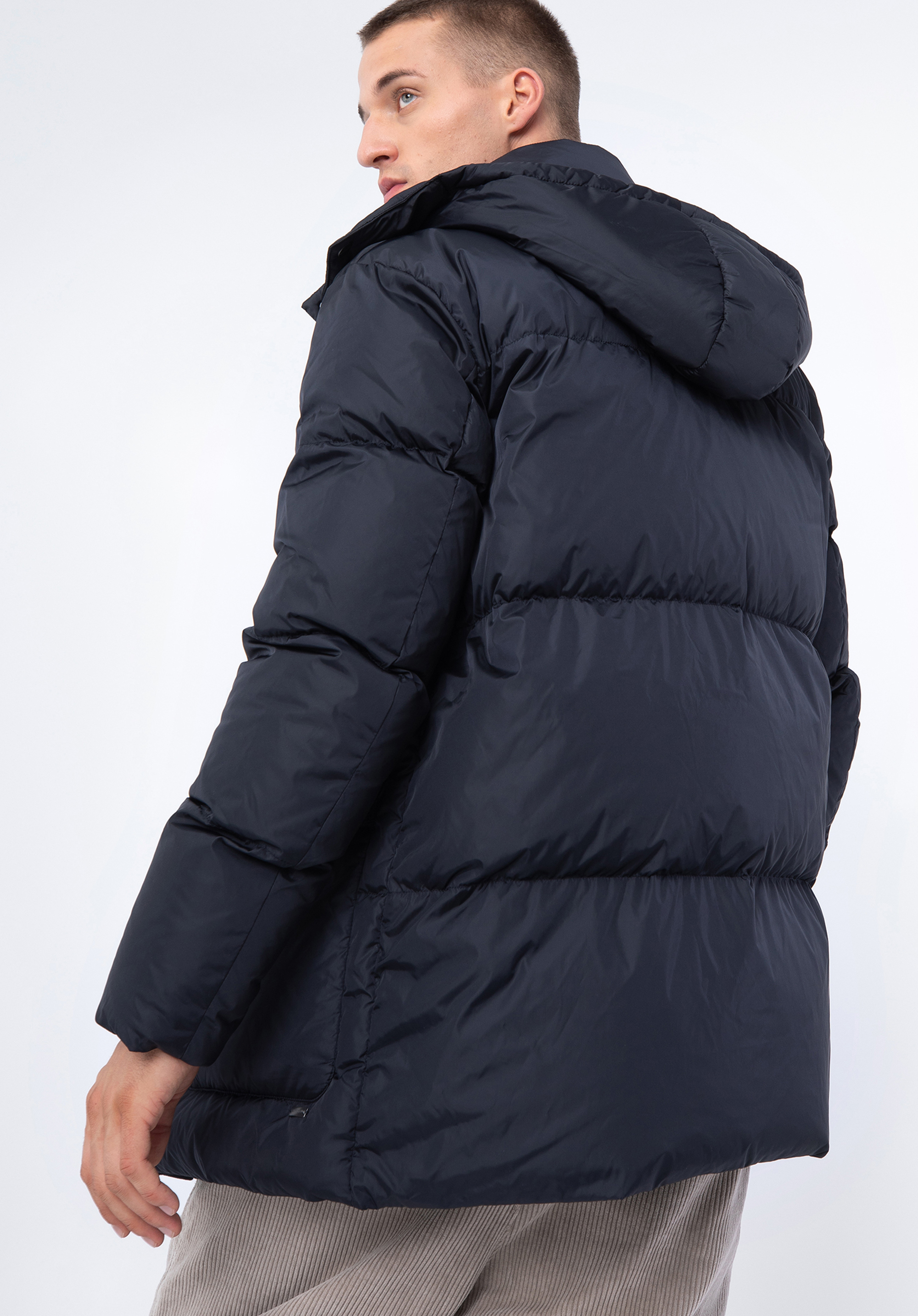 Pánska prešívaná páperová bunda s kapucňou tmavomodrá