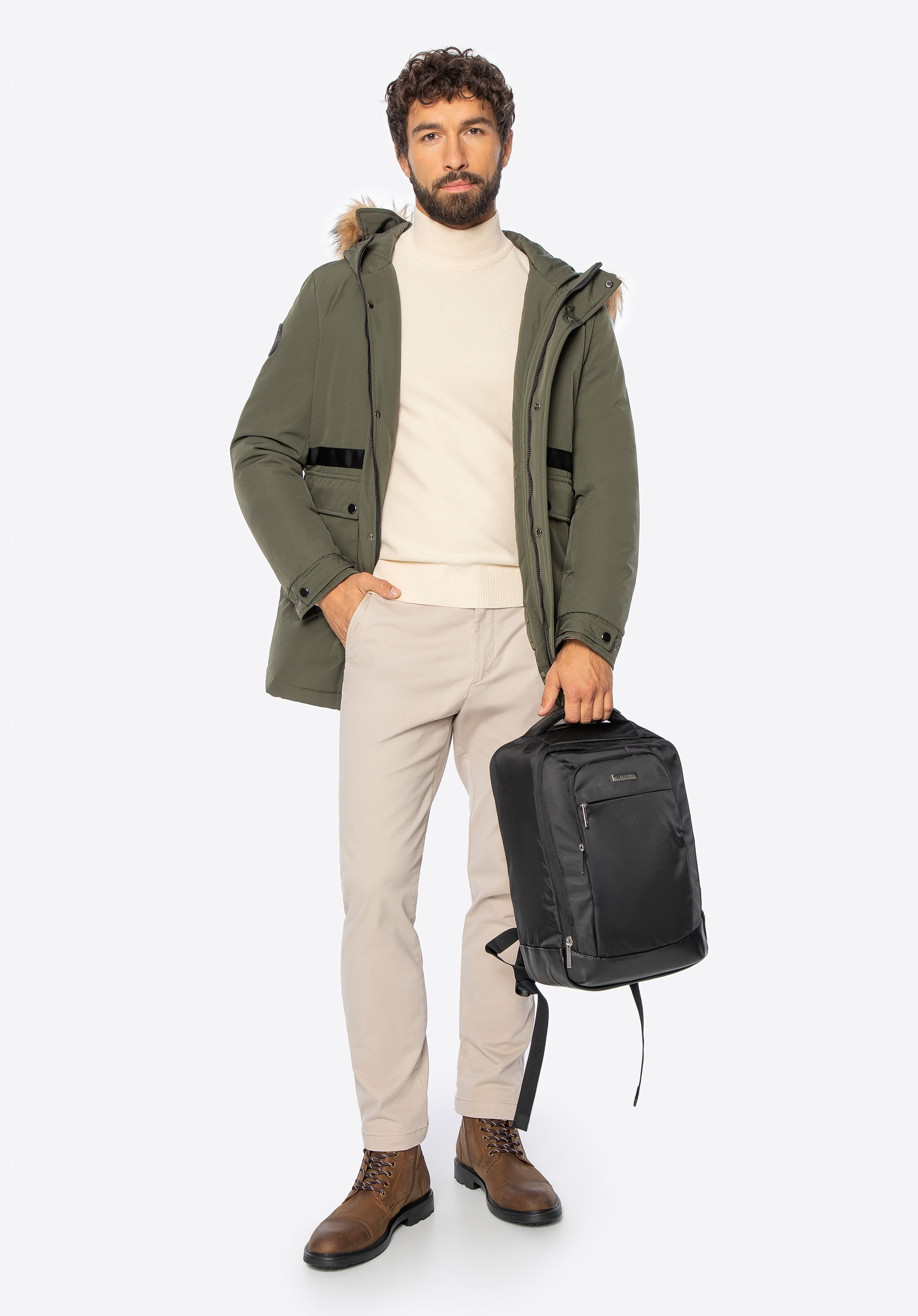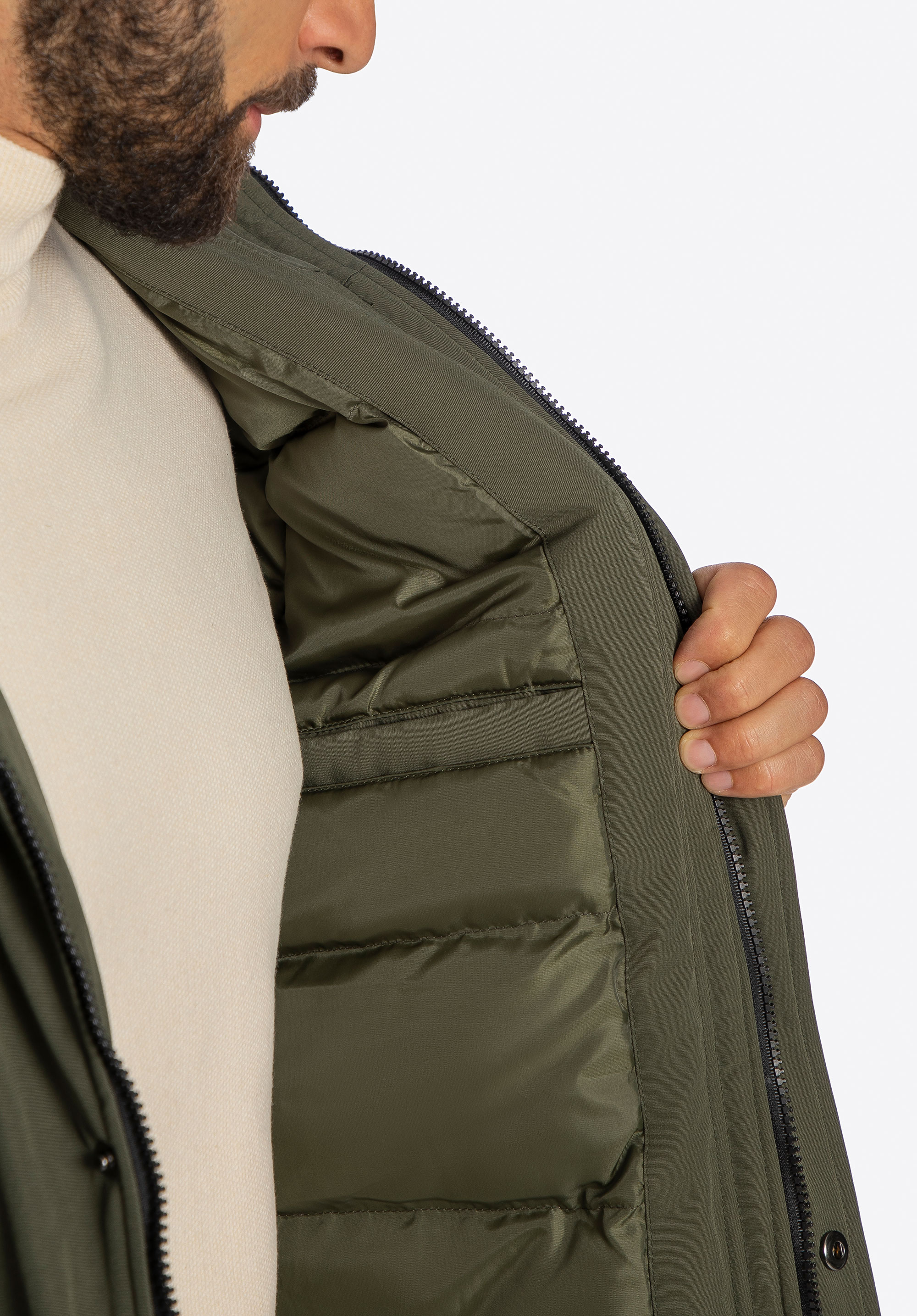 dve dvojité vrecká: ruky môžete ľahko zasunúť do bočných vreciek a chrániť ich pred chladom a vo vreckách s patentným zapínaním môžete bezpečne skryť vaše praktické drobnosti. Hladký strih dopĺňajú