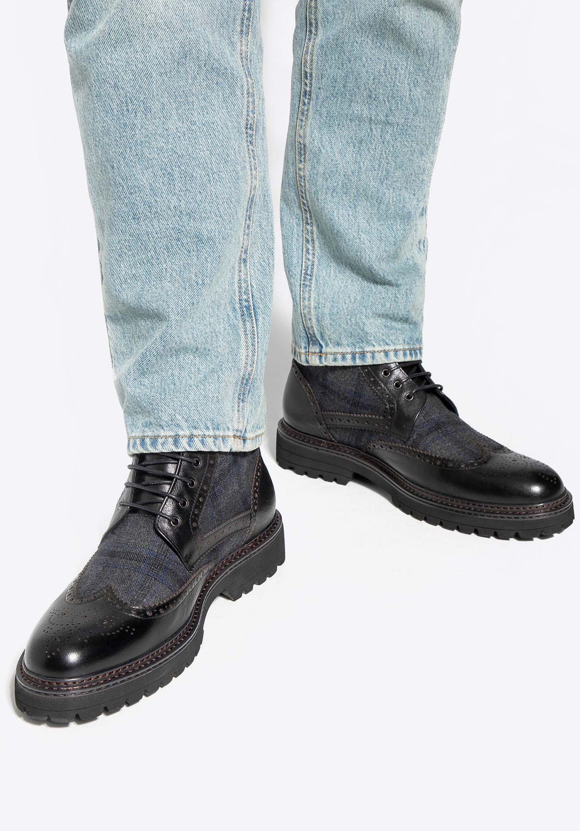 - Zvršok topánky je vyrobený z kombinácie prírodnej kože a odolného textilného materiálu, ktorý zaručuje trvanlivosť a štýlový vzhľad.