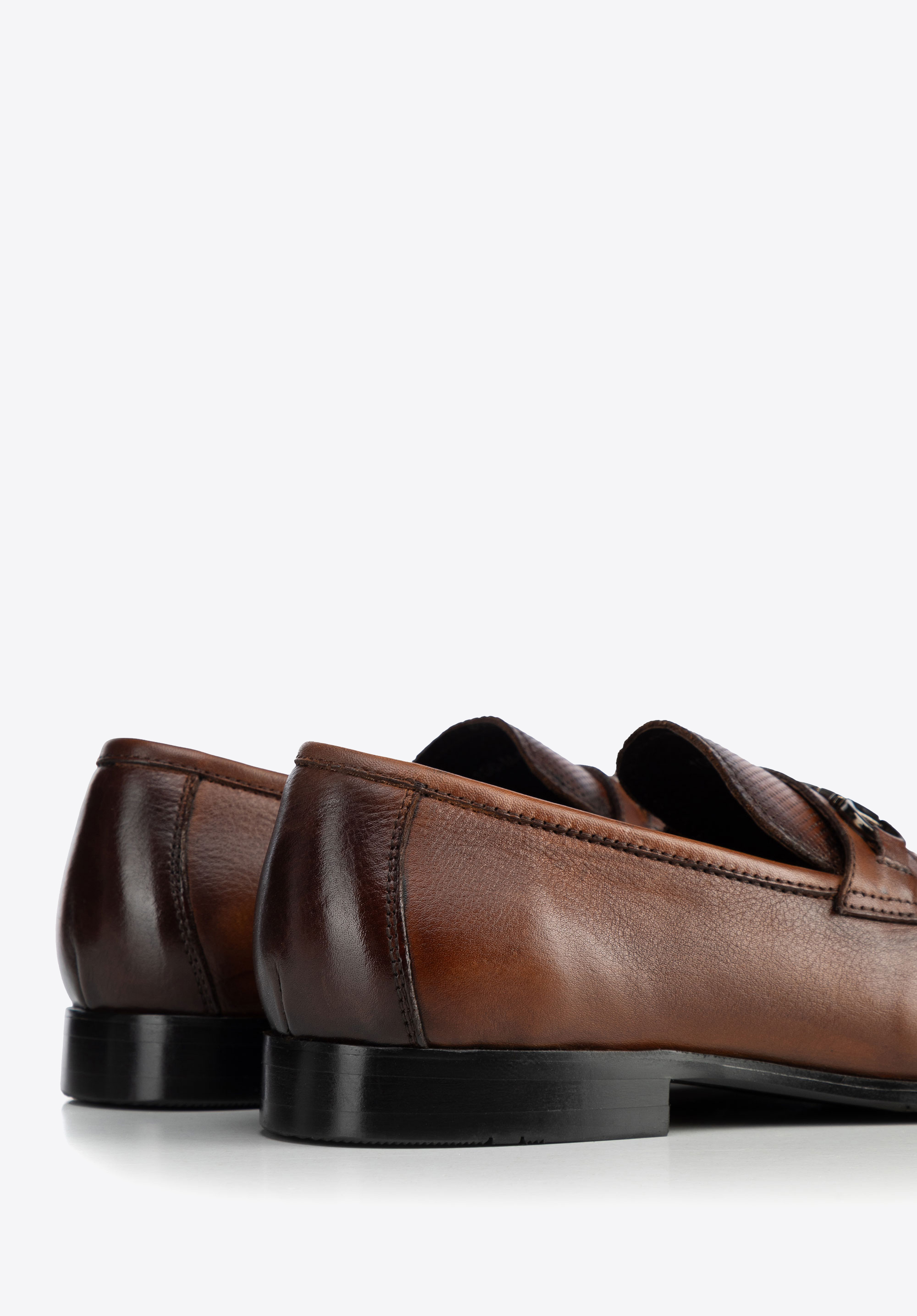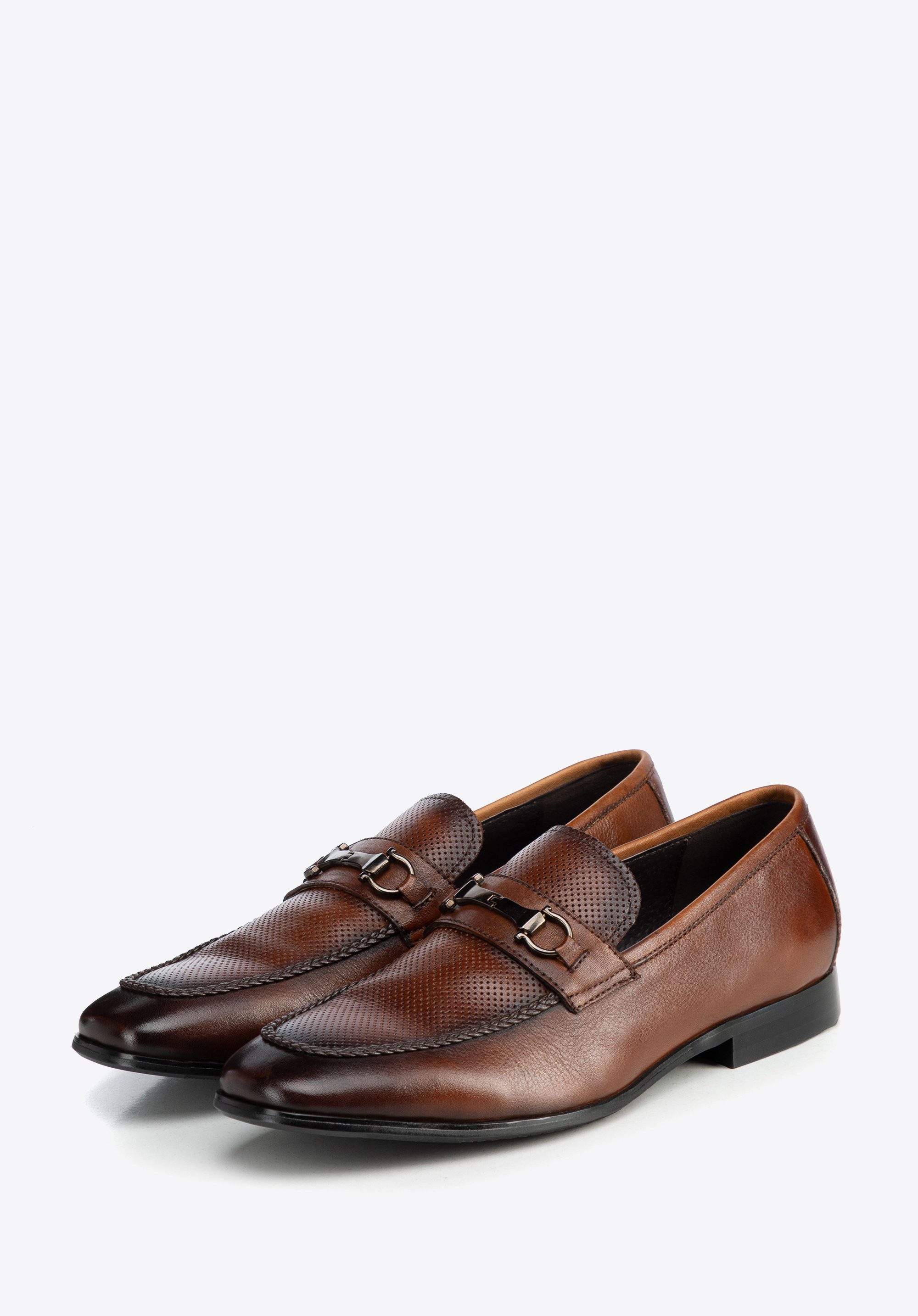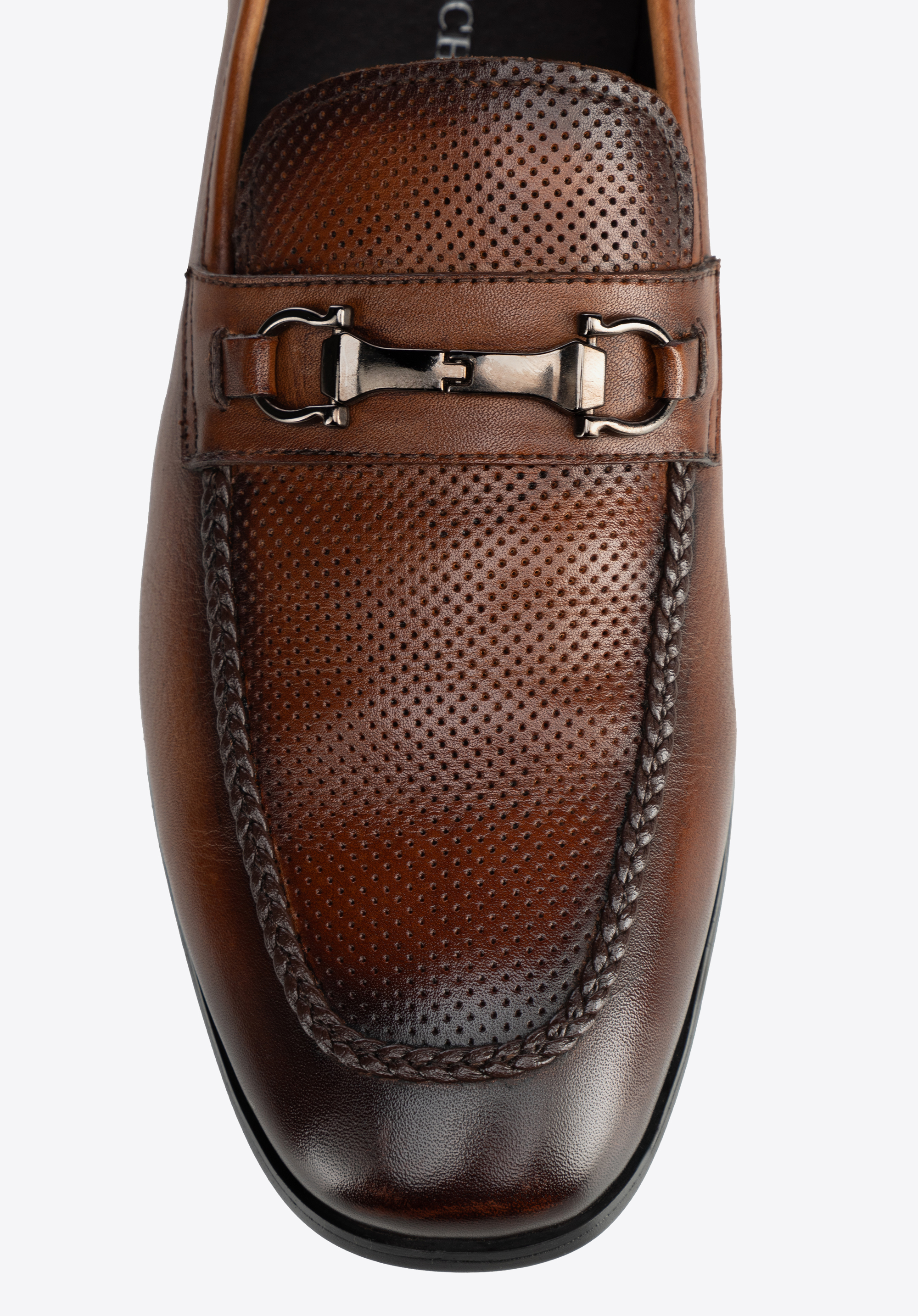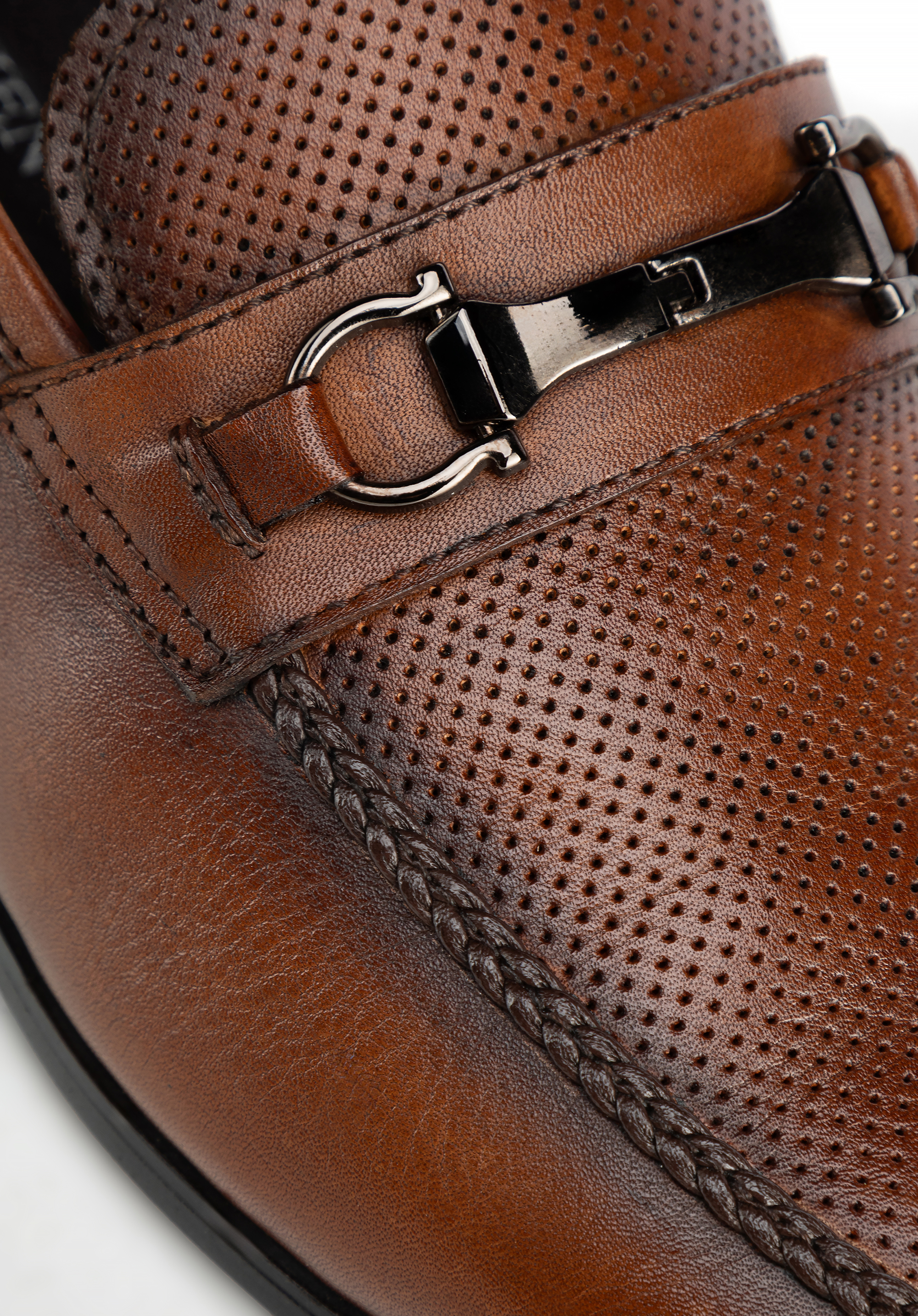 Nadčasové a elegantné – tieto mokasíny vyrobené z prírodnej kože kombinujú klasický štýl s prepracovanými detailmi. Vďaka ozdobným perforáciám , tkanému stehu na priehlavku a remienku s kovovou prackou ponúkajú sofistikovaný nádych tradičnej siluety. Ľahko zaoblená štvorcová špička , kožená stielka a odolná gumená podrážka z nich robia pohodlnú voľbu na každodenné nosenie aj na špeciálne príležitosti.