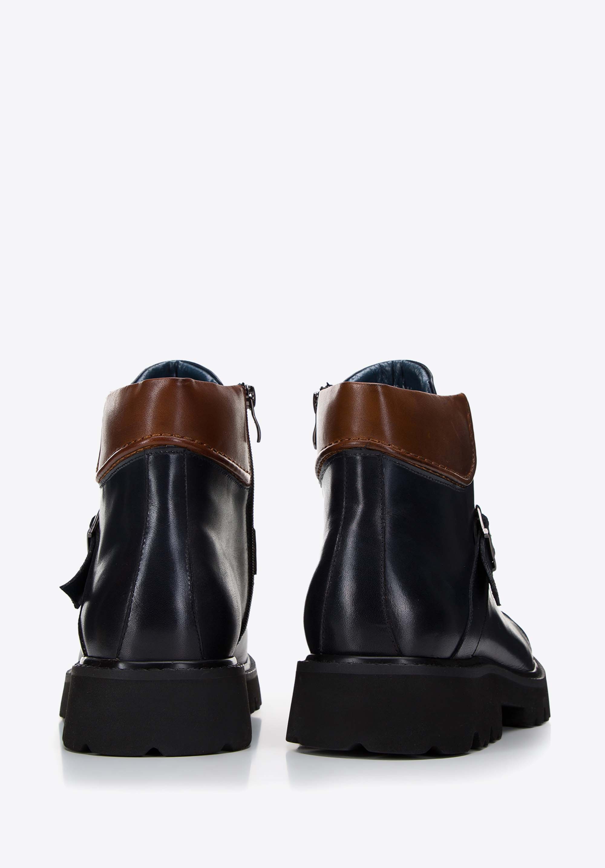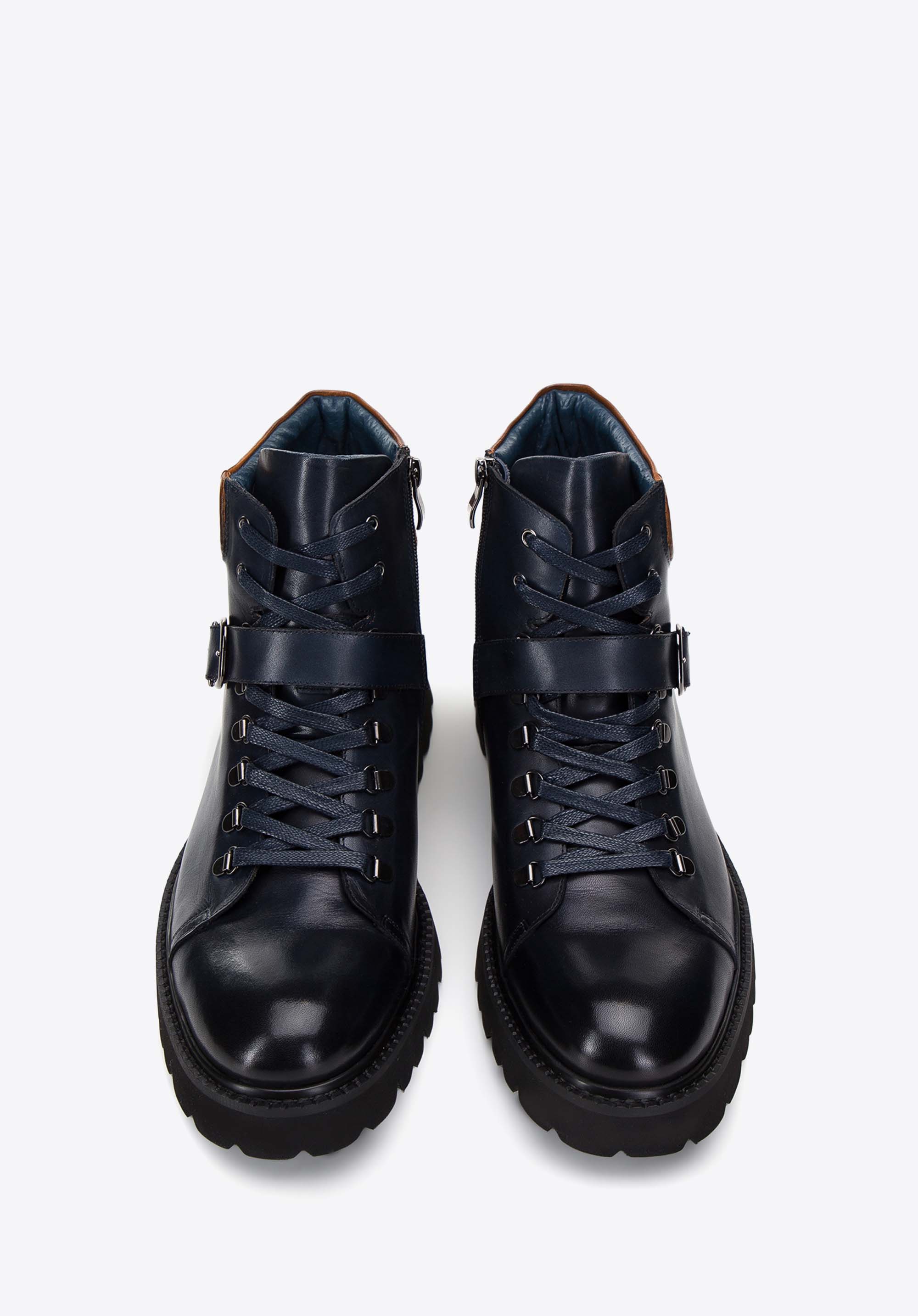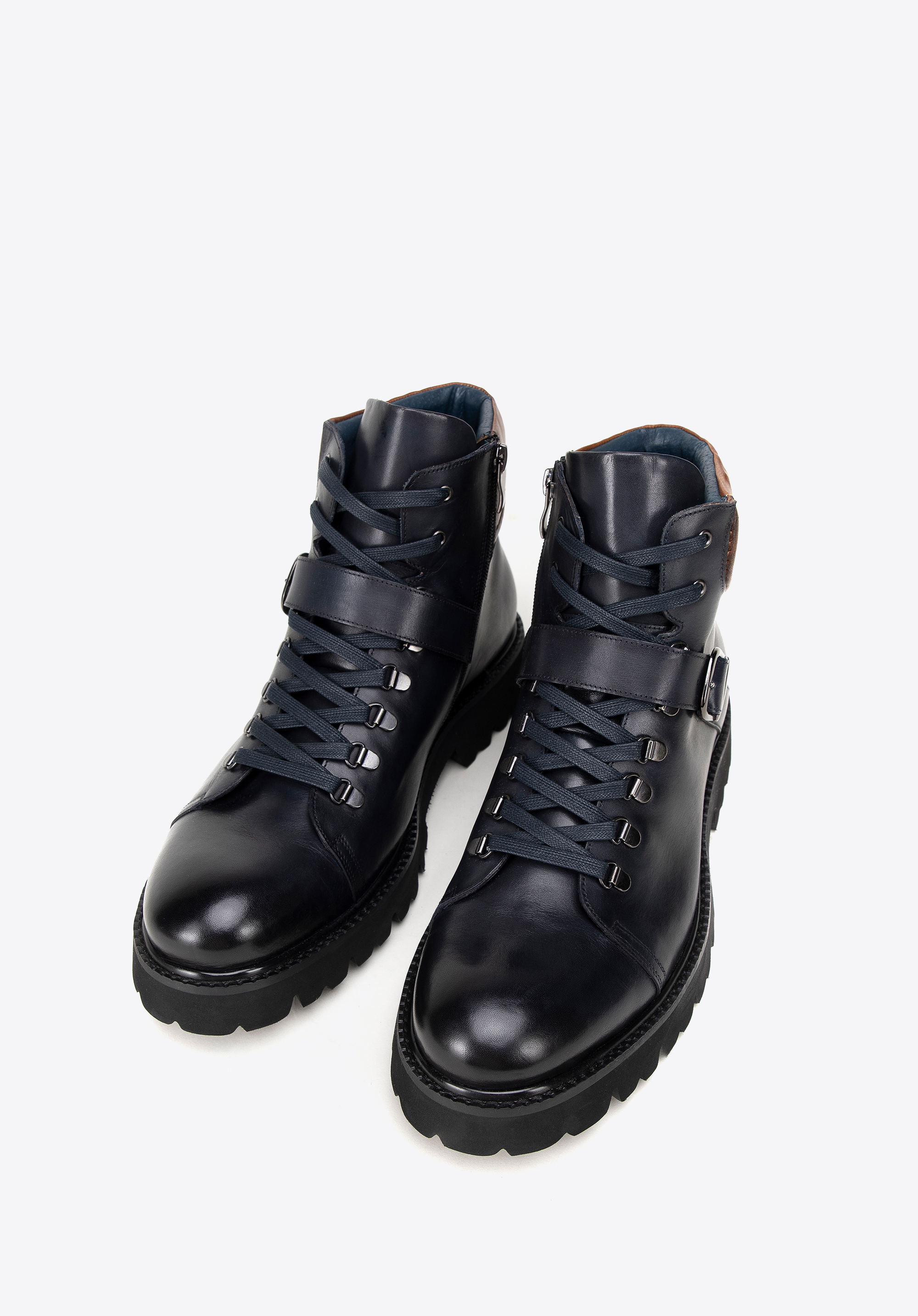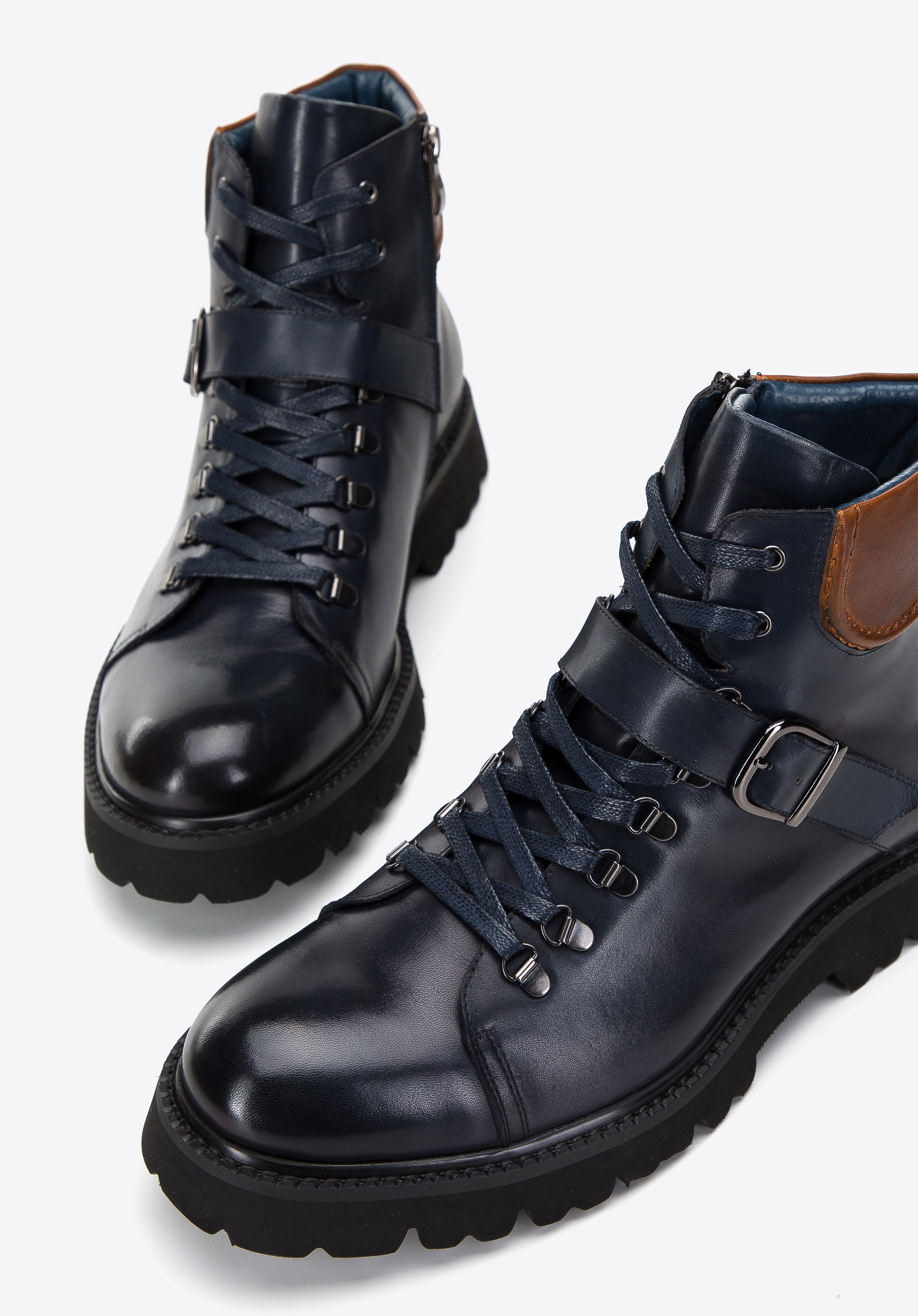 Tieto pánske trapery s prackou sú kombináciou maximálneho pohodlia a moderného štýlu. Ich rustikálny vzhľad ide v ruka v ruke s vysokokvalitným materiálom, ako sú prírodná koža a hrubá podrážka z plastu, ktorá poskytuje stabilitu a izoláciu od studeného povrchu. Každý krok zaručuje nielen spoľahlivosť, ale aj pohodlie vďaka koženej stielke a mäkkému interiéru. Vystužený opätok zaisťuje stabilitu chodidla a klasické šnurovanie podopreté zipsom zaručuje jednoduché nasadenie a vyzutie obuvi.