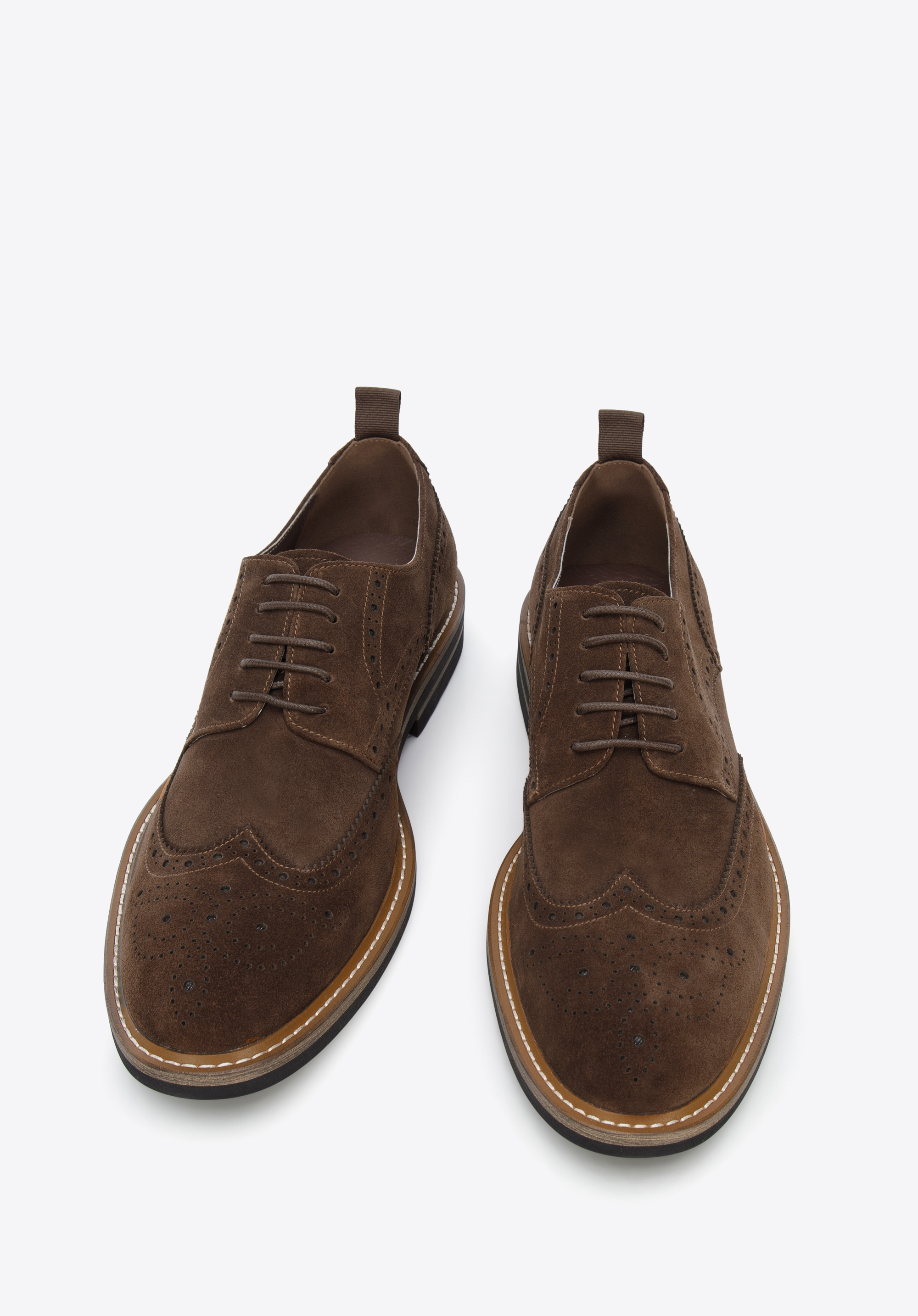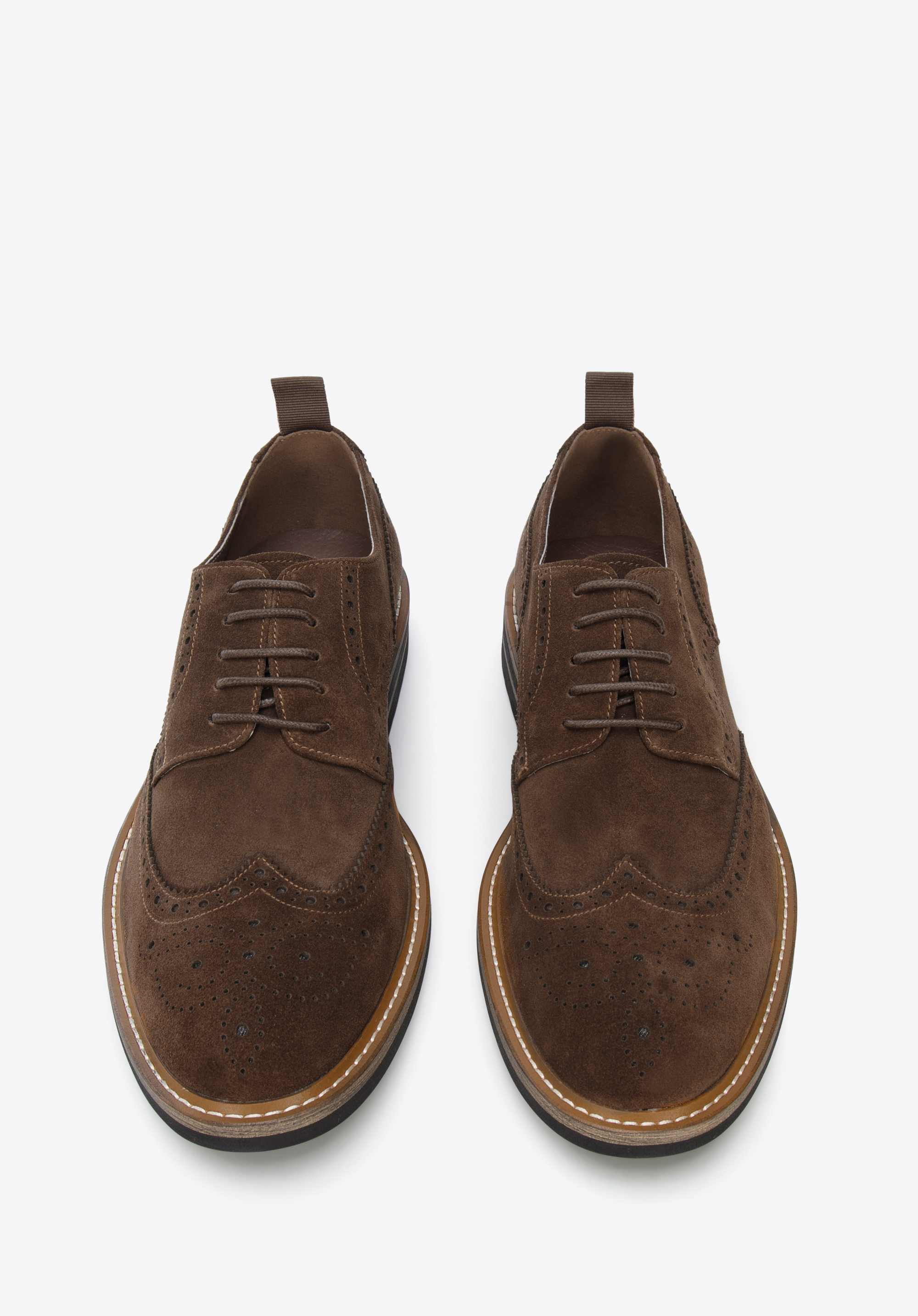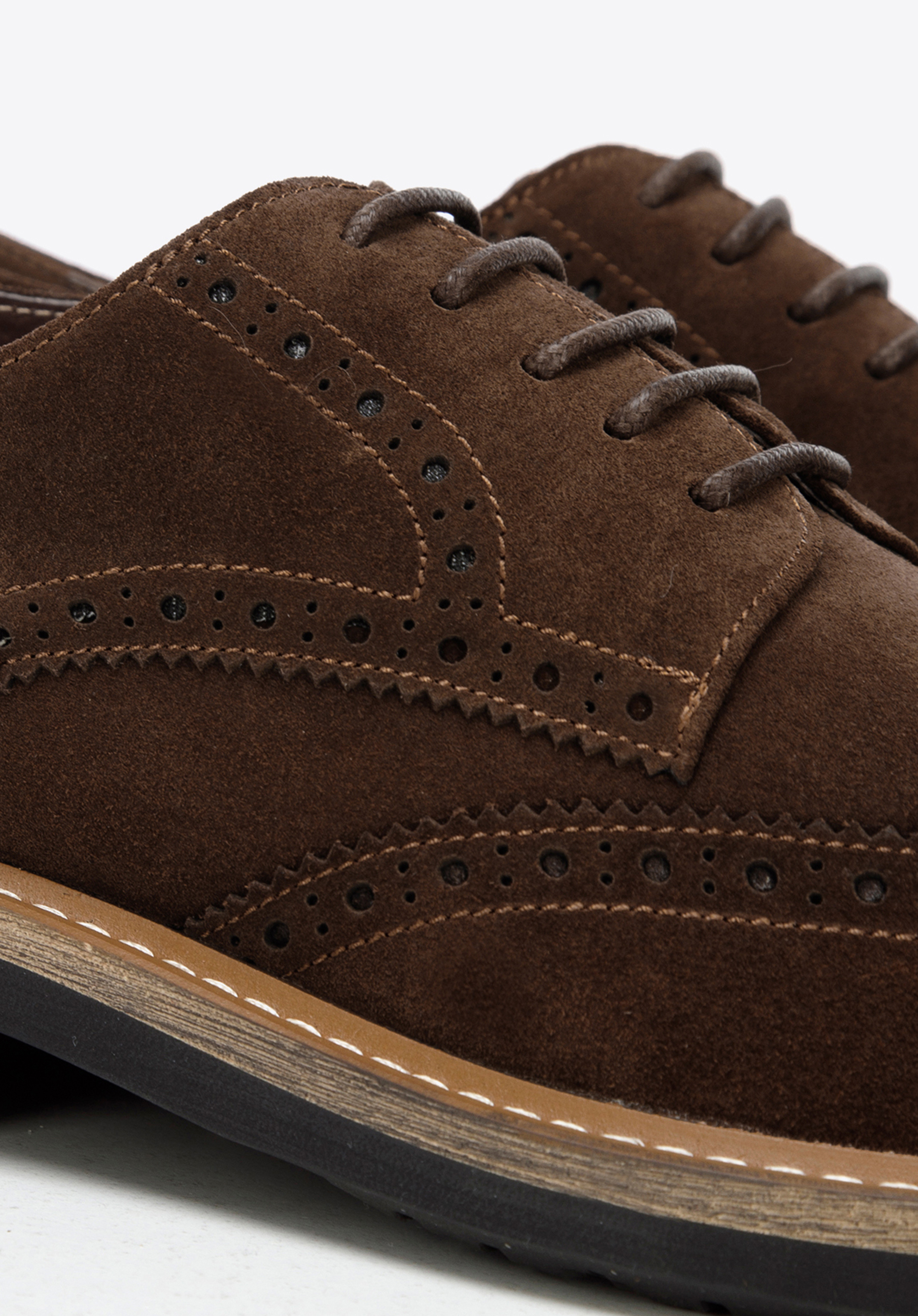 podrážka zdobená kontrastnou niťou a dvojfarebný podpätok. Pánske semišové brogue topánky s kontrastnou niťou sú klasikou v modernom prevedení, ktorú sa oplatí mať vo svojom šatníku.