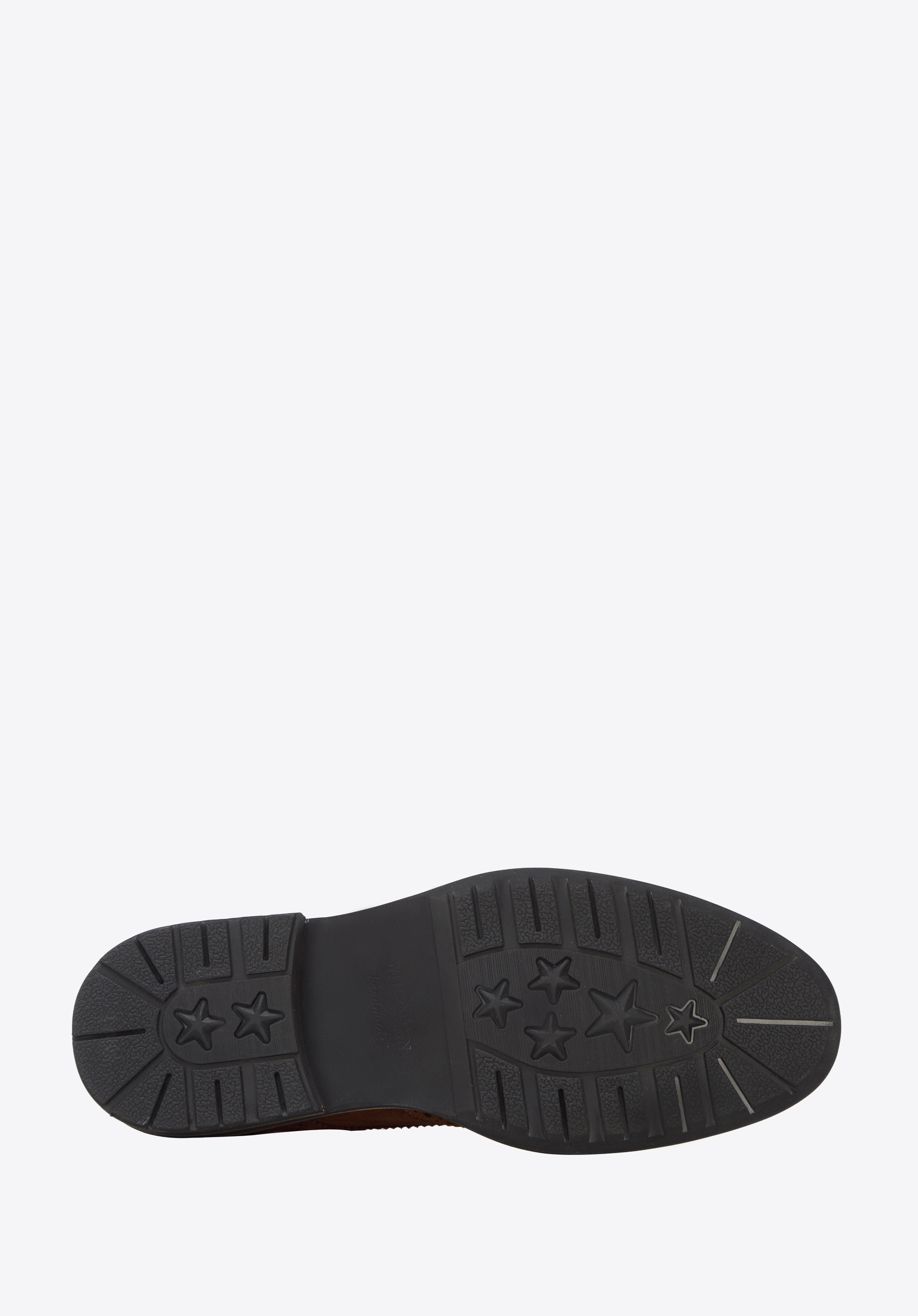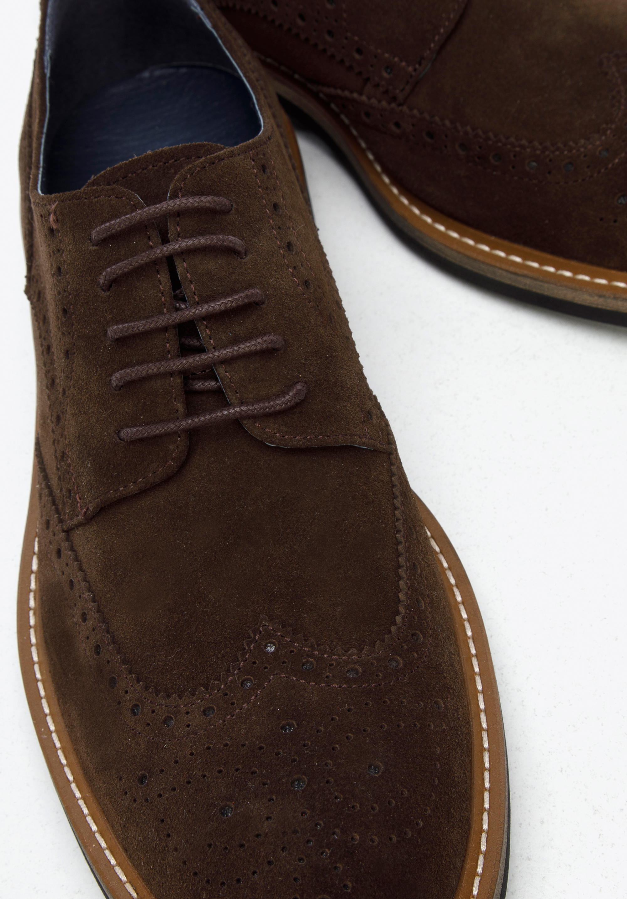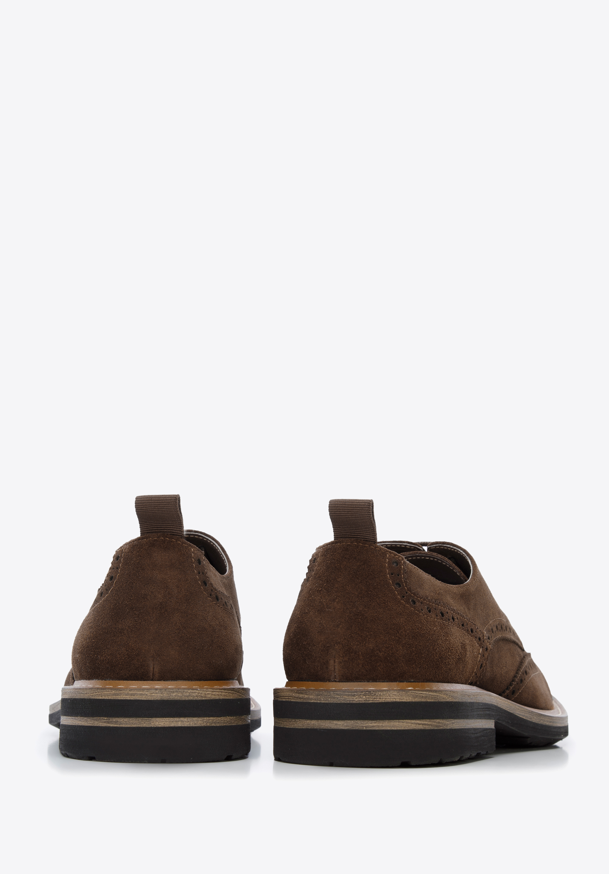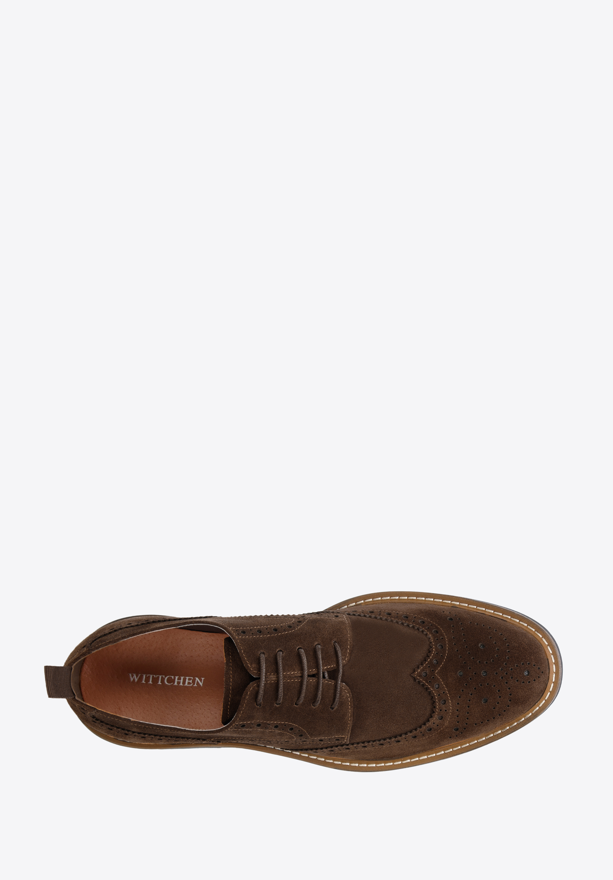 podrážka zdobená kontrastnou niťou a dvojfarebný podpätok. Pánske semišové brogue topánky s kontrastnou niťou sú klasikou v modernom prevedení, ktorú sa oplatí mať vo svojom šatníku.