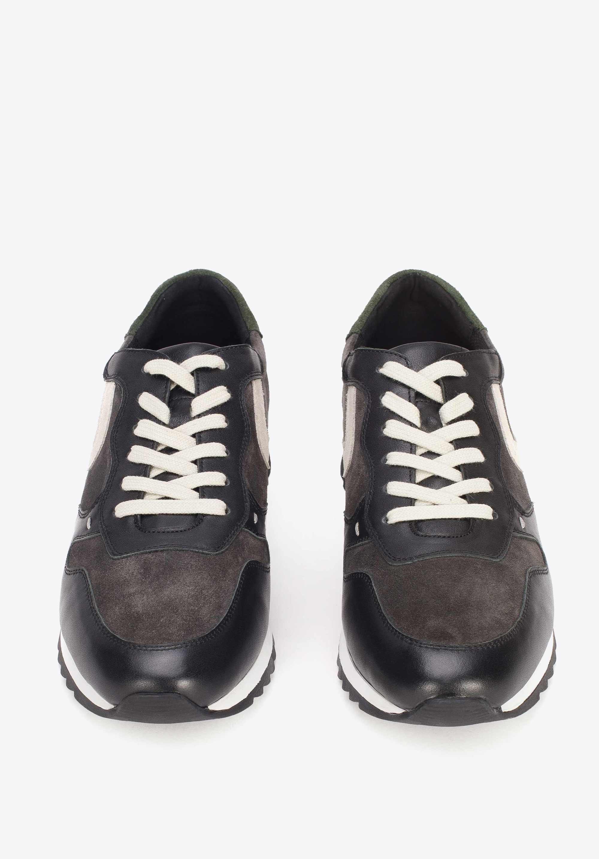 Oplatí sa mať v šatníku aspoň jedny kožené tenisky, ktoré sú vynikajúce na dlhé vzdialenosti zároveň na každý deň, ako aj na víkend. Ležérny charakter topánok doplní ležérne oblečenie. Tenisky sú vyrobené z dvoch druhov prírodnej kože: semišu a lícovej kože, čo zaručuje pohodlie a jedinečný vzhľad. Sú osadené na gumovej podrážke s kontrastnou kombináciou čiernej a bielej farby. Zaujímavým akcentom je tiež vložka v inej farbe na päte. Pánske kožené pestrofarebné tenisky v tmavých tónoch dokonale zapadnú do jesenného obdobia.