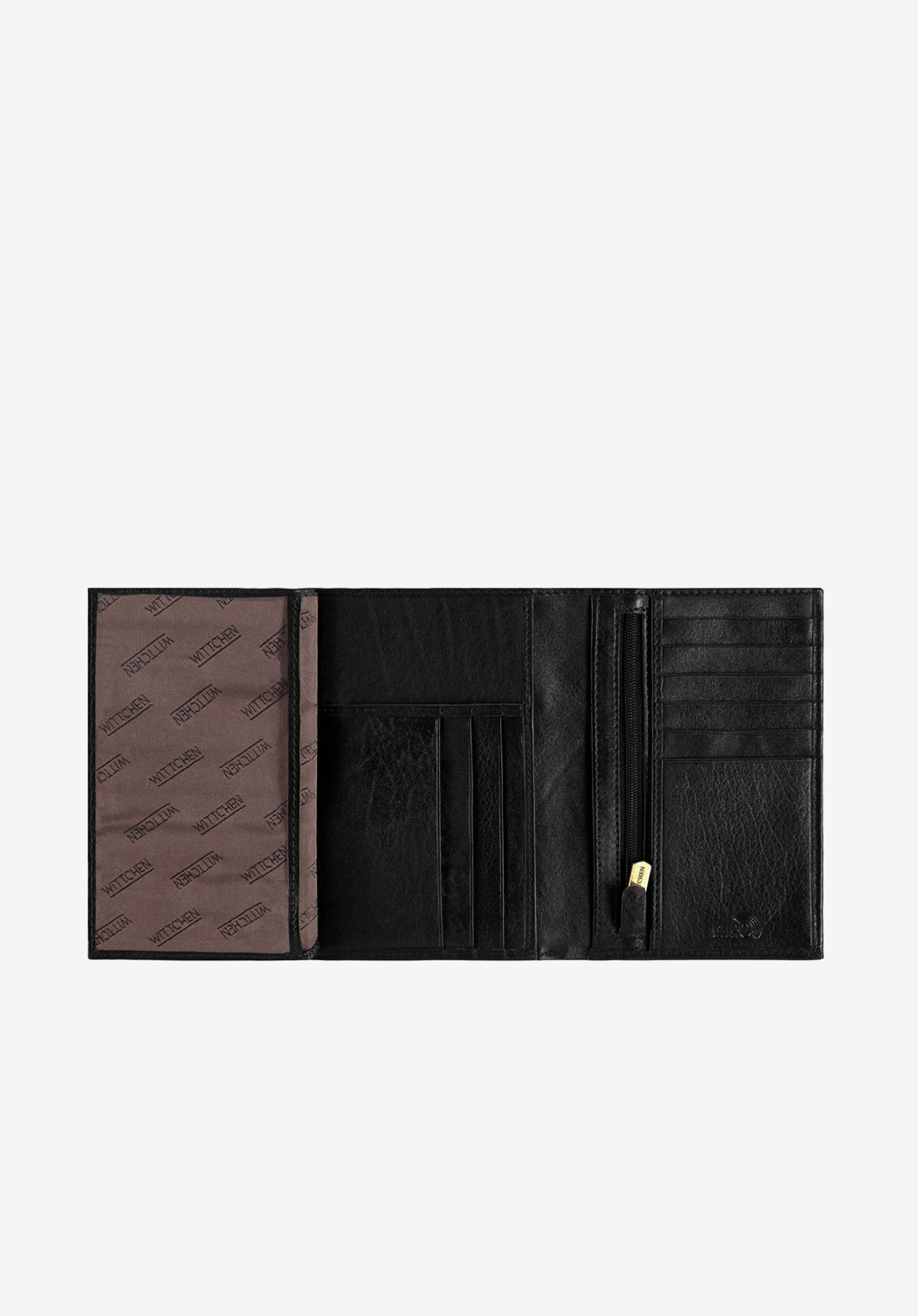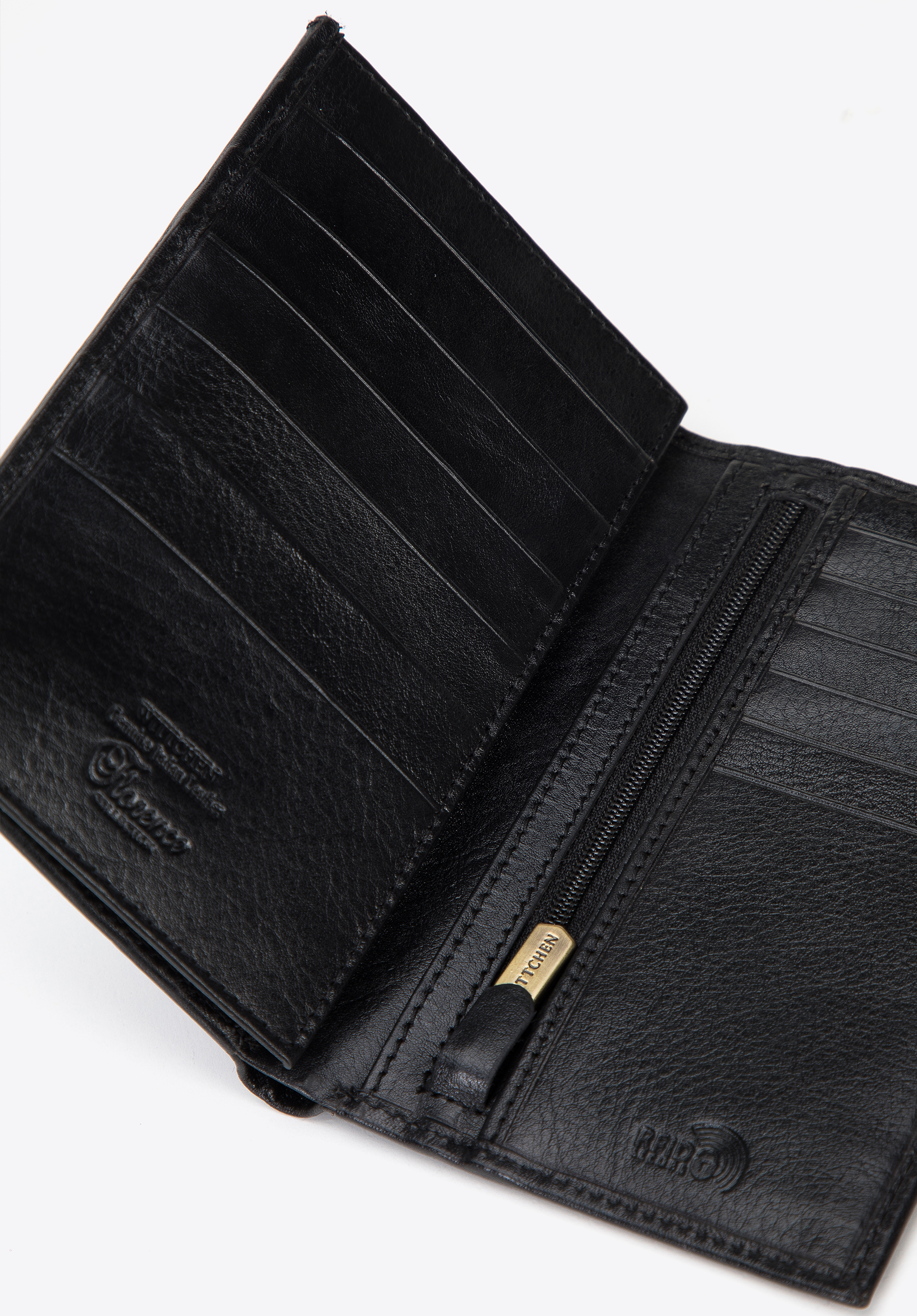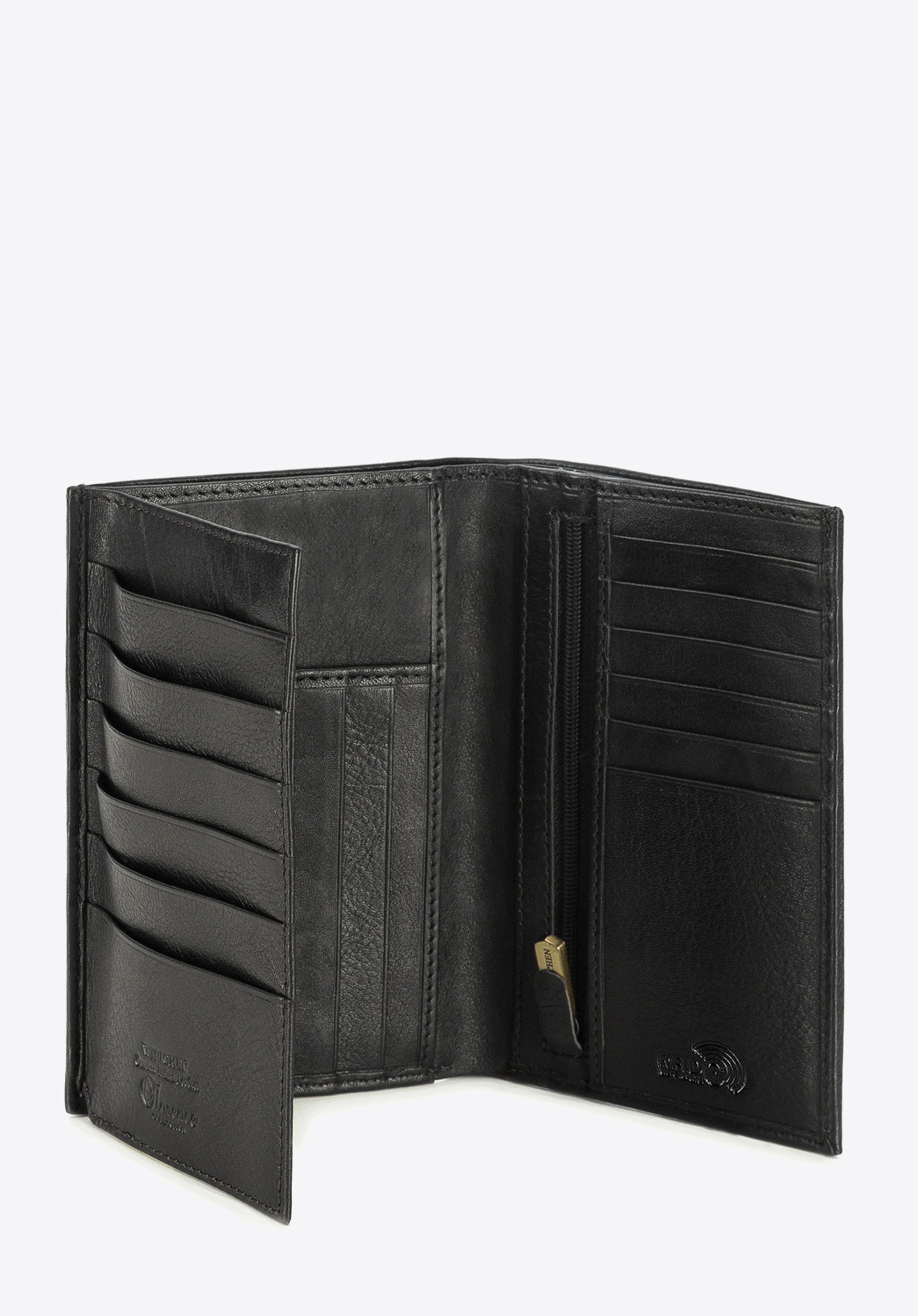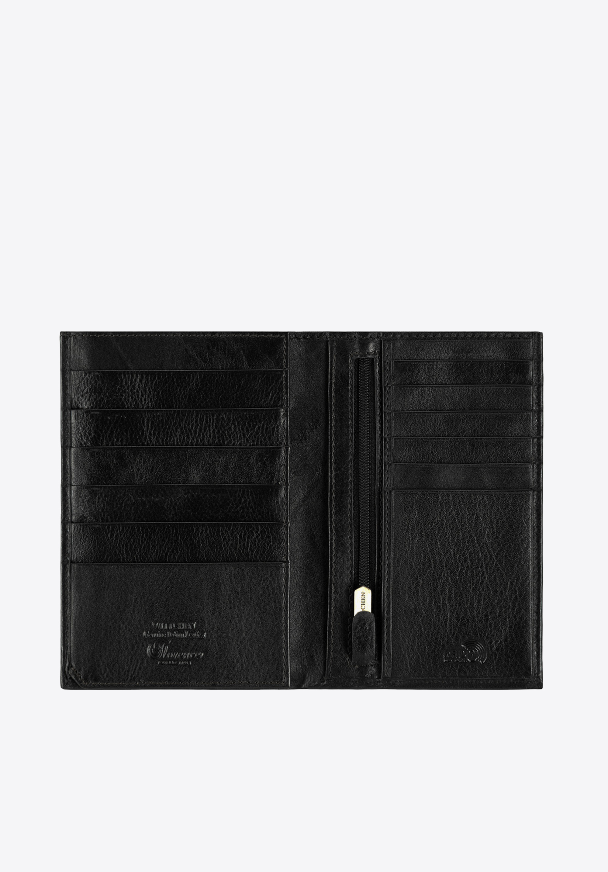 Veľká, kožená pánska peňaženka z jemne lesklej teľacej kože je výnimočne priestranný model. Vďaka veľkému počtu vreciek je funkčná a zapínanie na zips zvyšuje komfort používania.