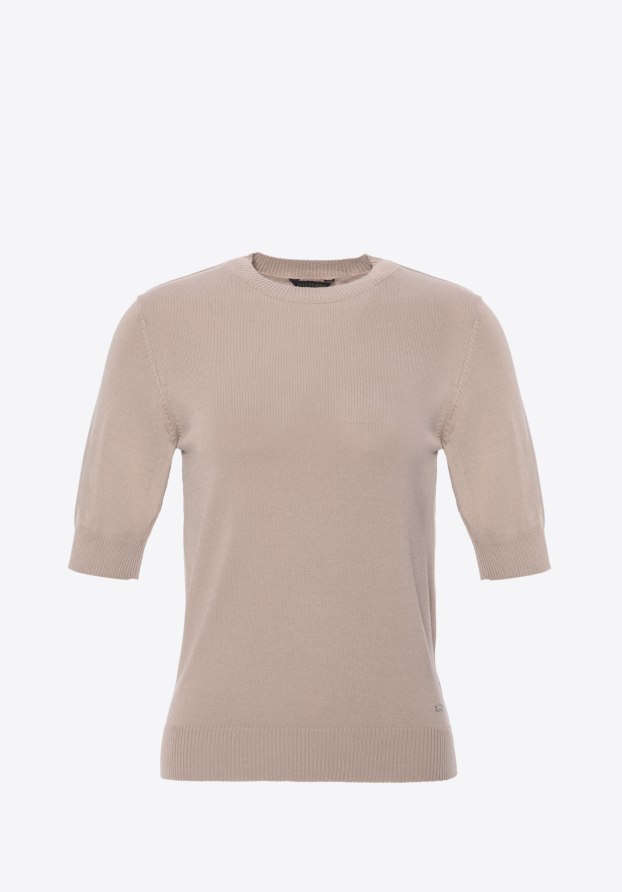 Táto blúzka dokazuje, že prepracované detaily a jednoduchý strih dokážu vytvoriť výnimočne štýlový vzhľad. Vyrobená z mäkkej pletenej viskózy zmiešanej s nylonom , krásne prilieha k postave a zároveň ponúka celodenné pohodlie. Krátke rukávy a jemne priliehavý lem obopínajú postavu, zatiaľ čo rebrovaný okrúhly výstrih dodáva nádych jemnej elegancie. Malé kovové logo na spodnom okraji dotvára dizajn decentným akcentom, ktorý zdôrazňuje kvalitné remeselné spracovanie.