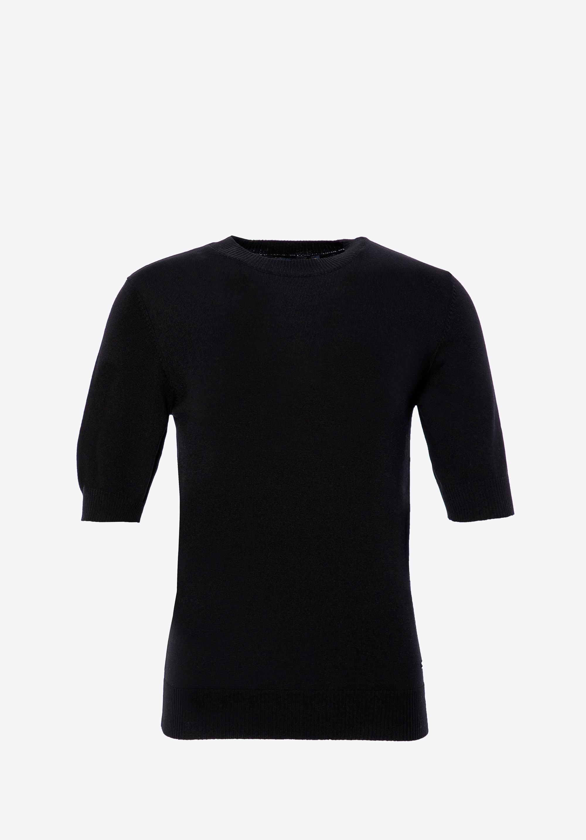 Táto blúzka dokazuje, že prepracované detaily a jednoduchý strih dokážu vytvoriť výnimočne štýlový vzhľad. Vyrobená z mäkkej pletenej viskózy zmiešanej s nylonom , krásne prilieha k postave a zároveň ponúka celodenné pohodlie. Krátke rukávy a jemne priliehavý lem obopínajú postavu, zatiaľ čo rebrovaný okrúhly výstrih dodáva nádych jemnej elegancie. Malé kovové logo na spodnom okraji dotvára dizajn decentným akcentom, ktorý zdôrazňuje kvalitné remeselné spracovanie.
