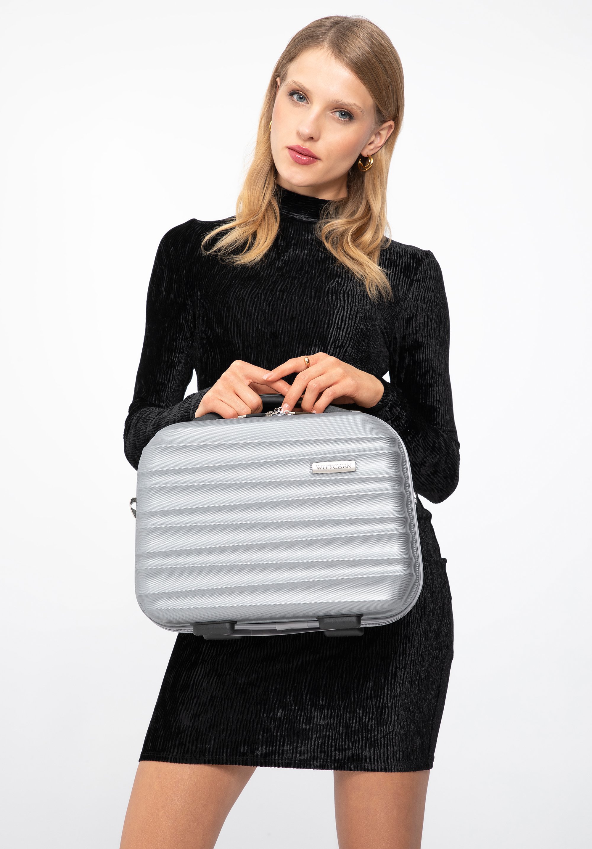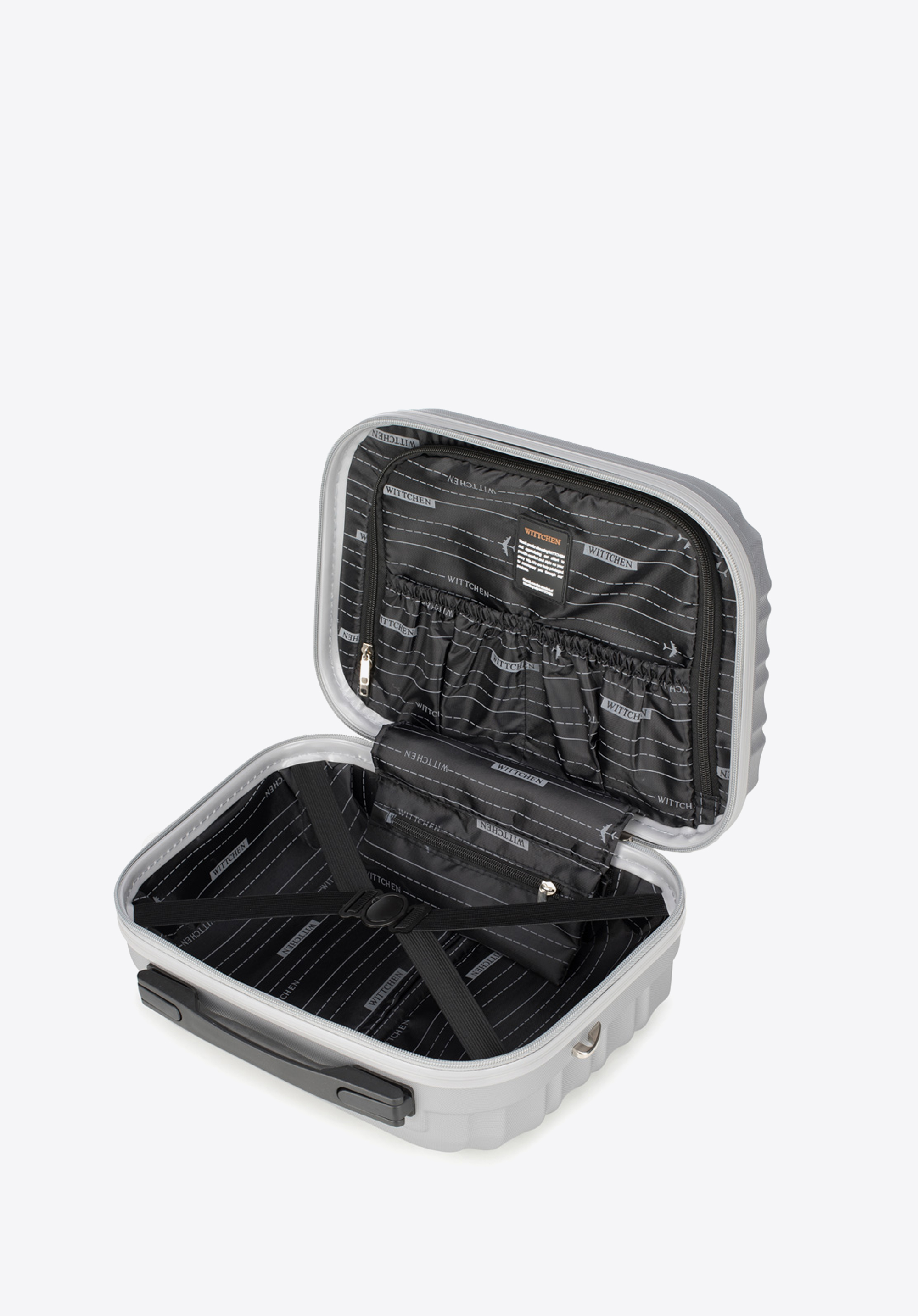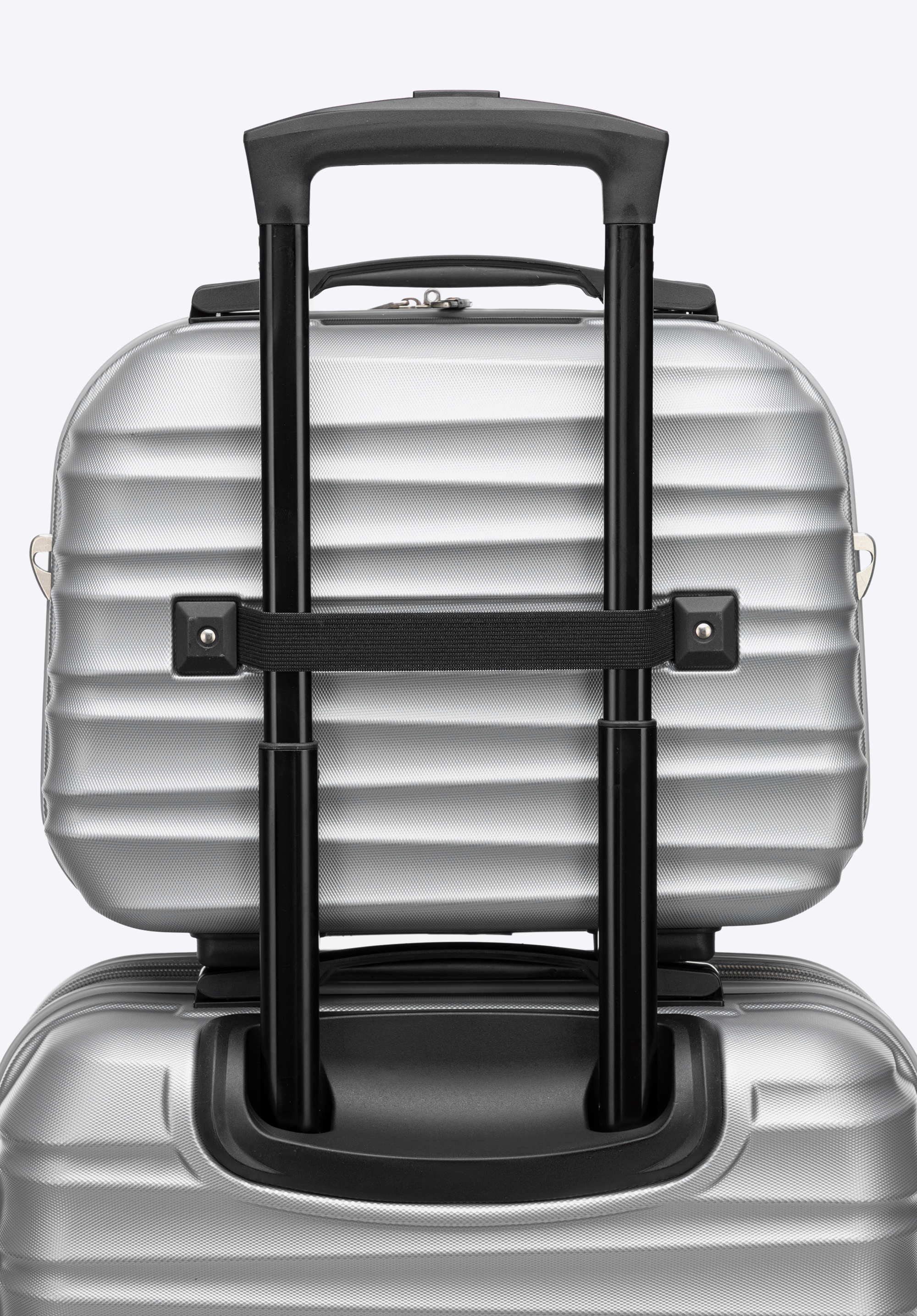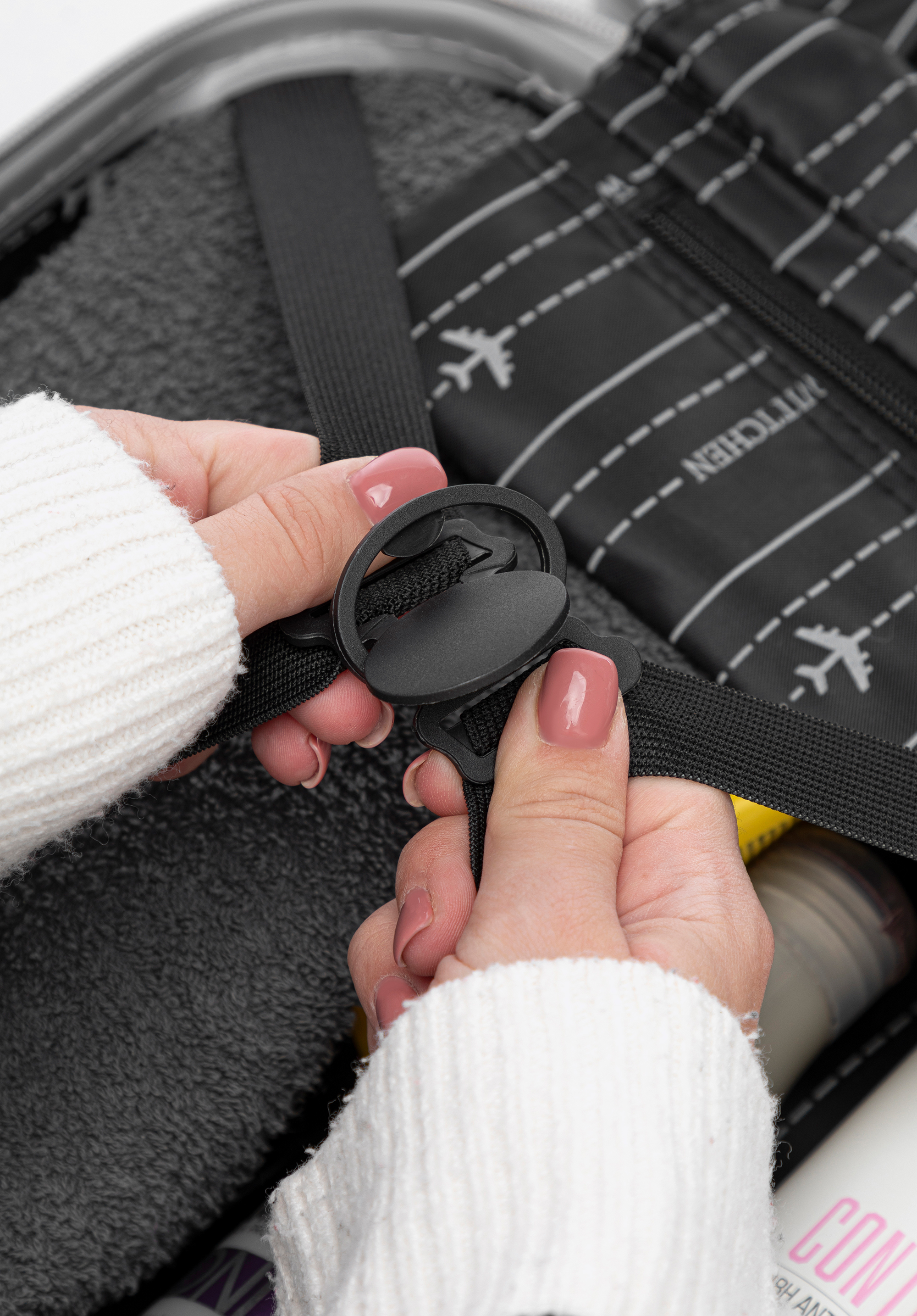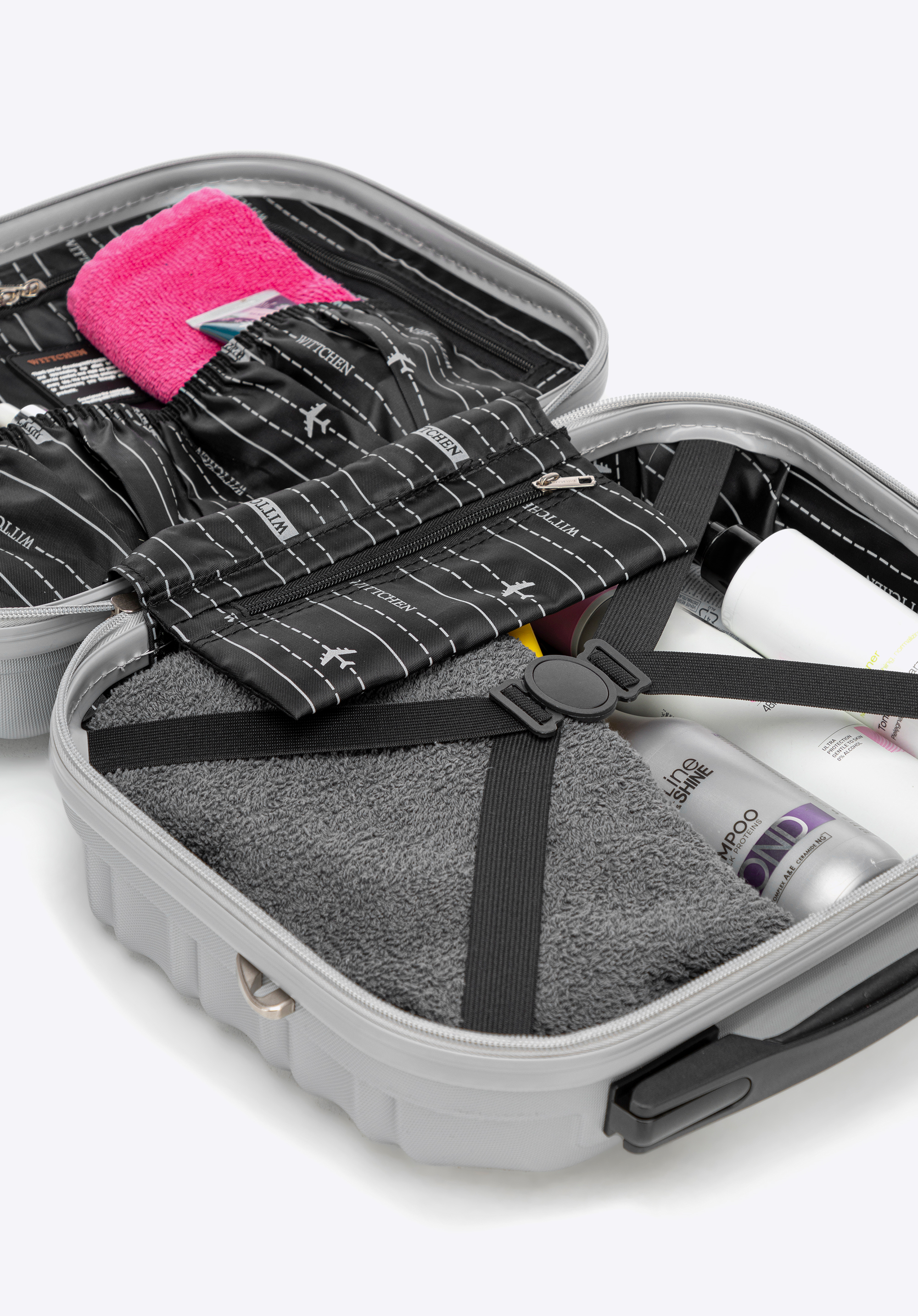 rukoväťou na jednoduché prenášanie kozmetickej tašky, odnímateľným nastaviteľným popruhom a elastickým popruhom, ktorý umožňuje pripevnenie na rukoväť kufra.