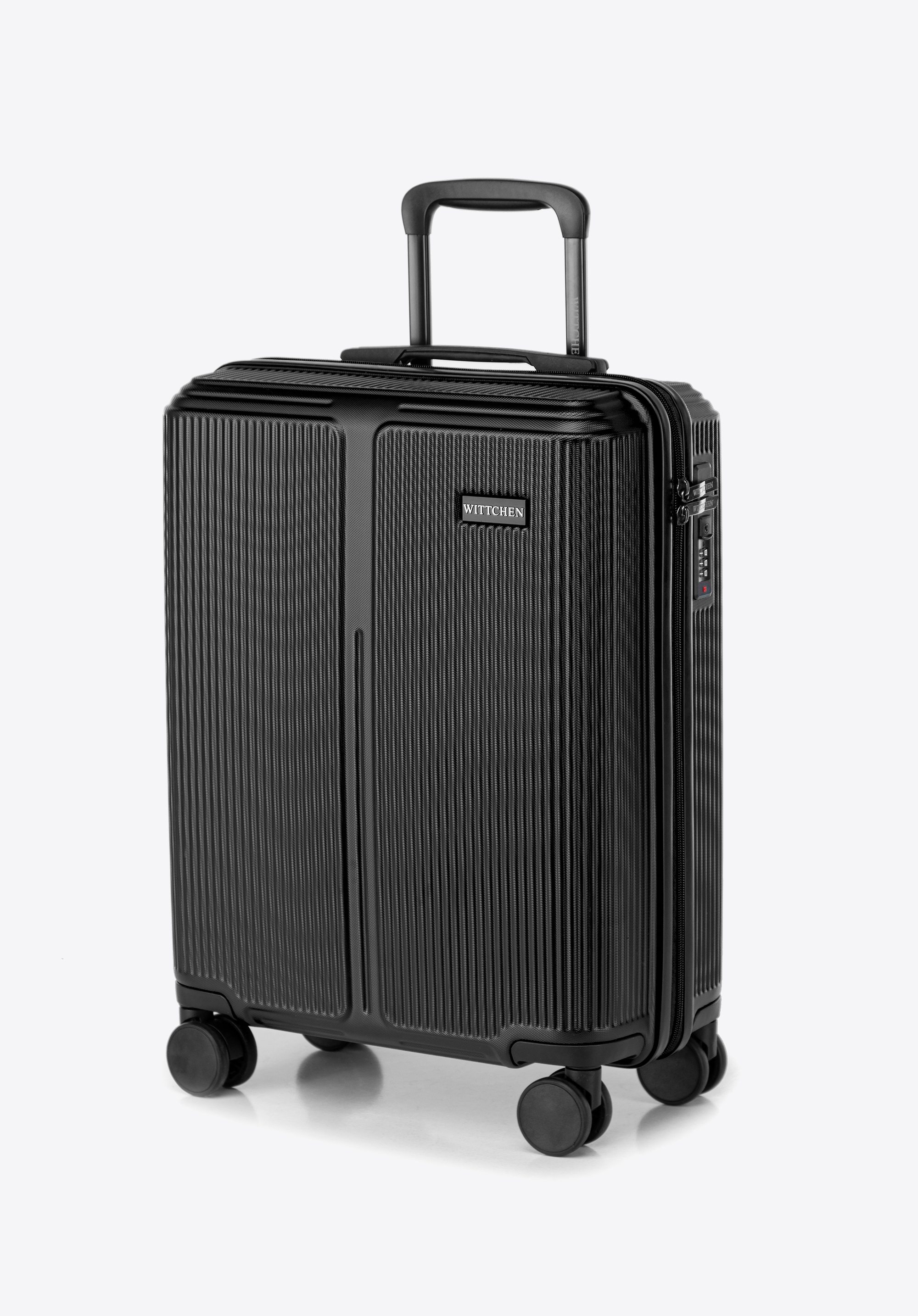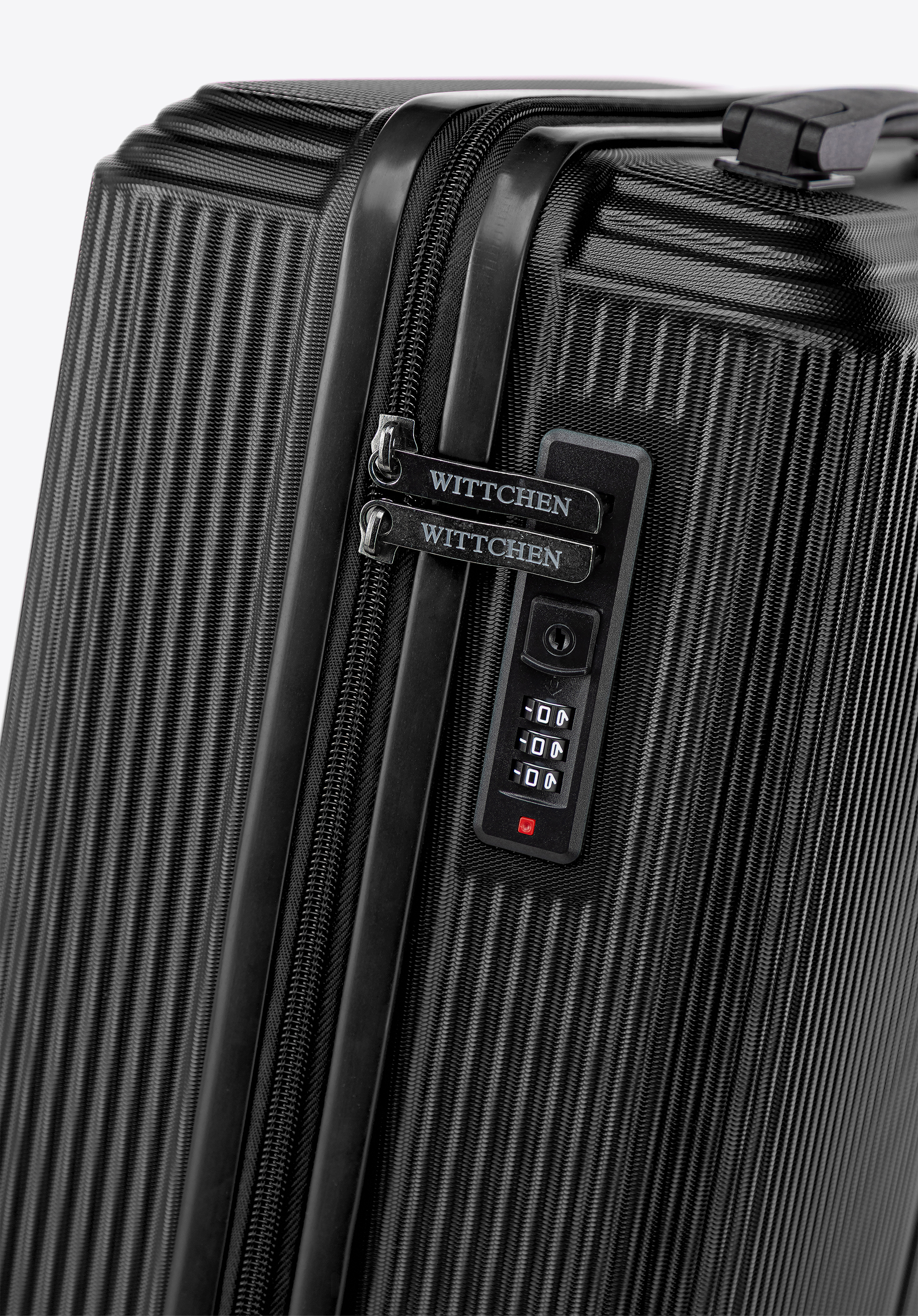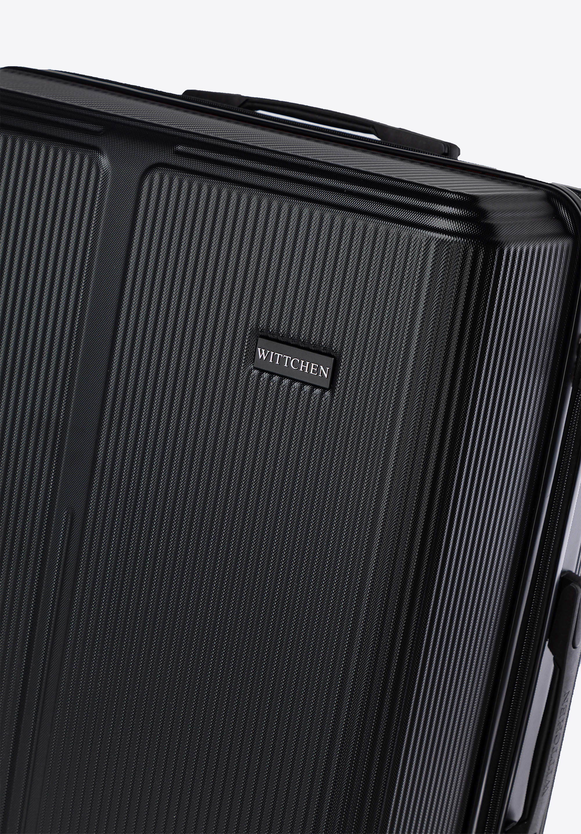 - Dizajn : Moderná vertikálna razba na škrupine a čierne detaily dodávajú kufru elegantný a nadčasový vzhľad.