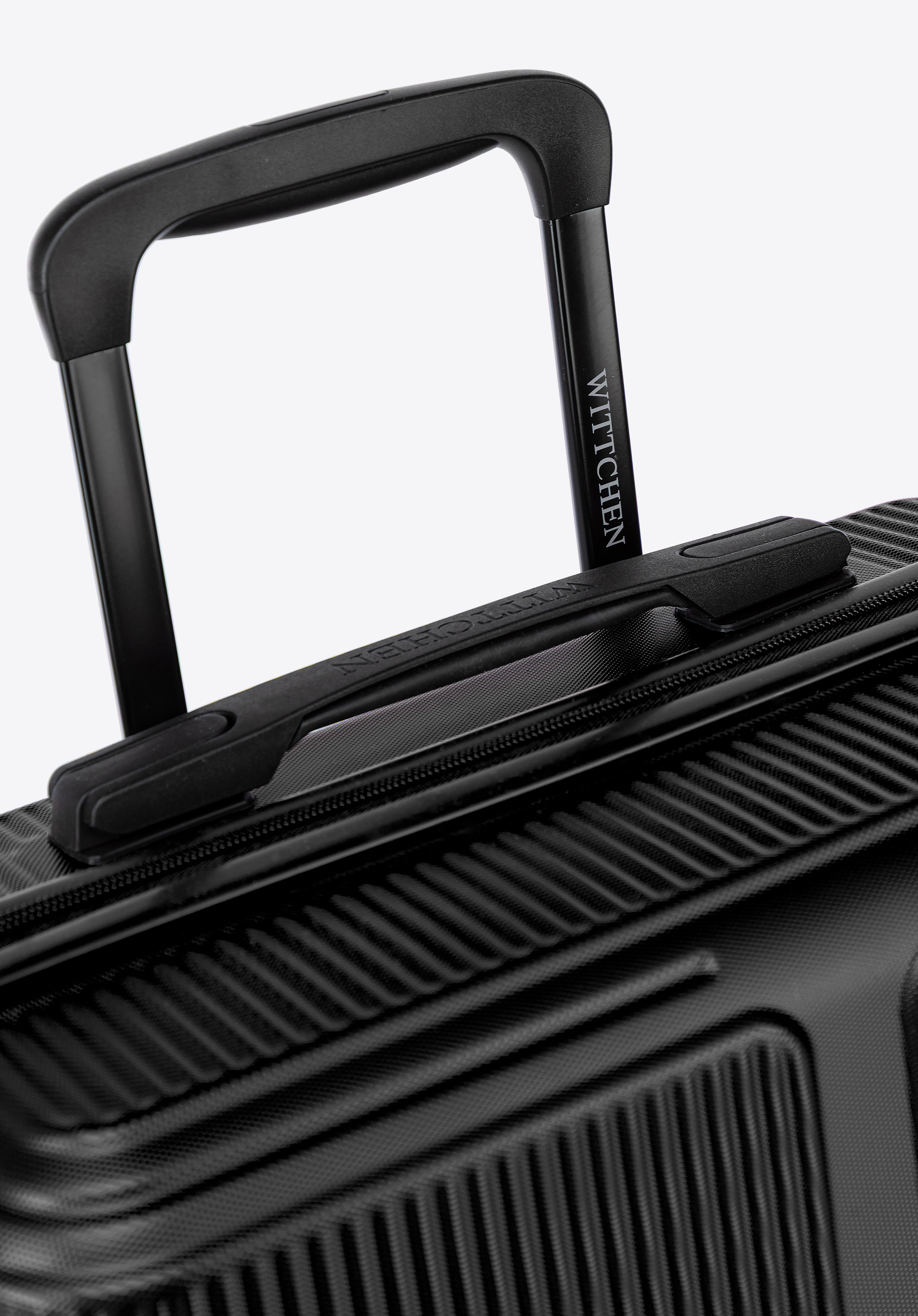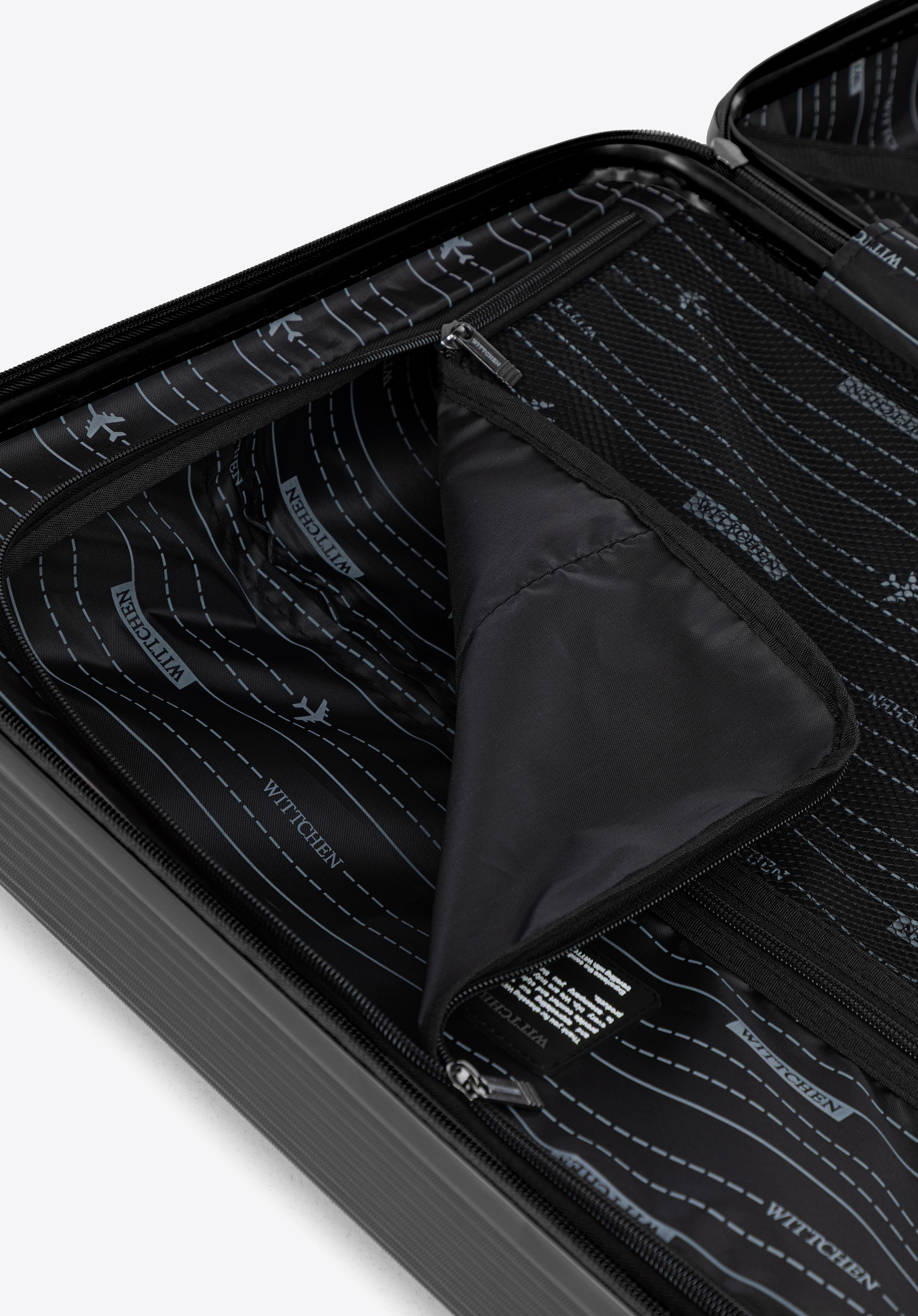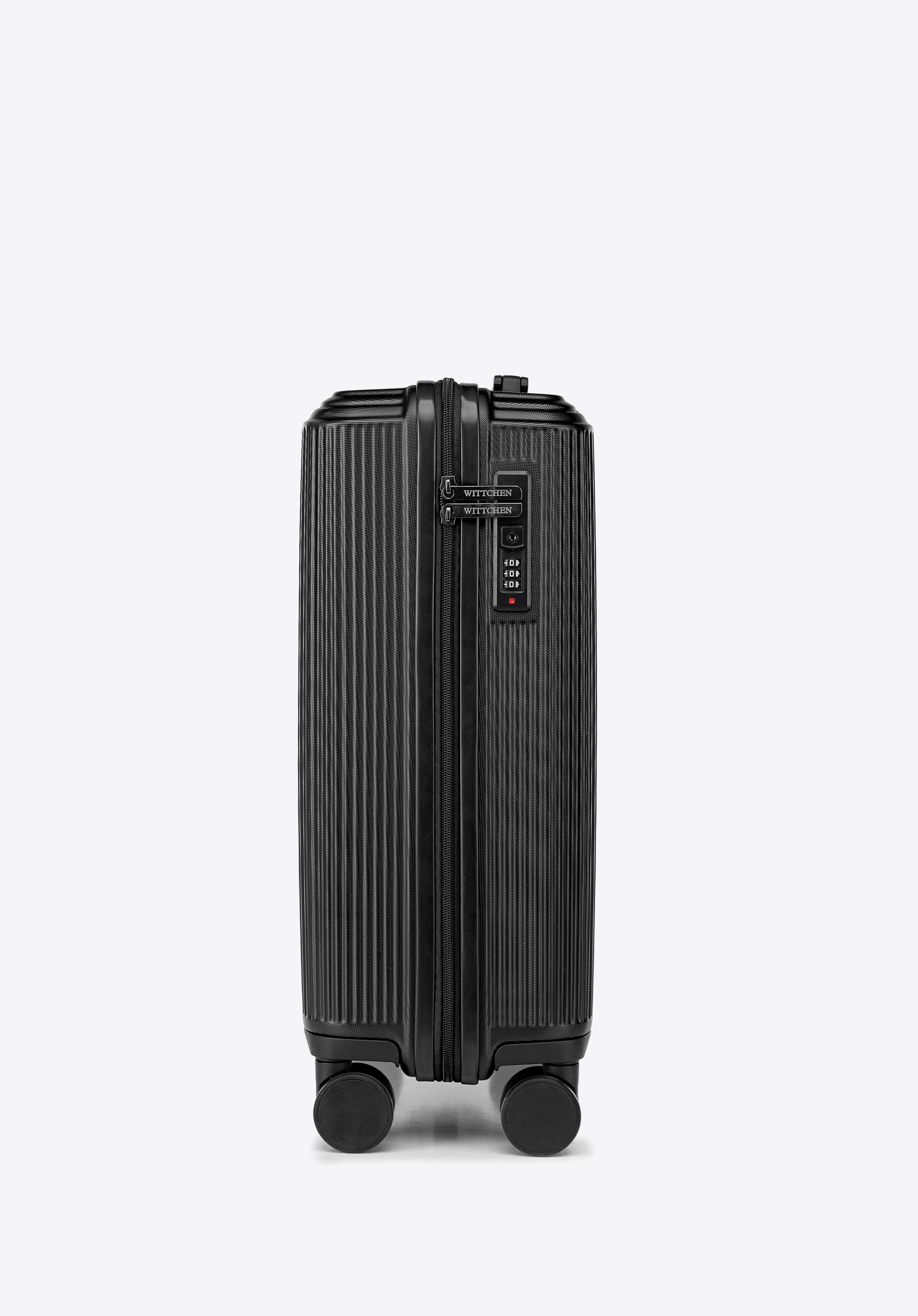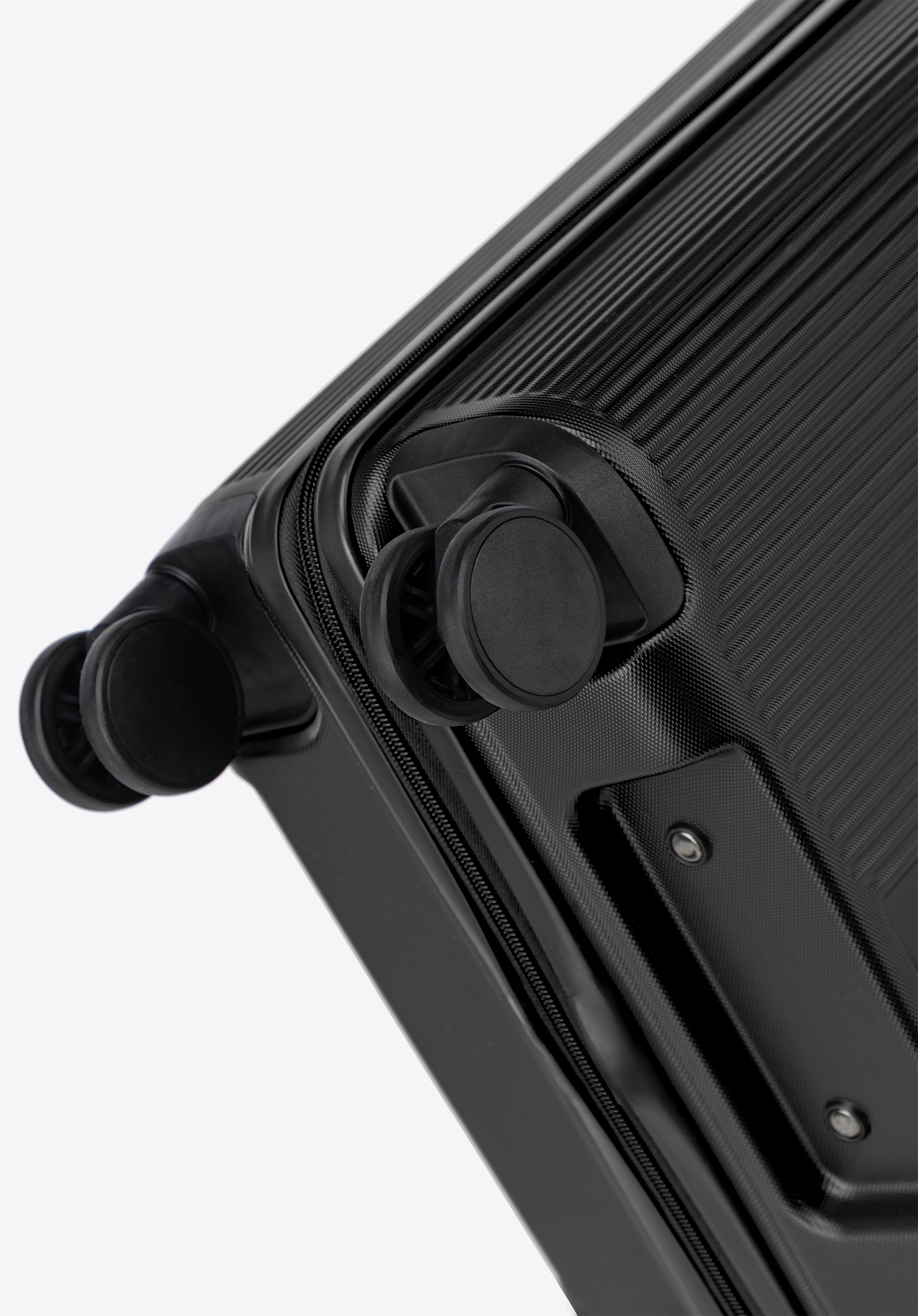 - Dizajn : Moderná vertikálna razba na škrupine a čierne detaily dodávajú kufru elegantný a nadčasový vzhľad.