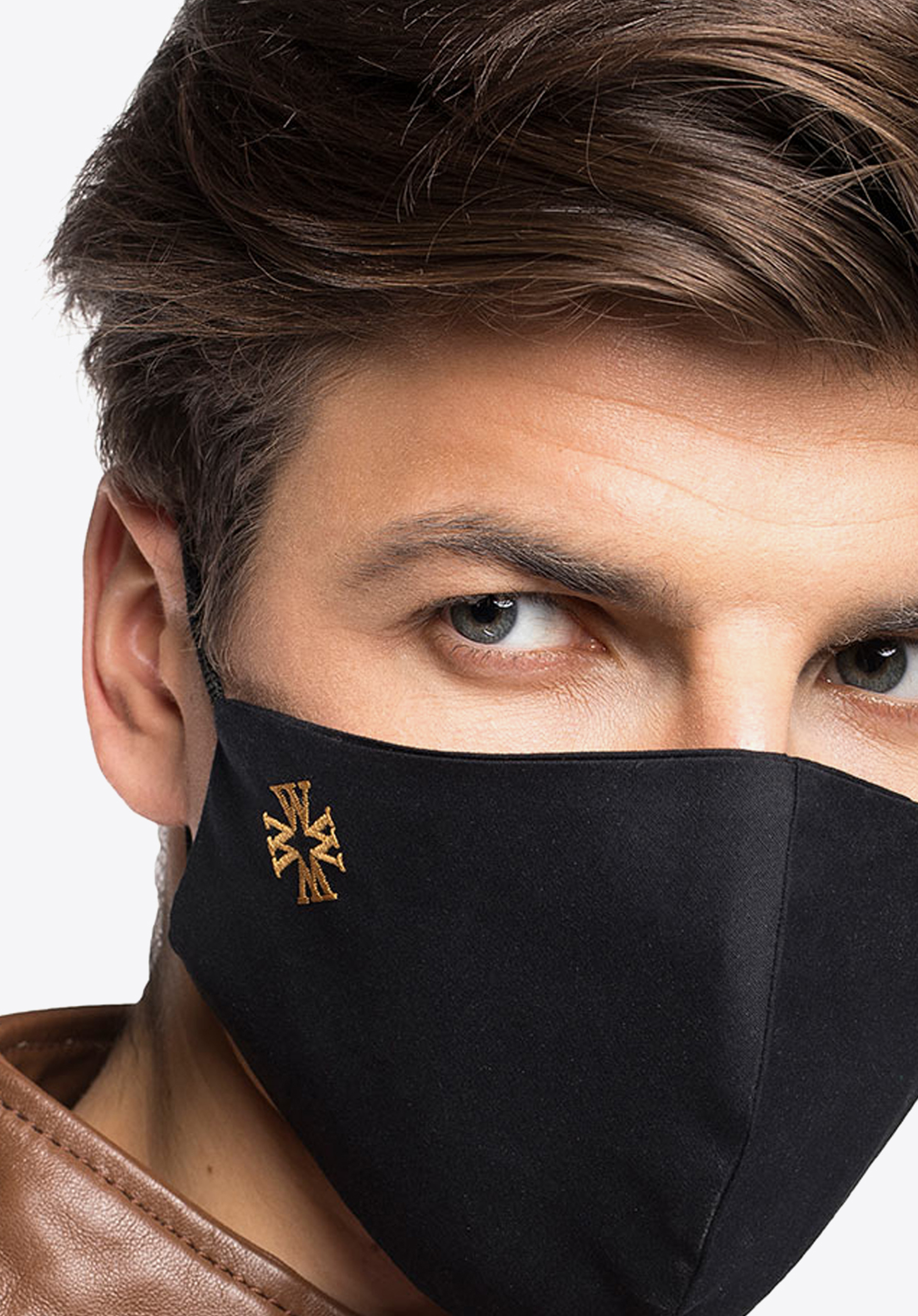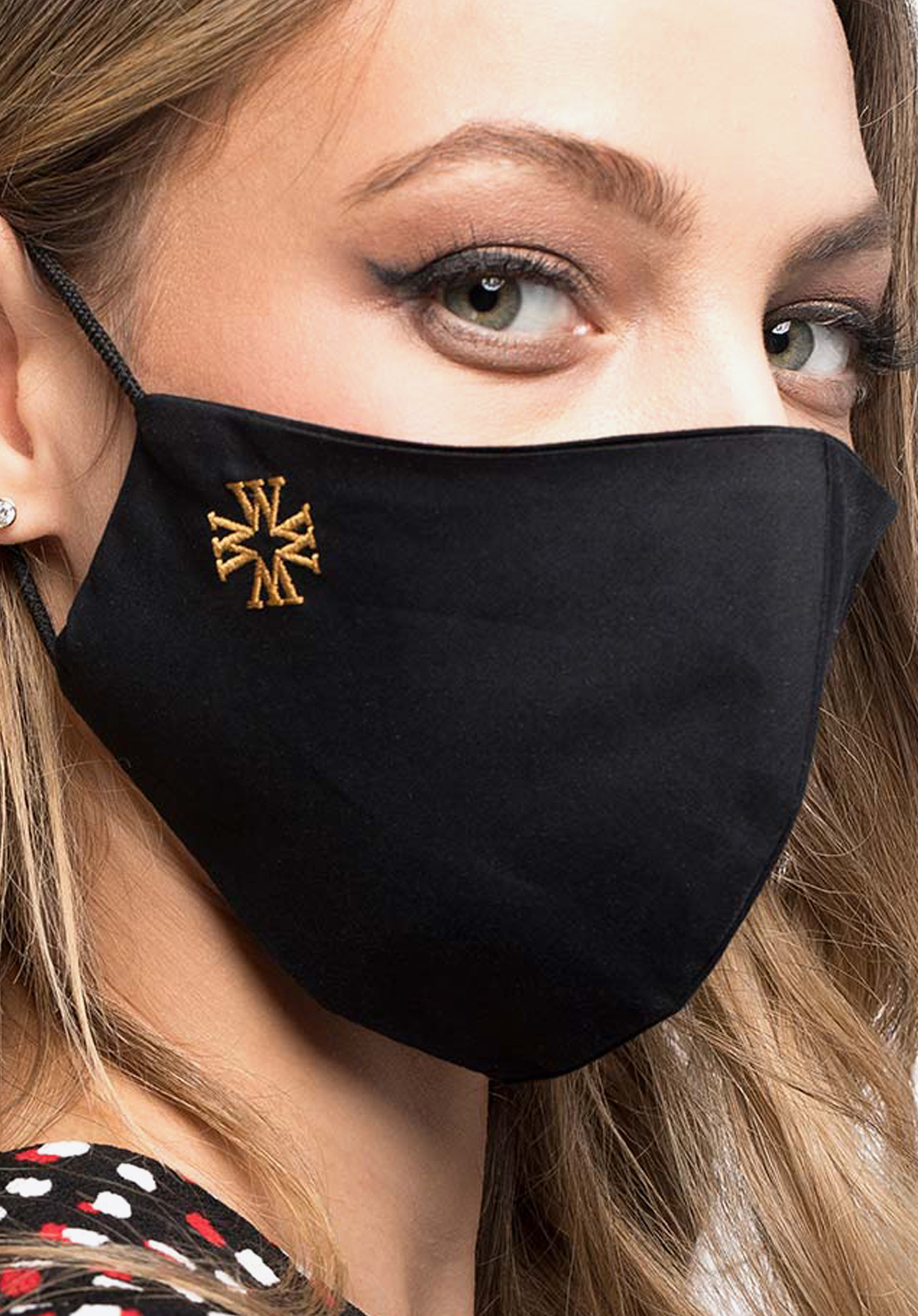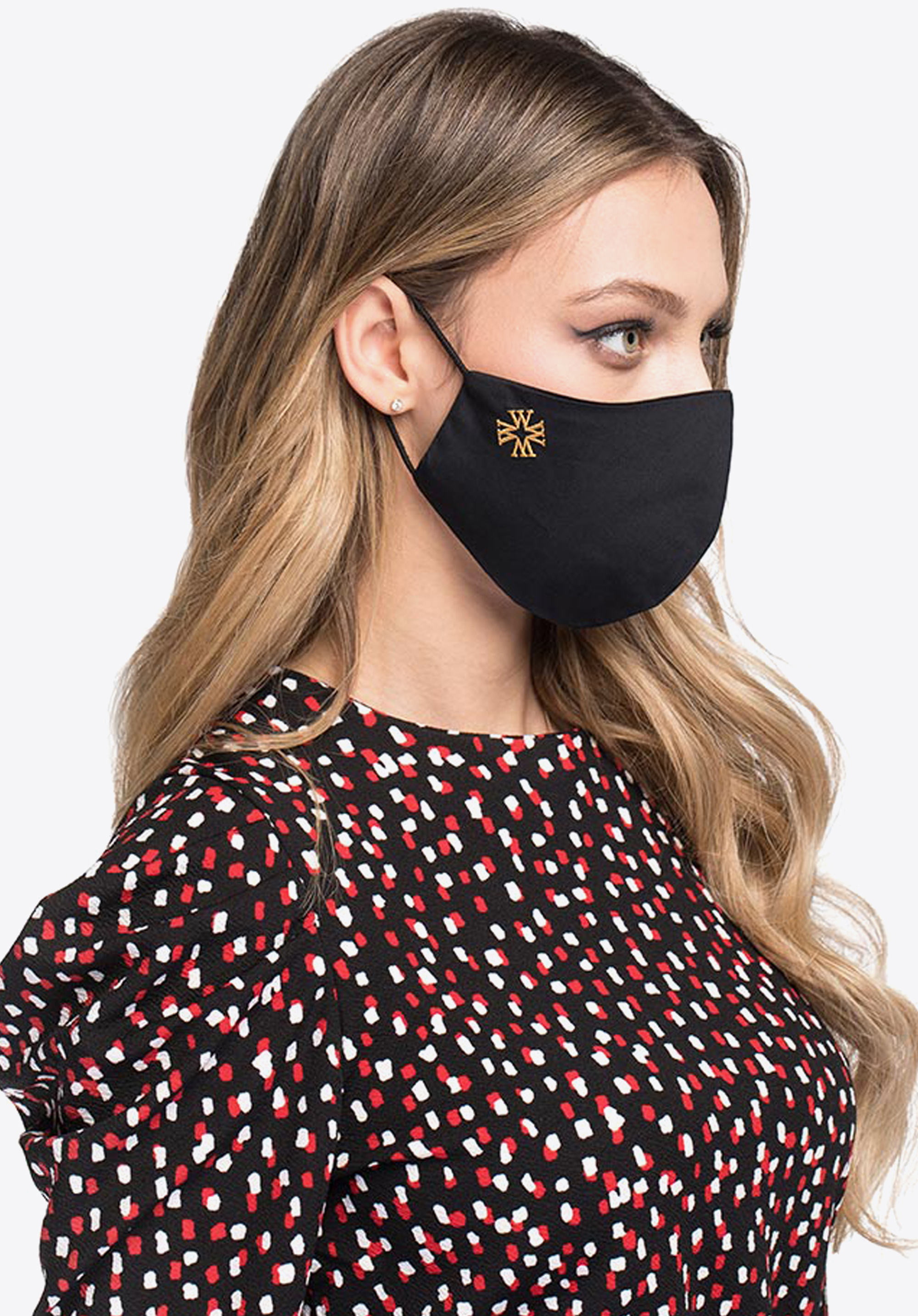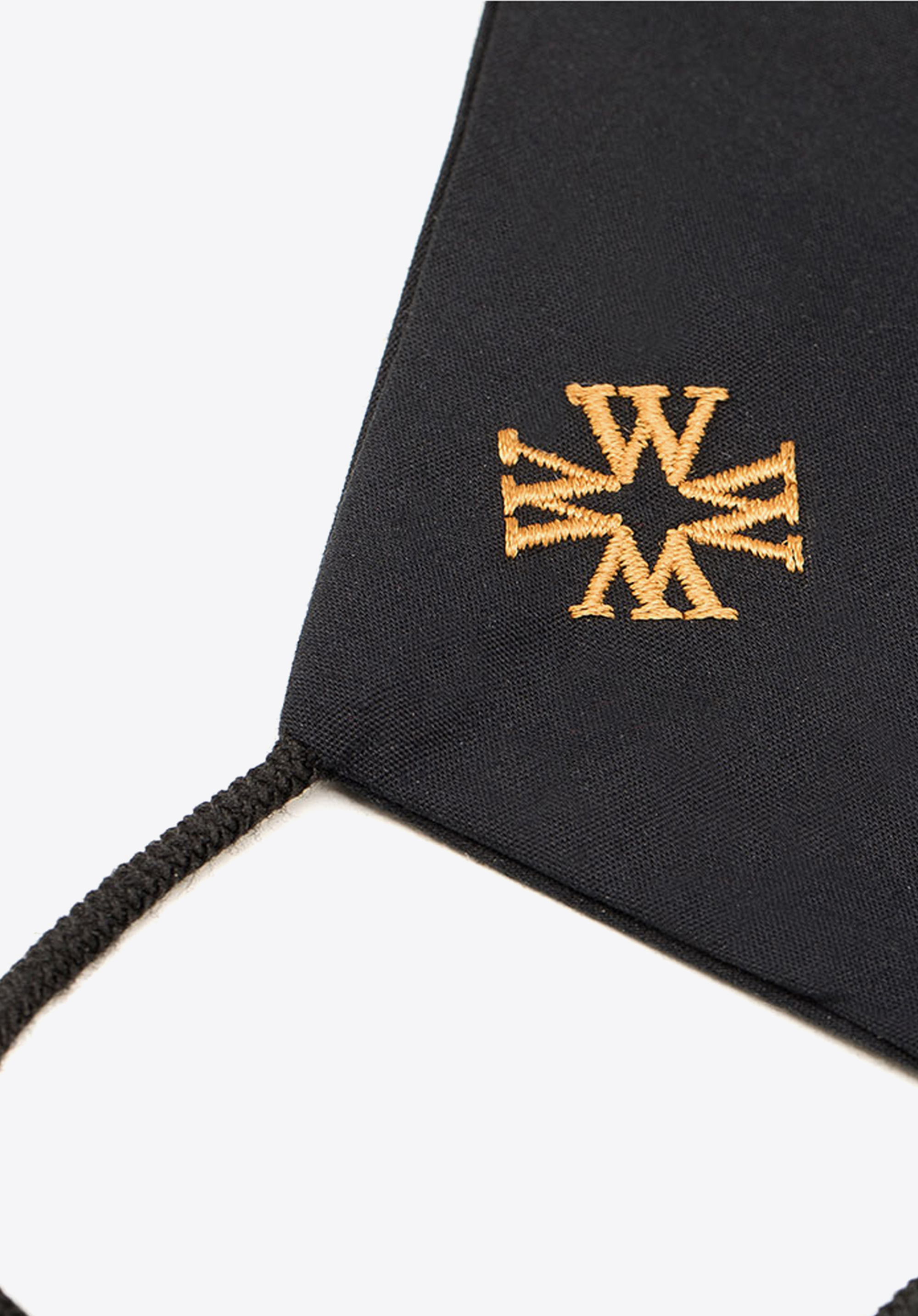 Maska je ušitá z tenkej dvojvrstvovej látky s vyšitým zlatou niťou monogramom písmen "W". Je profilovaná, aby sa dobre prispôsobila tvaru tváre a nikde netlačila. Má tiež textilné gumičky na uši. Sýta čierna farba s diskrétnou výšivkou bude ladiť so všetkými ostatnými farbami, ktoré budete mať na sebe. Je to aj skvelý nápad na darček.