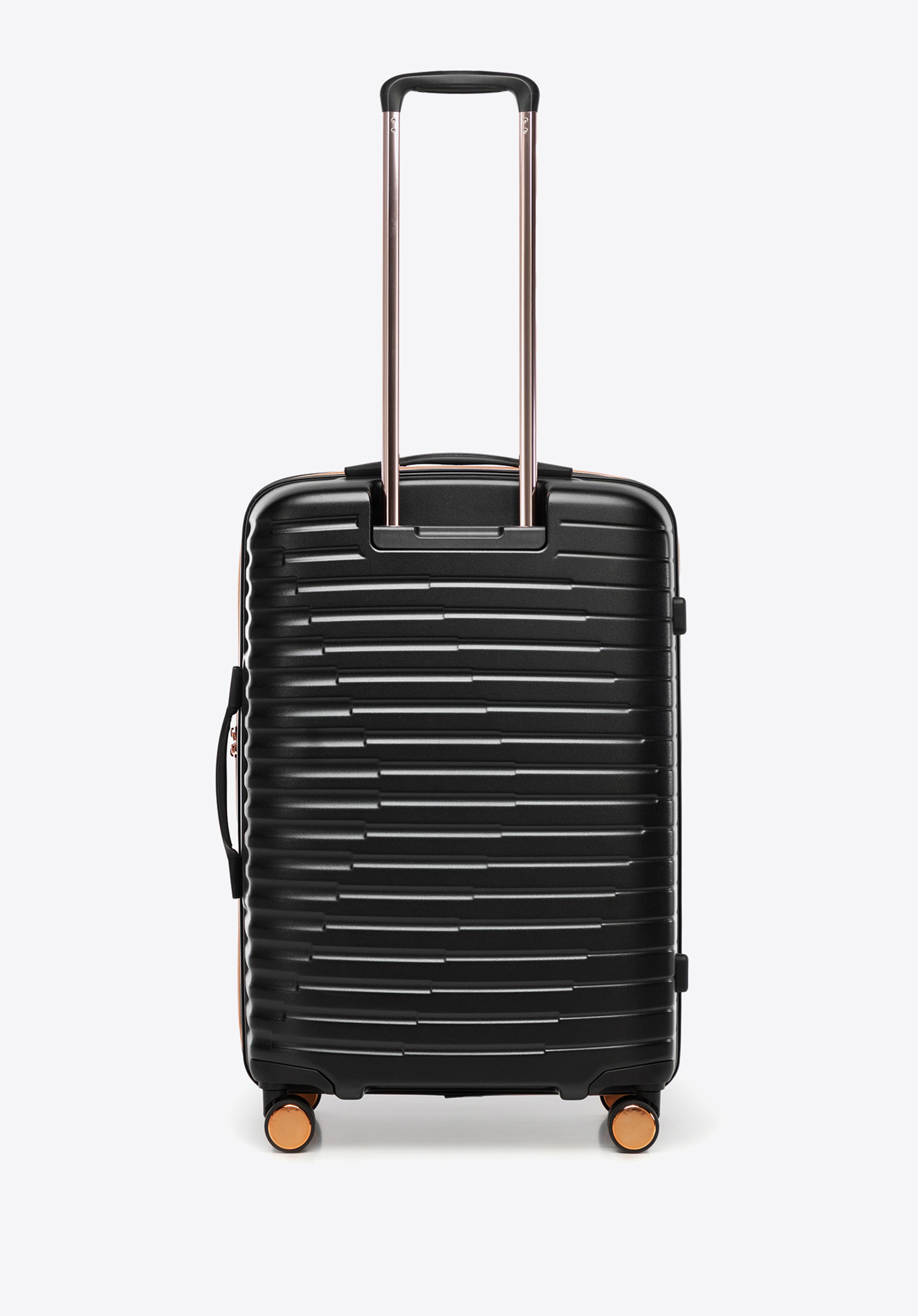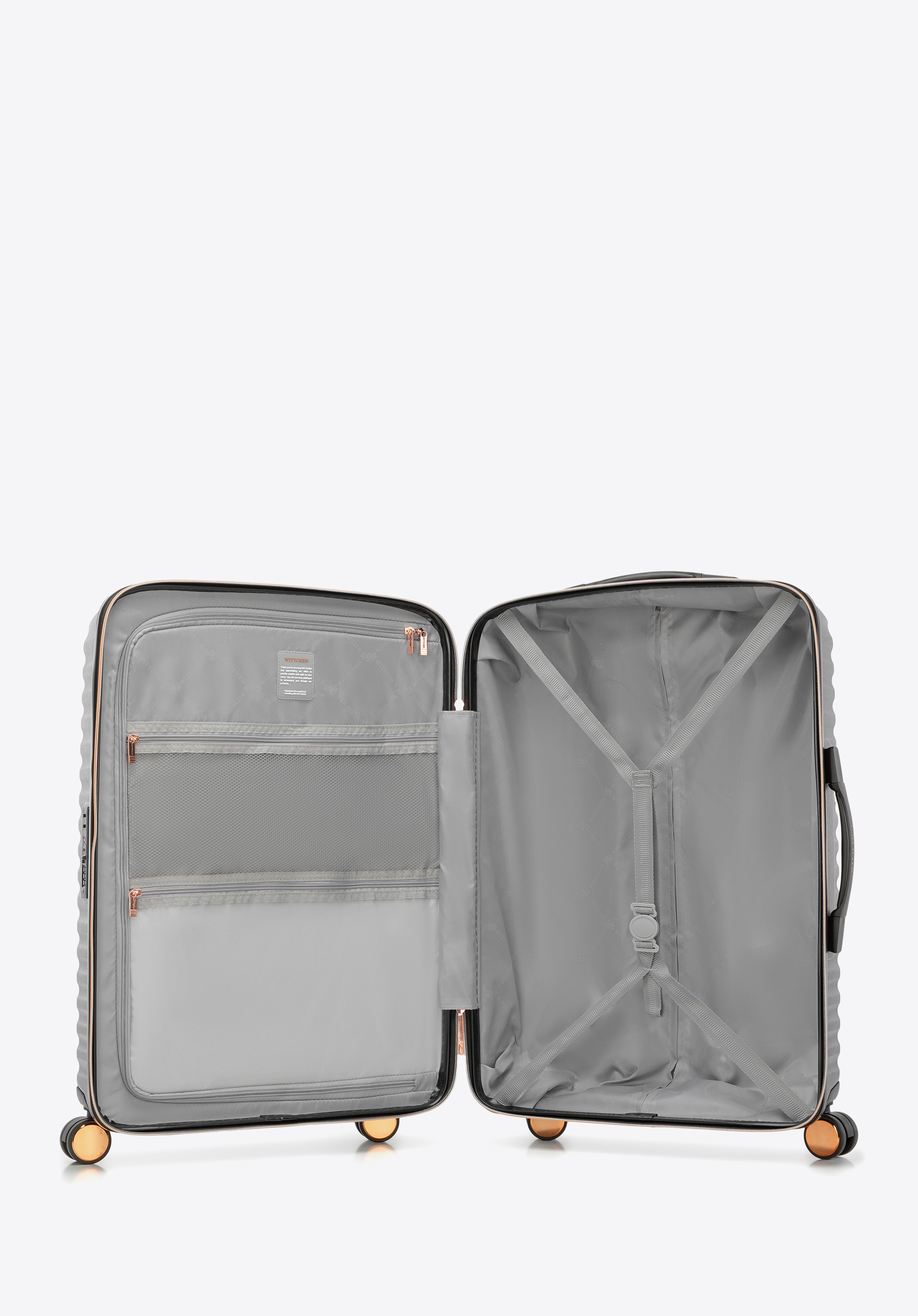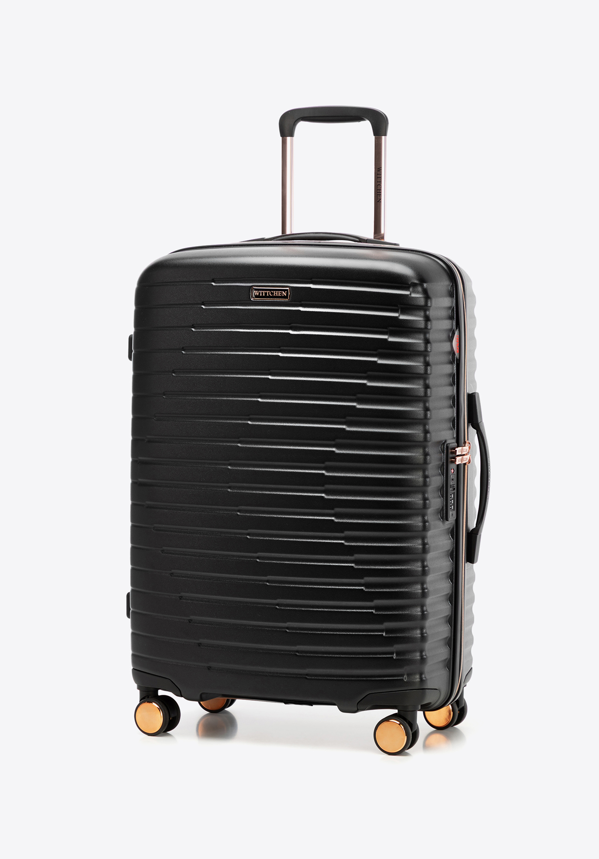 - Dizajn: Moderná silueta s horizontálnymi drážkami , ktoré umocňujú elegantný vzhľad kufra a zároveň posilňujú jeho štruktúru.