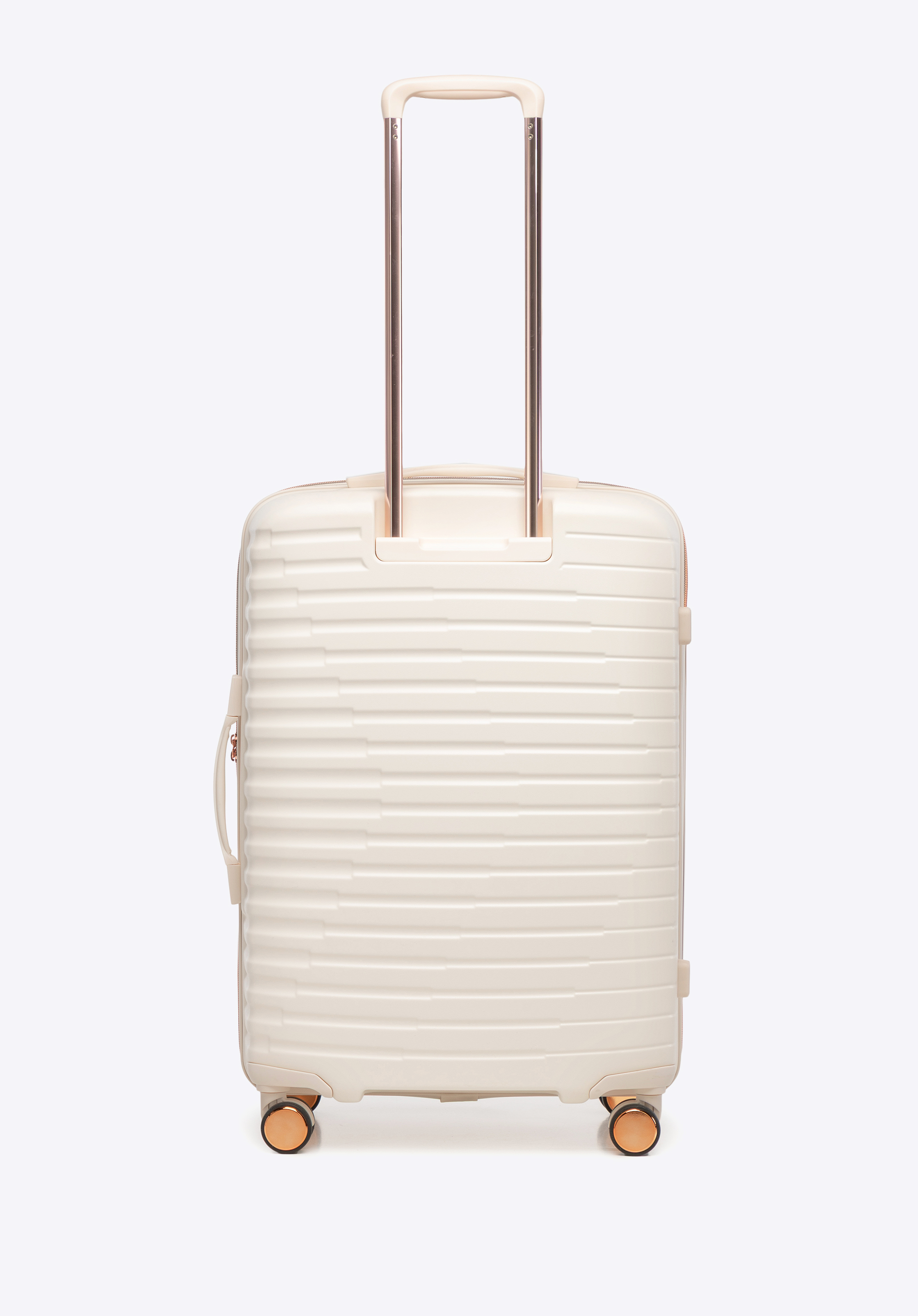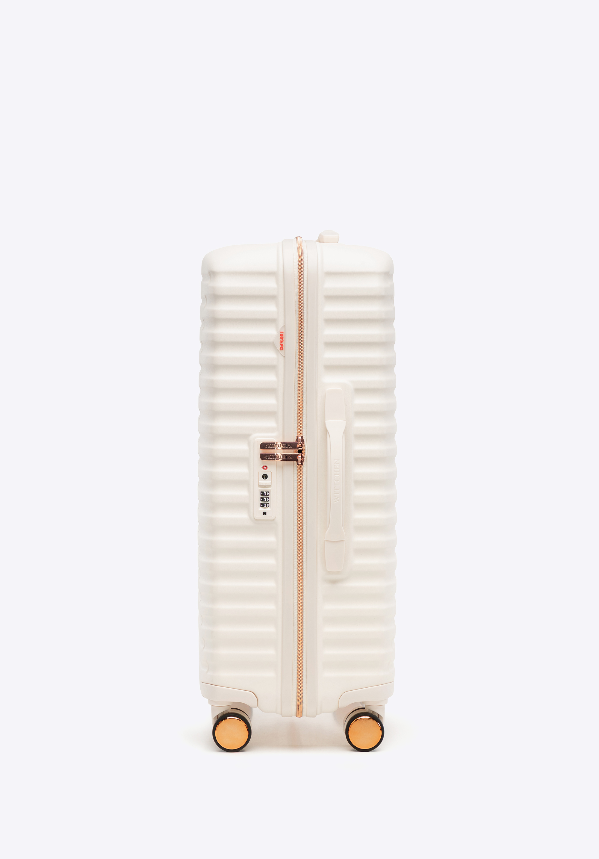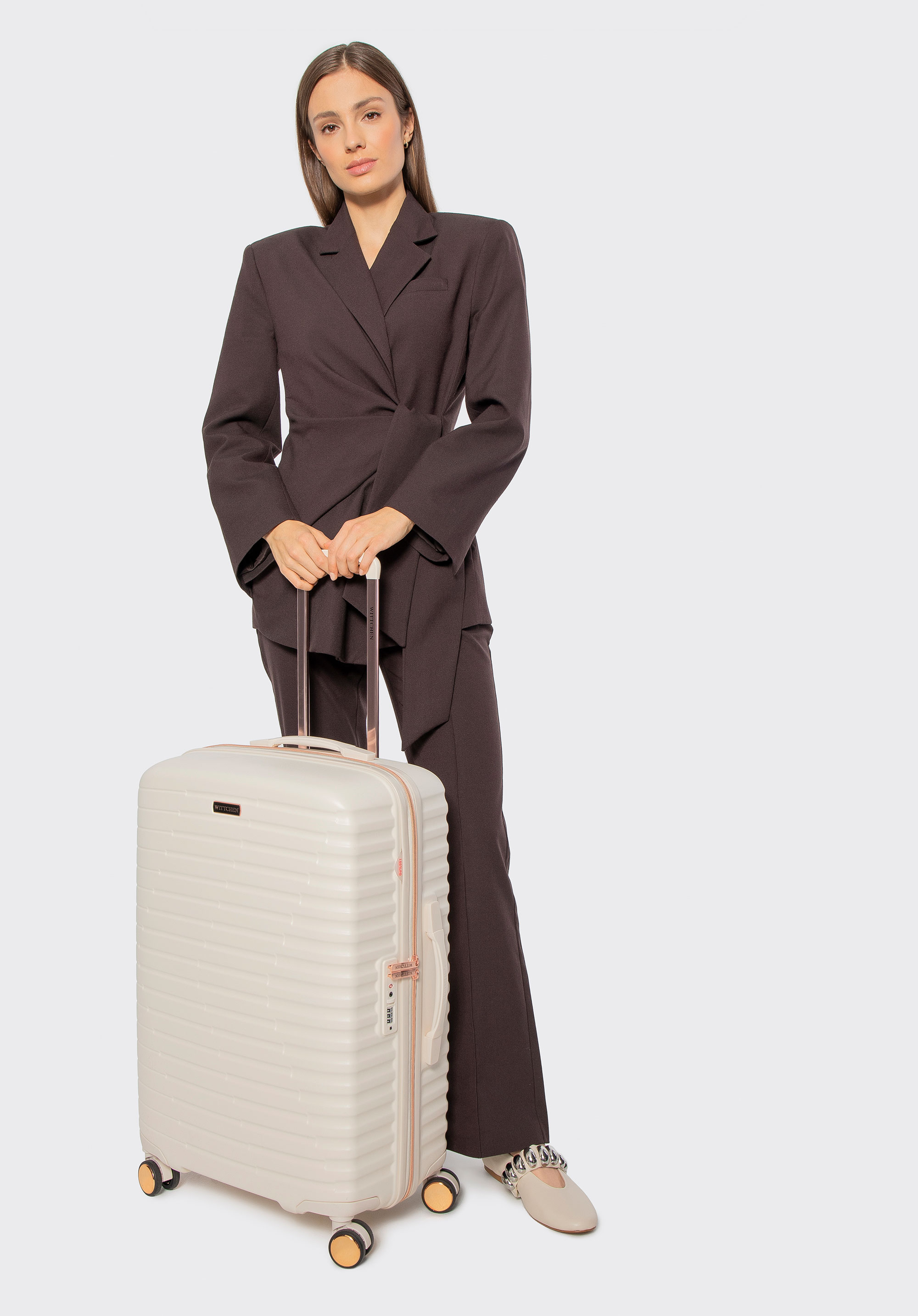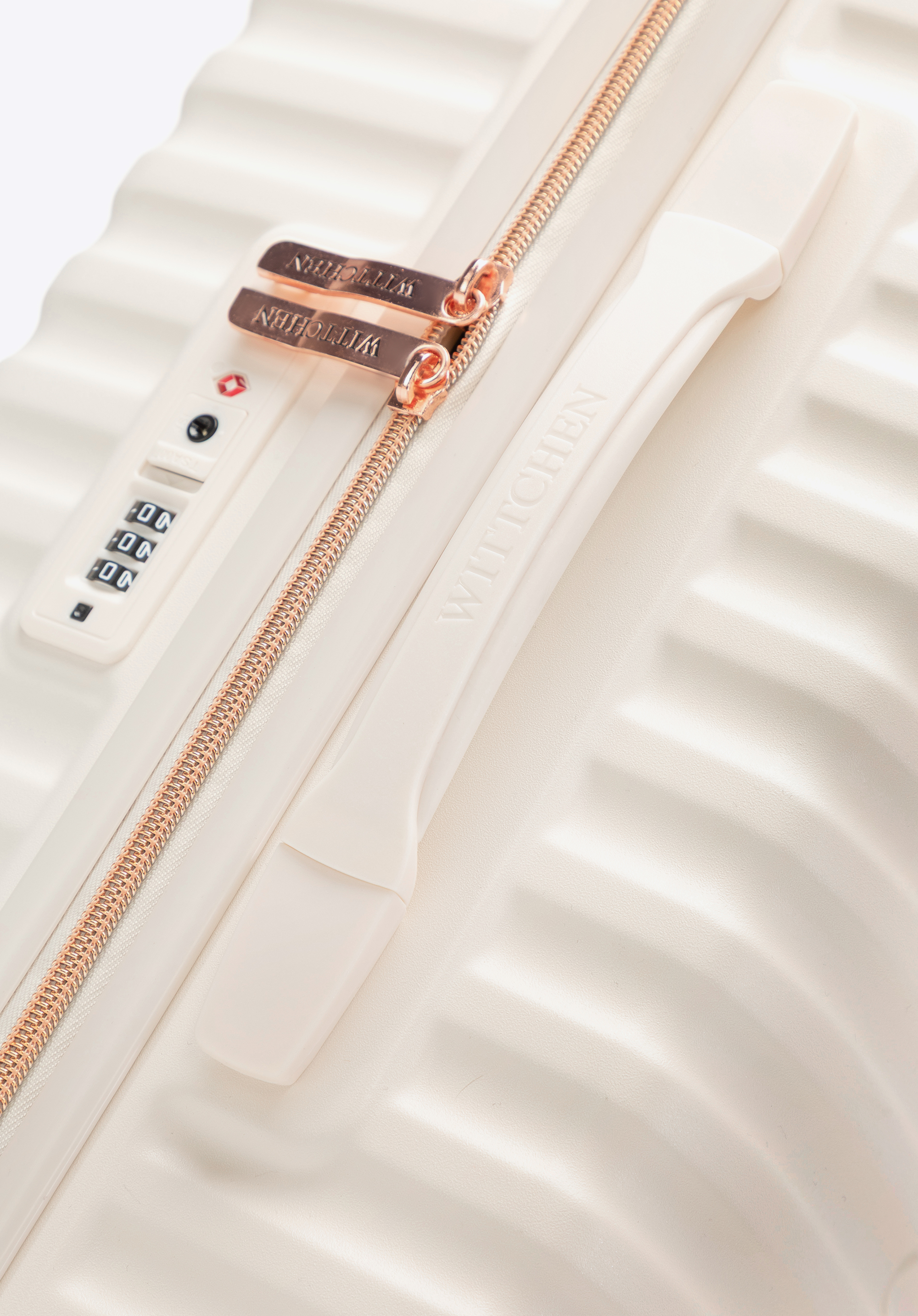- Dizajn: Moderná silueta s horizontálnymi drážkami , ktoré umocňujú elegantný vzhľad kufra a zároveň posilňujú jeho štruktúru.