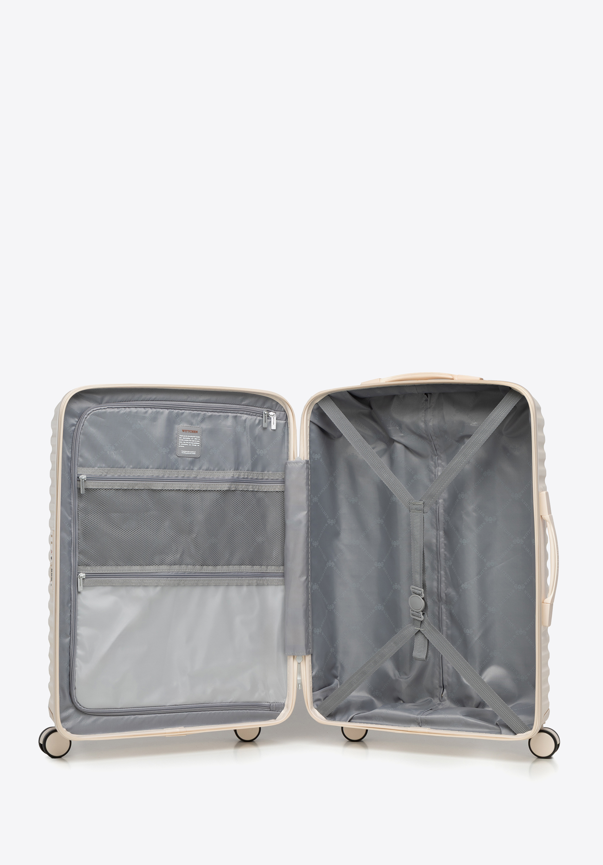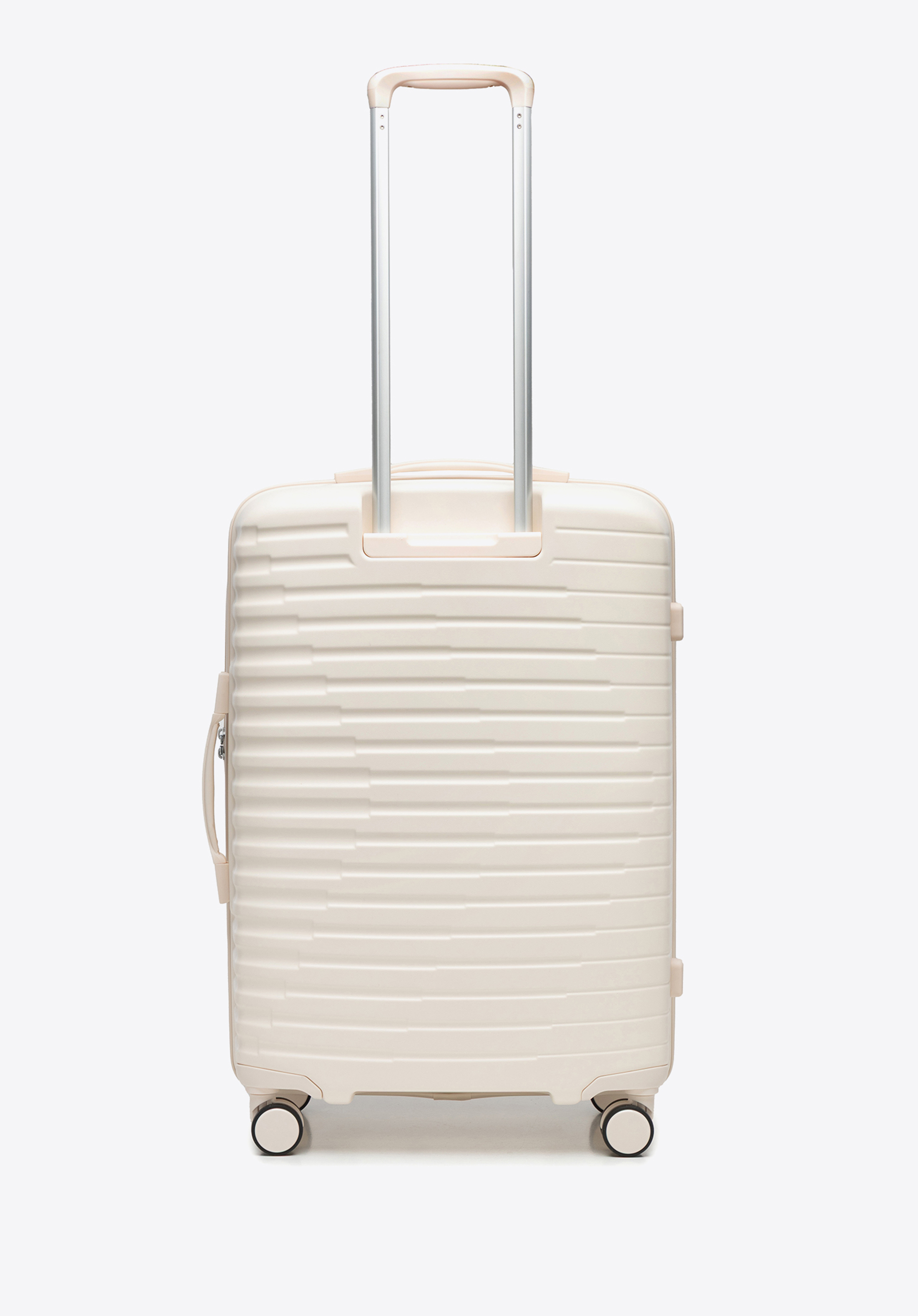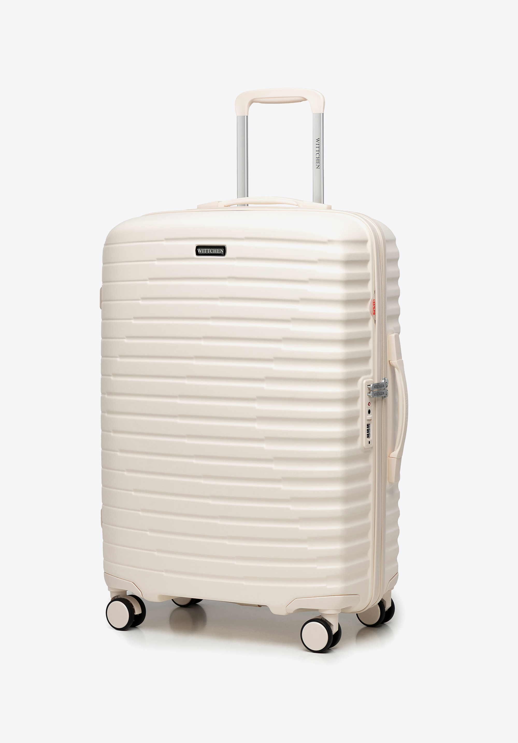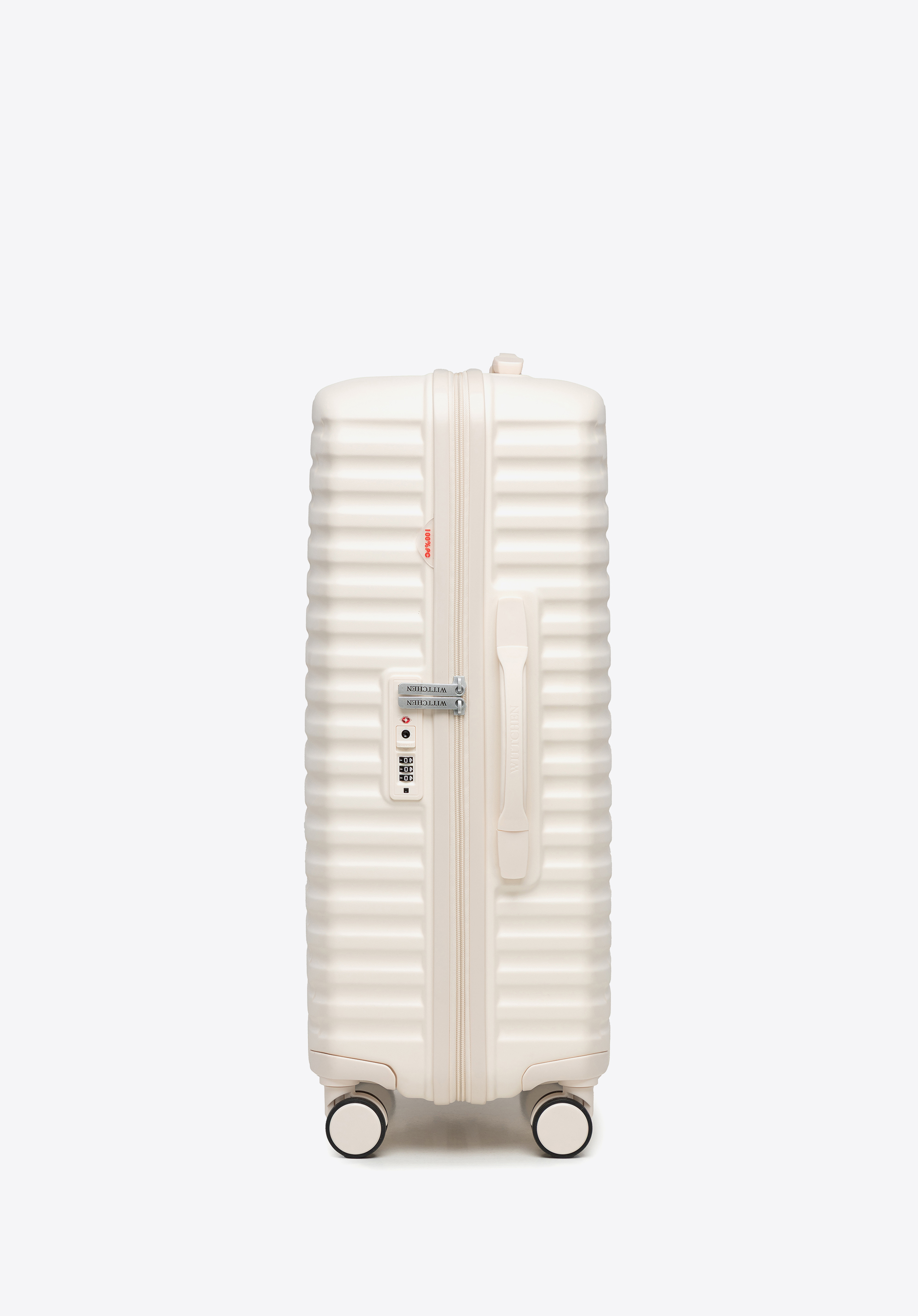 - Dizajn: Moderná silueta s horizontálnymi drážkami , ktoré umocňujú elegantný vzhľad kufra a zároveň posilňujú jeho štruktúru.