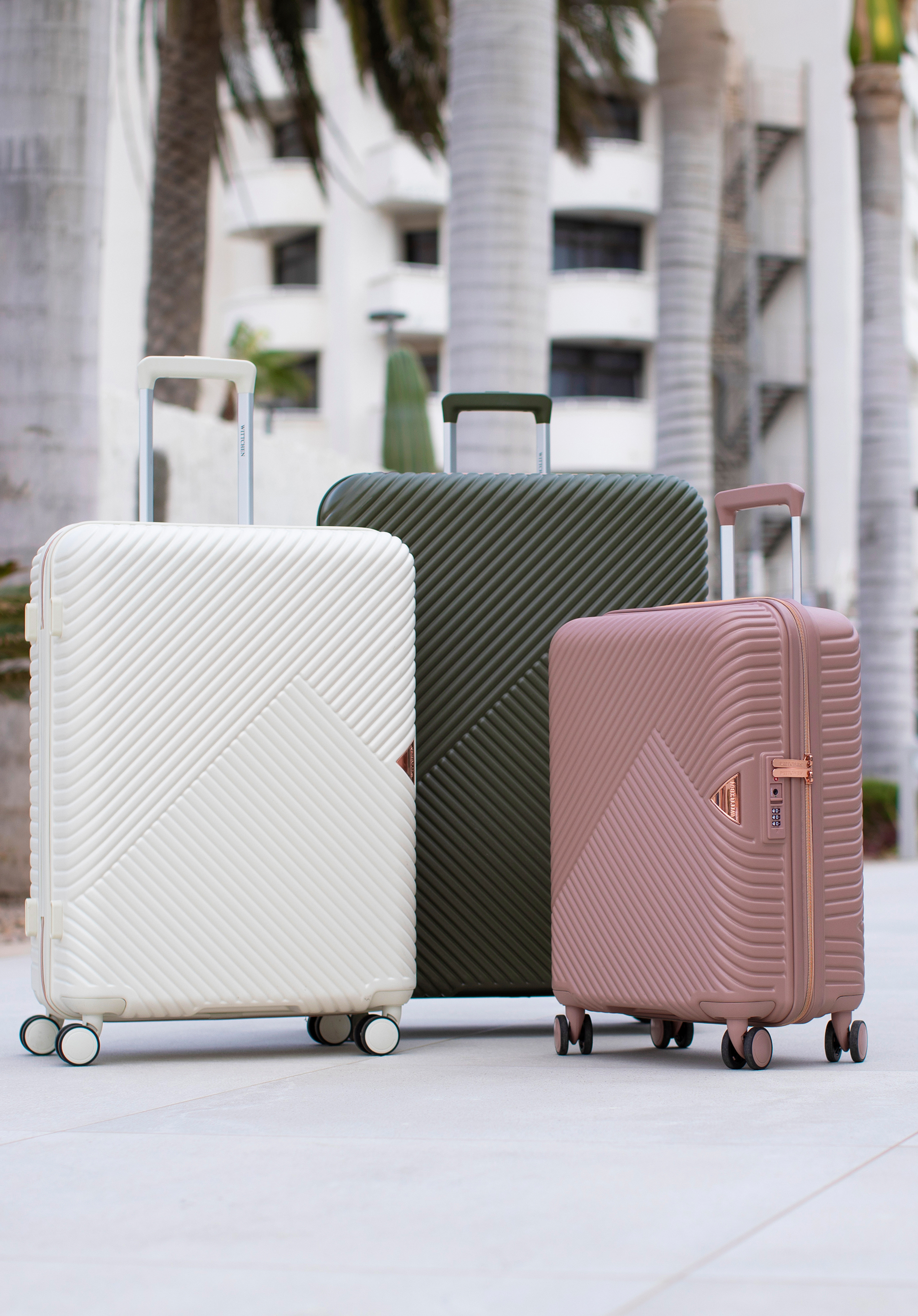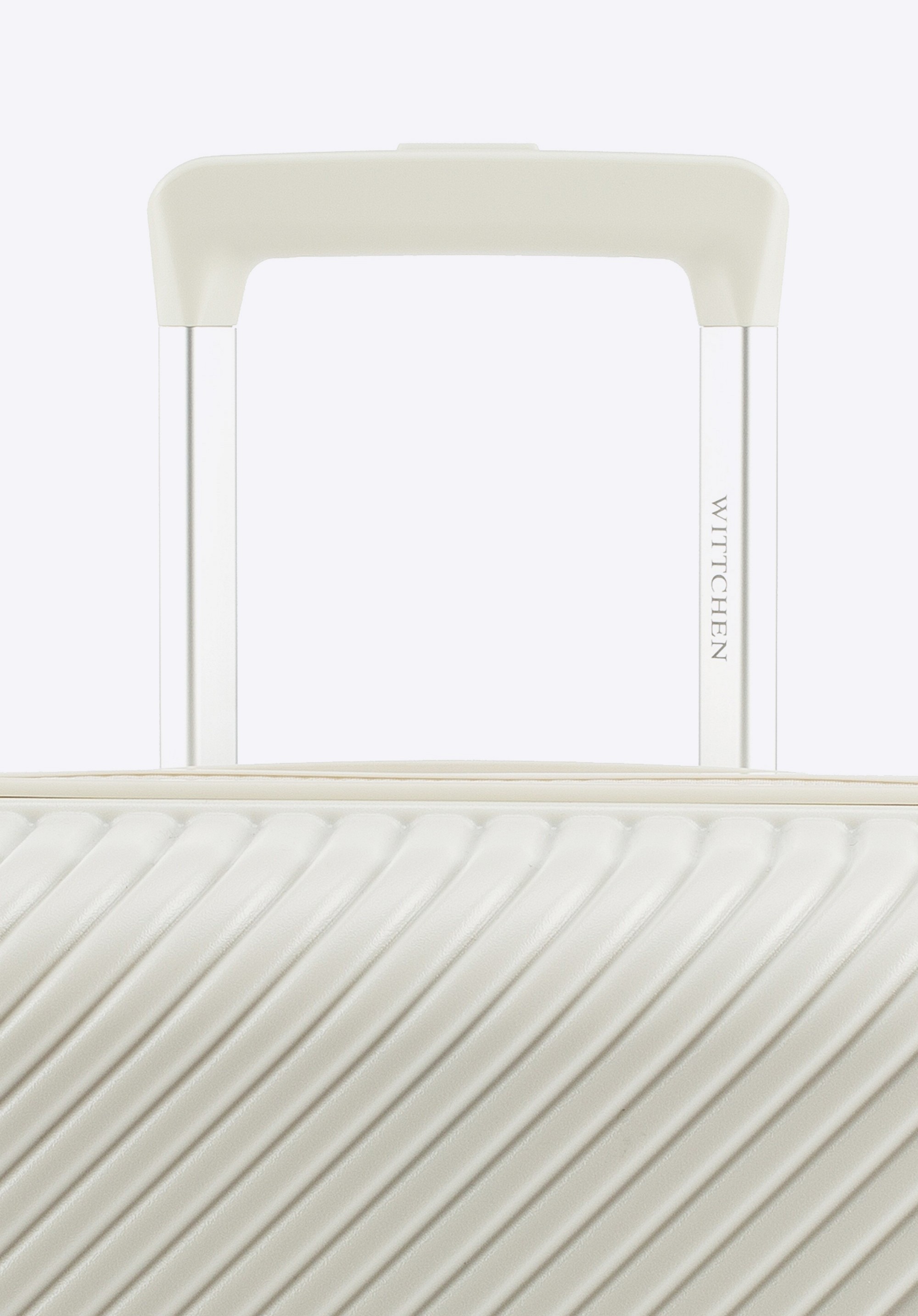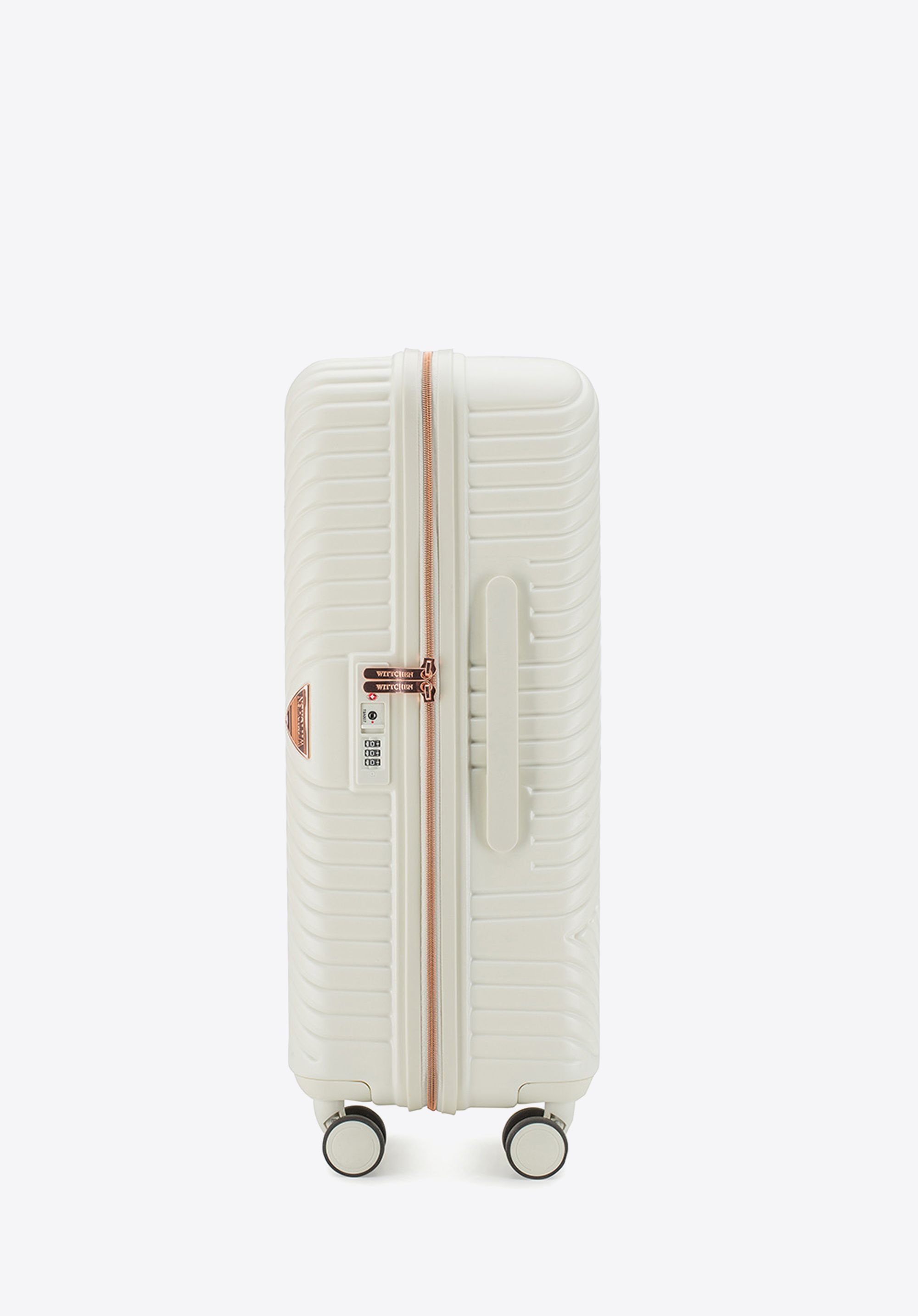 Stredne veľký kufor vytvorený z polykarbonátu s matným povrchom. Je to dizajnový návrh s lesklým kovaním v ružovo-zlatej farbe. Kolieska vyrobené z plastu ABS s pružnou povrchovou úpravou. Vnútro kufra je pokryté béžovou podšívkou s logom WITTCHEN.