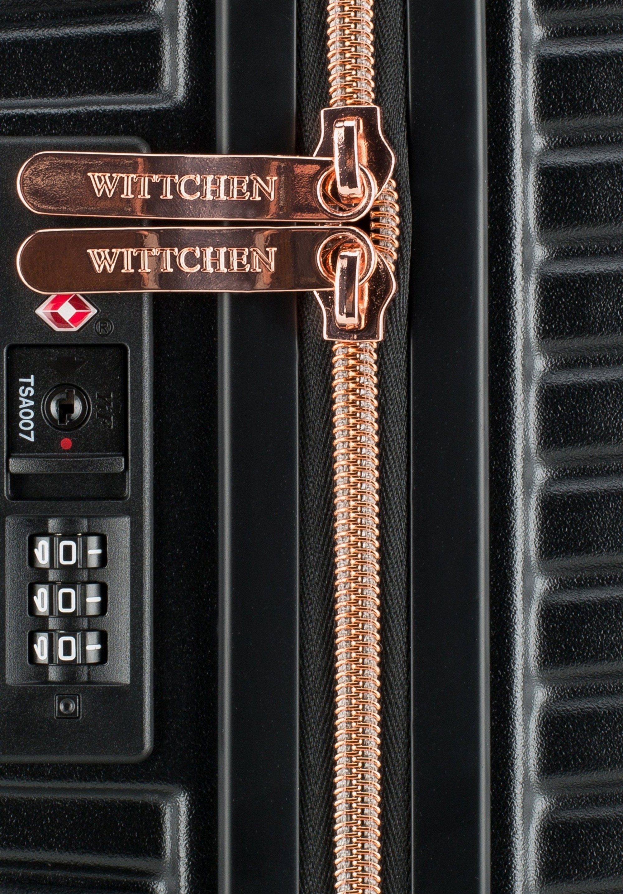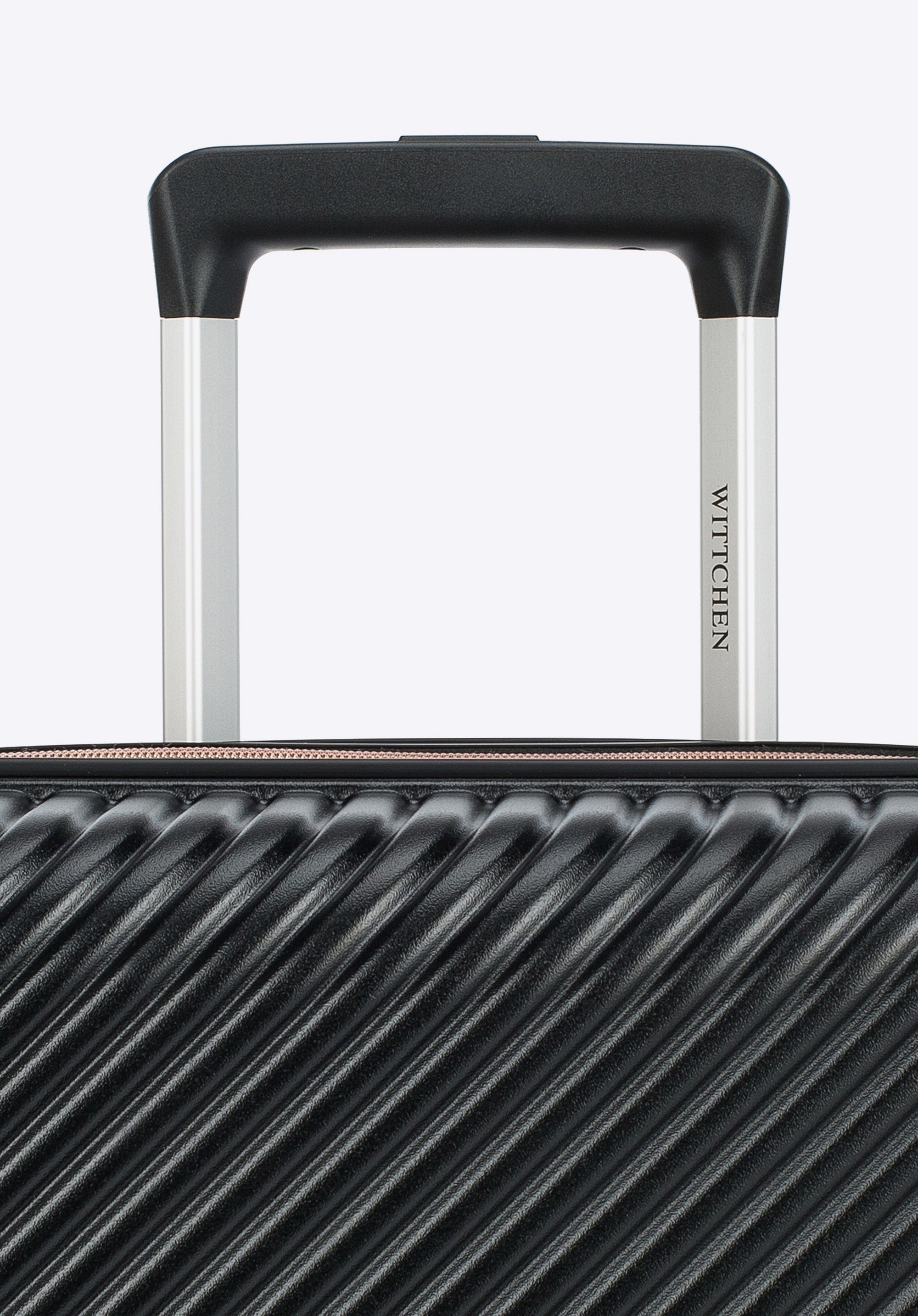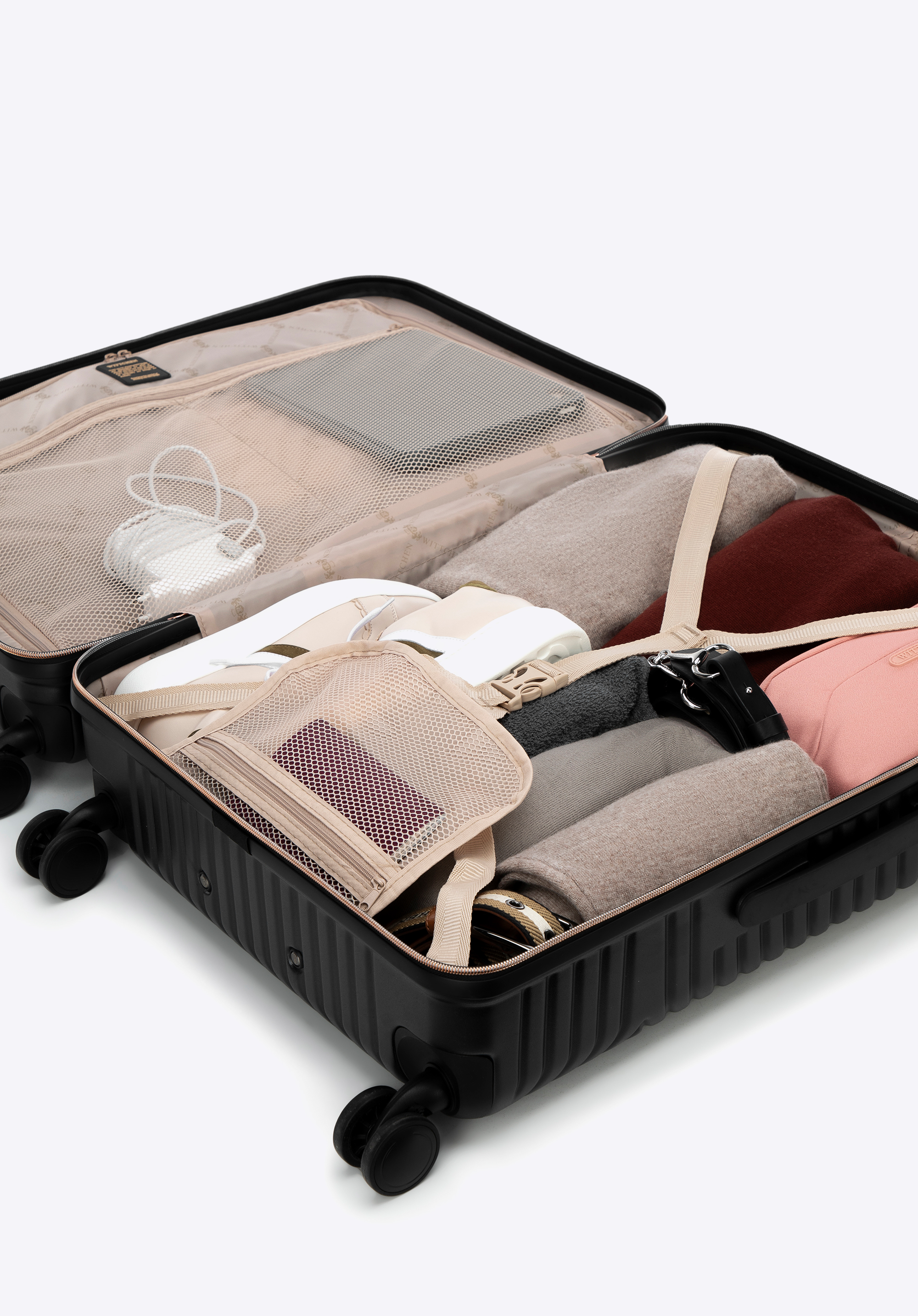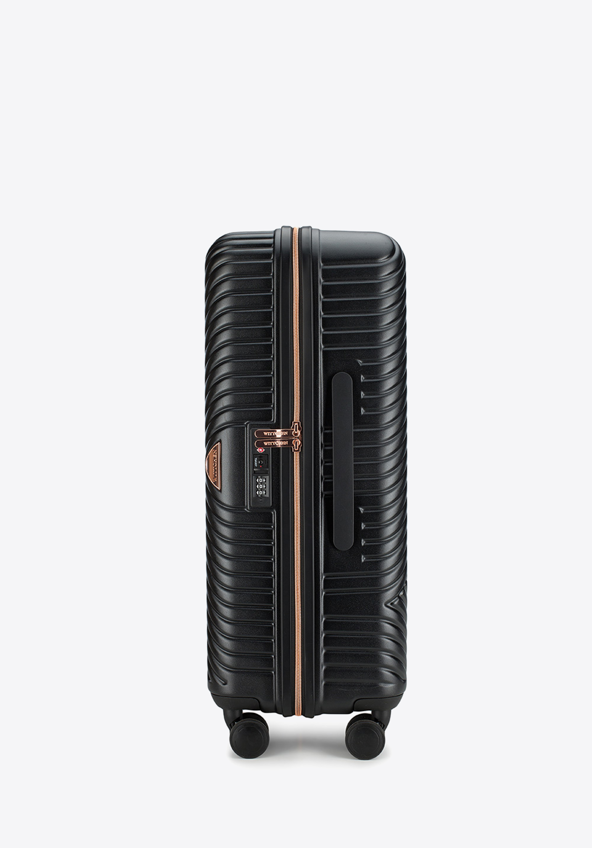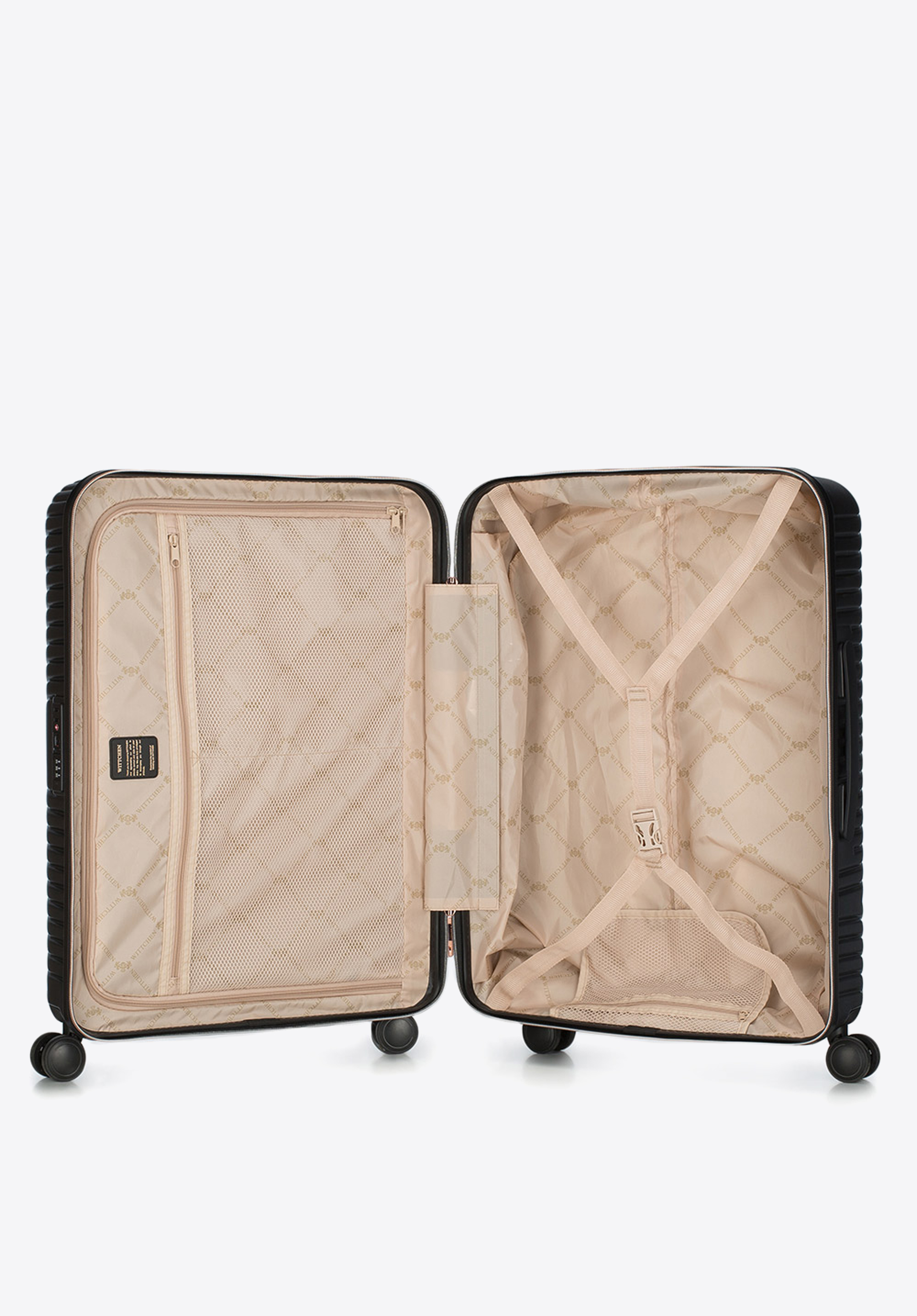 Stredne veľký kufor vytvorený z polykarbonátu s matným povrchom. Je to dizajnový návrh s lesklým kovaním v ružovo-zlatej farbe. Kolieska vyrobené z plastu ABS s pružnou povrchovou úpravou. Vnútro kufra je pokryté béžovou podšívkou s logom WITTCHEN.