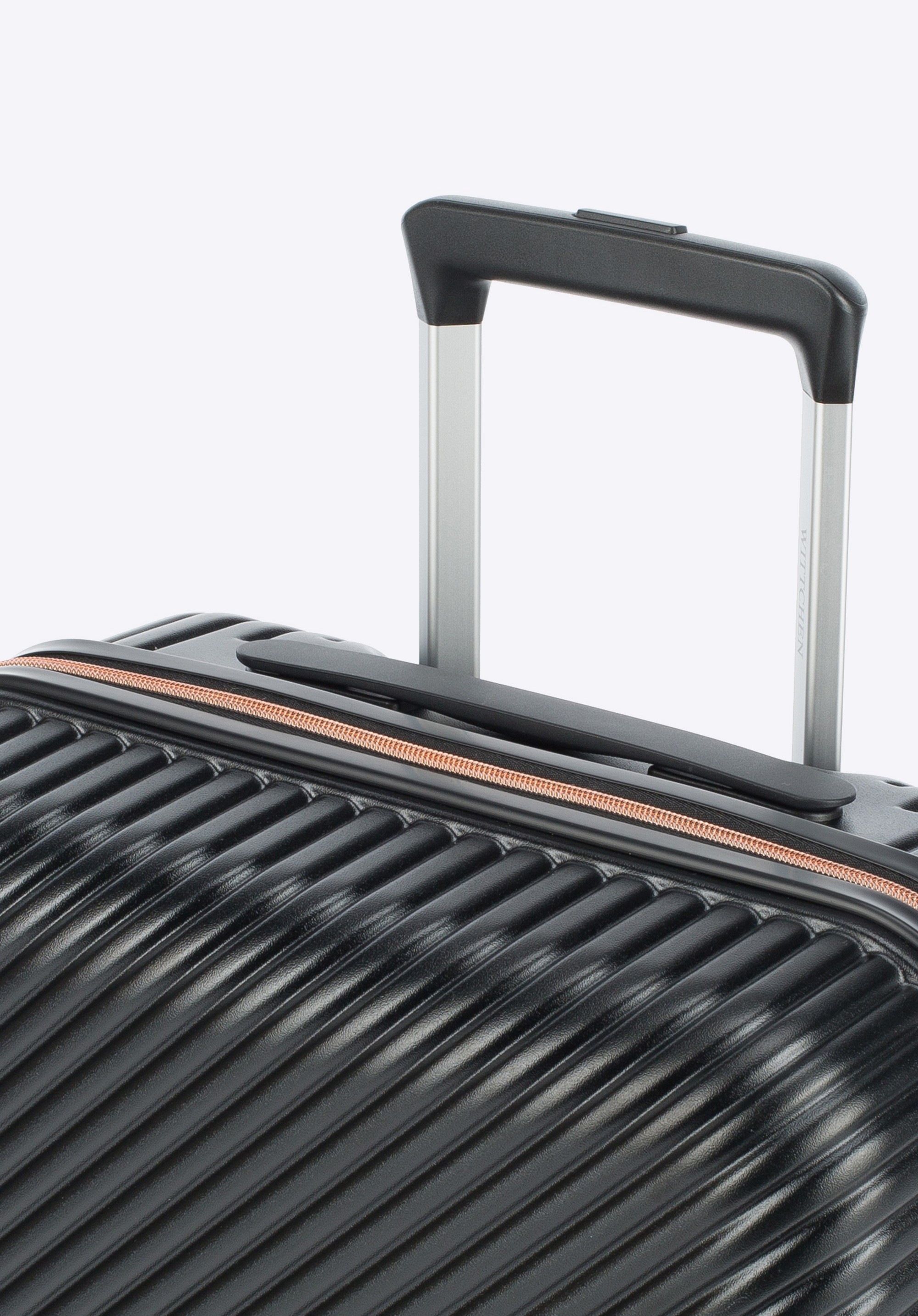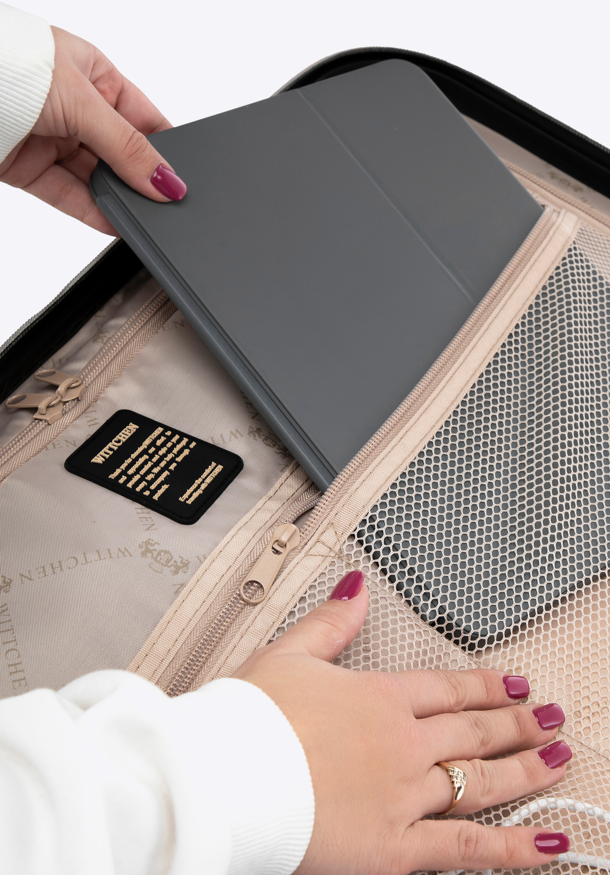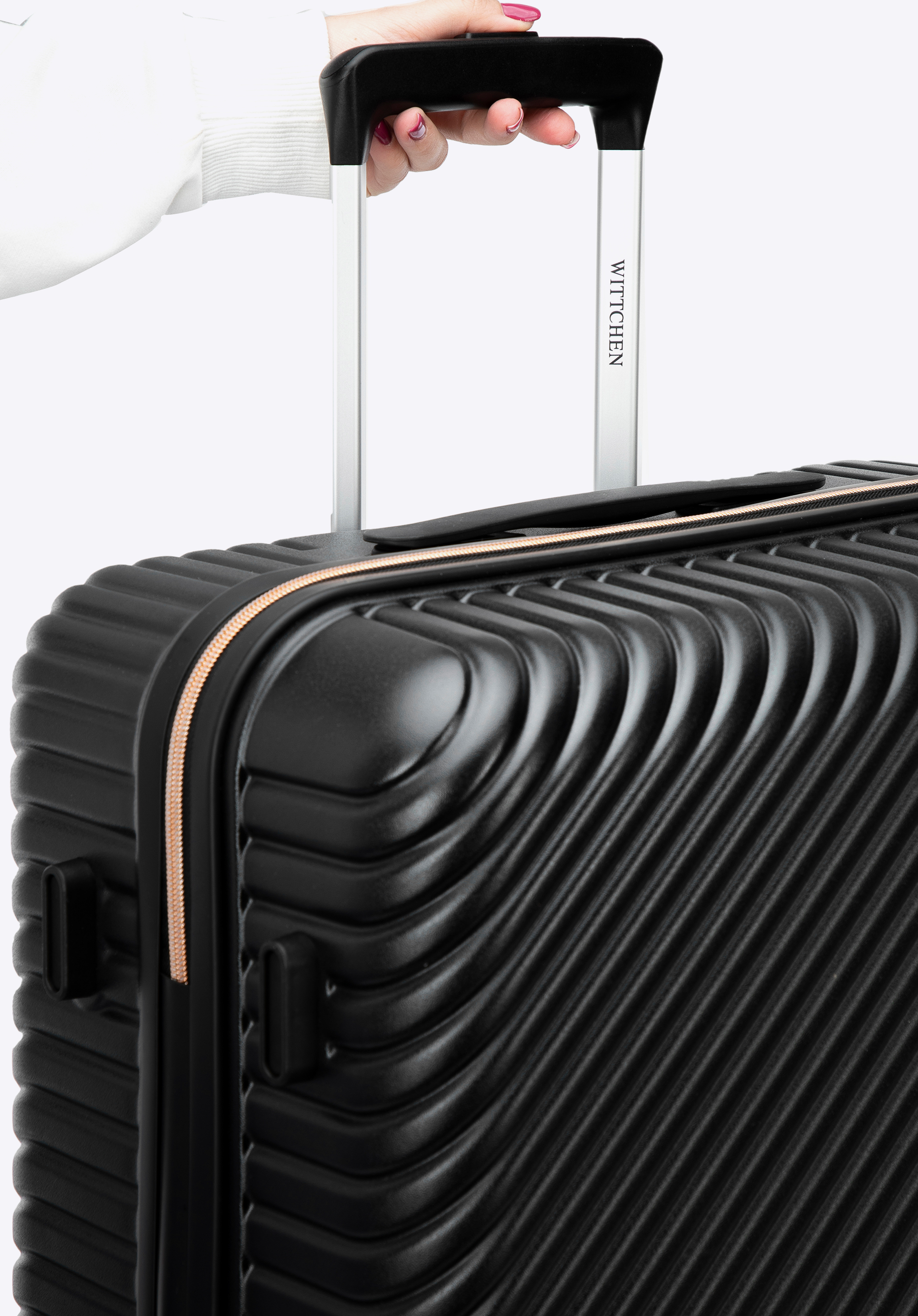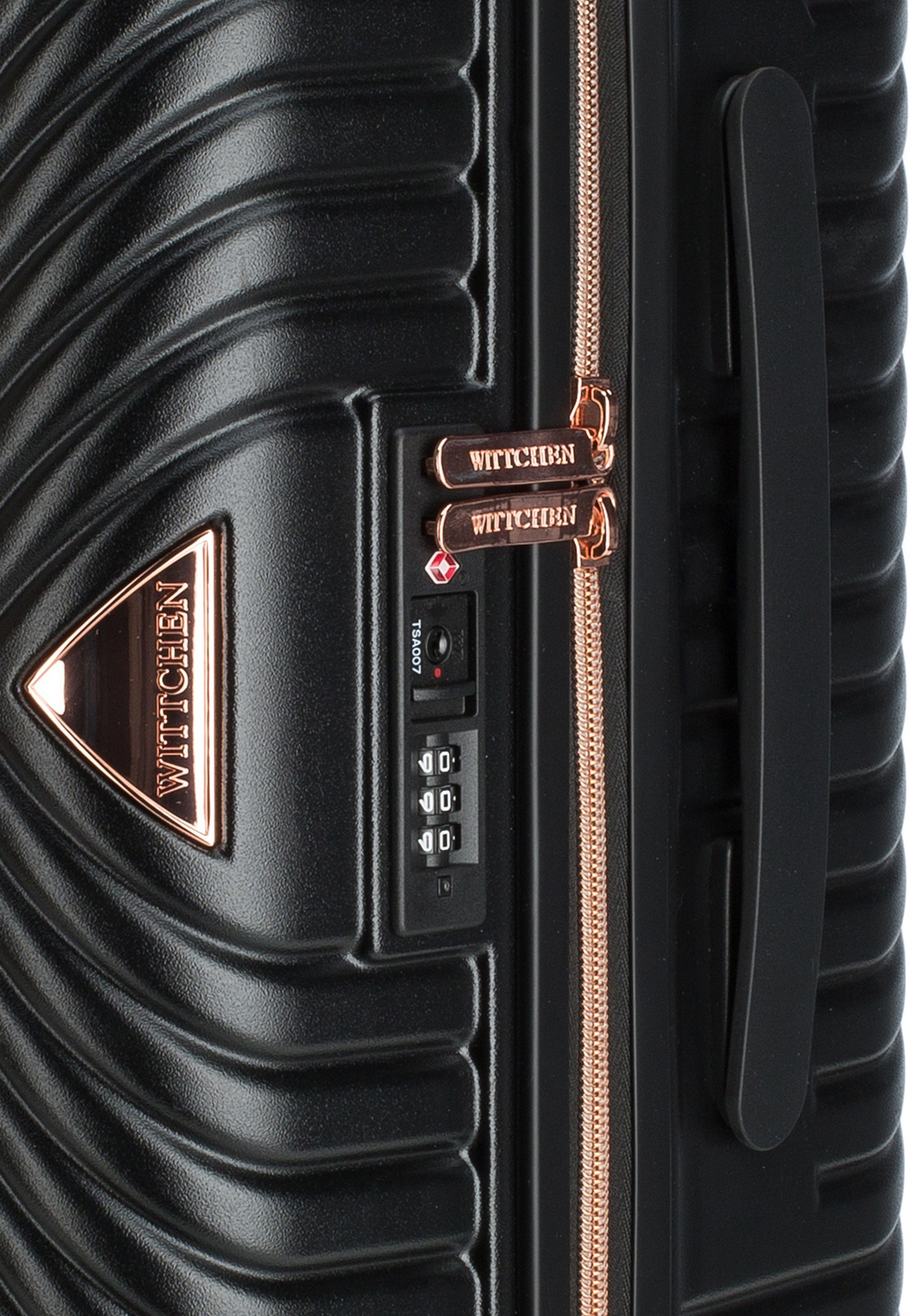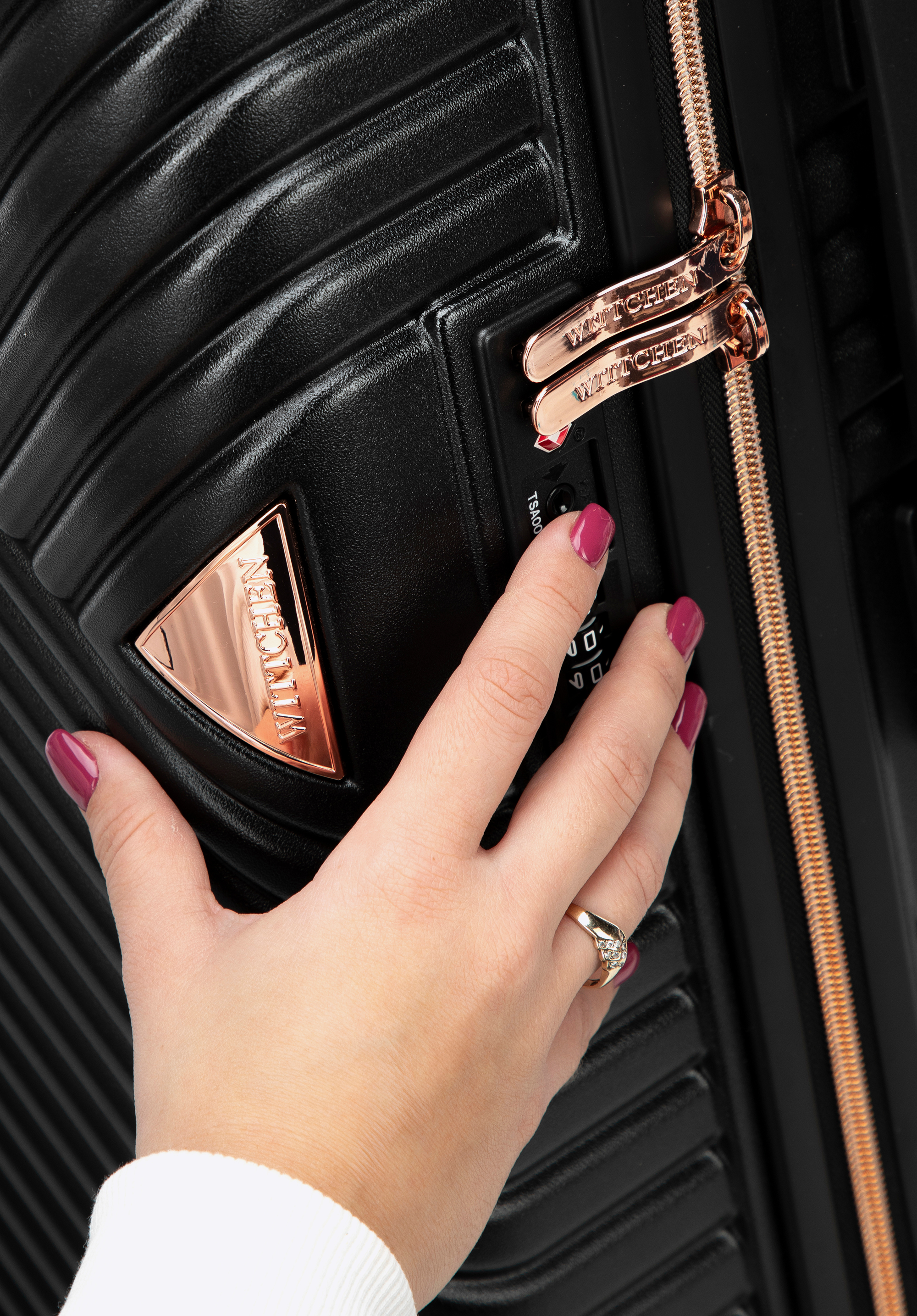 Stredne veľký kufor vytvorený z polykarbonátu s matným povrchom. Je to dizajnový návrh s lesklým kovaním v ružovo-zlatej farbe. Kolieska vyrobené z plastu ABS s pružnou povrchovou úpravou. Vnútro kufra je pokryté béžovou podšívkou s logom WITTCHEN.