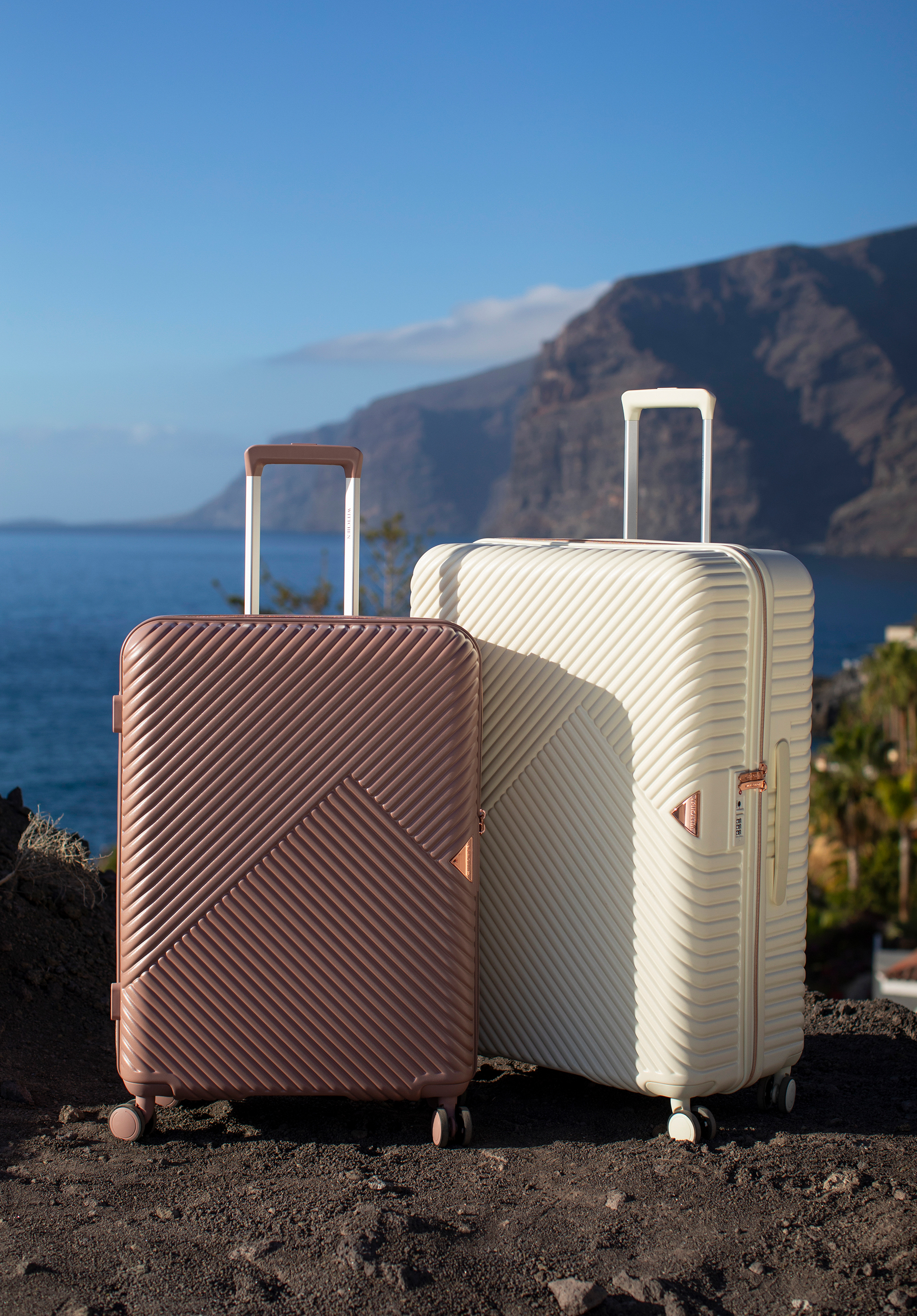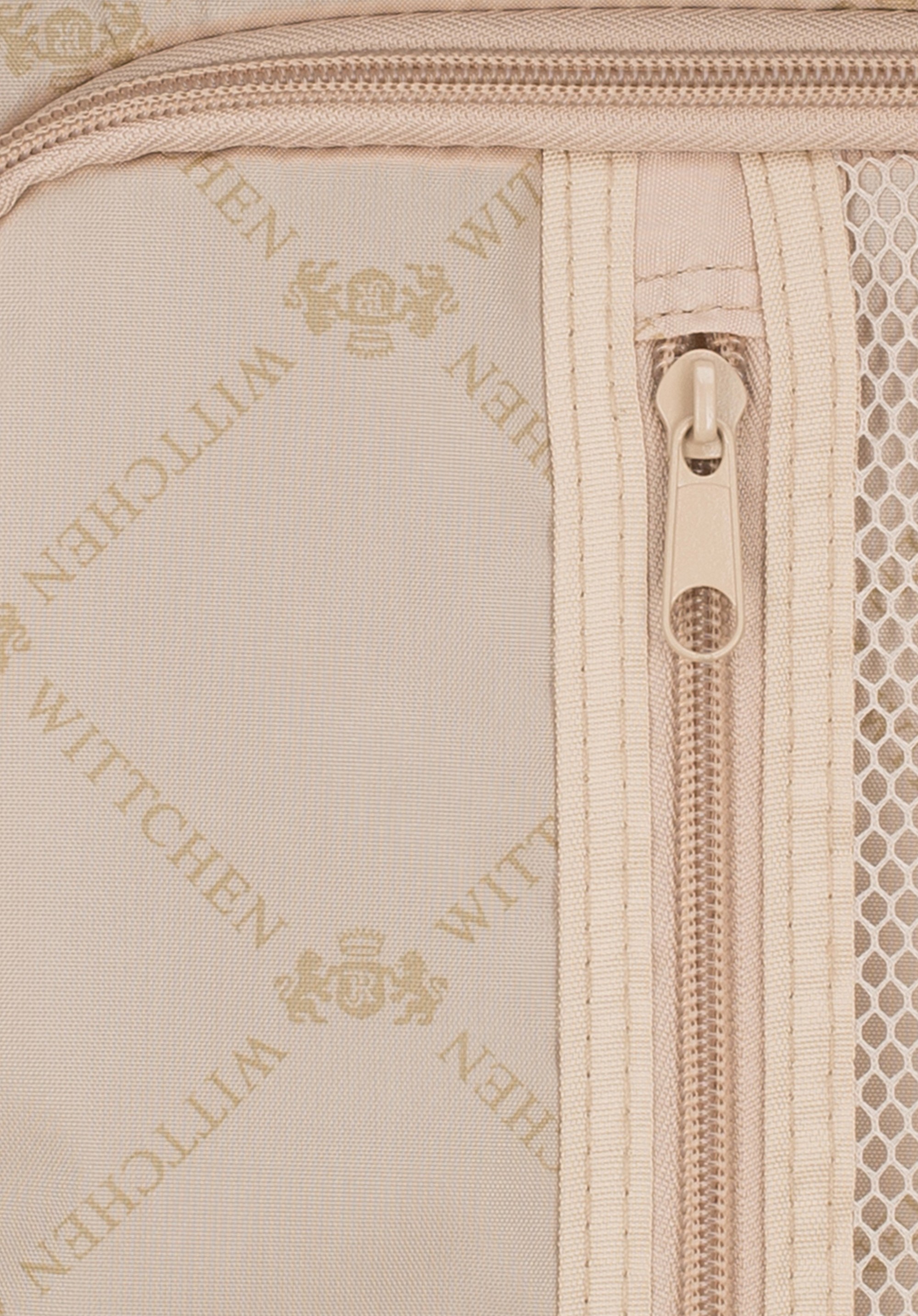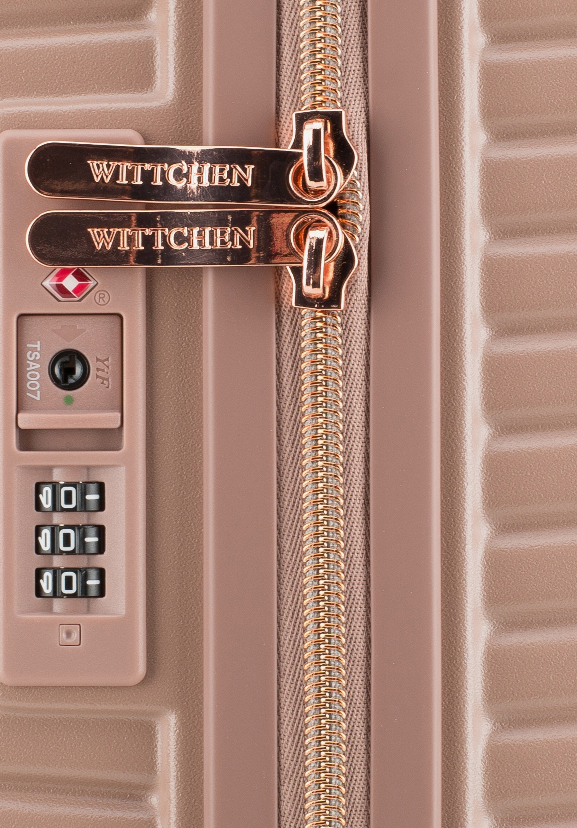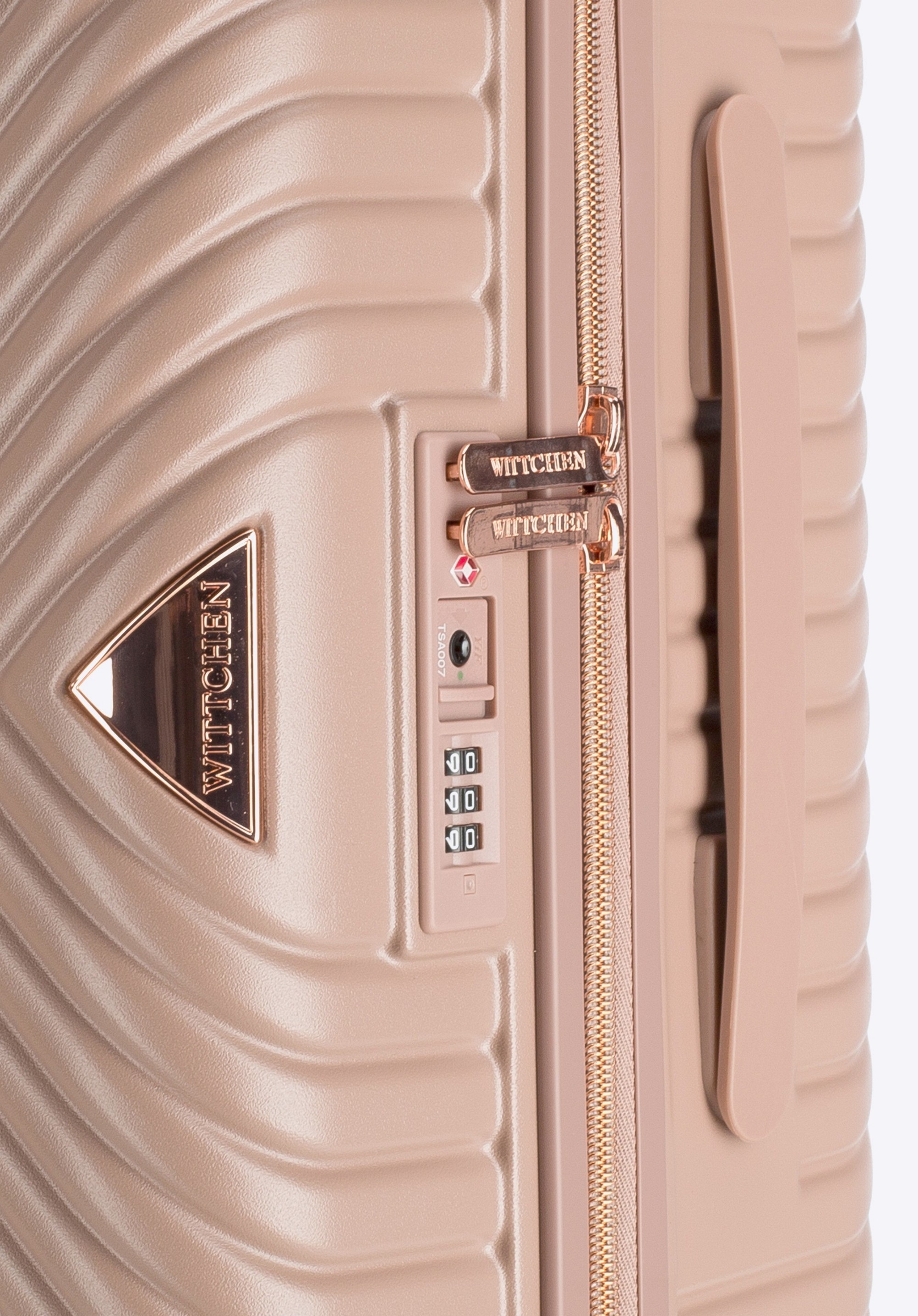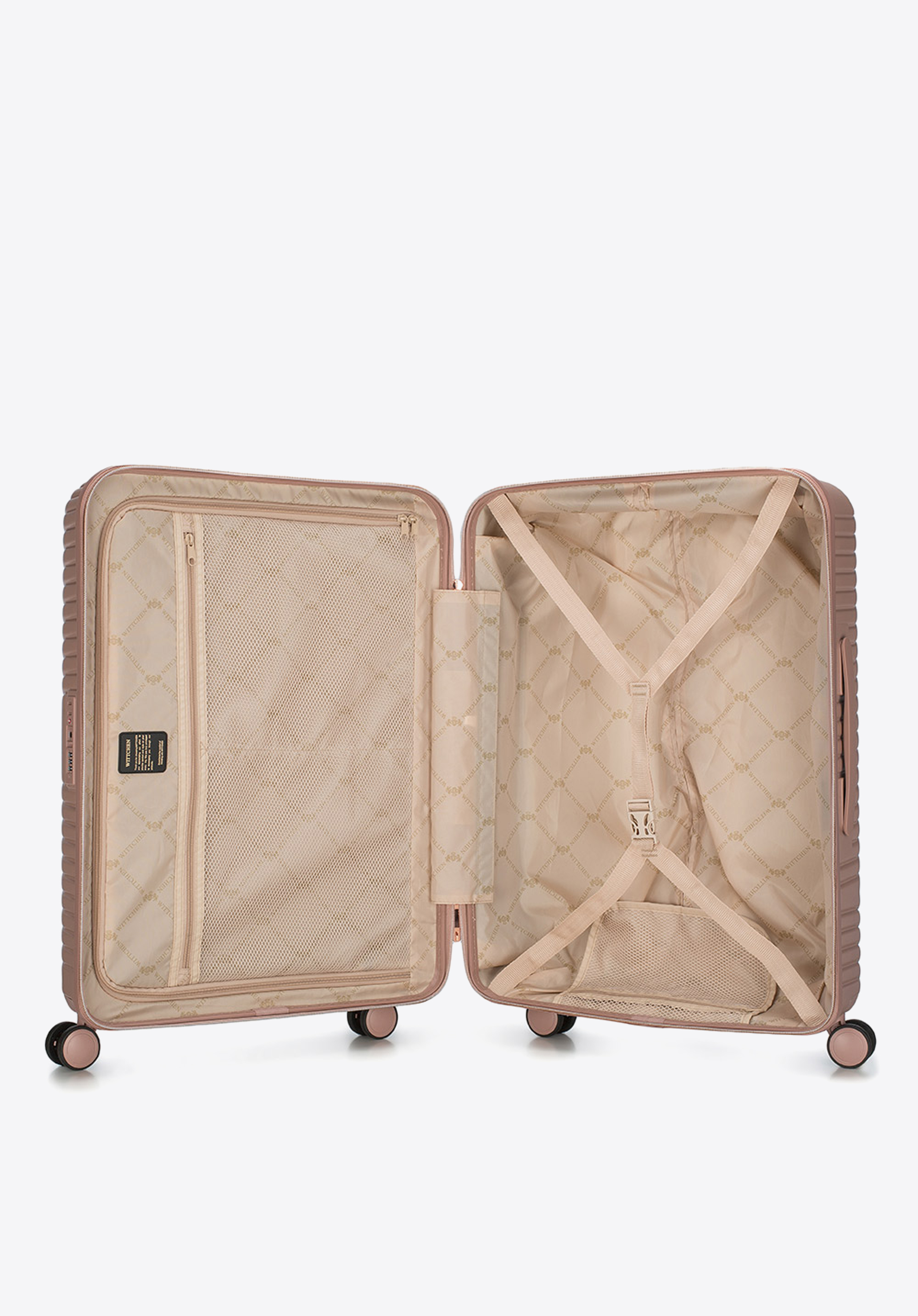 Stredne veľký kufor vytvorený z polykarbonátu s matným povrchom. Je to dizajnový návrh s lesklým kovaním v ružovo-zlatej farbe. Kolieska vyrobené z plastu ABS s pružnou povrchovou úpravou. Vnútro kufra je pokryté béžovou podšívkou s logom WITTCHEN.