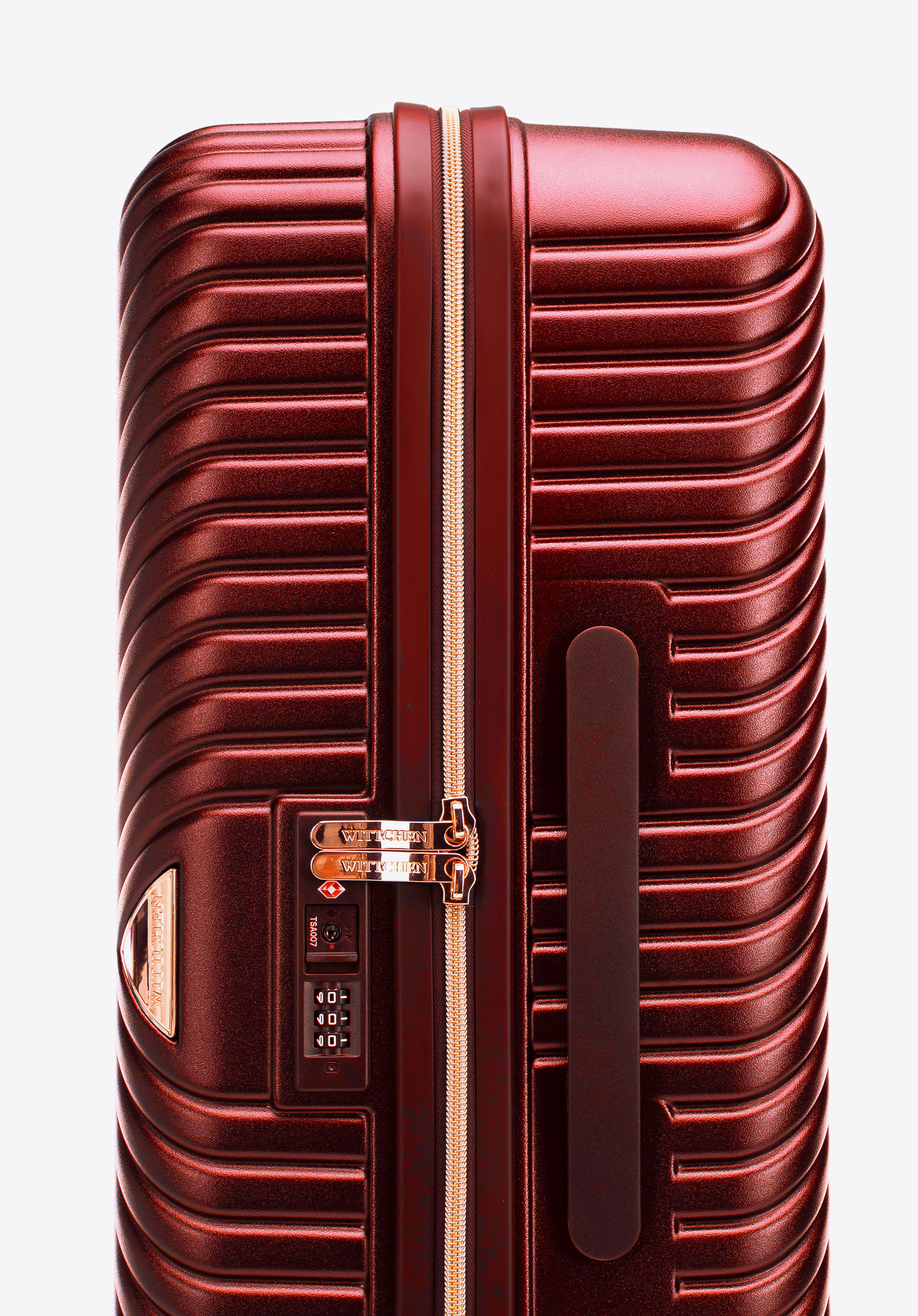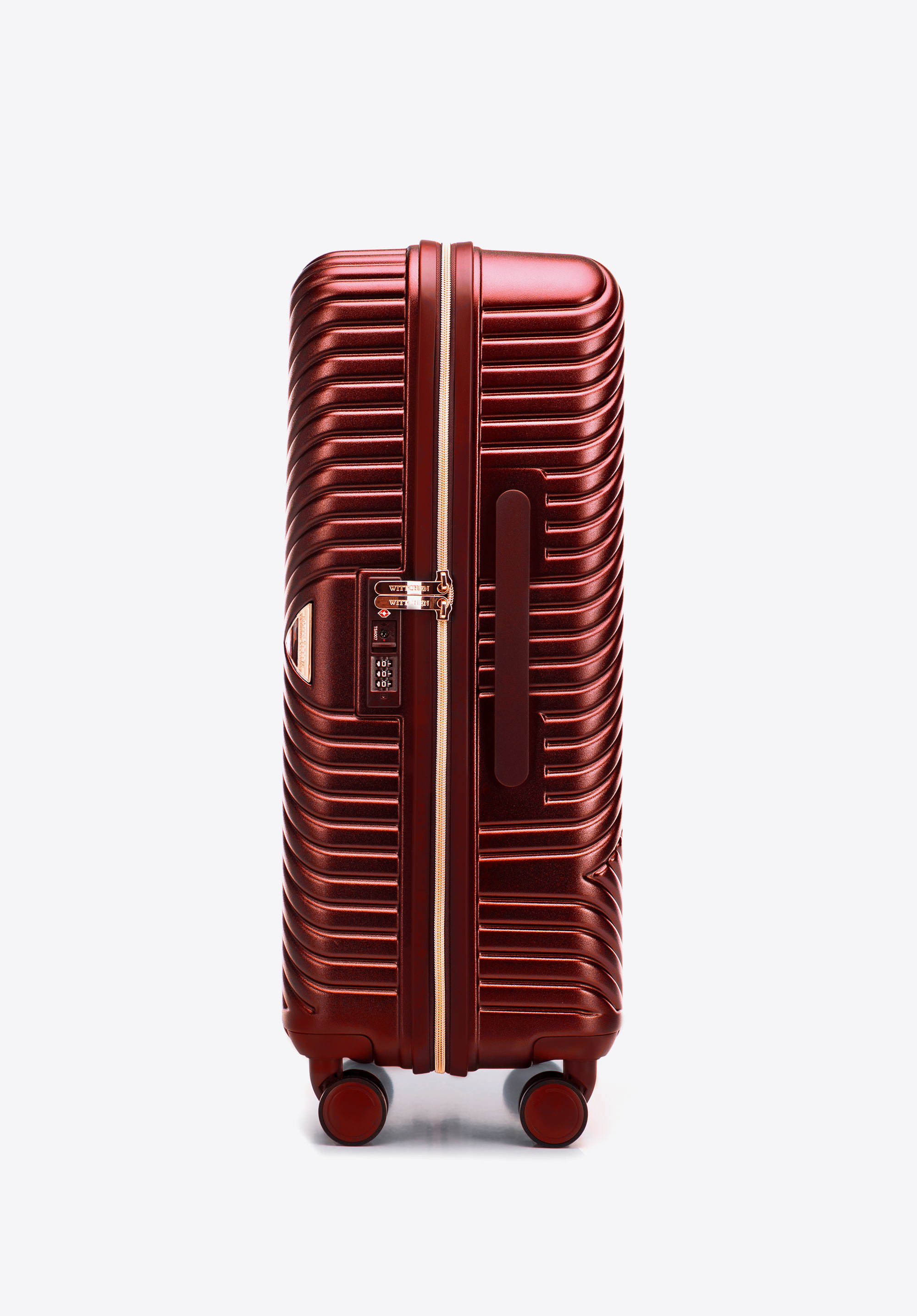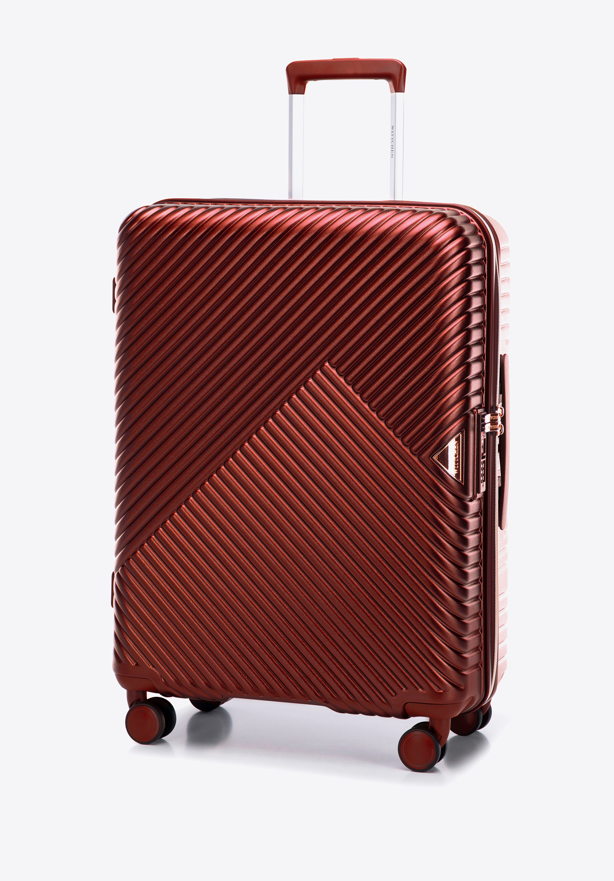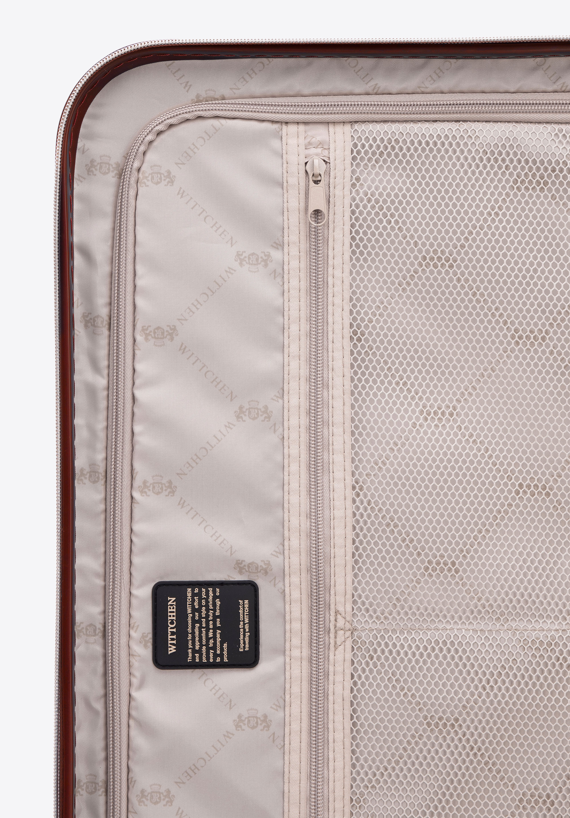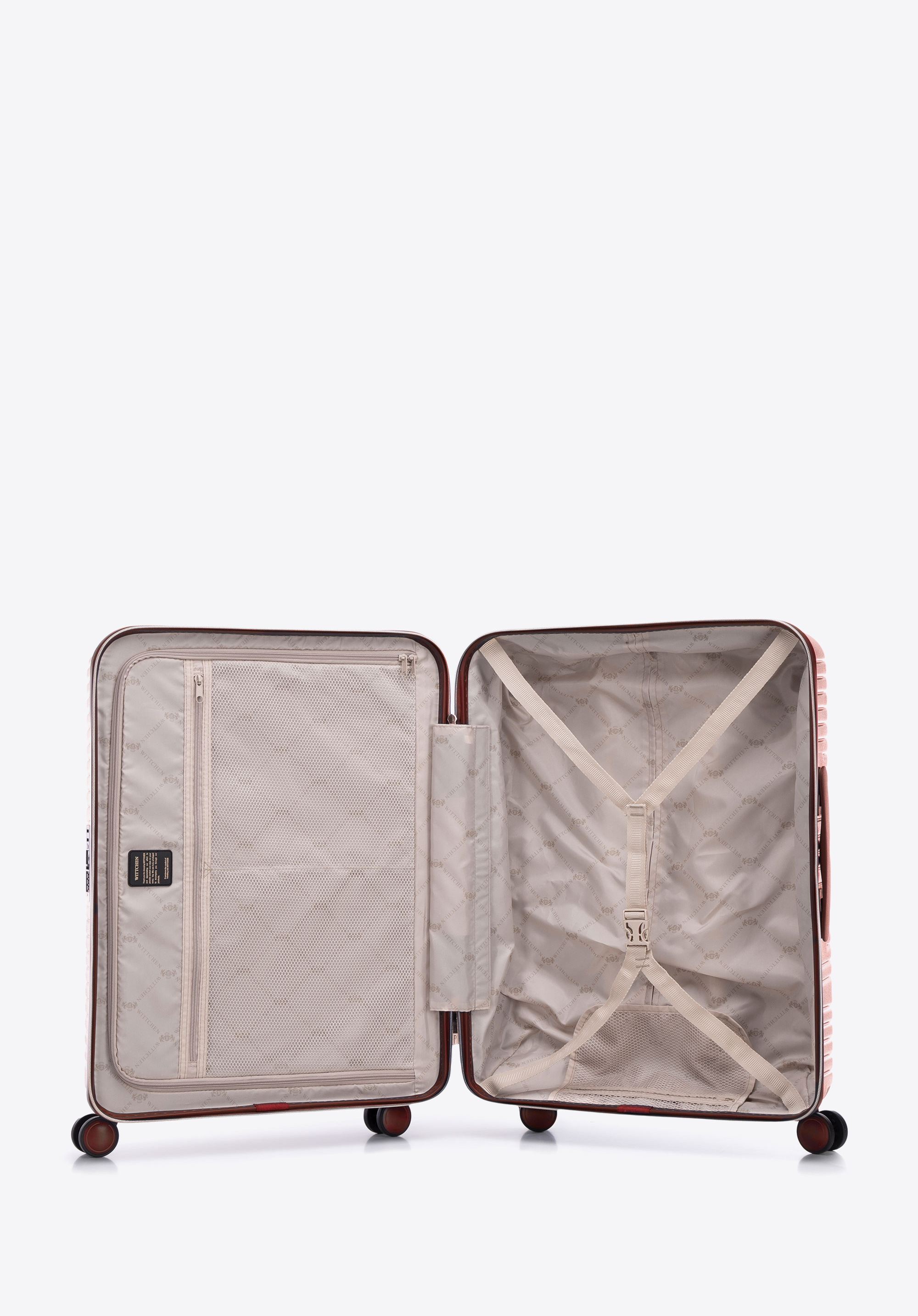 Stredne veľký kufor vytvorený z polykarbonátu s matným povrchom. Je to dizajnový návrh s lesklým kovaním v ružovo-zlatej farbe. Kolieska vyrobené z plastu ABS s pružnou povrchovou úpravou. Vnútro kufra je pokryté béžovou podšívkou s logom WITTCHEN.