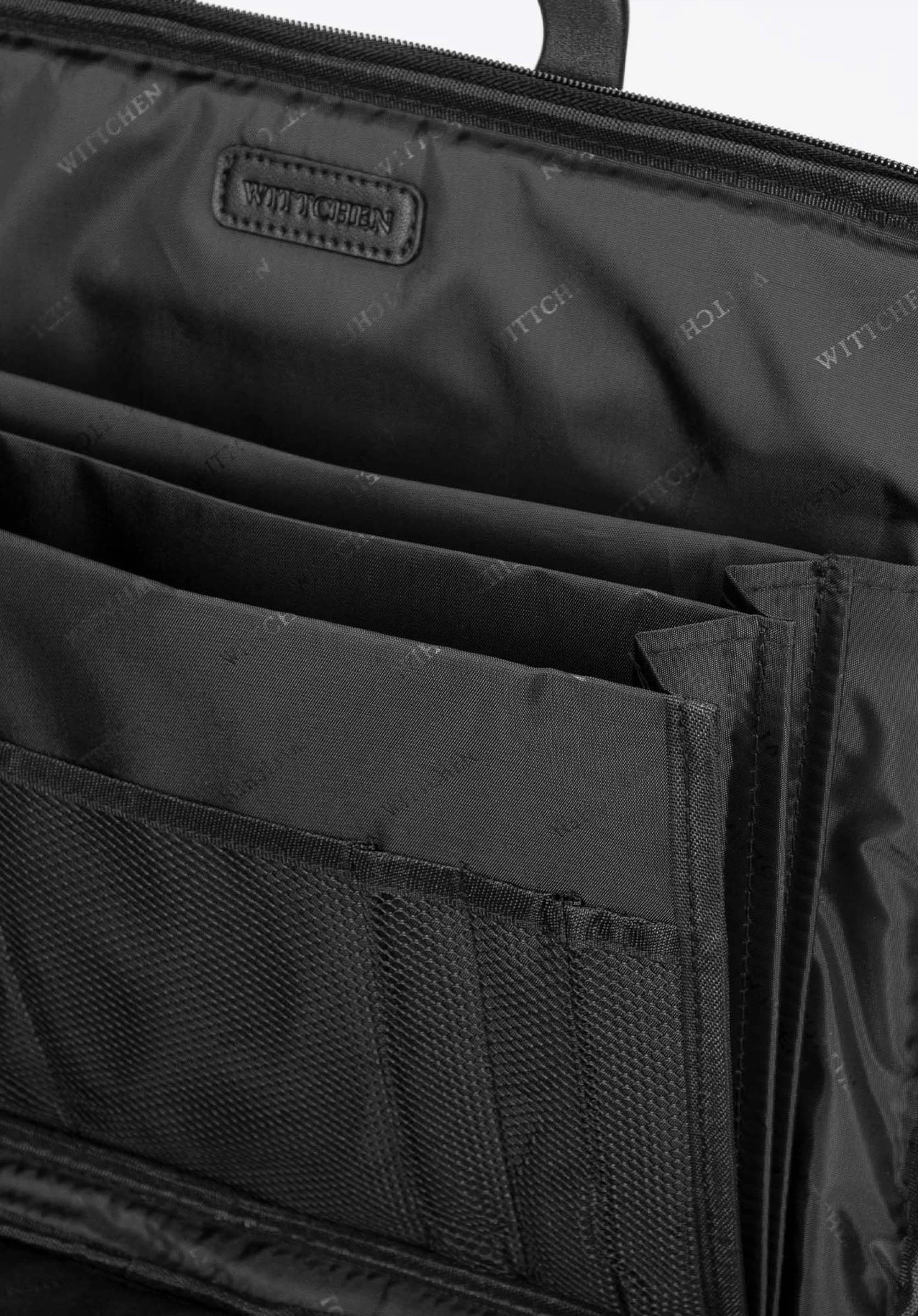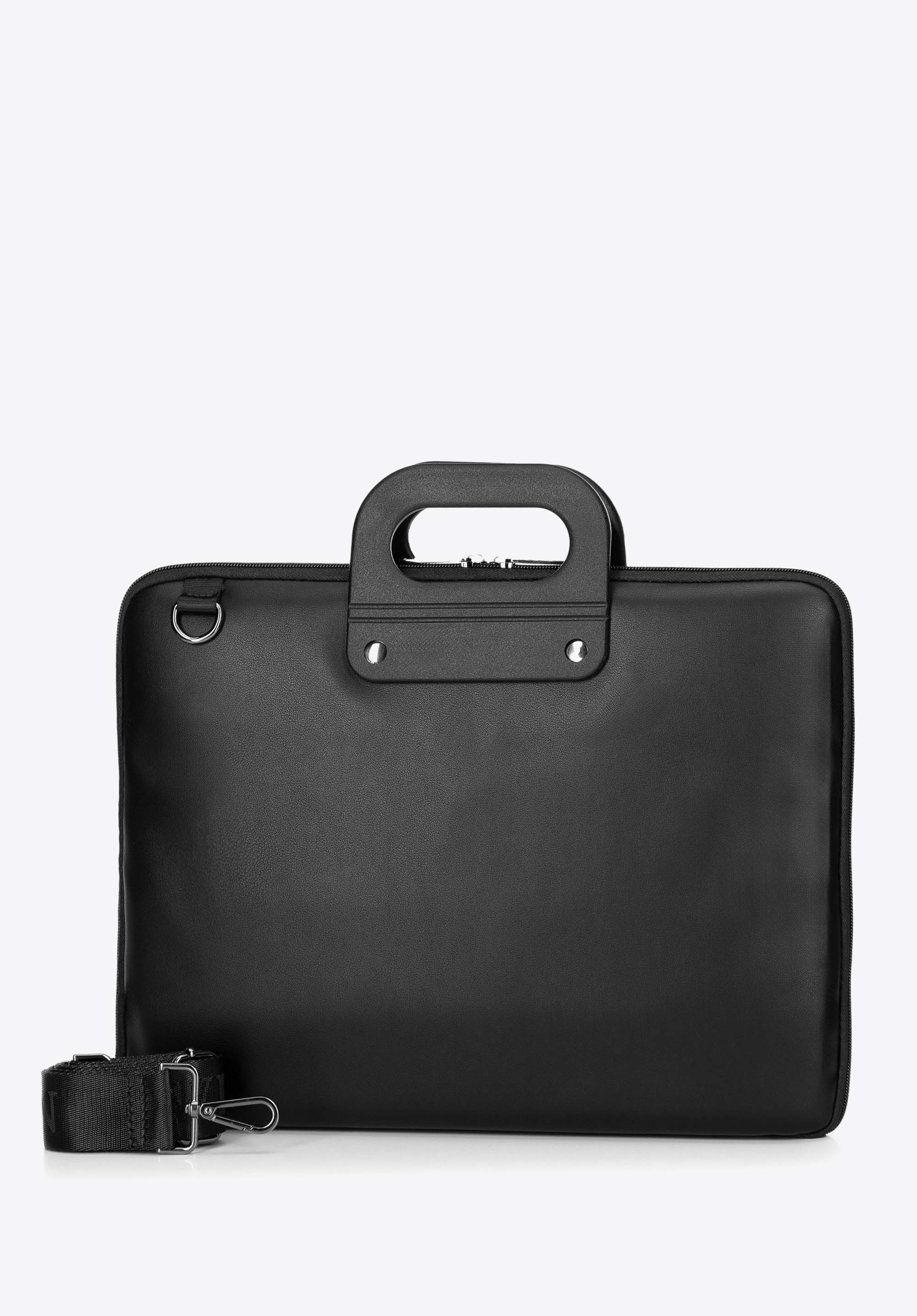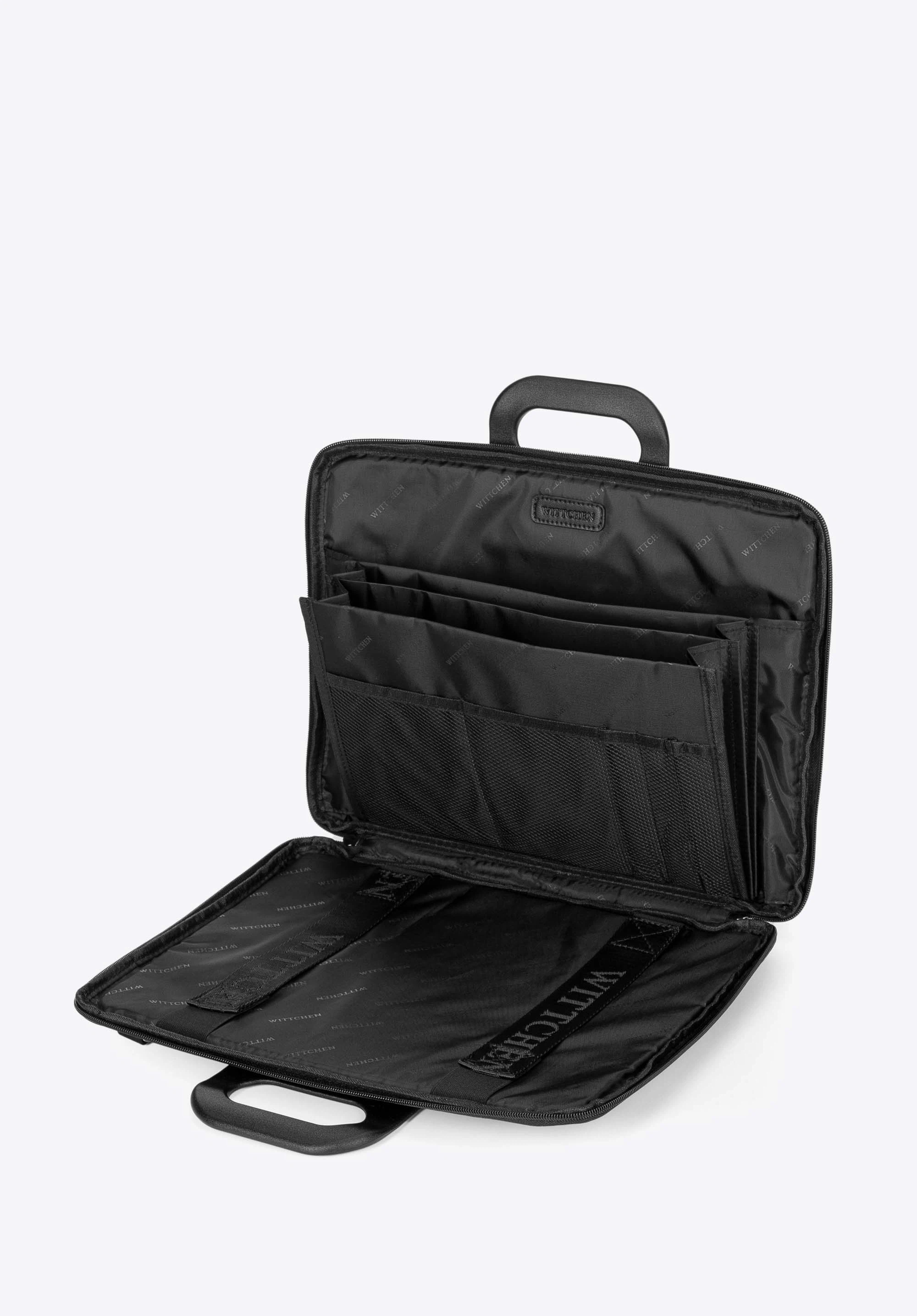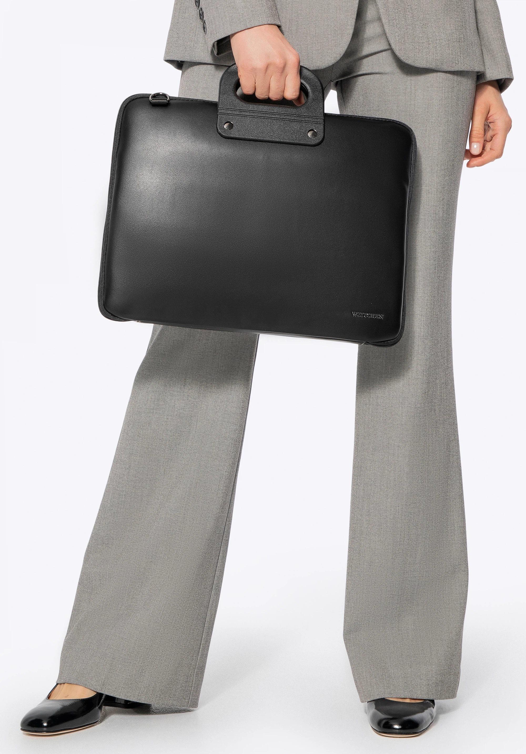 Táto elegantná taška na notebook spája funkčnosť s moderným dizajnom. Vyrobená z umelej kože a zaistená odolným zipsom udrží vaše zariadenie (max. rozmery 25 × 35 cm, 15”) a dokumenty v bezpečí. Vďaka dvom pohodlným rúčkam a odnímateľnému nastaviteľnému popruhu ju možno nosiť v ruke alebo cez rameno pre väčšie pohodlie. Vnútri nájdete tri vrecká na dokumenty, dve sieťované vrecká a tri priehradky na perá.